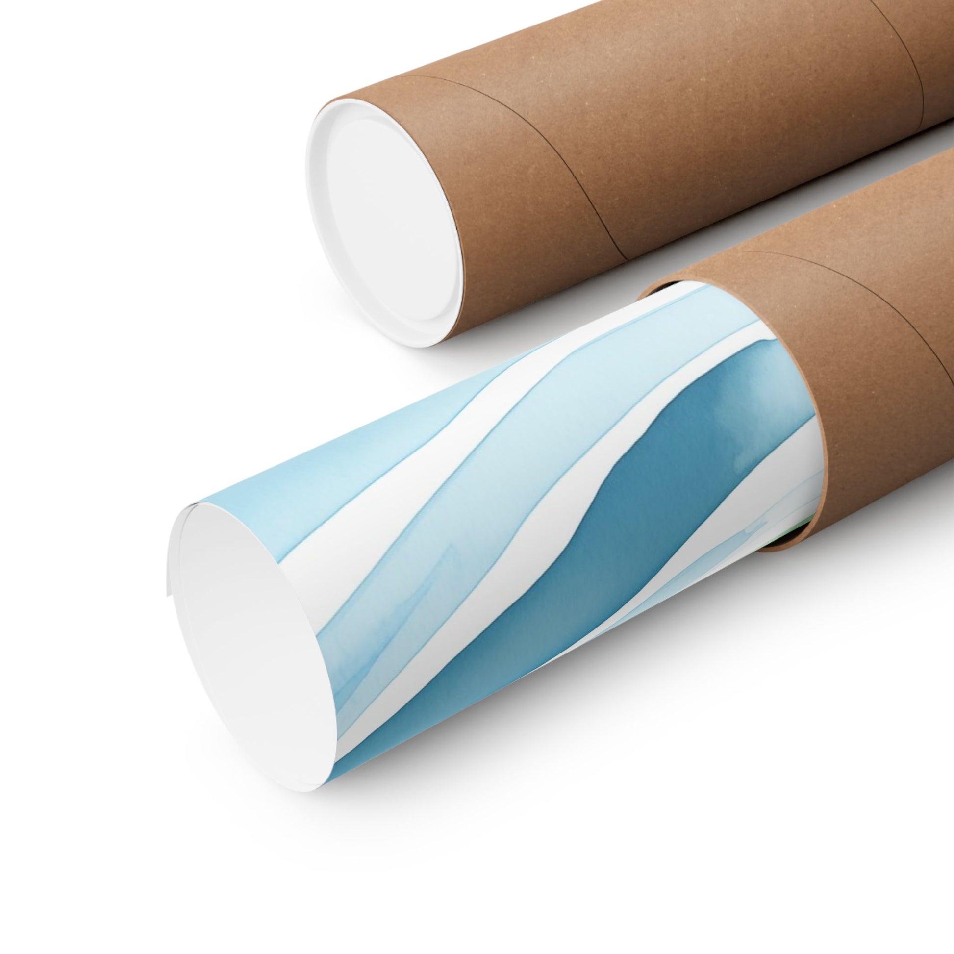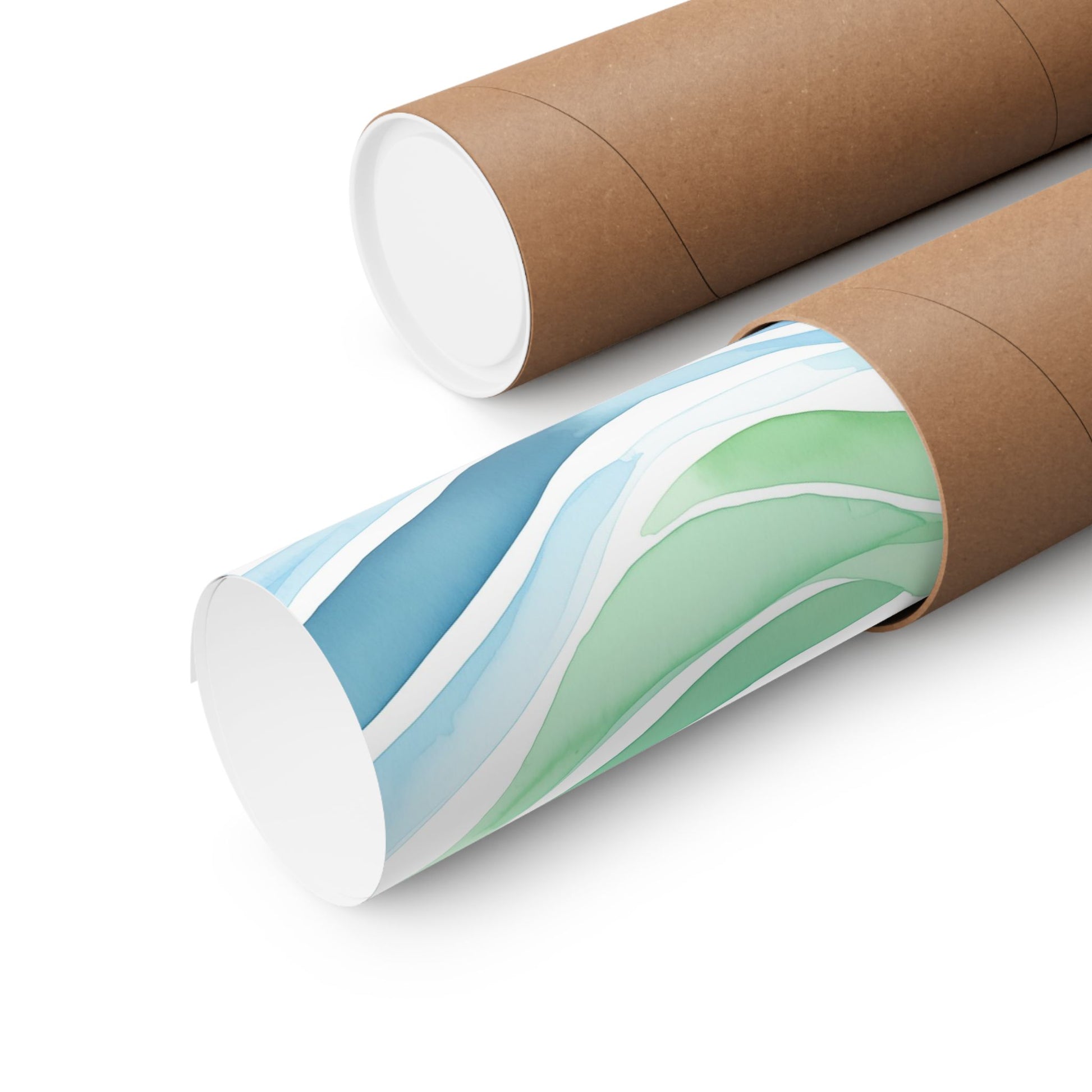 This rhythmic series of horizontal, undulating bands rendered in a fluid watercolor technique with a cool palette of blues and greens employs translucent washes and subtle variations in tone to create a sense of movement and depth across the surface, evoking the ebb and flow of water. The interplay of color and line generates a tranquil and visually soothing composition.