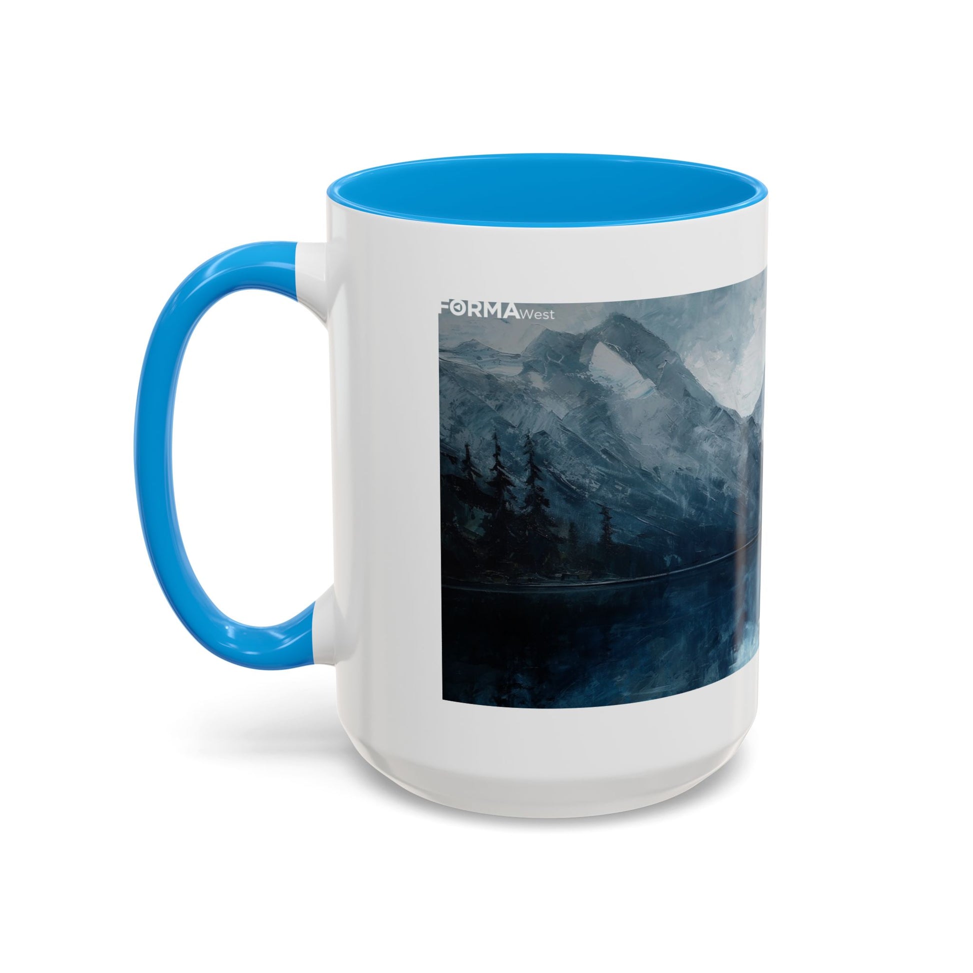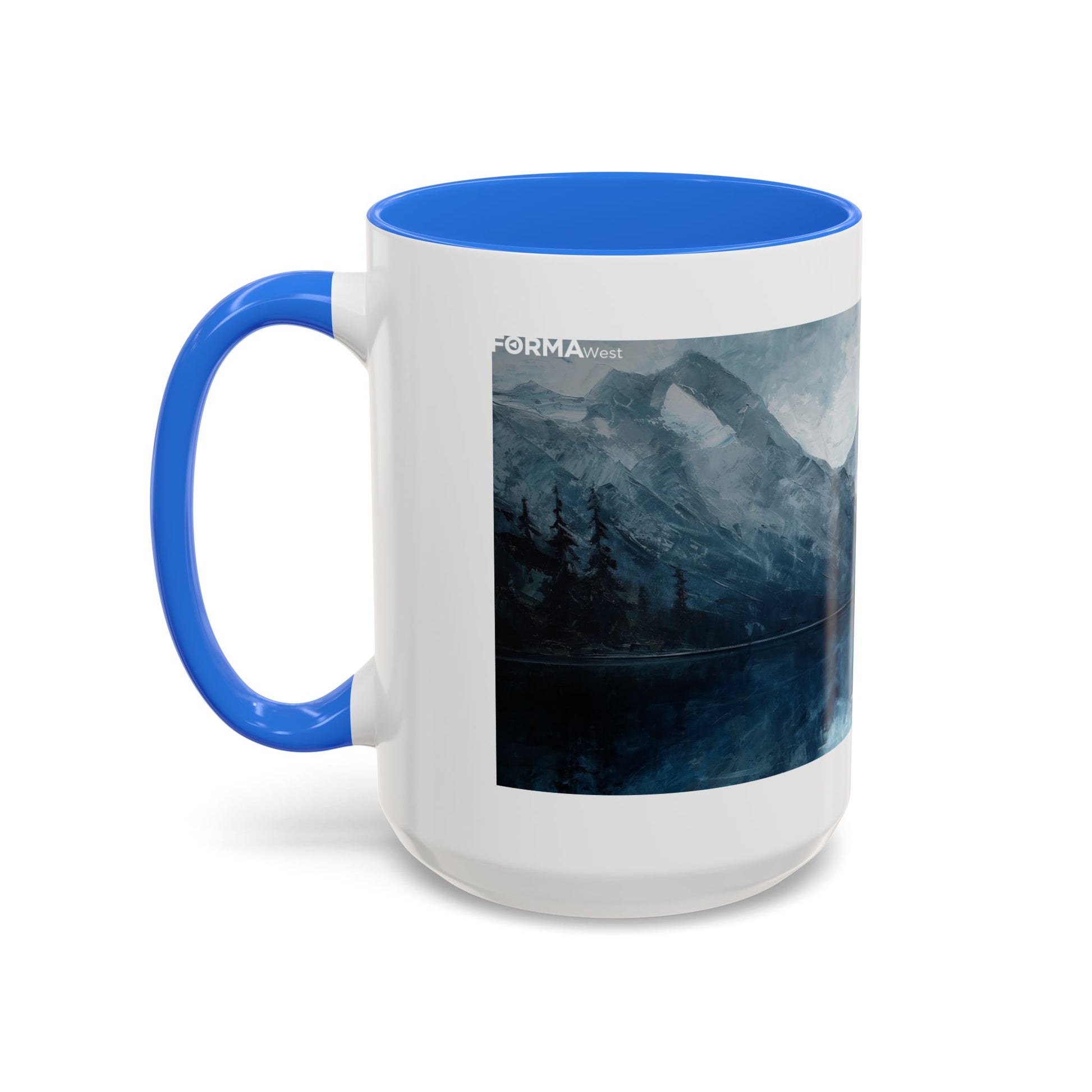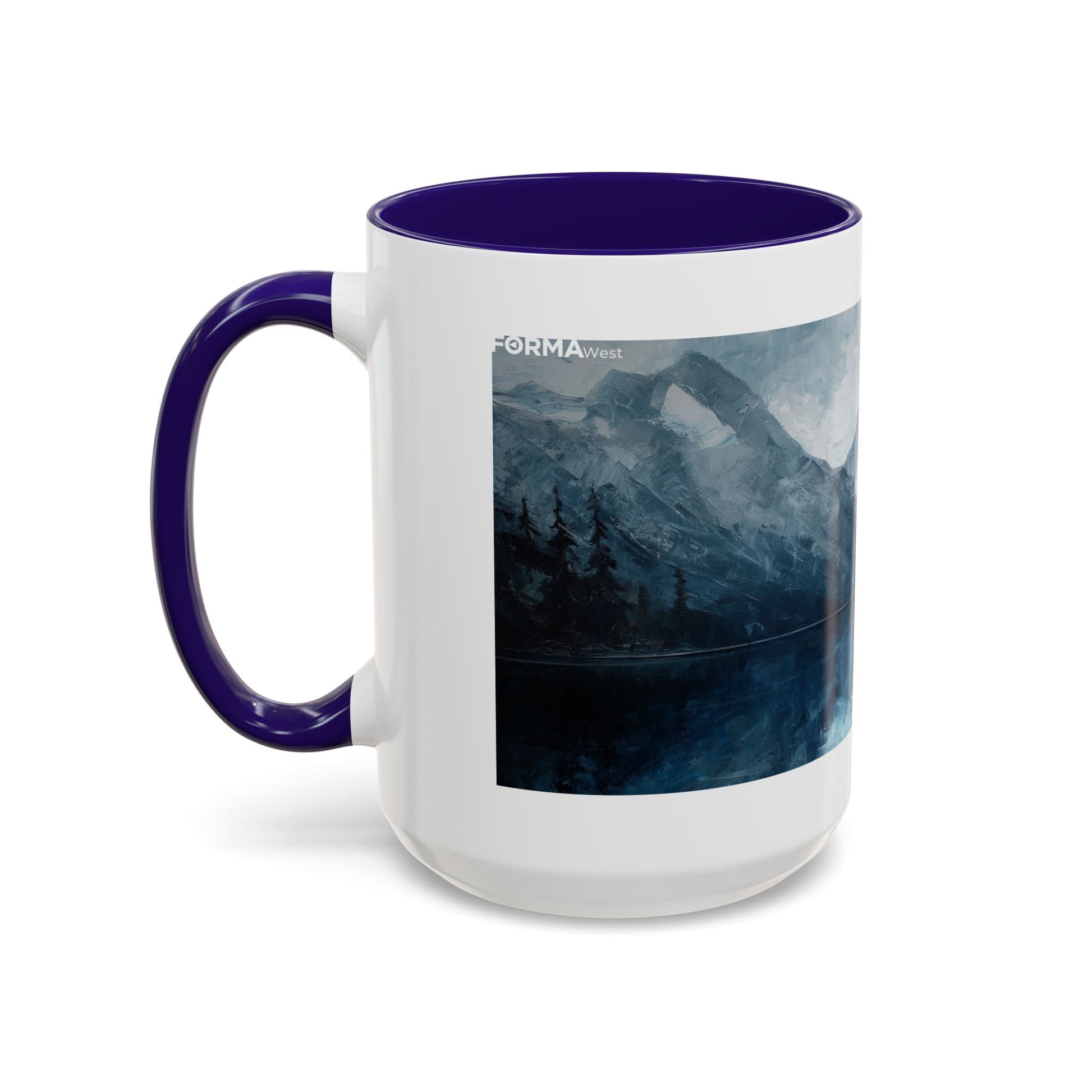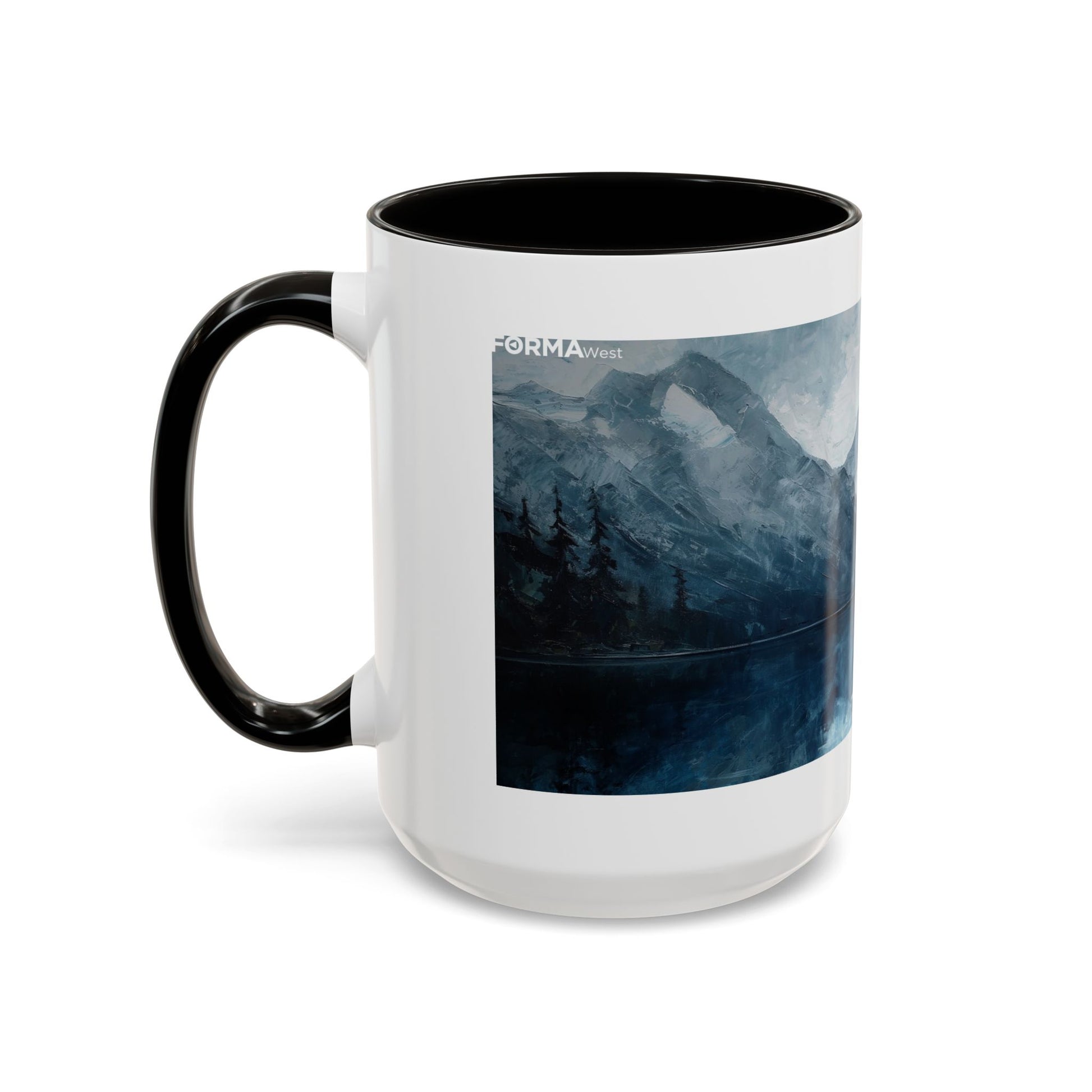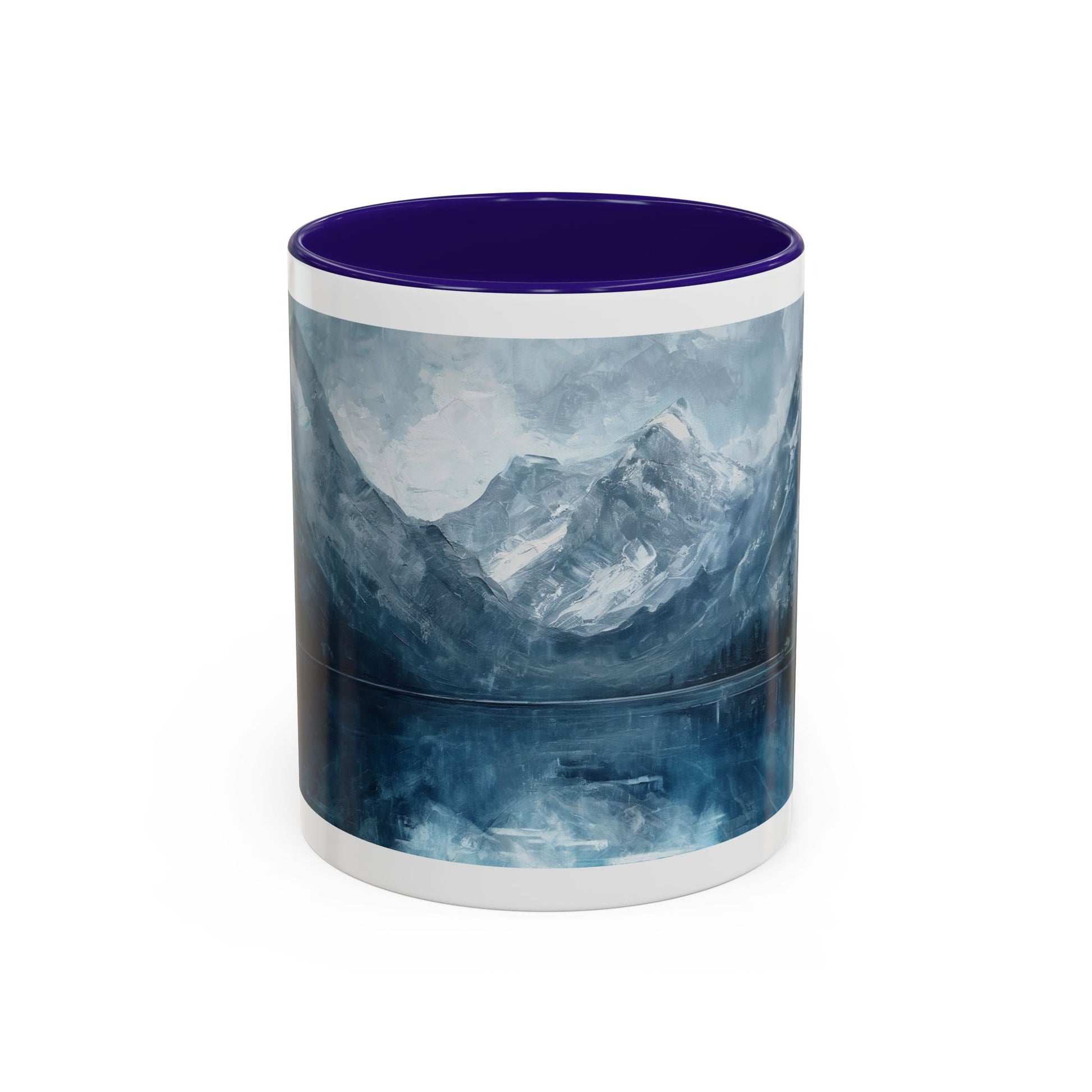 A glossy ceramic mug that brings a quiet mountain morning to your countertop. Hand-painted blues and soft grays wrap around the surface like mist over a lake, reflecting snow-capped peaks and a line of pine silhouettes. The colored interior and handle add a subtle pop that complements the moody landscape. Sip slowly — this mug invites lingering moments, whether you’re easing into a creative session, stacking tiny rituals into your work-from-home routine, or sharing a calm cup with a friend after a long walk in the woods.