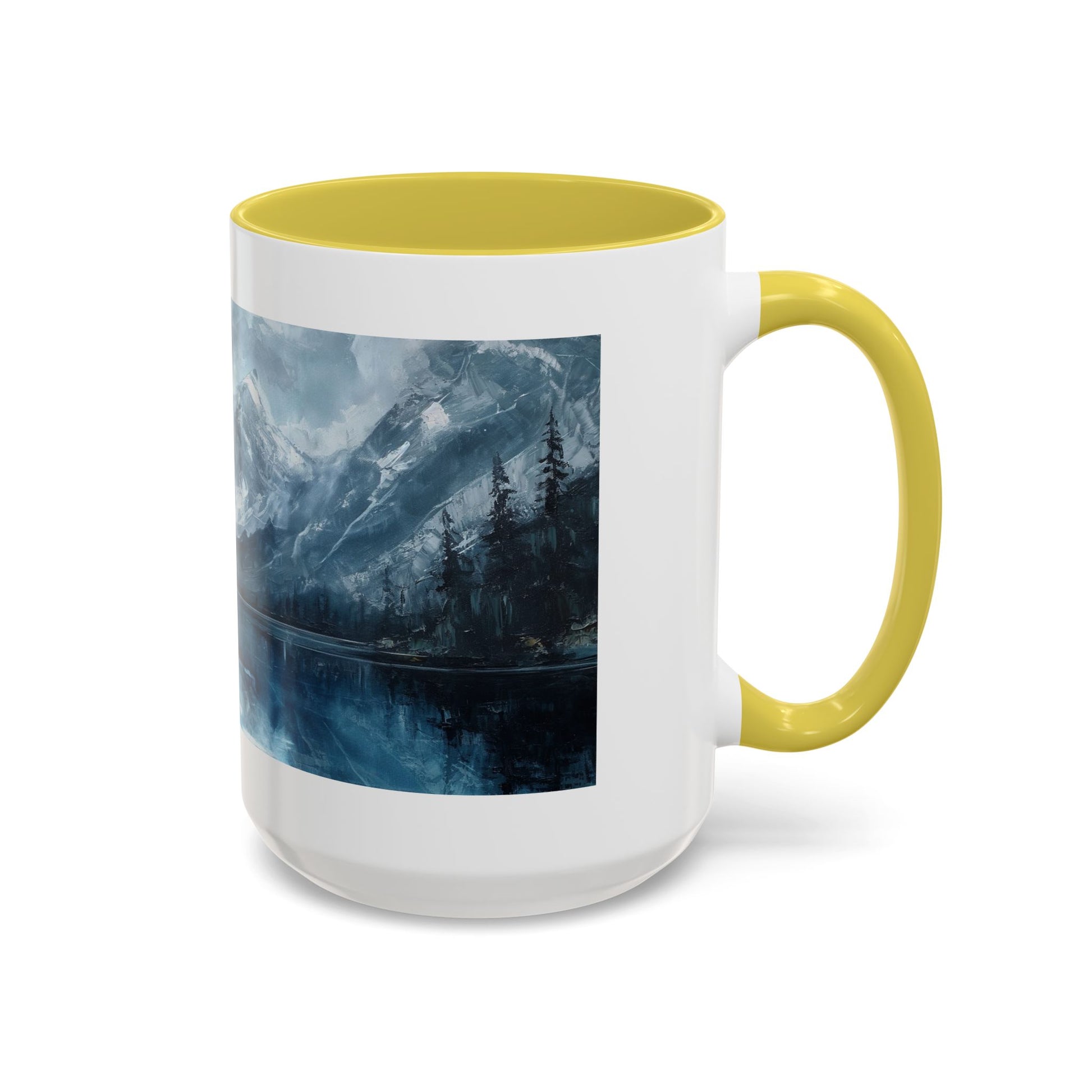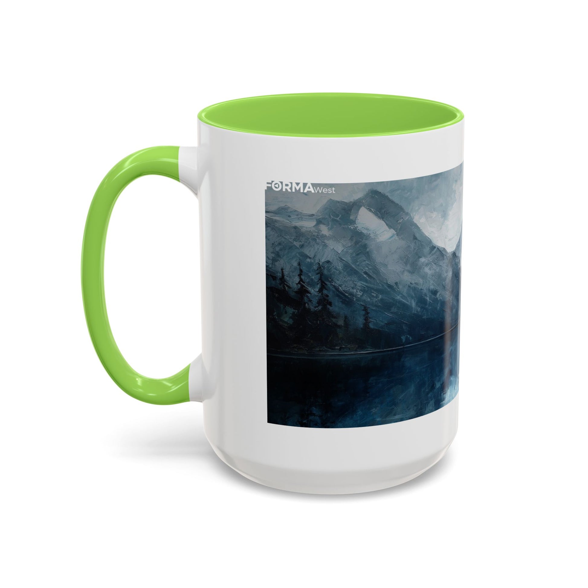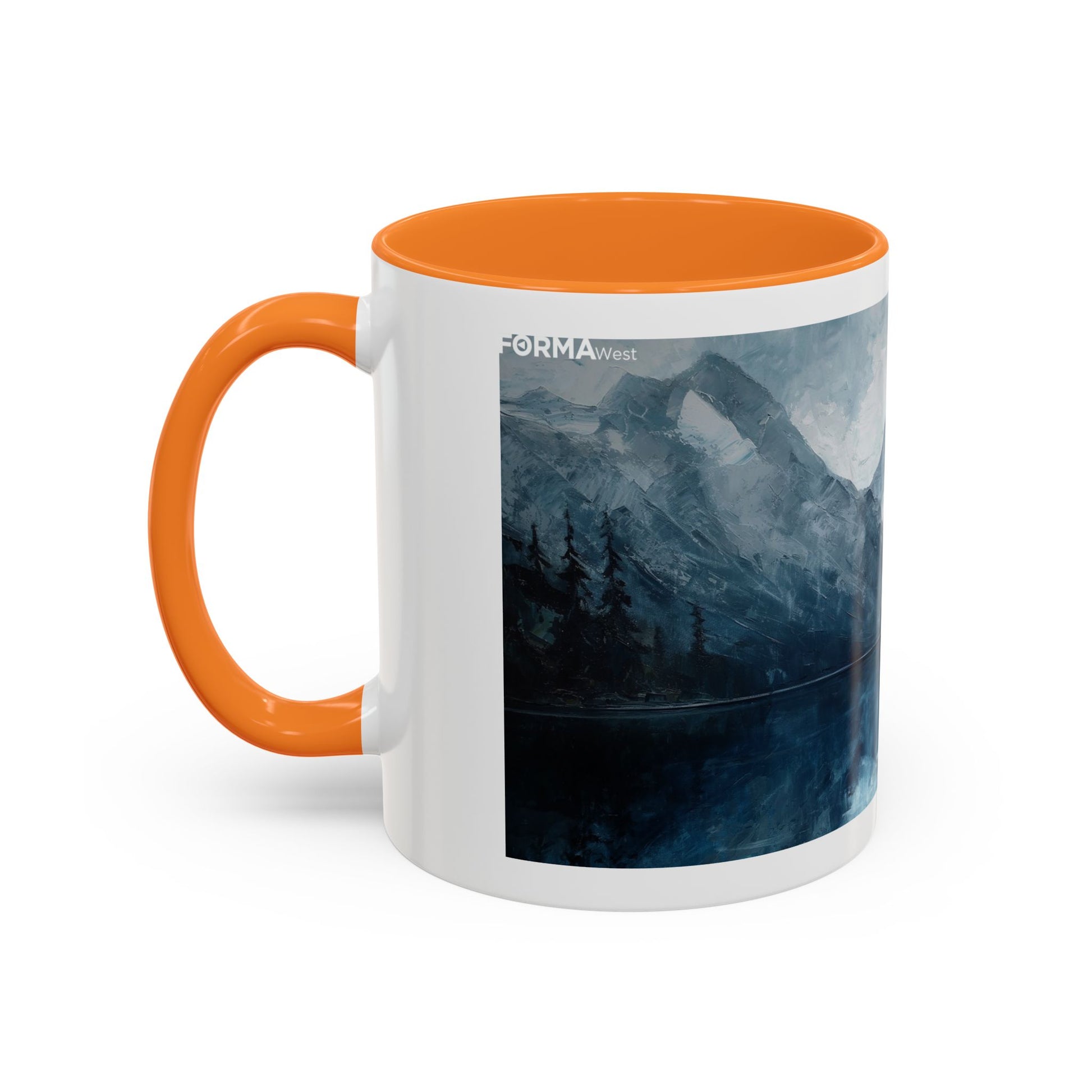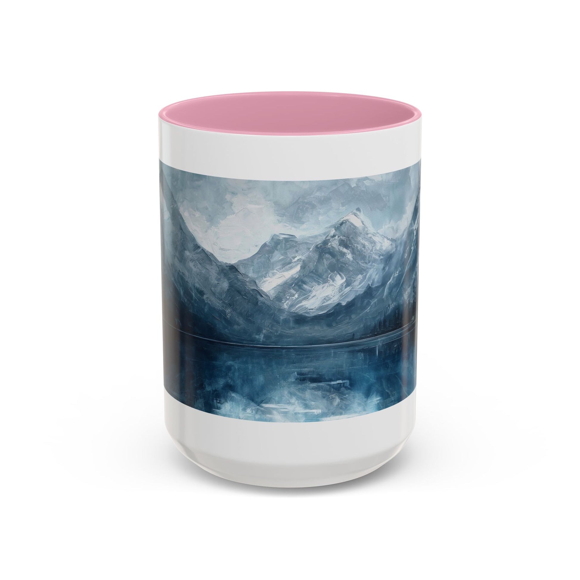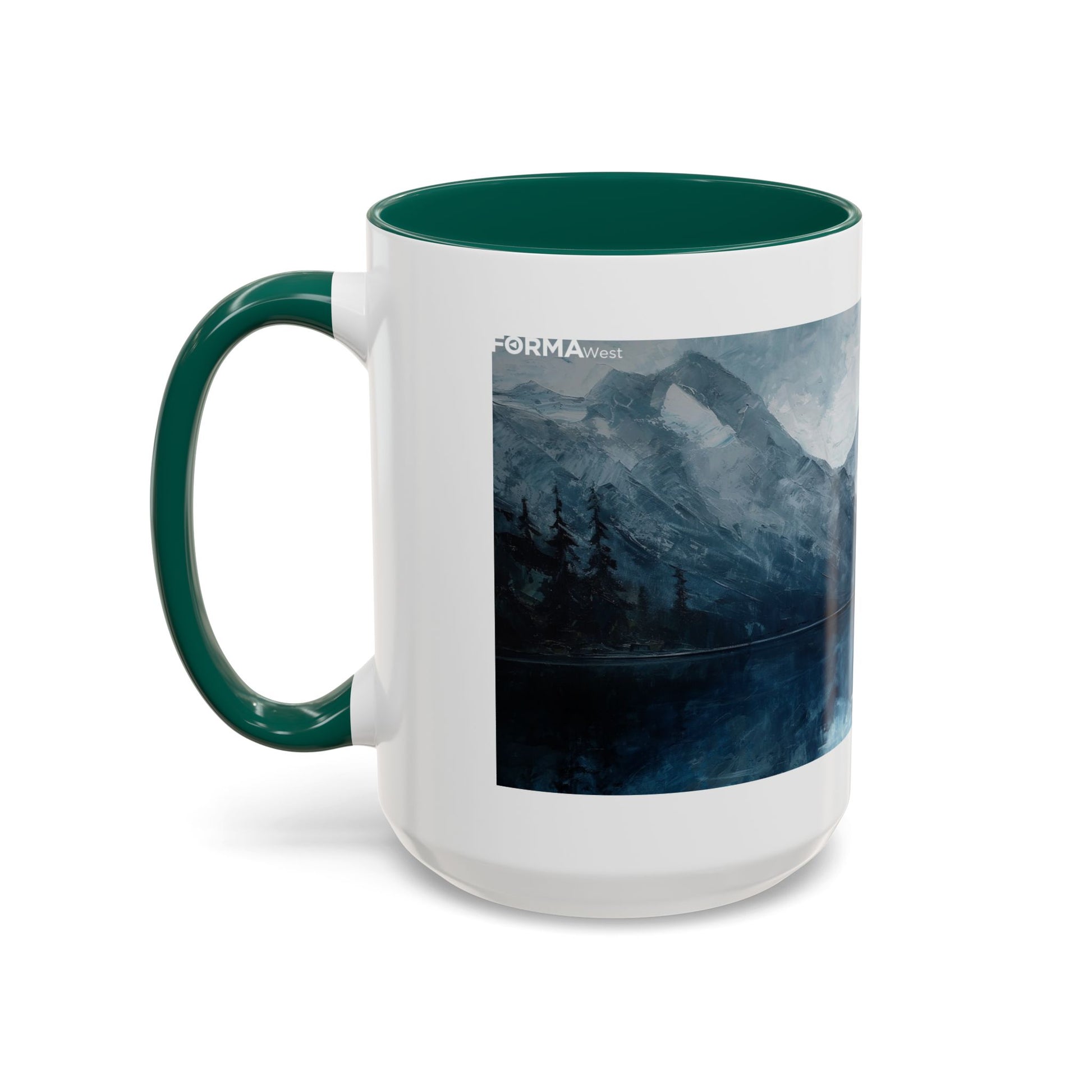 A glossy ceramic mug that brings a quiet mountain morning to your countertop. Hand-painted blues and soft grays wrap around the surface like mist over a lake, reflecting snow-capped peaks and a line of pine silhouettes. The colored interior and handle add a subtle pop that complements the moody landscape. Sip slowly — this mug invites lingering moments, whether you’re easing into a creative session, stacking tiny rituals into your work-from-home routine, or sharing a calm cup with a friend after a long walk in the woods.