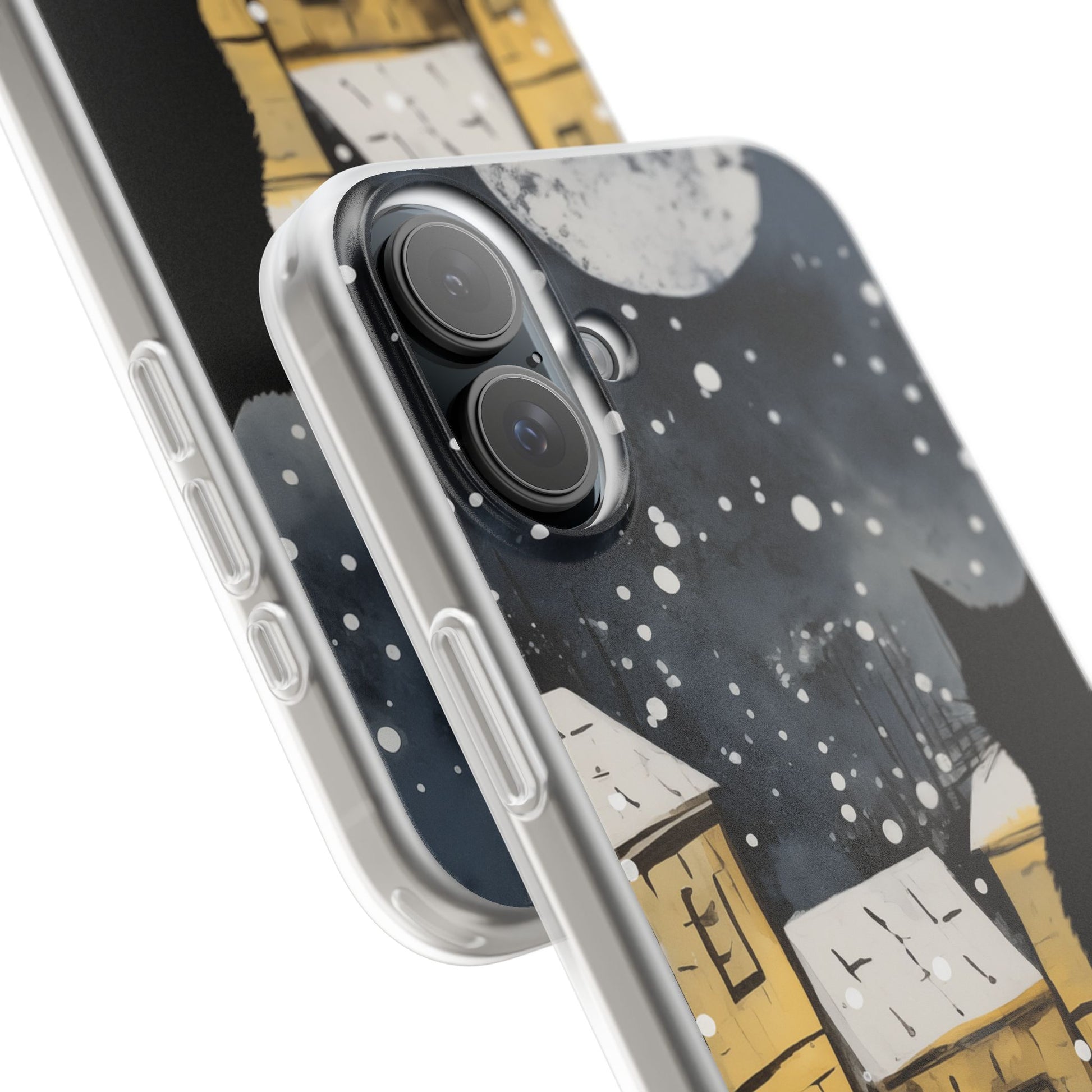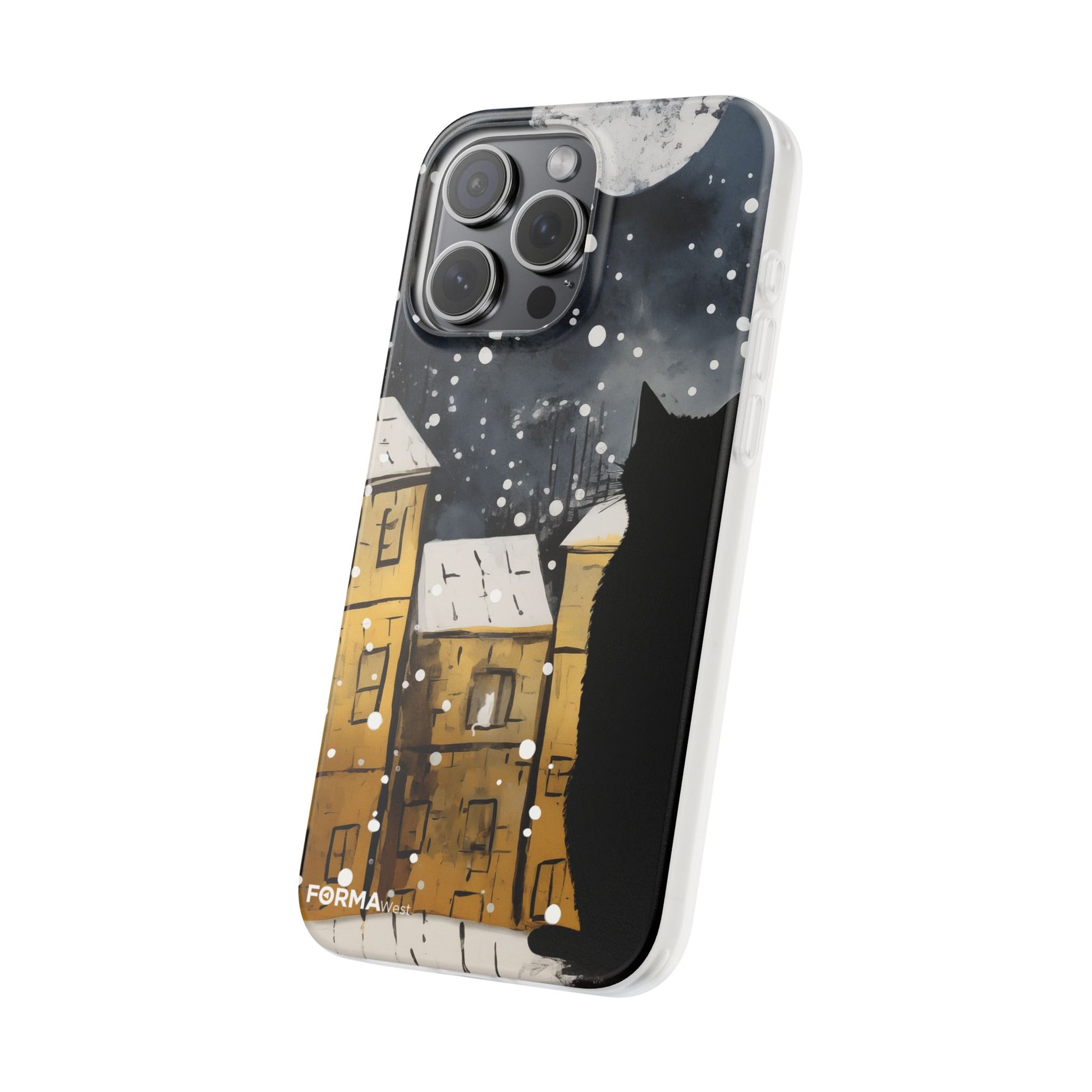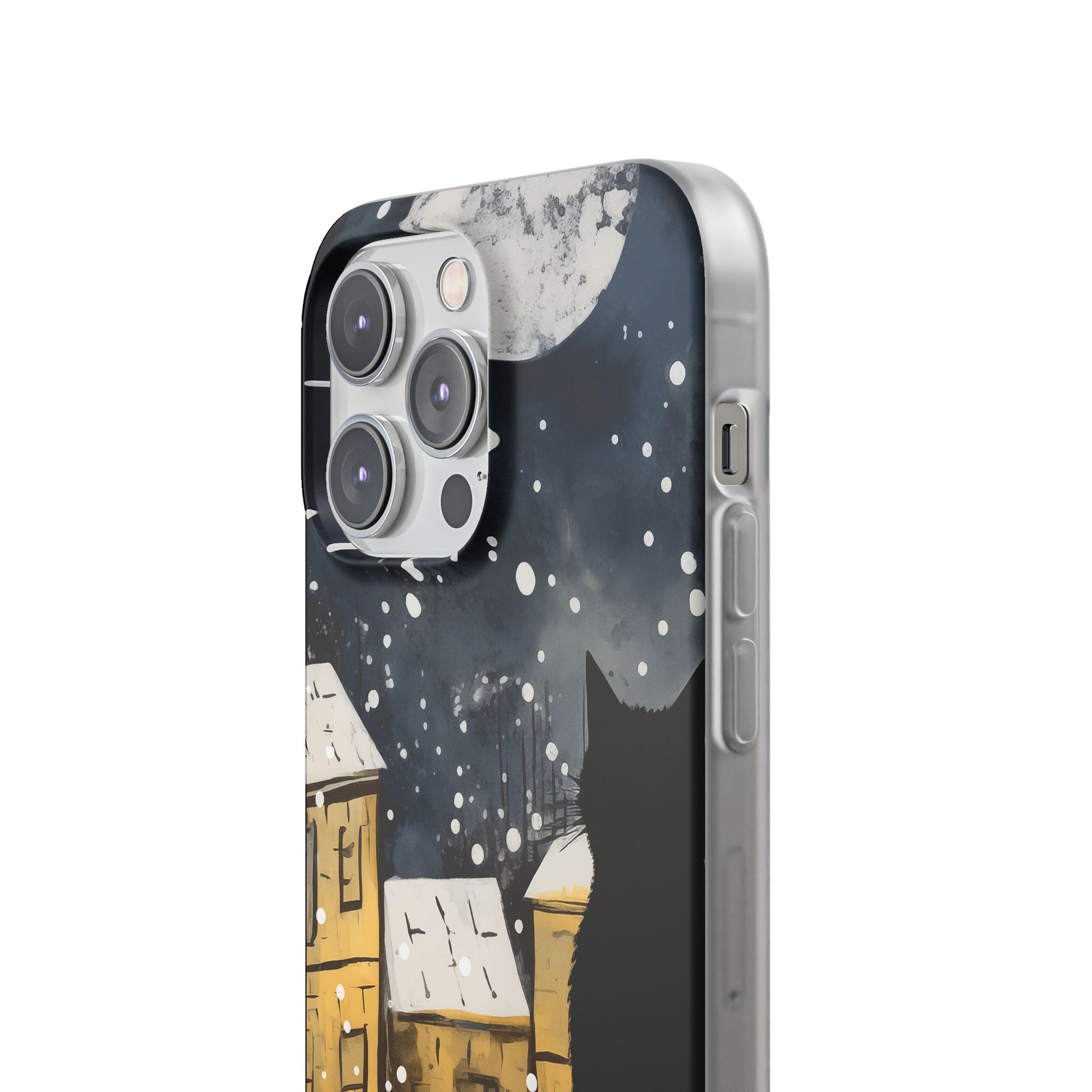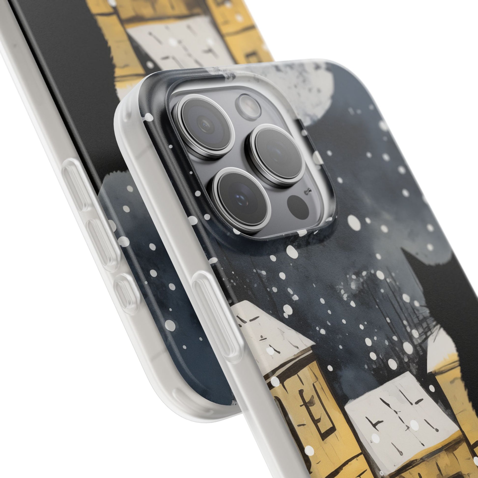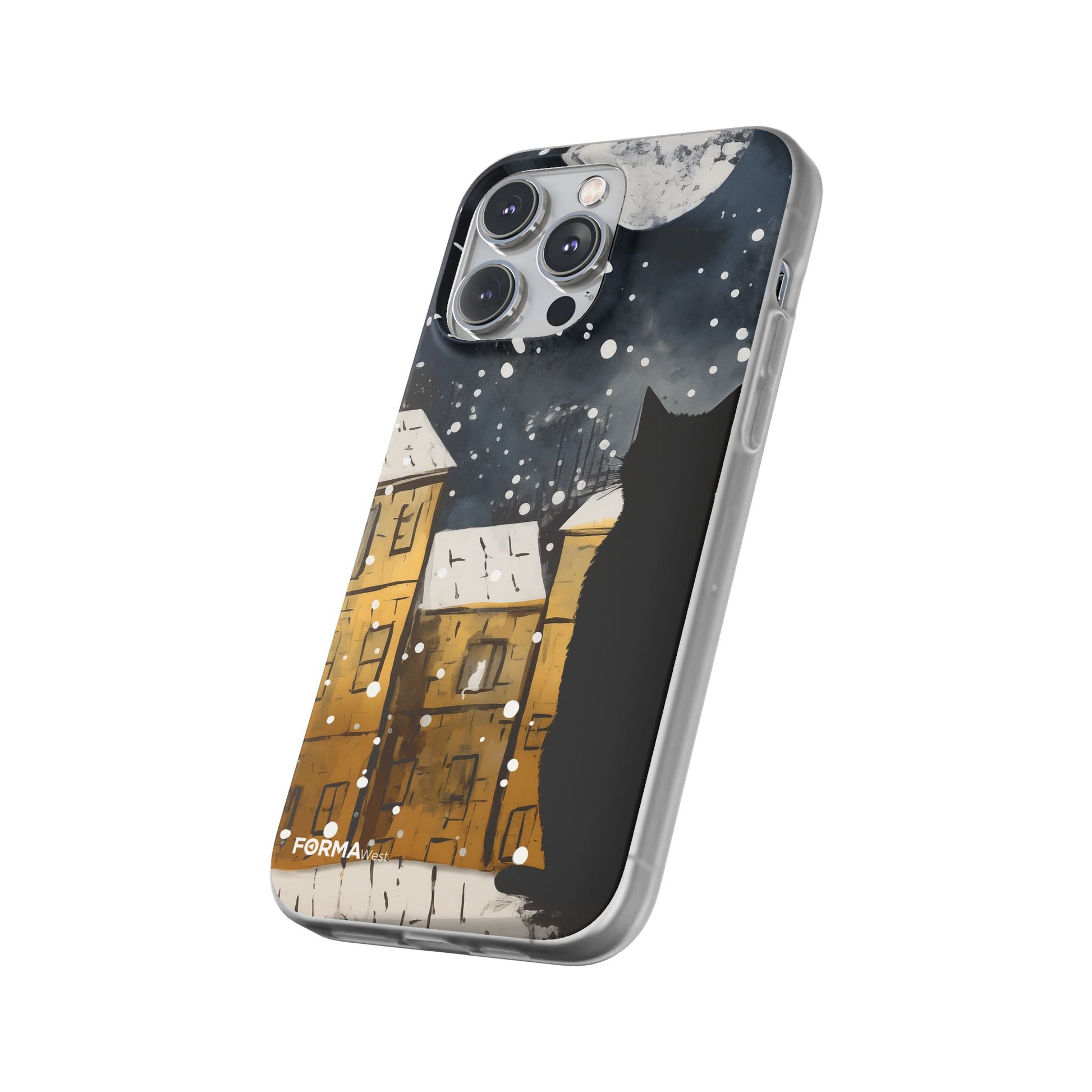 A slim, frosted-flex phone case that frames your device with quiet, wintry charm. The matte, semi-transparent TPU body shows a hand-drawn night scene — moonlit sky, soft falling snow, warm ochre rooftops — with the silhouette of a cat watching from the edge. Lightweight and flexible, it slips on easily and cushions against knocks while keeping a low profile so your phone’s lines remain elegant. The printed art stays bright thanks to advanced printing methods, giving the case the look of a little winter illustration you can carry every day.