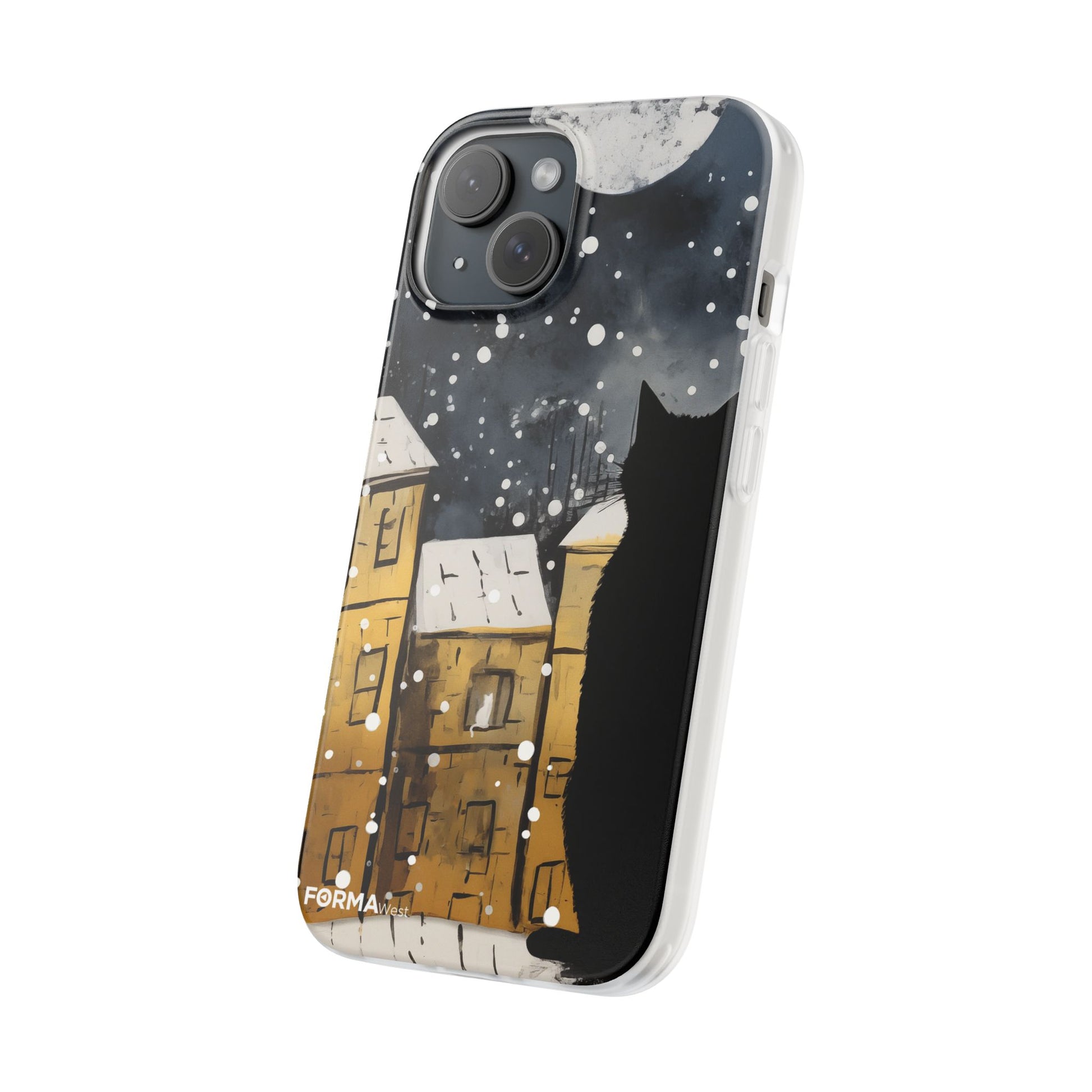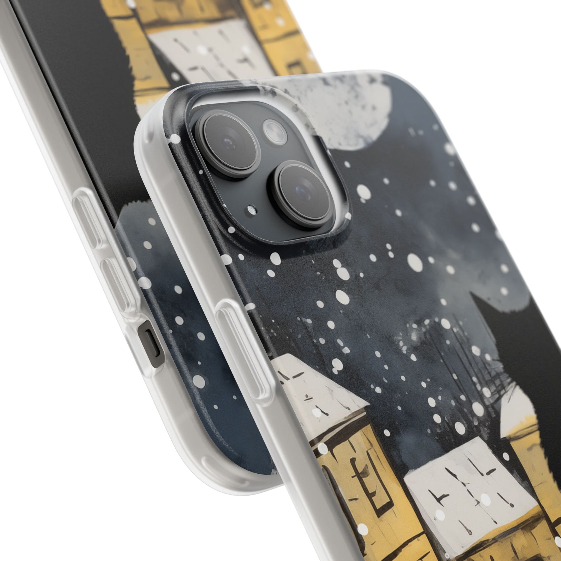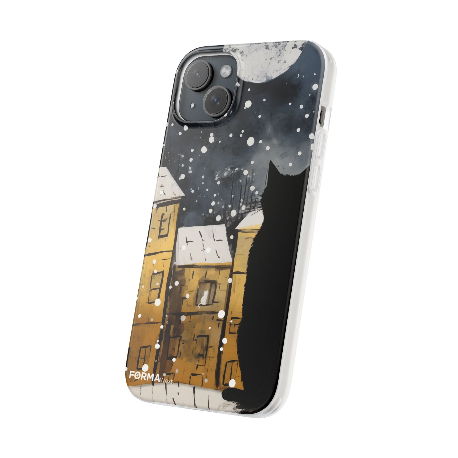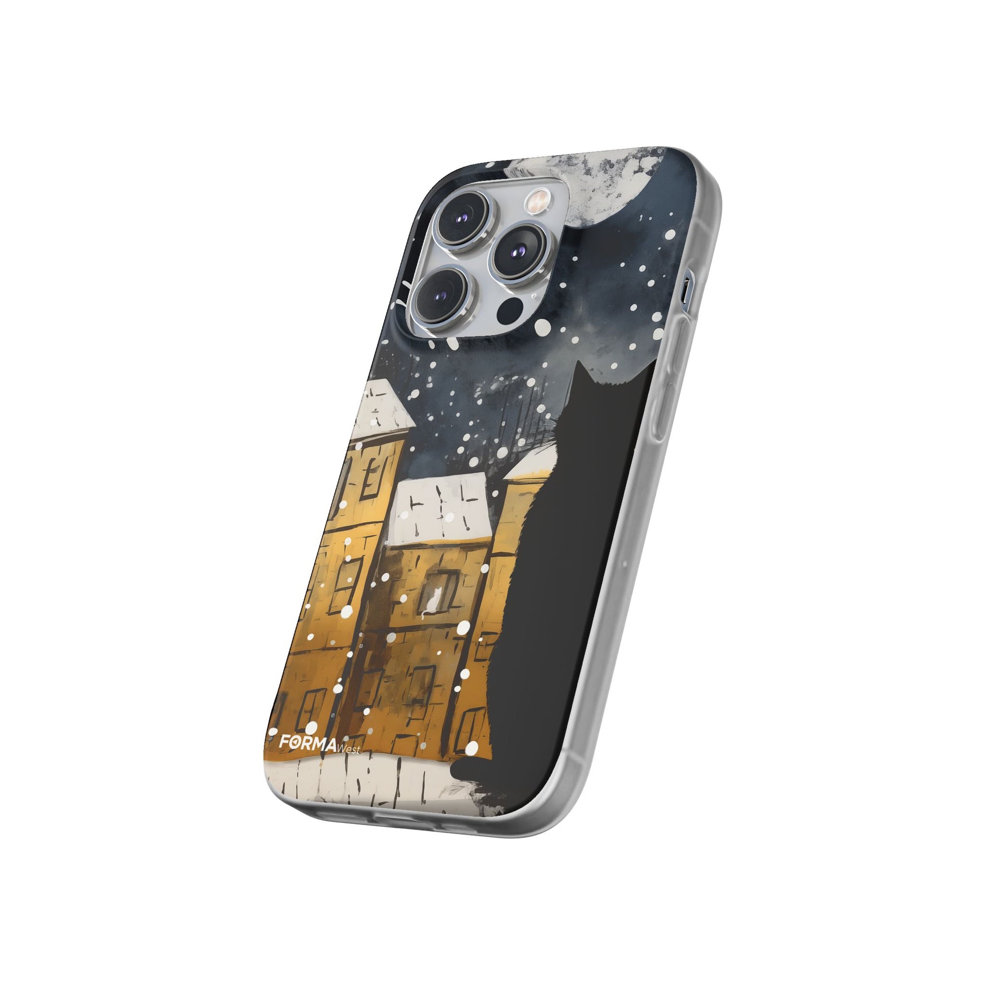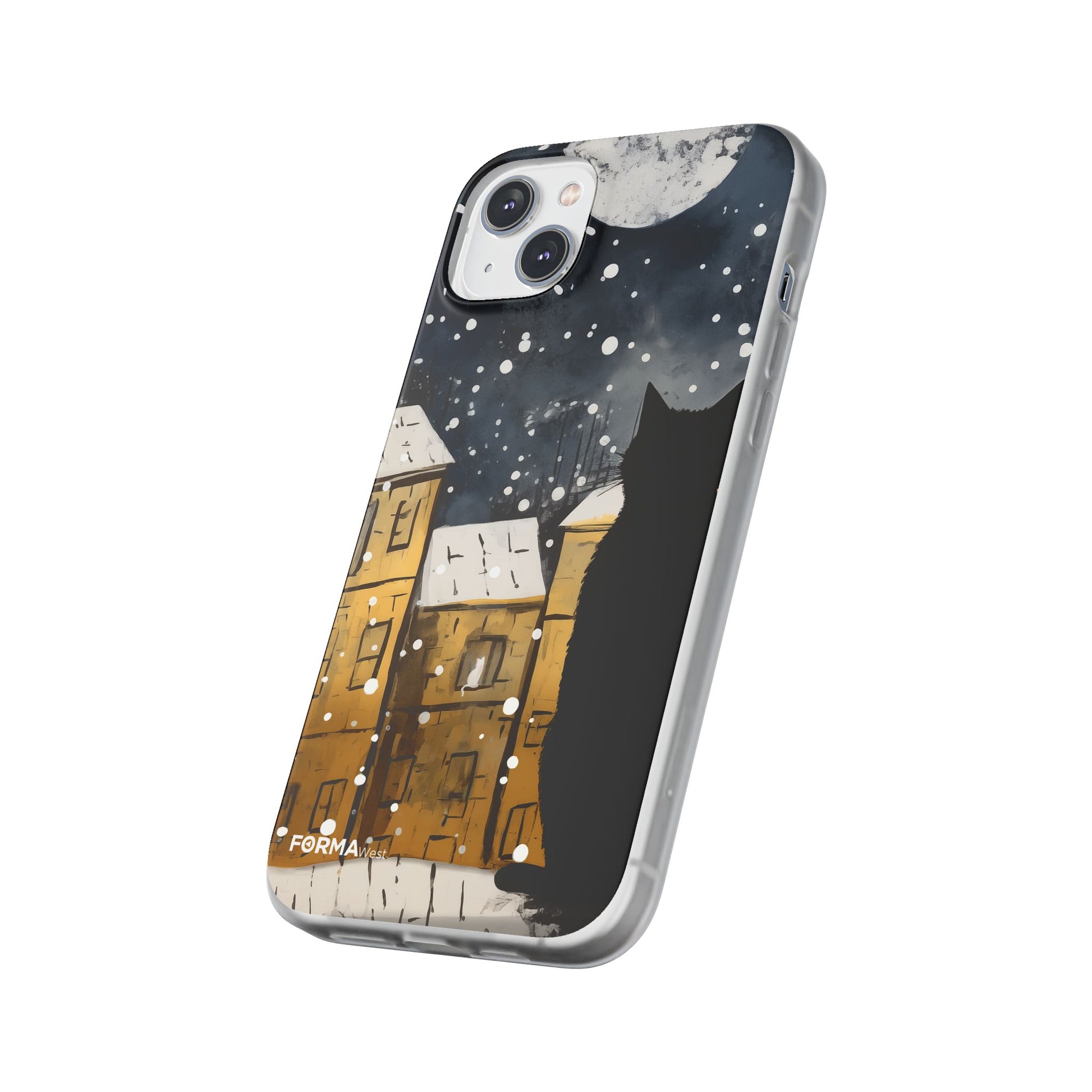 A slim, frosted-flex phone case that frames your device with quiet, wintry charm. The matte, semi-transparent TPU body shows a hand-drawn night scene — moonlit sky, soft falling snow, warm ochre rooftops — with the silhouette of a cat watching from the edge. Lightweight and flexible, it slips on easily and cushions against knocks while keeping a low profile so your phone’s lines remain elegant. The printed art stays bright thanks to advanced printing methods, giving the case the look of a little winter illustration you can carry every day.