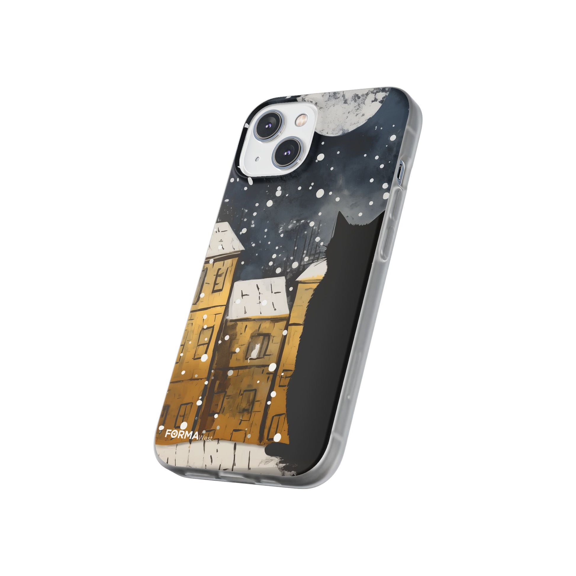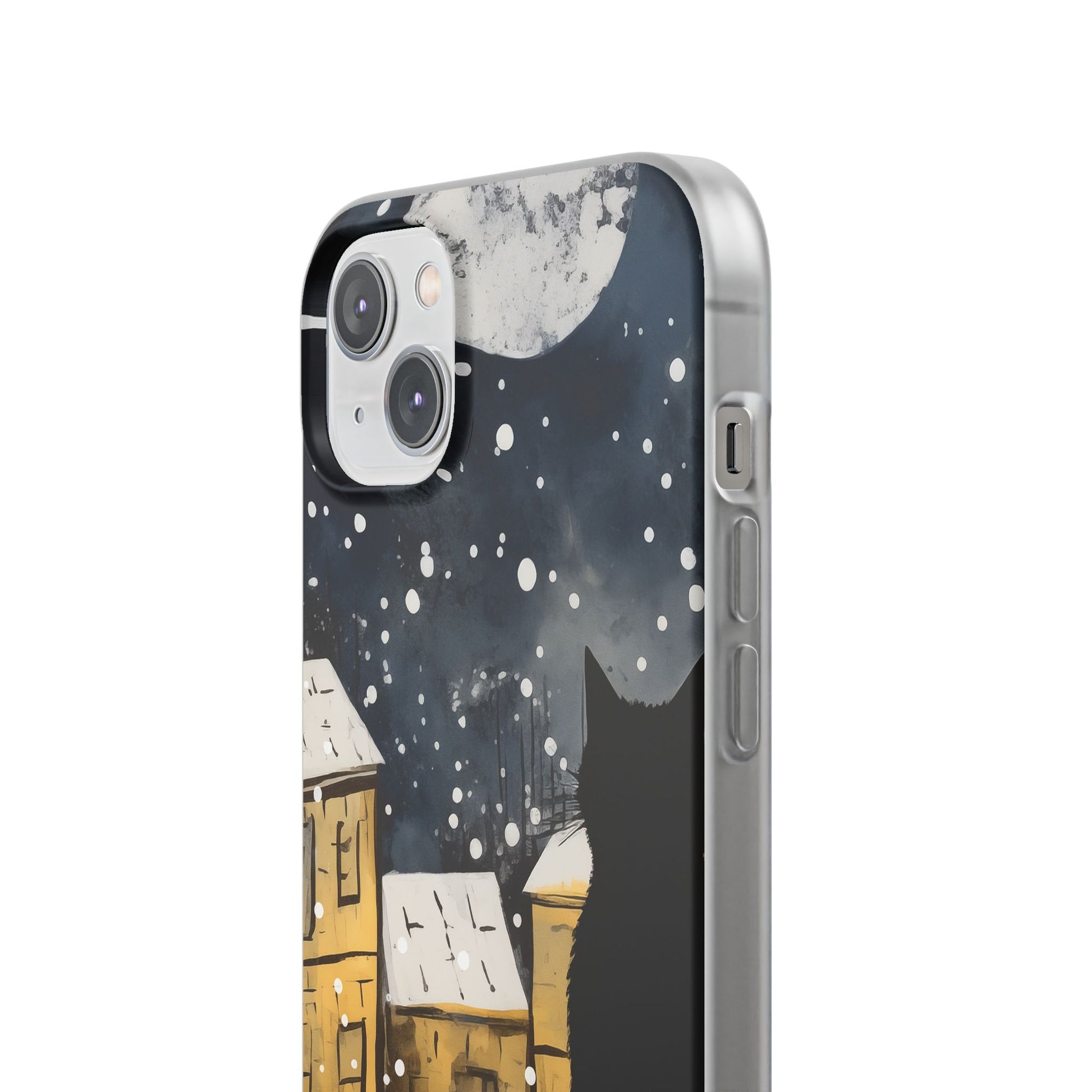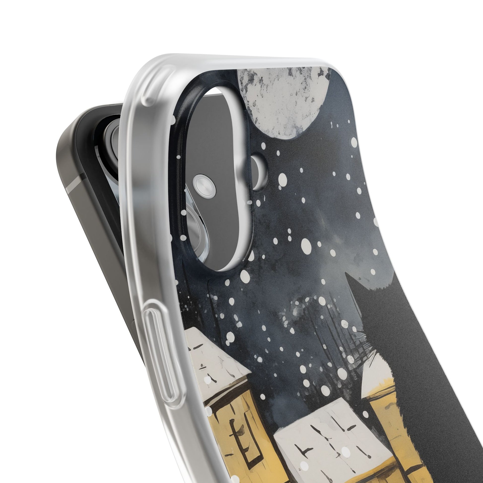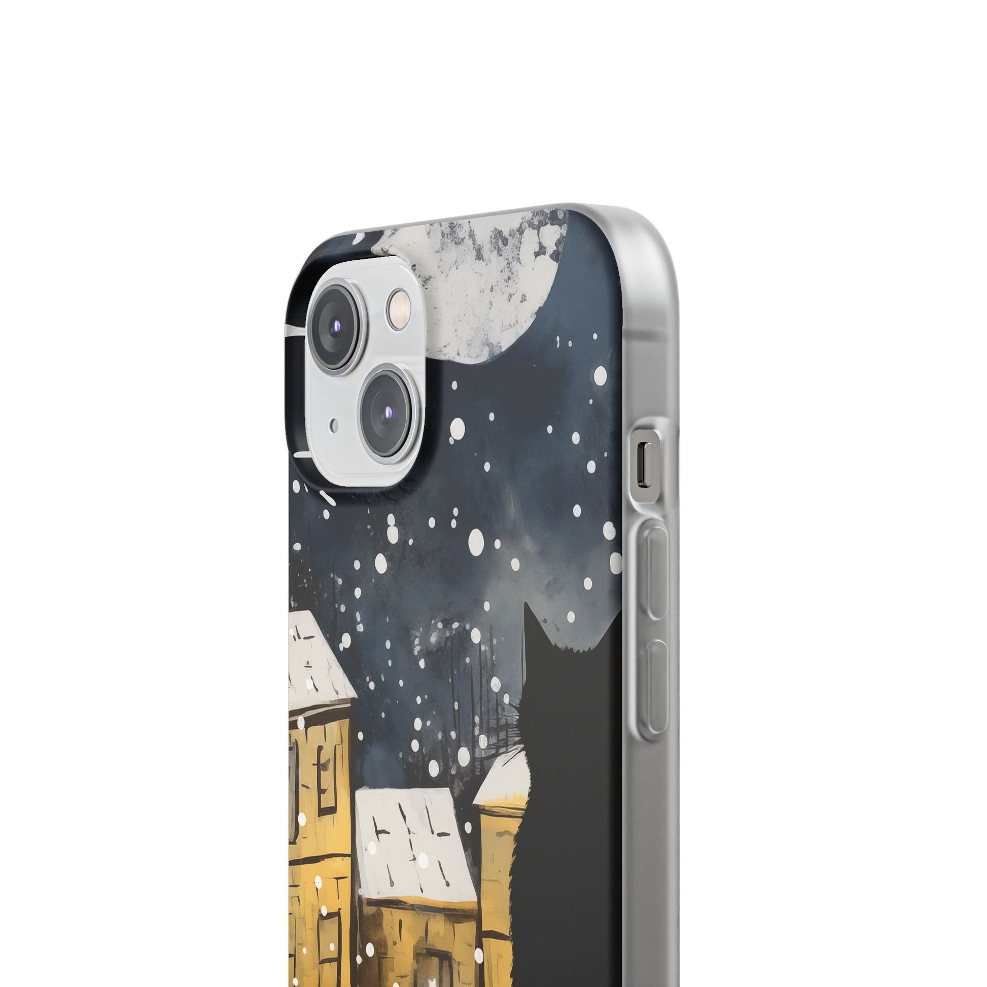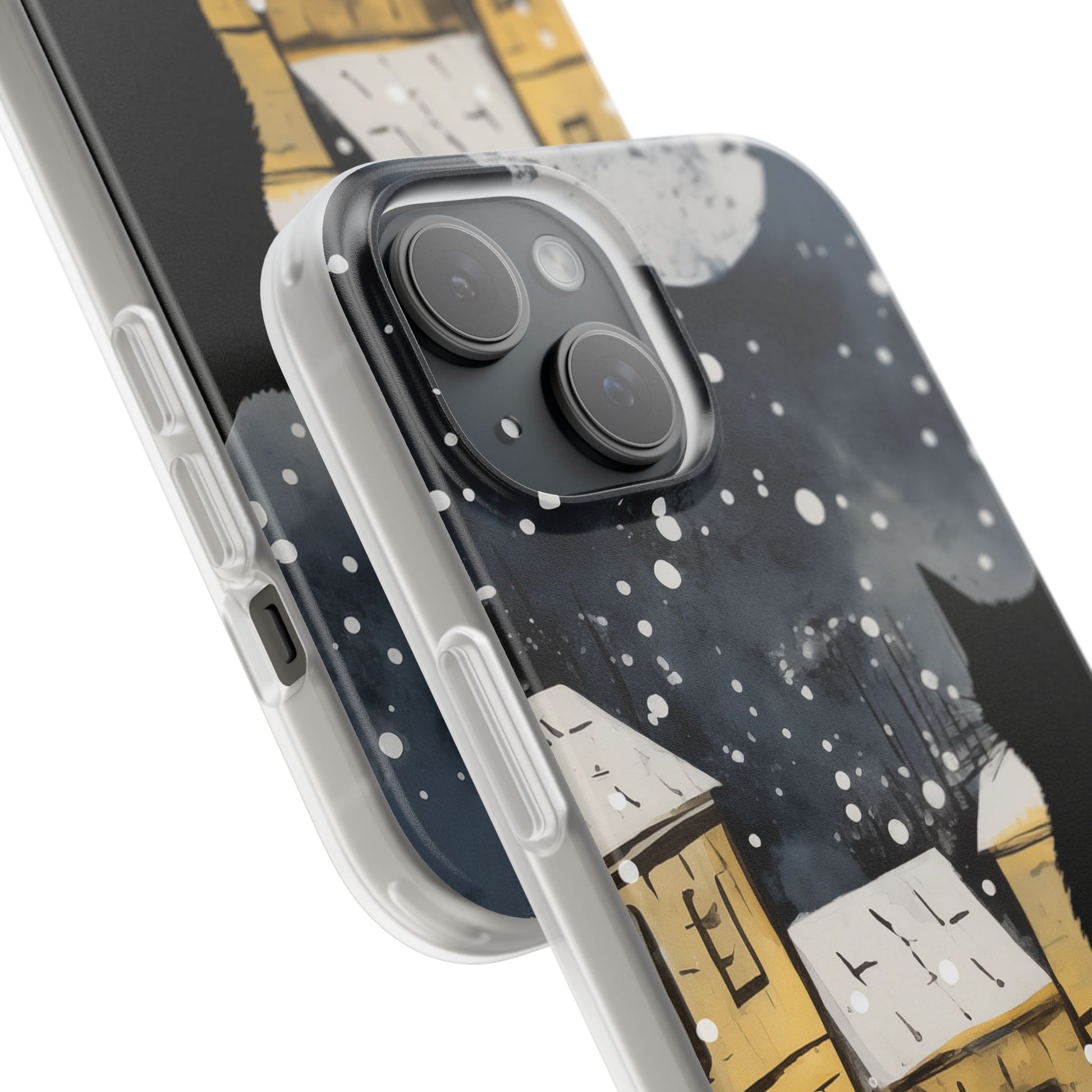 A slim, frosted-flex phone case that frames your device with quiet, wintry charm. The matte, semi-transparent TPU body shows a hand-drawn night scene — moonlit sky, soft falling snow, warm ochre rooftops — with the silhouette of a cat watching from the edge. Lightweight and flexible, it slips on easily and cushions against knocks while keeping a low profile so your phone’s lines remain elegant. The printed art stays bright thanks to advanced printing methods, giving the case the look of a little winter illustration you can carry every day.