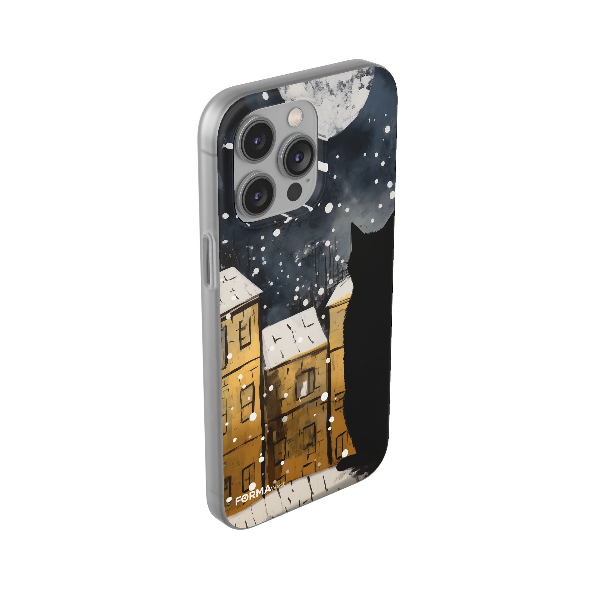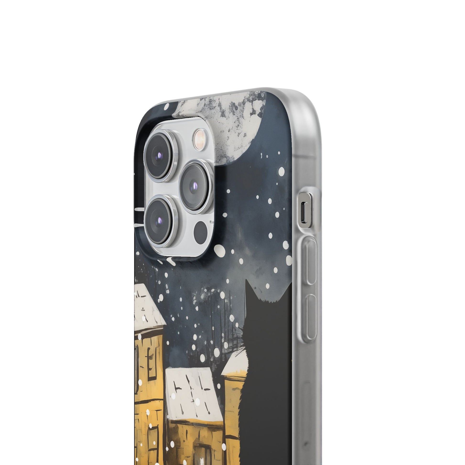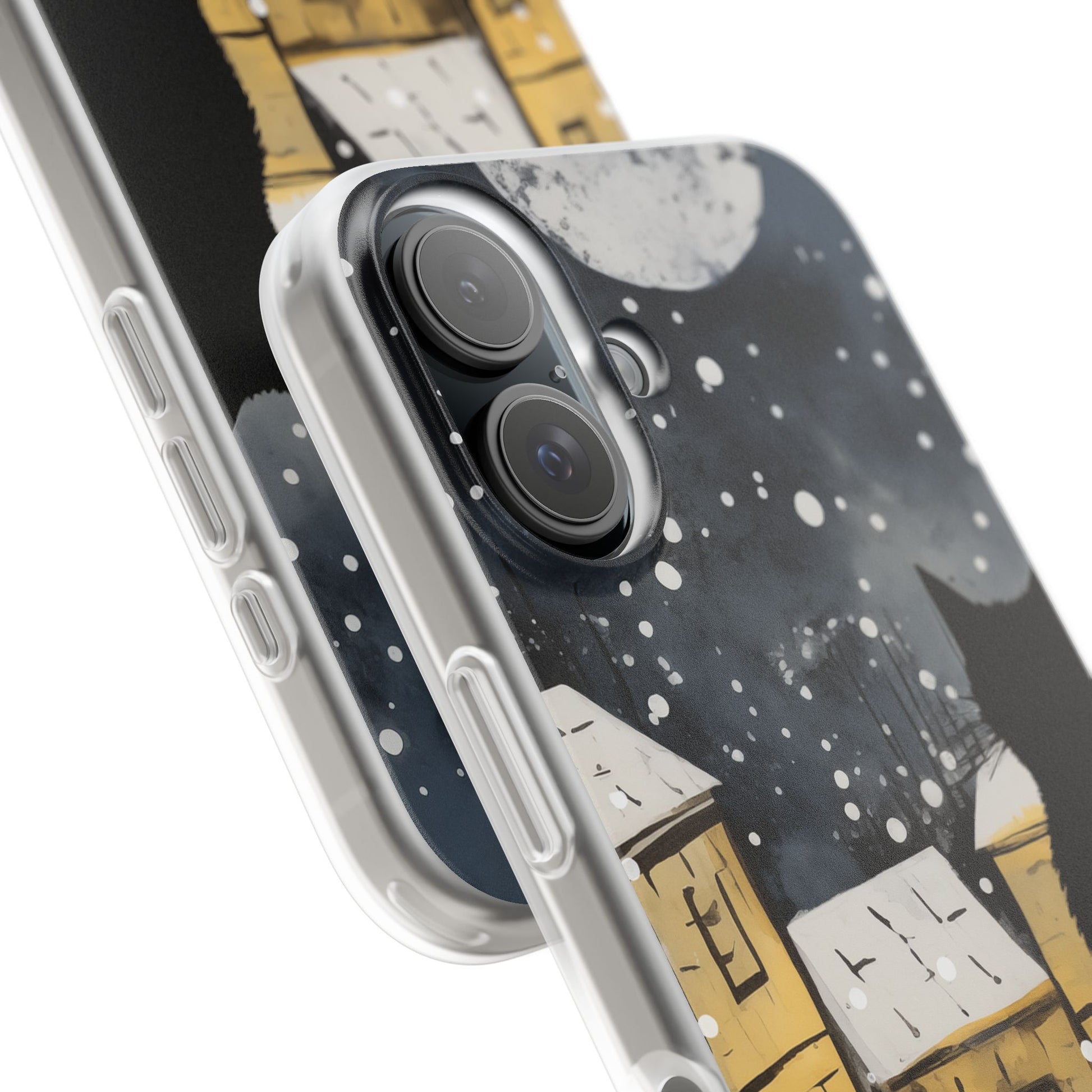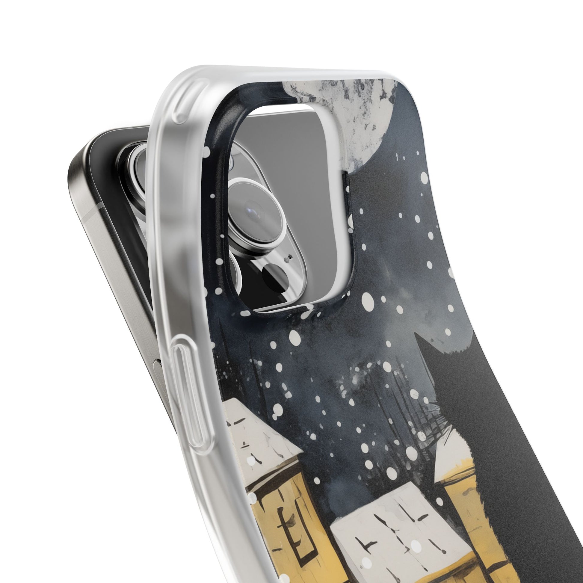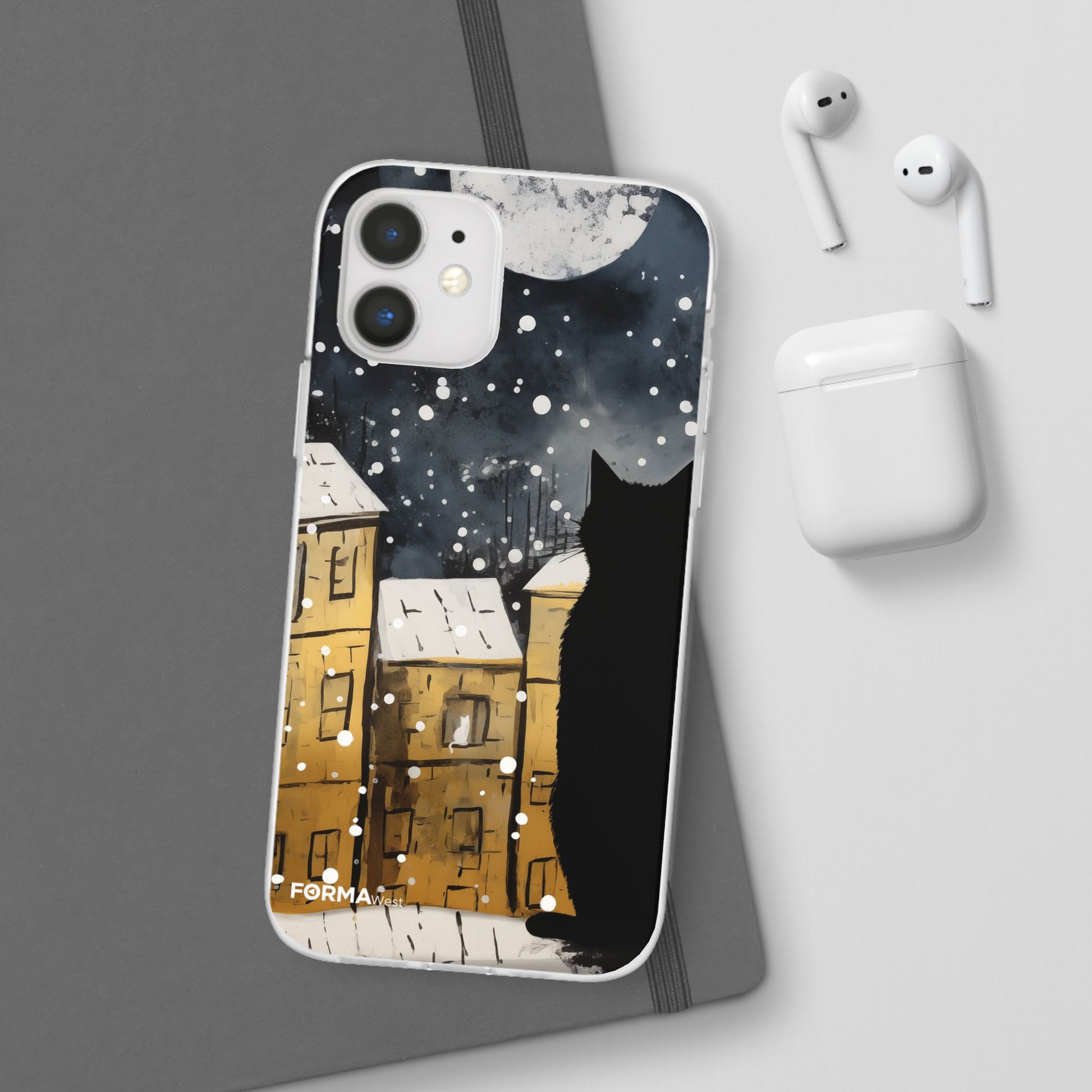 A slim, frosted-flex phone case that frames your device with quiet, wintry charm. The matte, semi-transparent TPU body shows a hand-drawn night scene — moonlit sky, soft falling snow, warm ochre rooftops — with the silhouette of a cat watching from the edge. Lightweight and flexible, it slips on easily and cushions against knocks while keeping a low profile so your phone’s lines remain elegant. The printed art stays bright thanks to advanced printing methods, giving the case the look of a little winter illustration you can carry every day.
