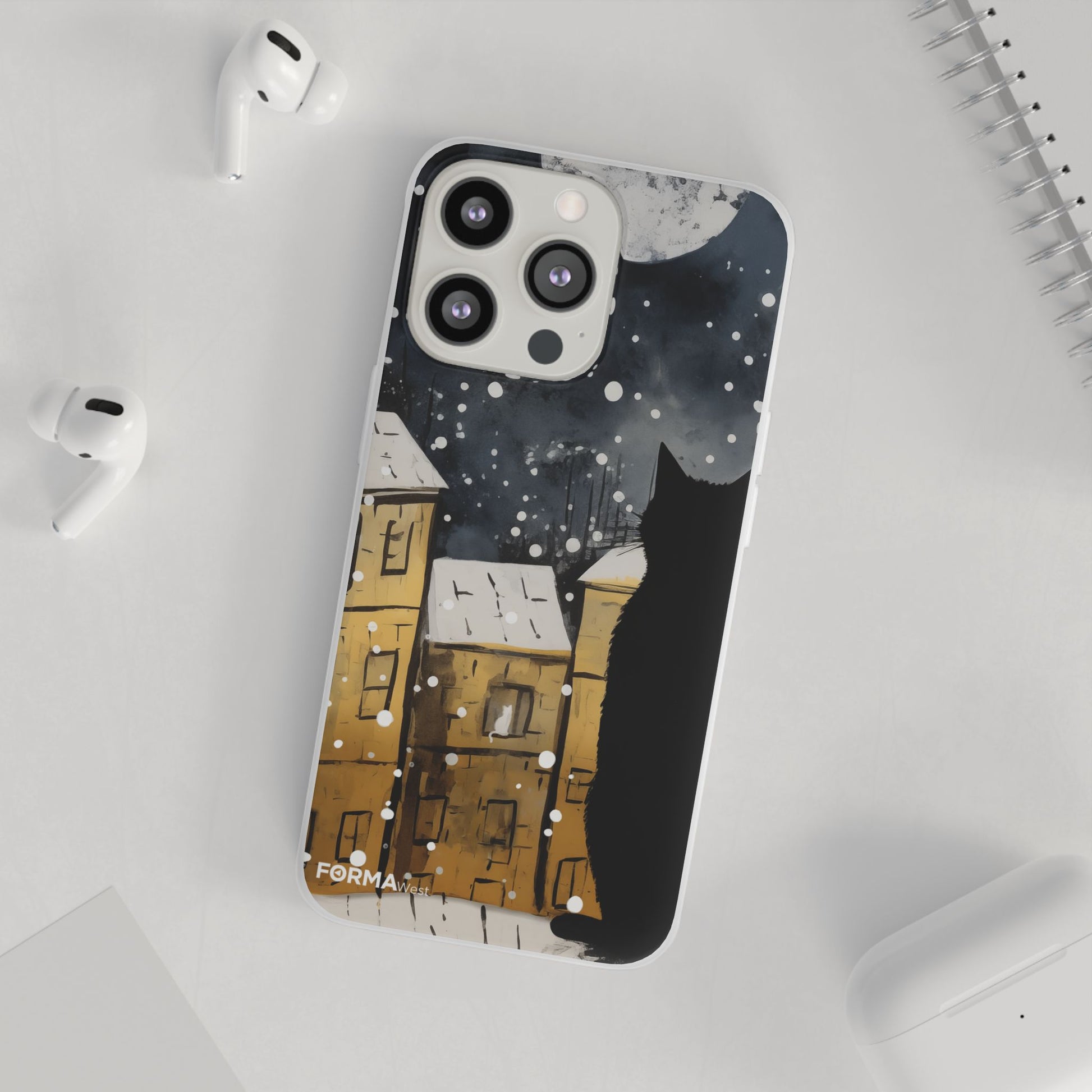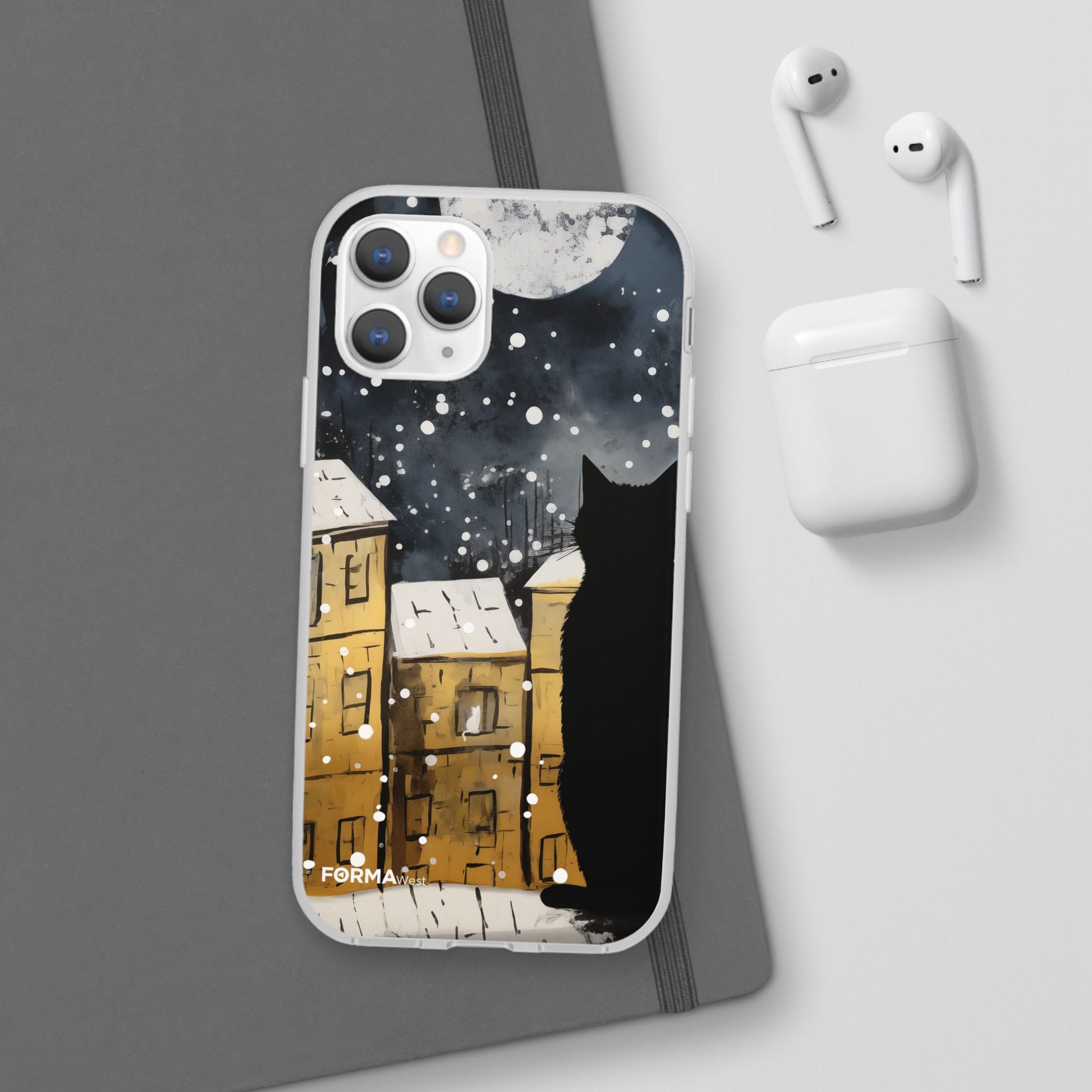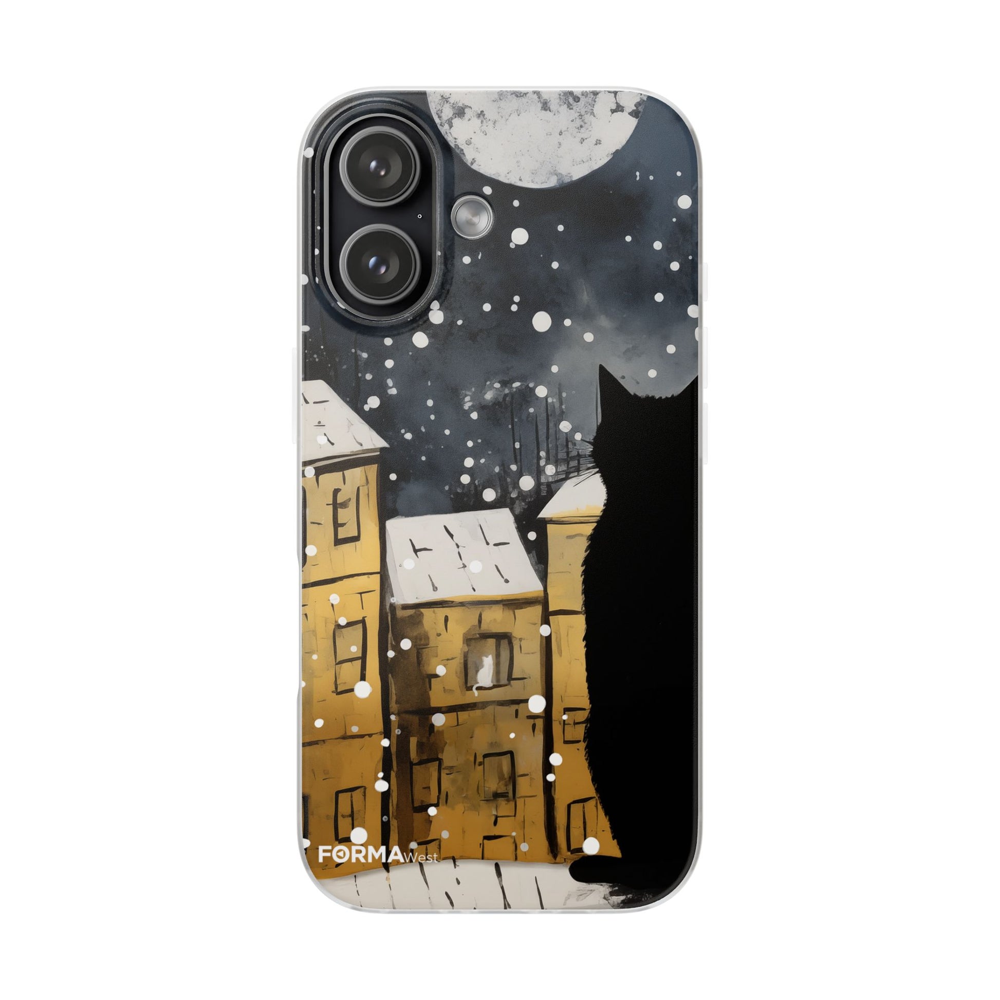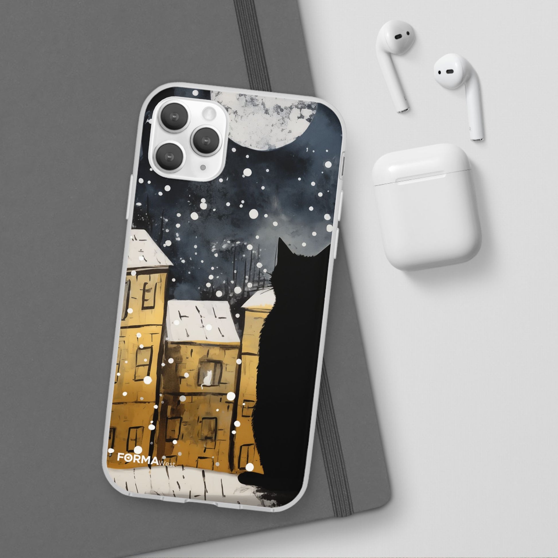 A slim, frosted-flex phone case that frames your device with quiet, wintry charm. The matte, semi-transparent TPU body shows a hand-drawn night scene — moonlit sky, soft falling snow, warm ochre rooftops — with the silhouette of a cat watching from the edge. Lightweight and flexible, it slips on easily and cushions against knocks while keeping a low profile so your phone’s lines remain elegant. The printed art stays bright thanks to advanced printing methods, giving the case the look of a little winter illustration you can carry every day.
