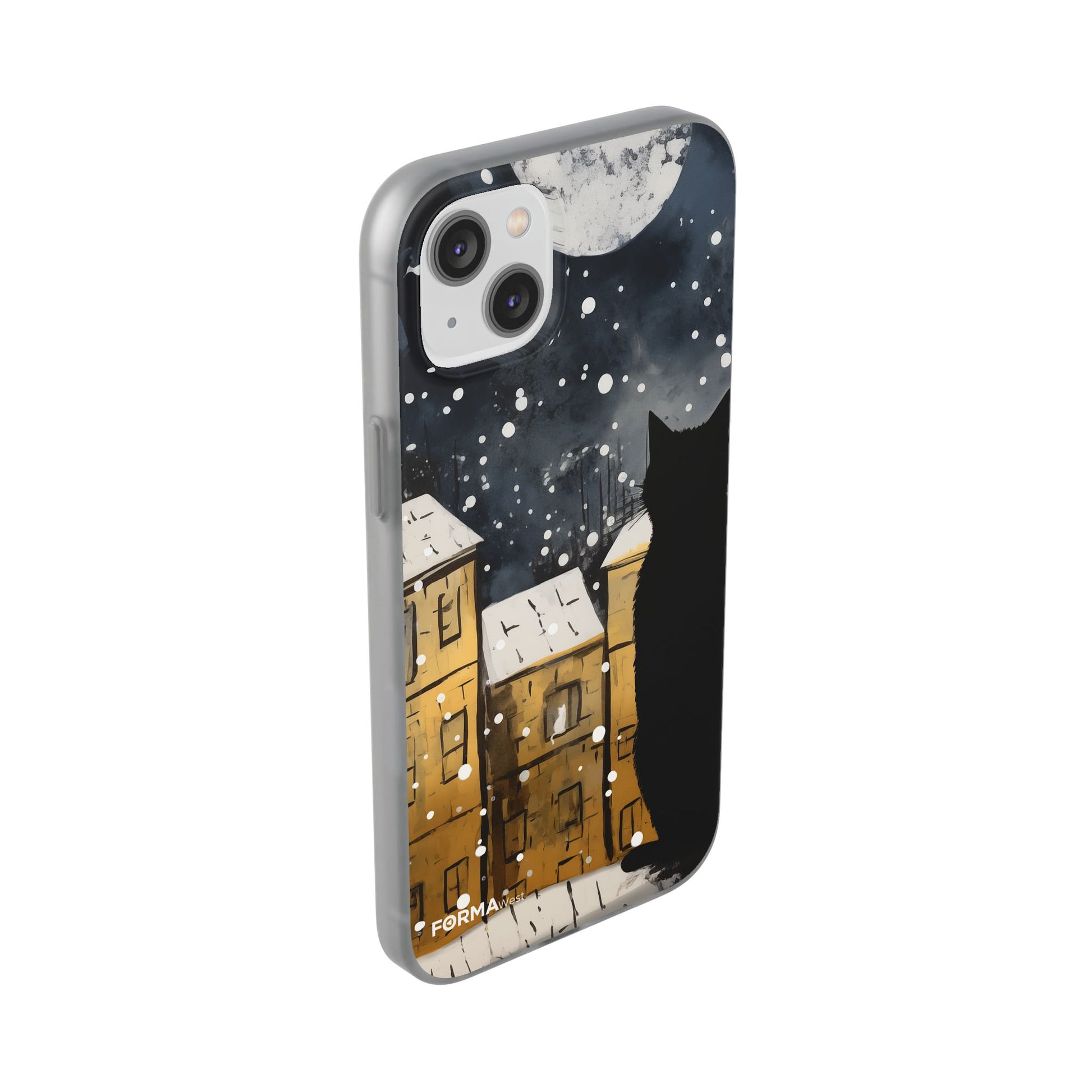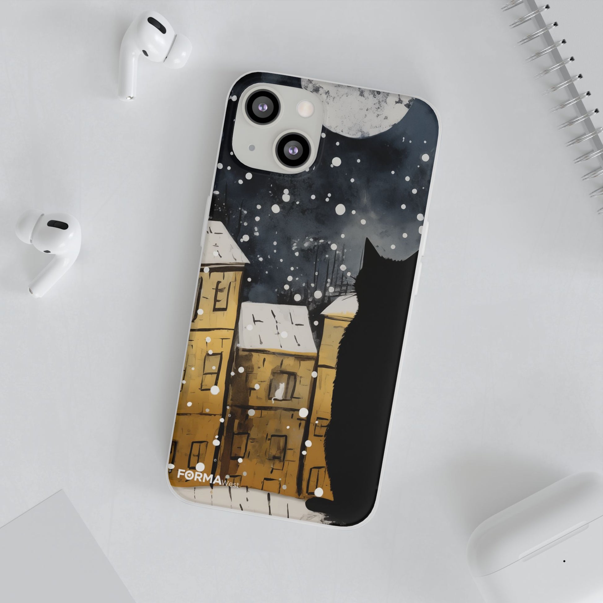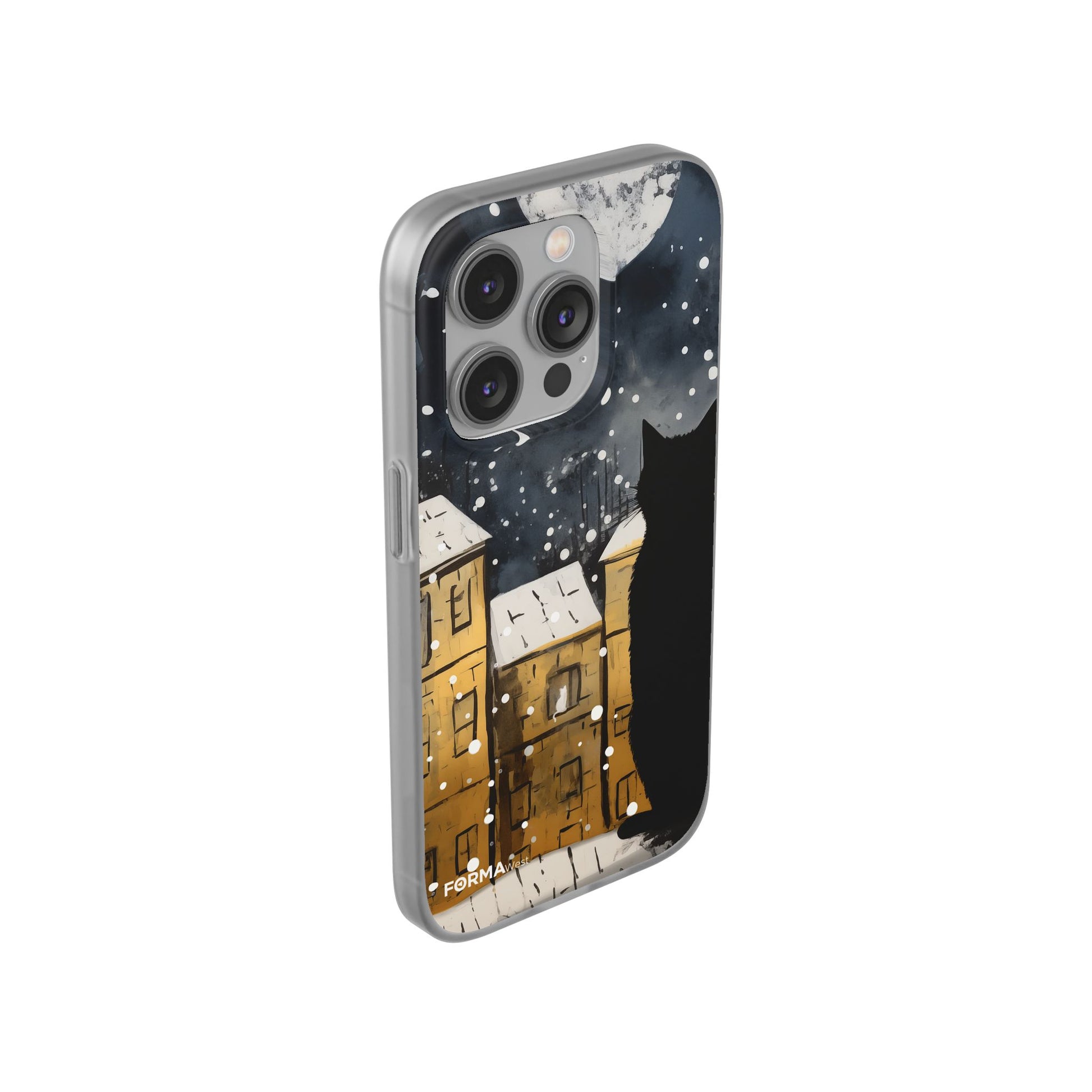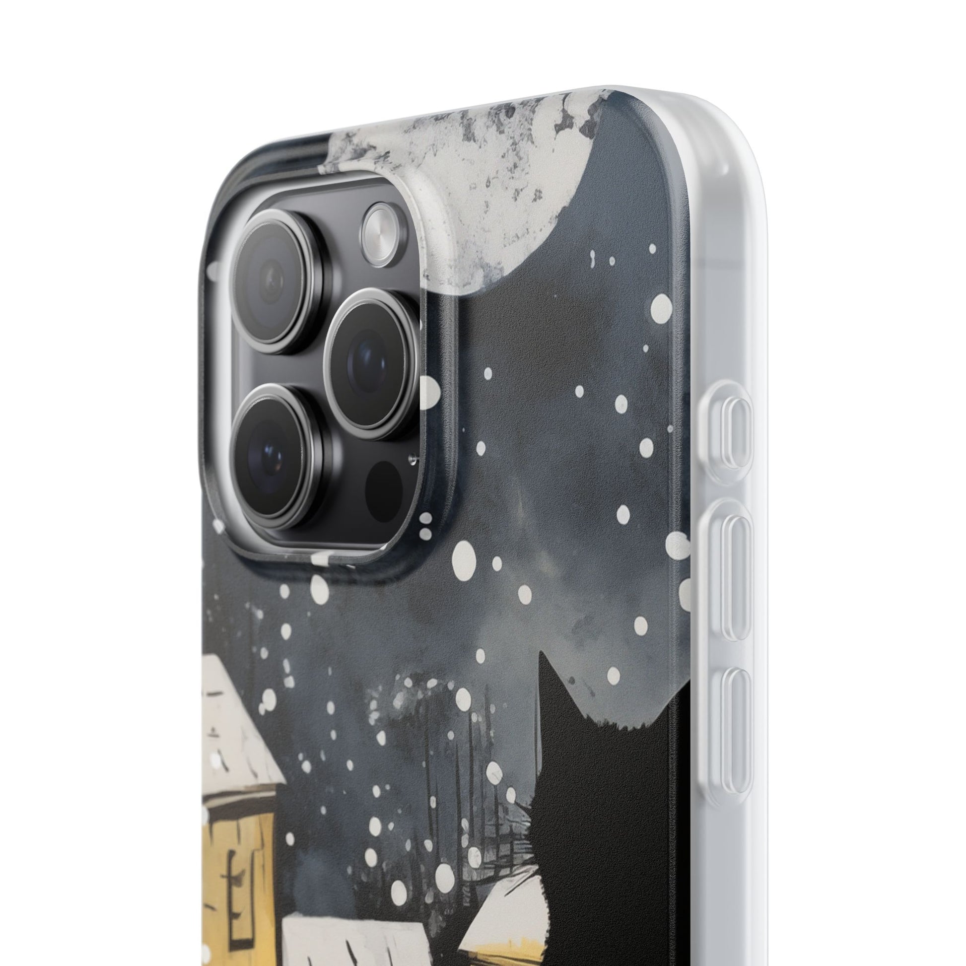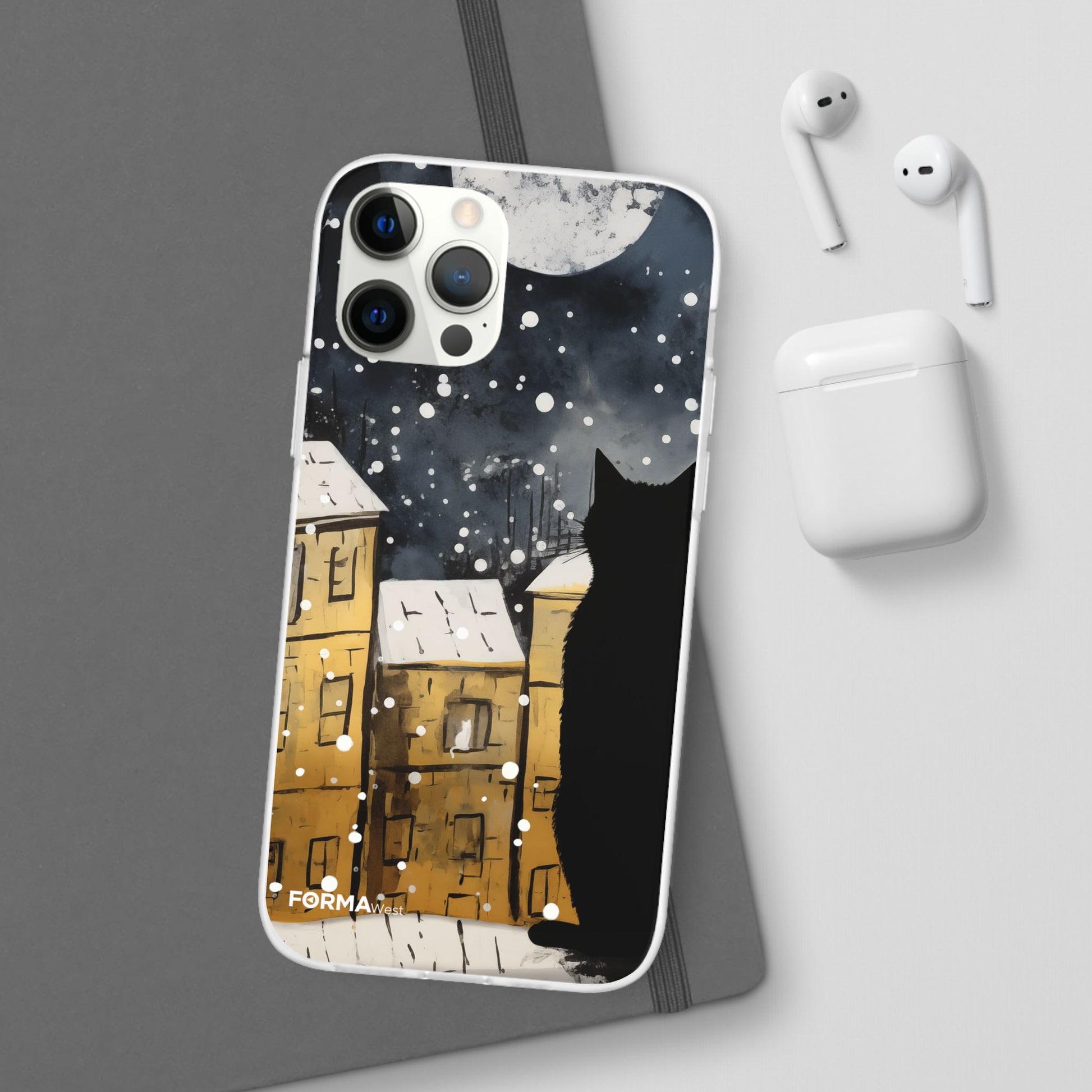 A slim, frosted-flex phone case that frames your device with quiet, wintry charm. The matte, semi-transparent TPU body shows a hand-drawn night scene — moonlit sky, soft falling snow, warm ochre rooftops — with the silhouette of a cat watching from the edge. Lightweight and flexible, it slips on easily and cushions against knocks while keeping a low profile so your phone’s lines remain elegant. The printed art stays bright thanks to advanced printing methods, giving the case the look of a little winter illustration you can carry every day.
