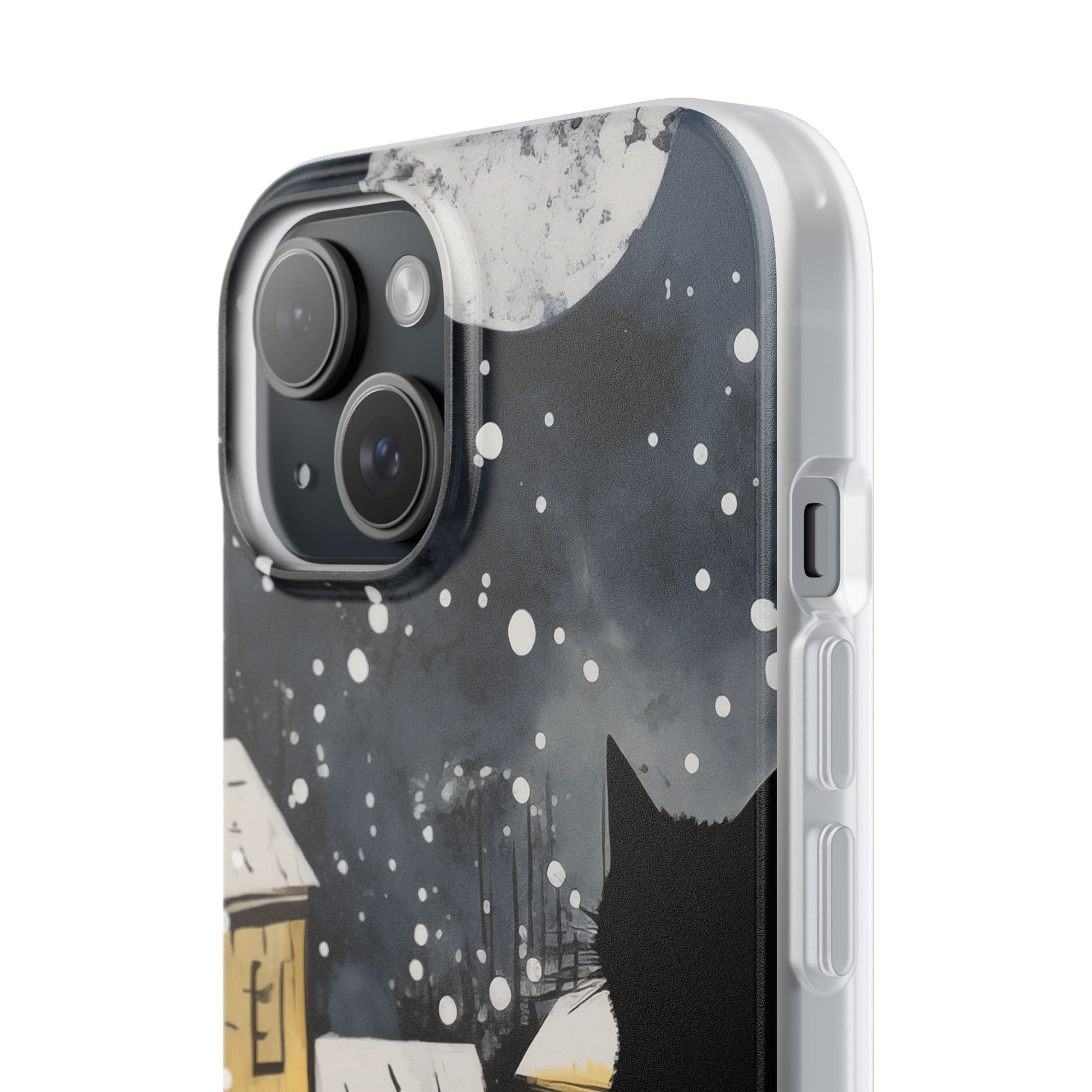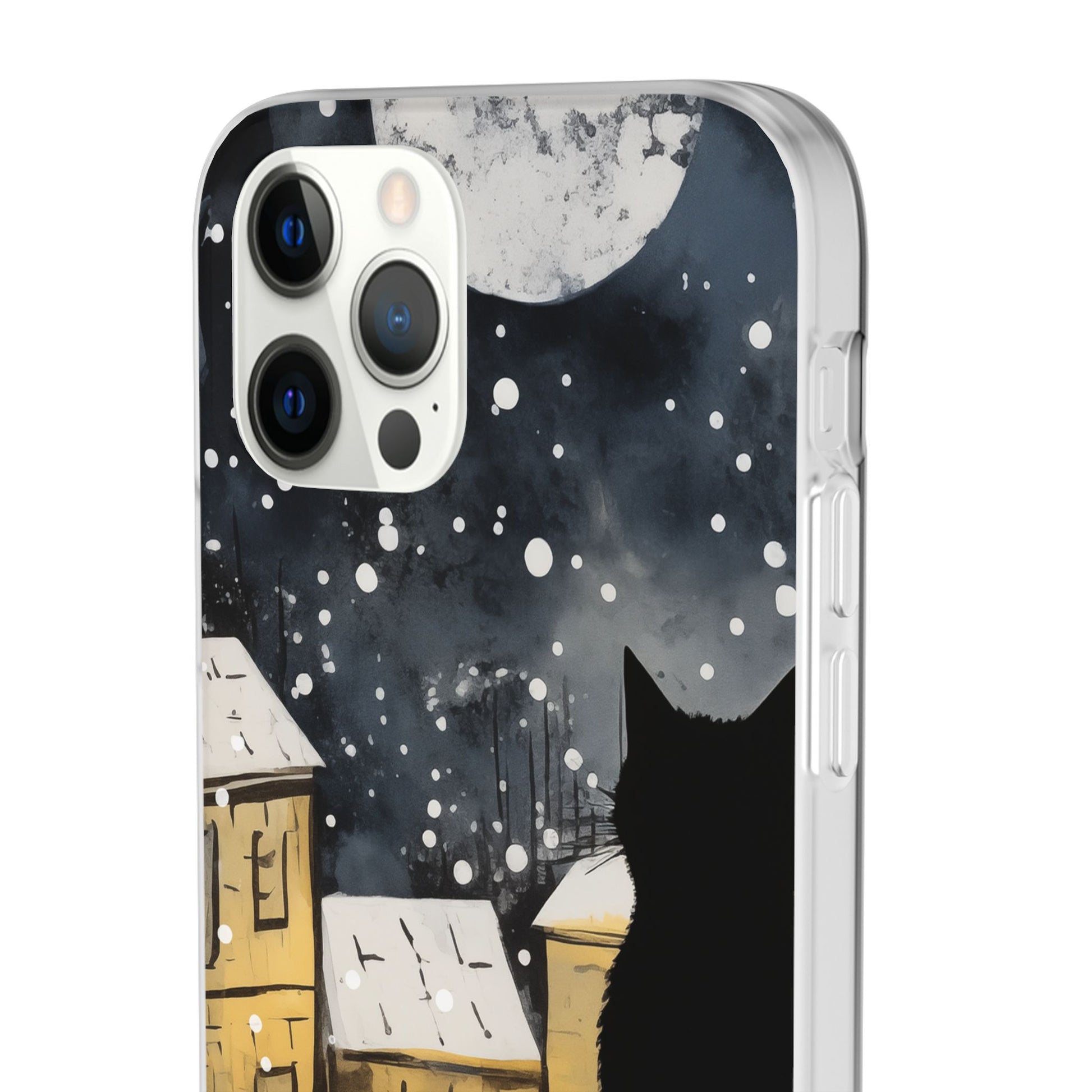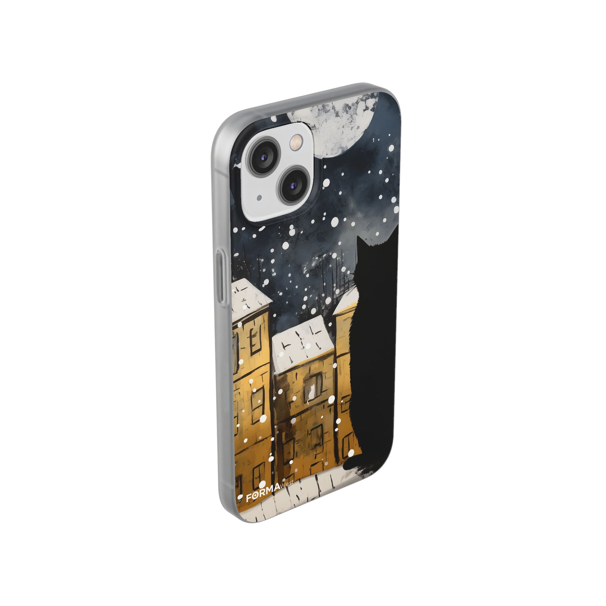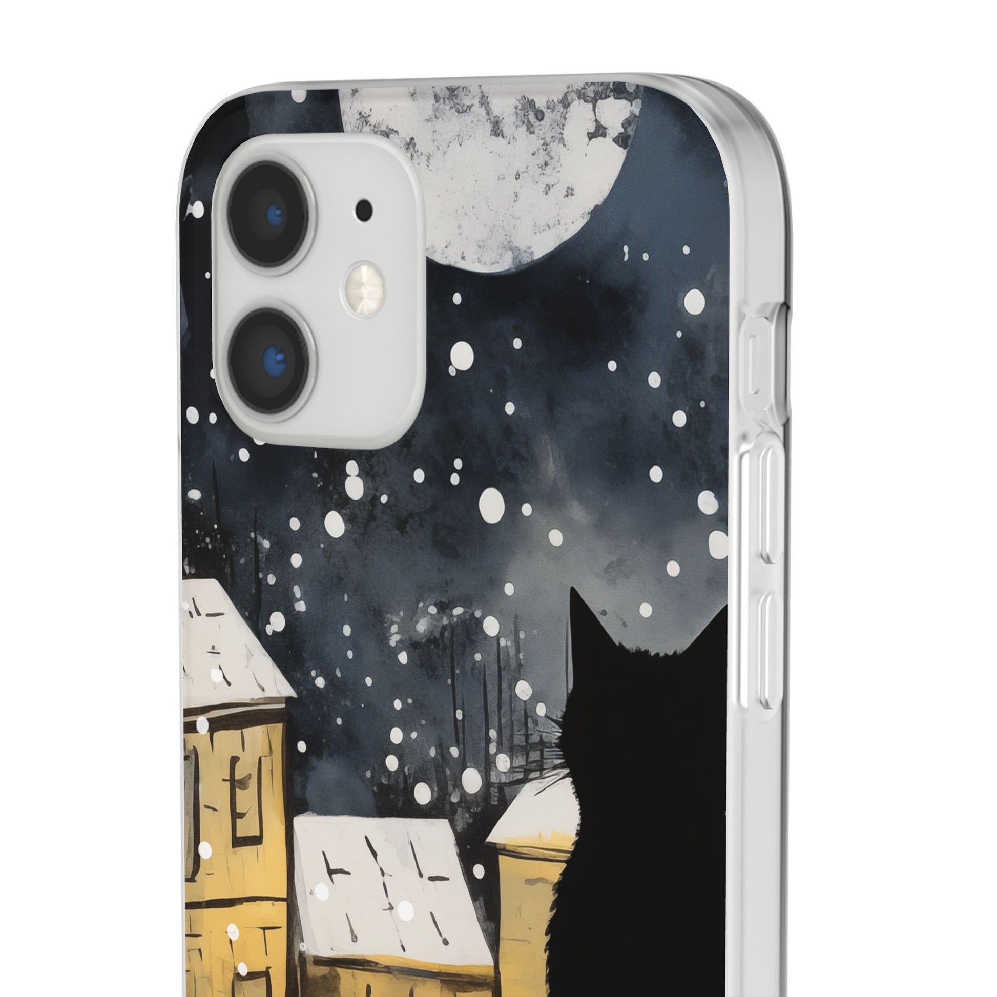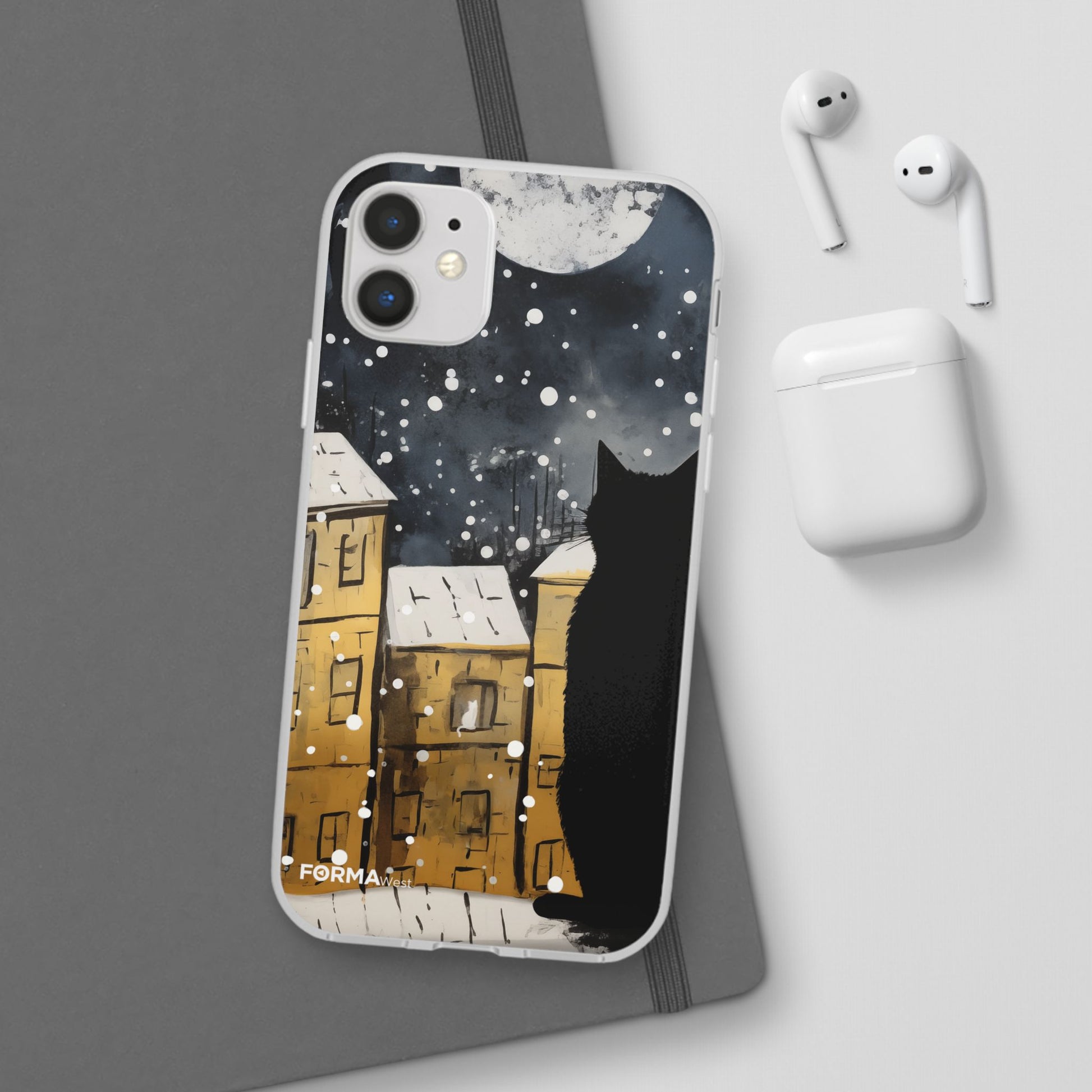 A slim, frosted-flex phone case that frames your device with quiet, wintry charm. The matte, semi-transparent TPU body shows a hand-drawn night scene — moonlit sky, soft falling snow, warm ochre rooftops — with the silhouette of a cat watching from the edge. Lightweight and flexible, it slips on easily and cushions against knocks while keeping a low profile so your phone’s lines remain elegant. The printed art stays bright thanks to advanced printing methods, giving the case the look of a little winter illustration you can carry every day.