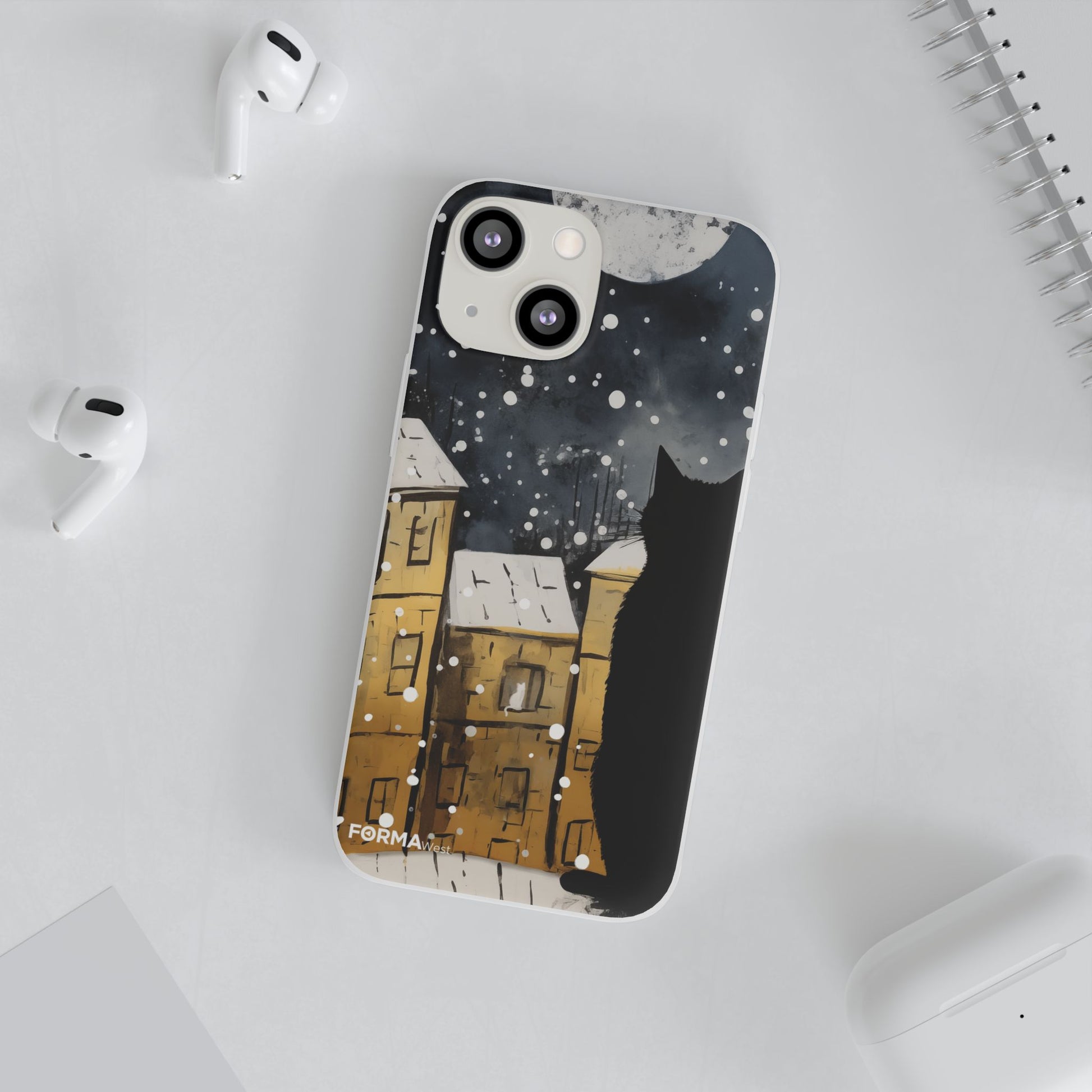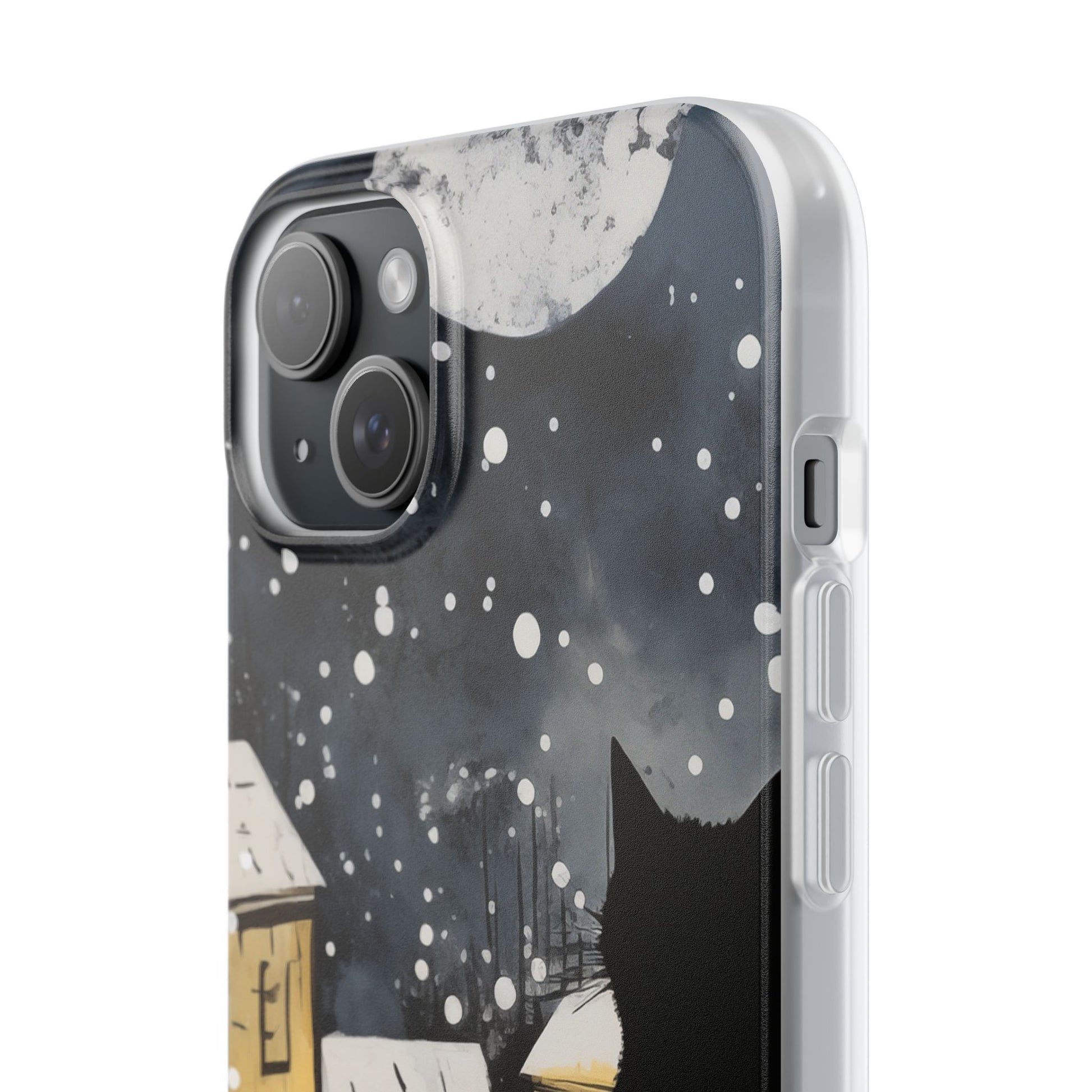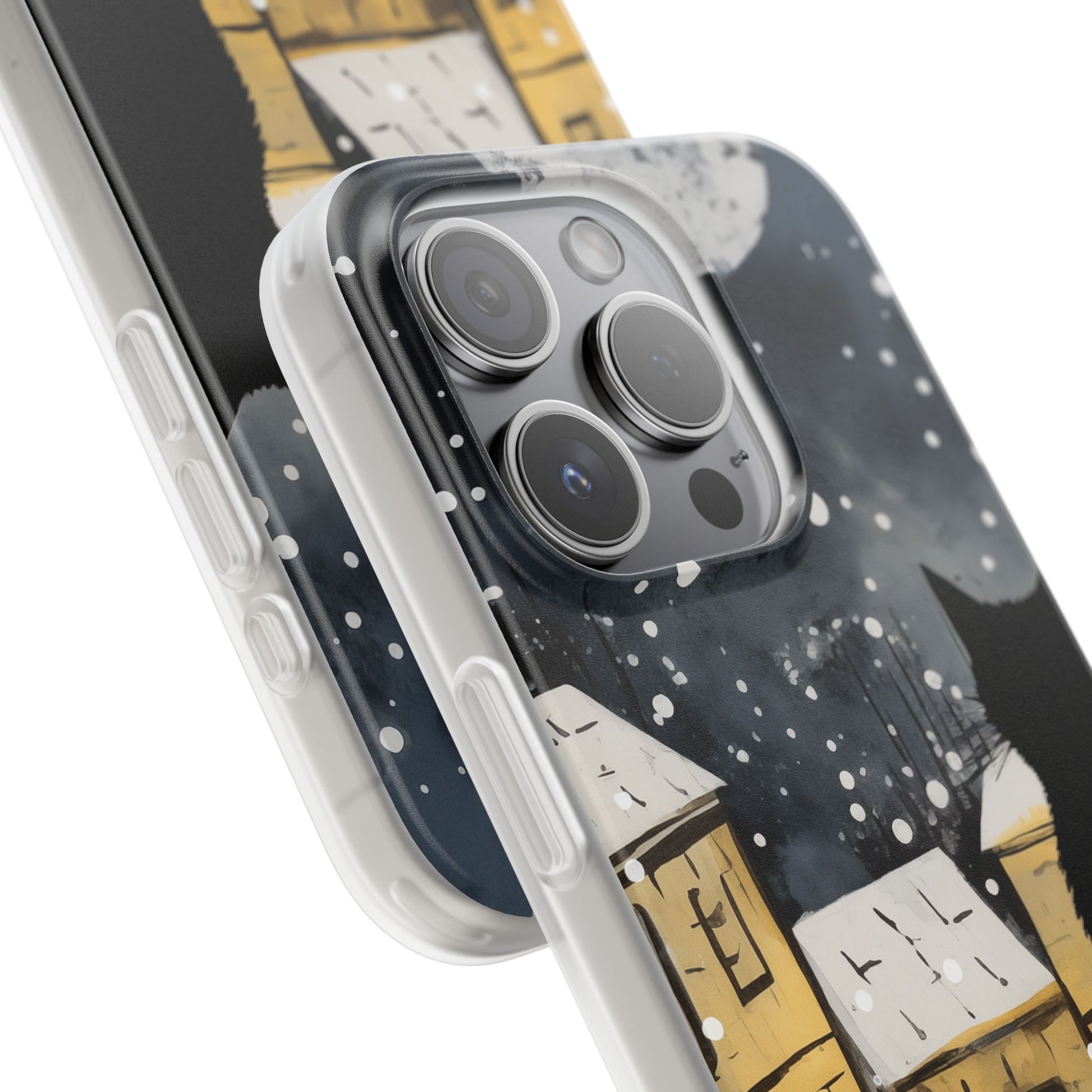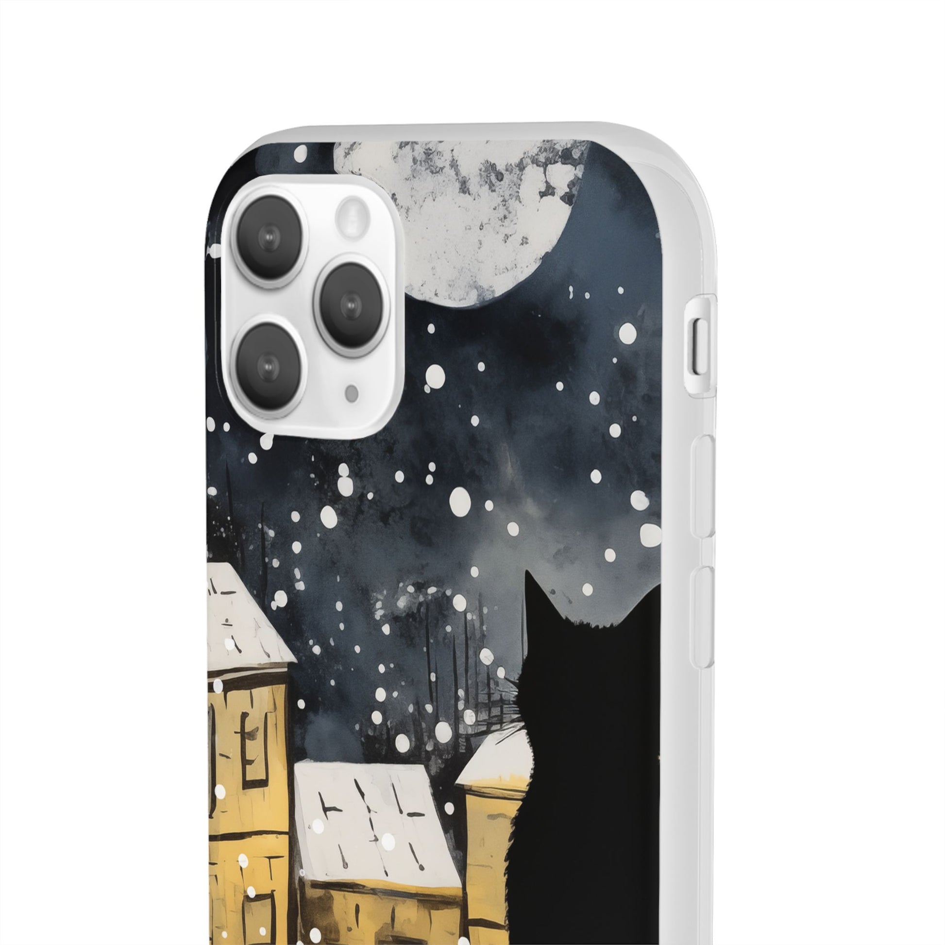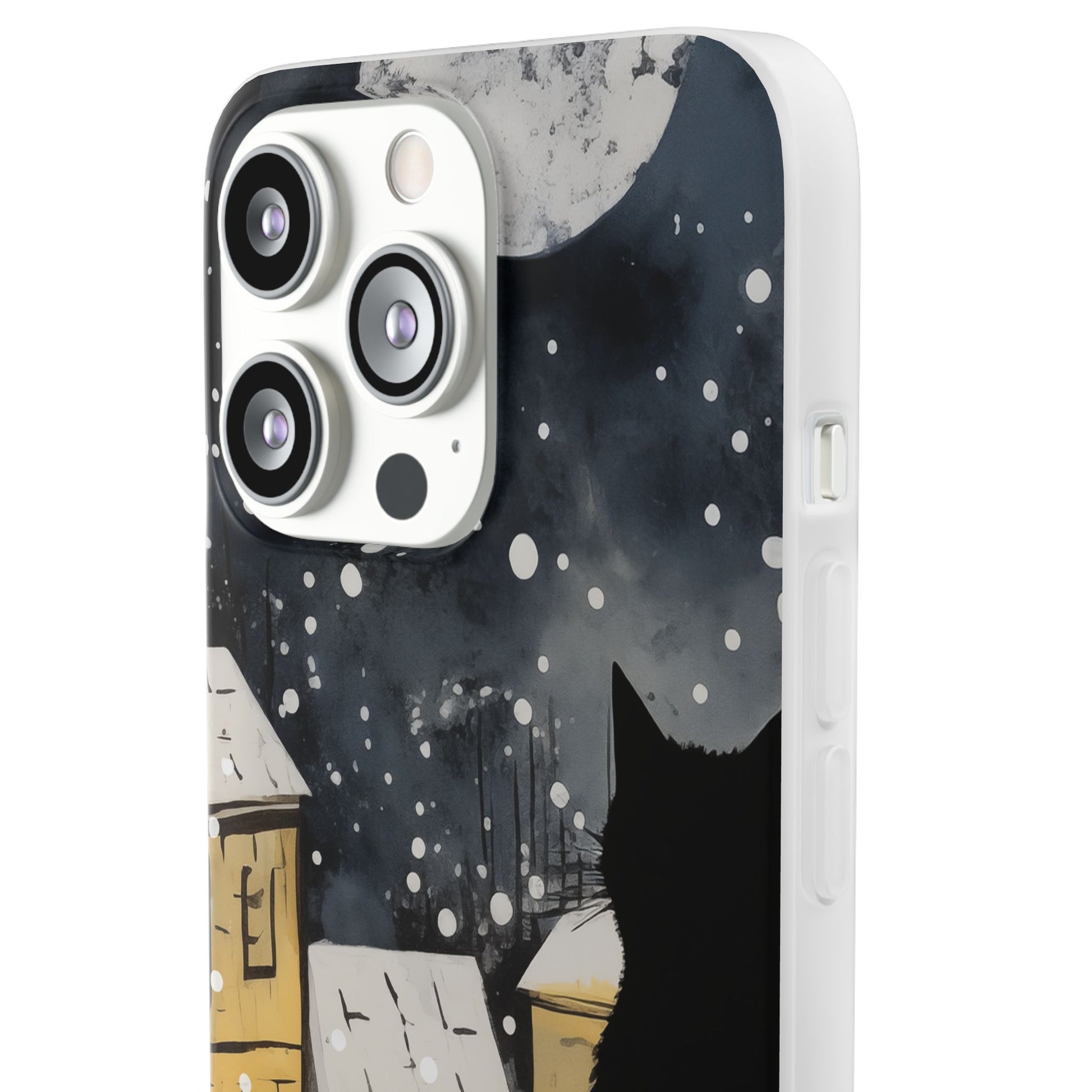 A slim, frosted-flex phone case that frames your device with quiet, wintry charm. The matte, semi-transparent TPU body shows a hand-drawn night scene — moonlit sky, soft falling snow, warm ochre rooftops — with the silhouette of a cat watching from the edge. Lightweight and flexible, it slips on easily and cushions against knocks while keeping a low profile so your phone’s lines remain elegant. The printed art stays bright thanks to advanced printing methods, giving the case the look of a little winter illustration you can carry every day.