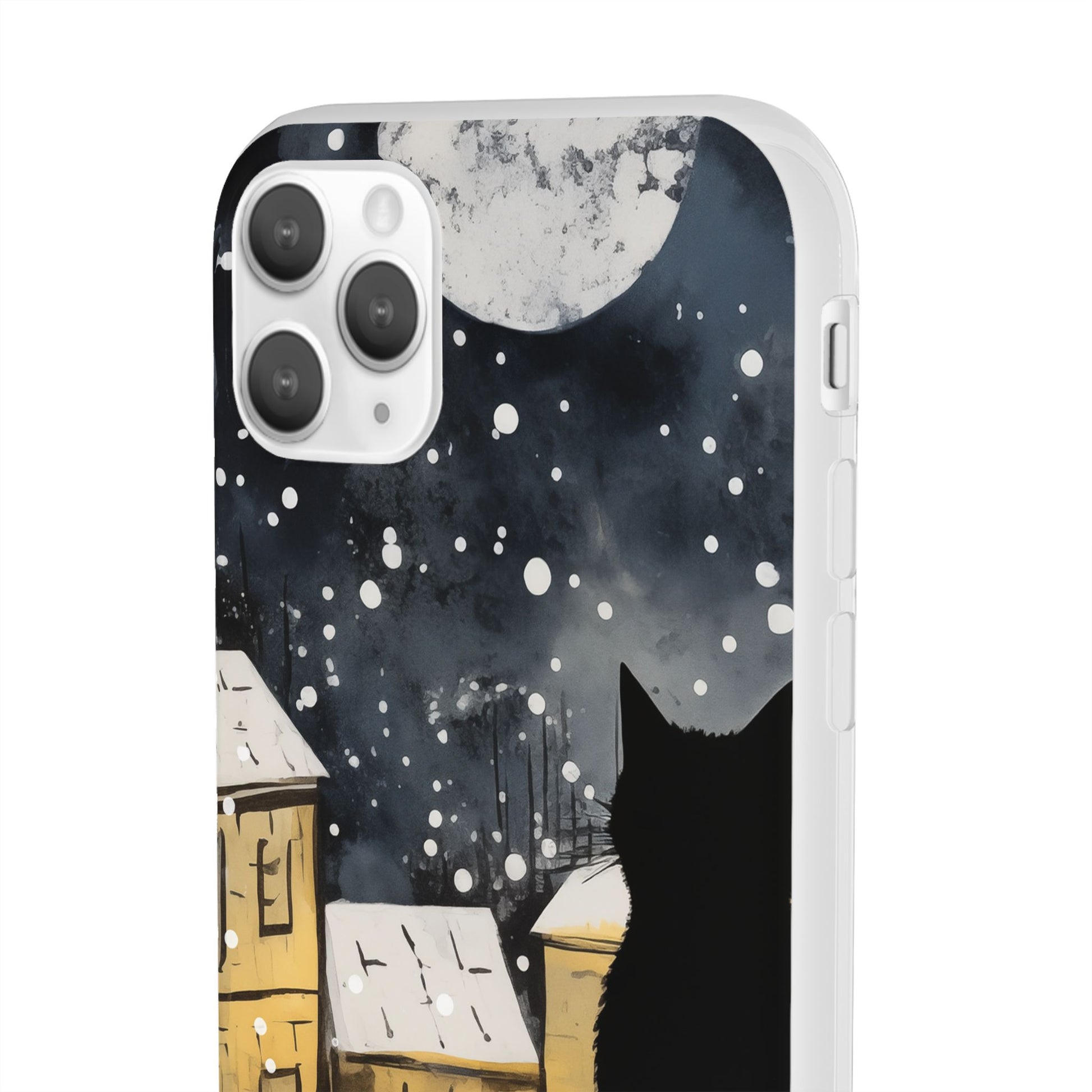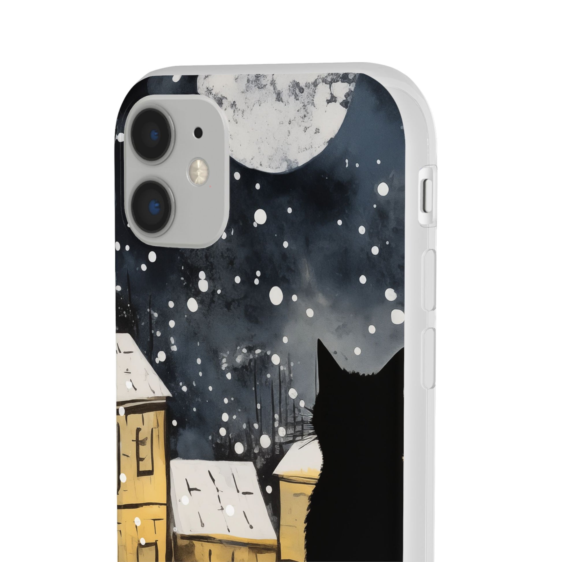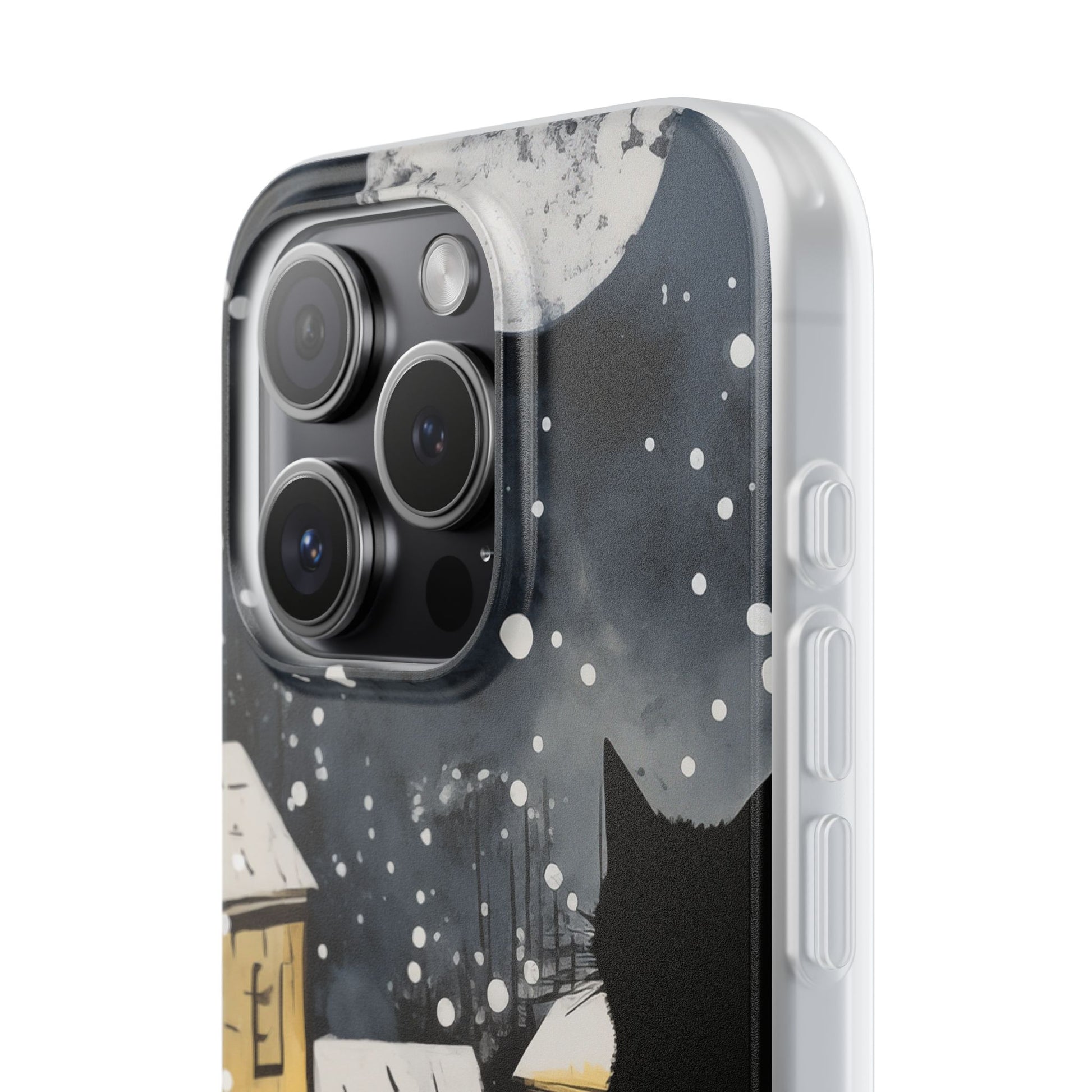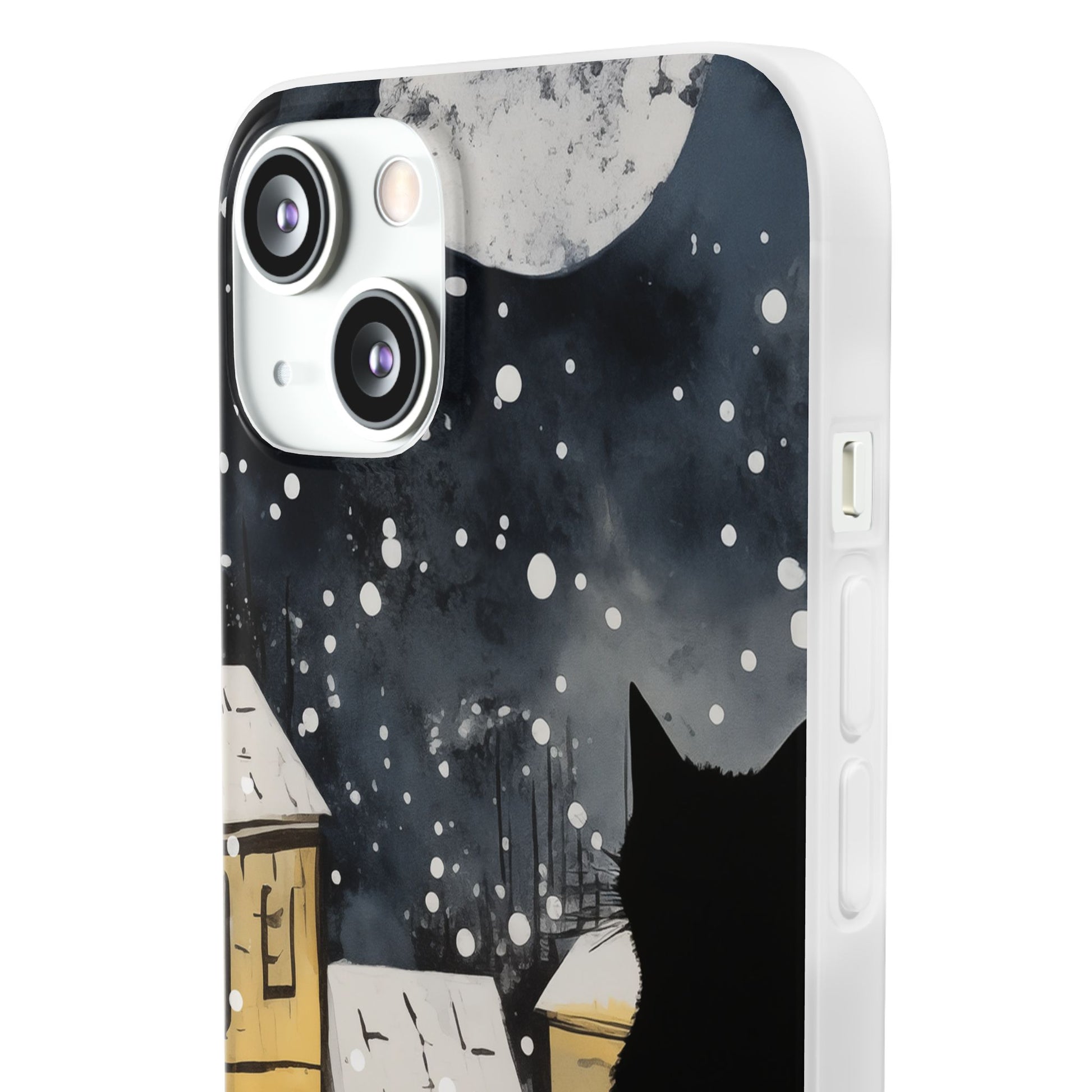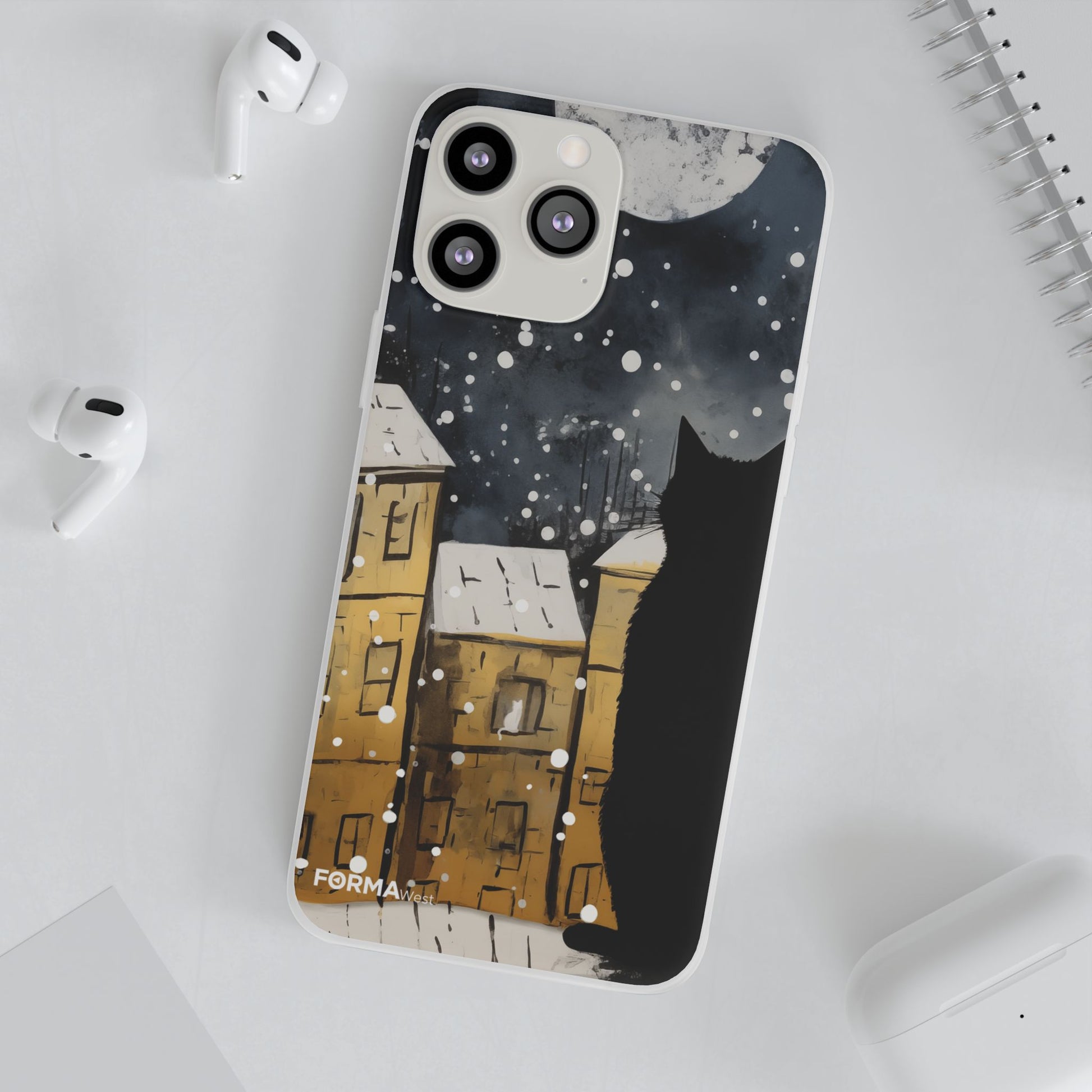 A slim, frosted-flex phone case that frames your device with quiet, wintry charm. The matte, semi-transparent TPU body shows a hand-drawn night scene — moonlit sky, soft falling snow, warm ochre rooftops — with the silhouette of a cat watching from the edge. Lightweight and flexible, it slips on easily and cushions against knocks while keeping a low profile so your phone’s lines remain elegant. The printed art stays bright thanks to advanced printing methods, giving the case the look of a little winter illustration you can carry every day.