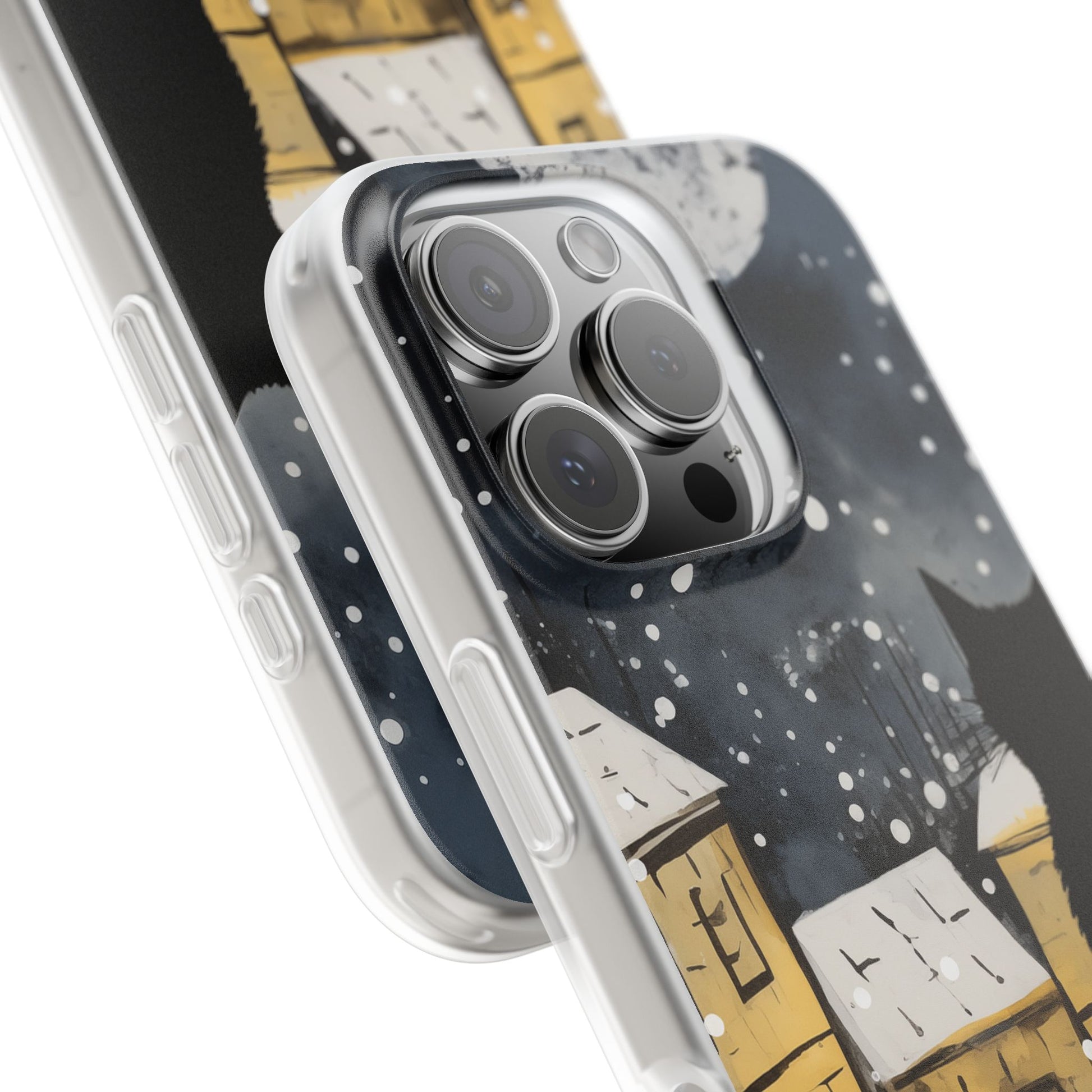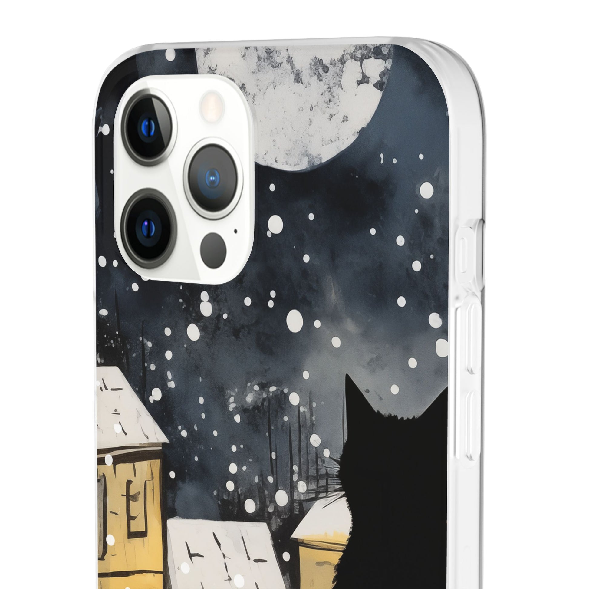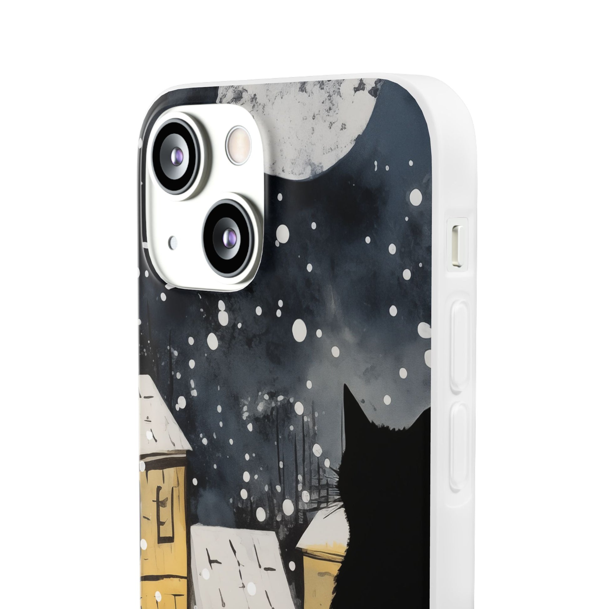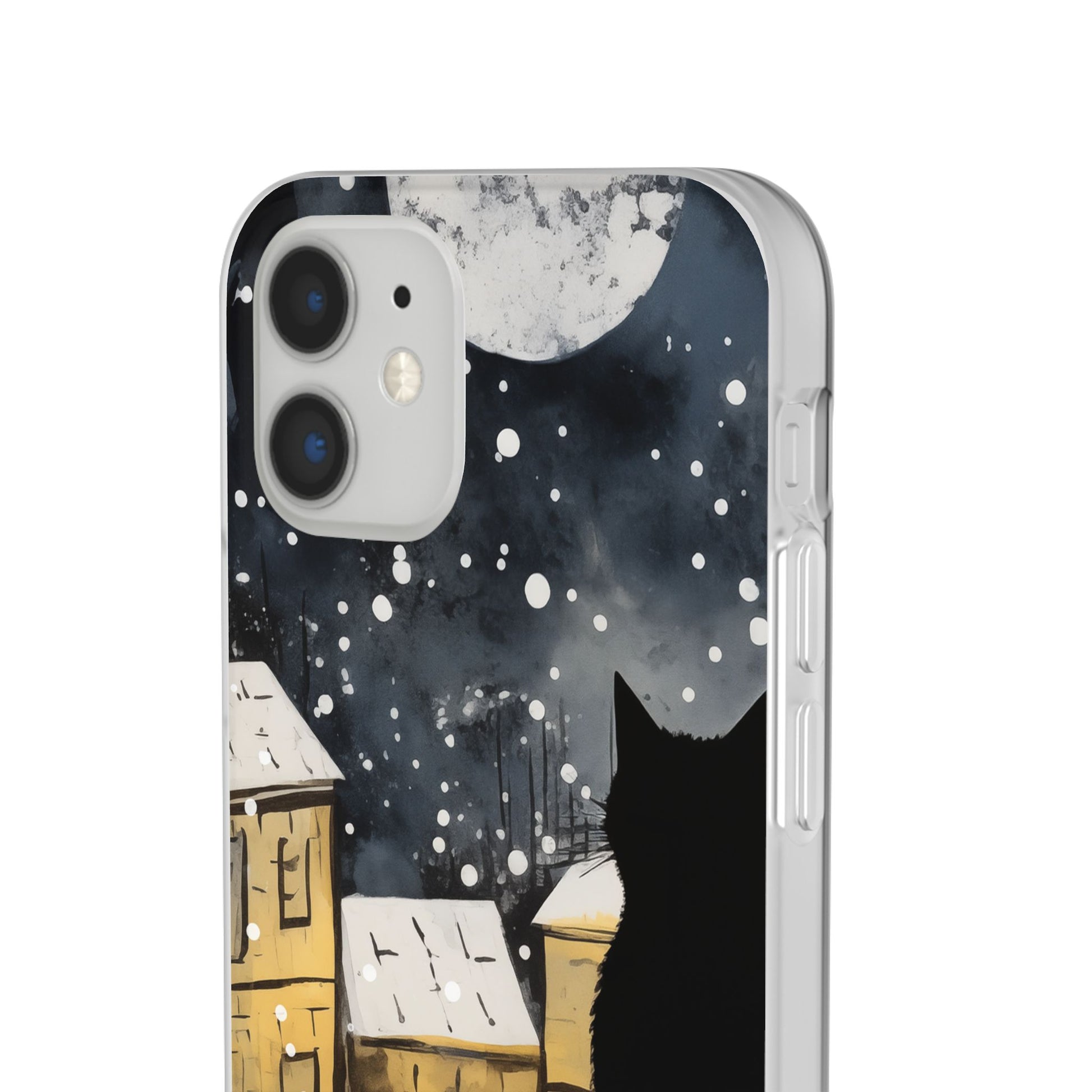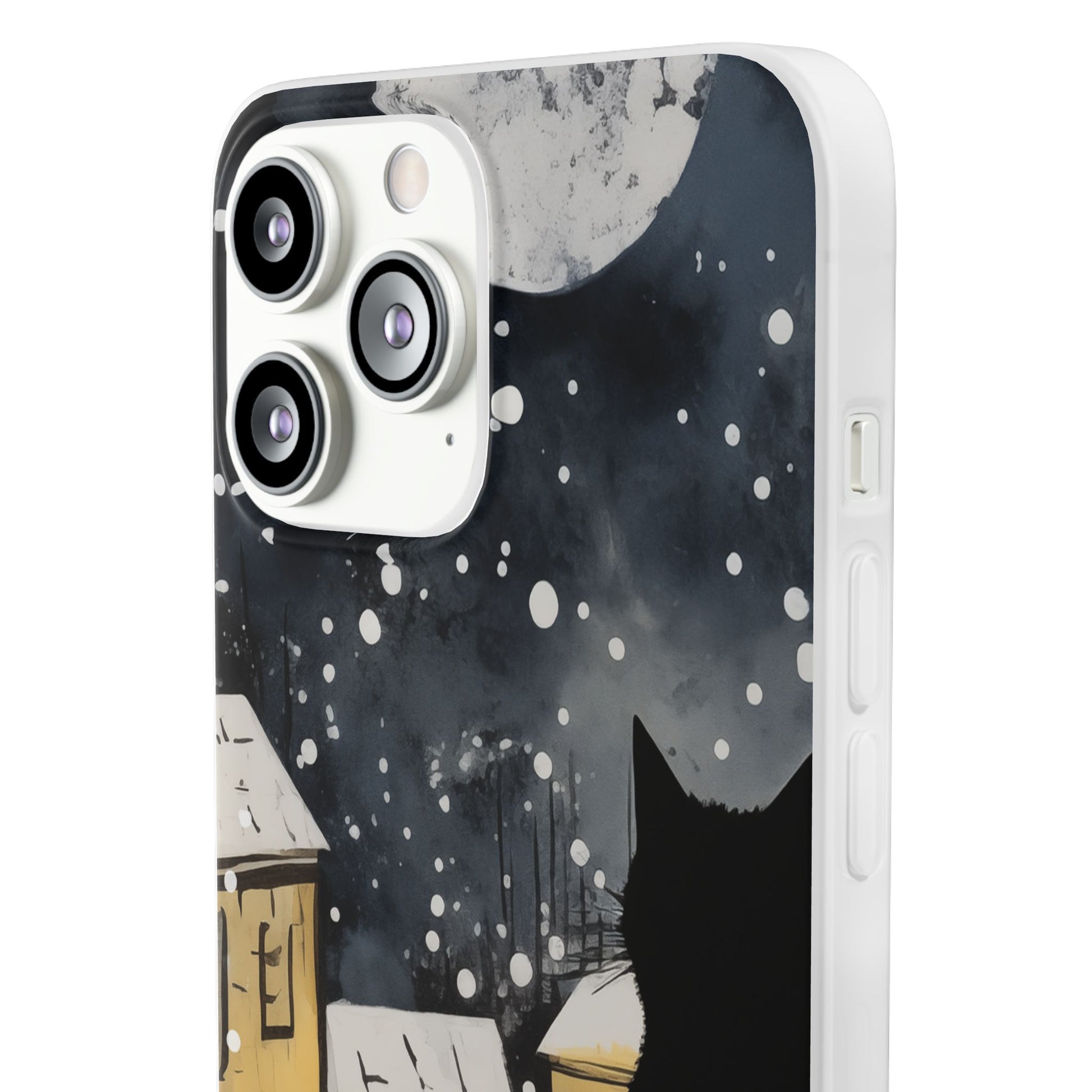 A slim, frosted-flex phone case that frames your device with quiet, wintry charm. The matte, semi-transparent TPU body shows a hand-drawn night scene — moonlit sky, soft falling snow, warm ochre rooftops — with the silhouette of a cat watching from the edge. Lightweight and flexible, it slips on easily and cushions against knocks while keeping a low profile so your phone’s lines remain elegant. The printed art stays bright thanks to advanced printing methods, giving the case the look of a little winter illustration you can carry every day.