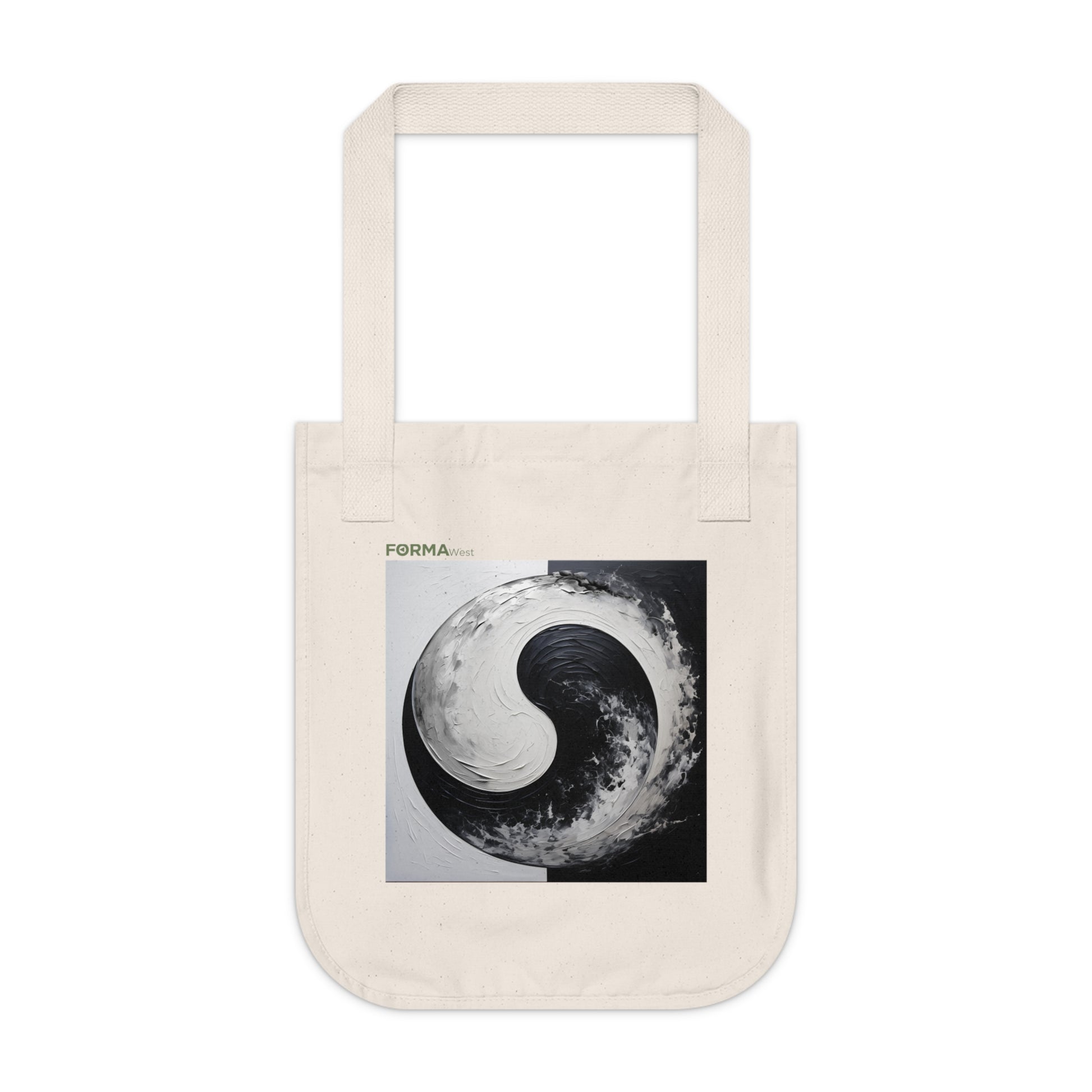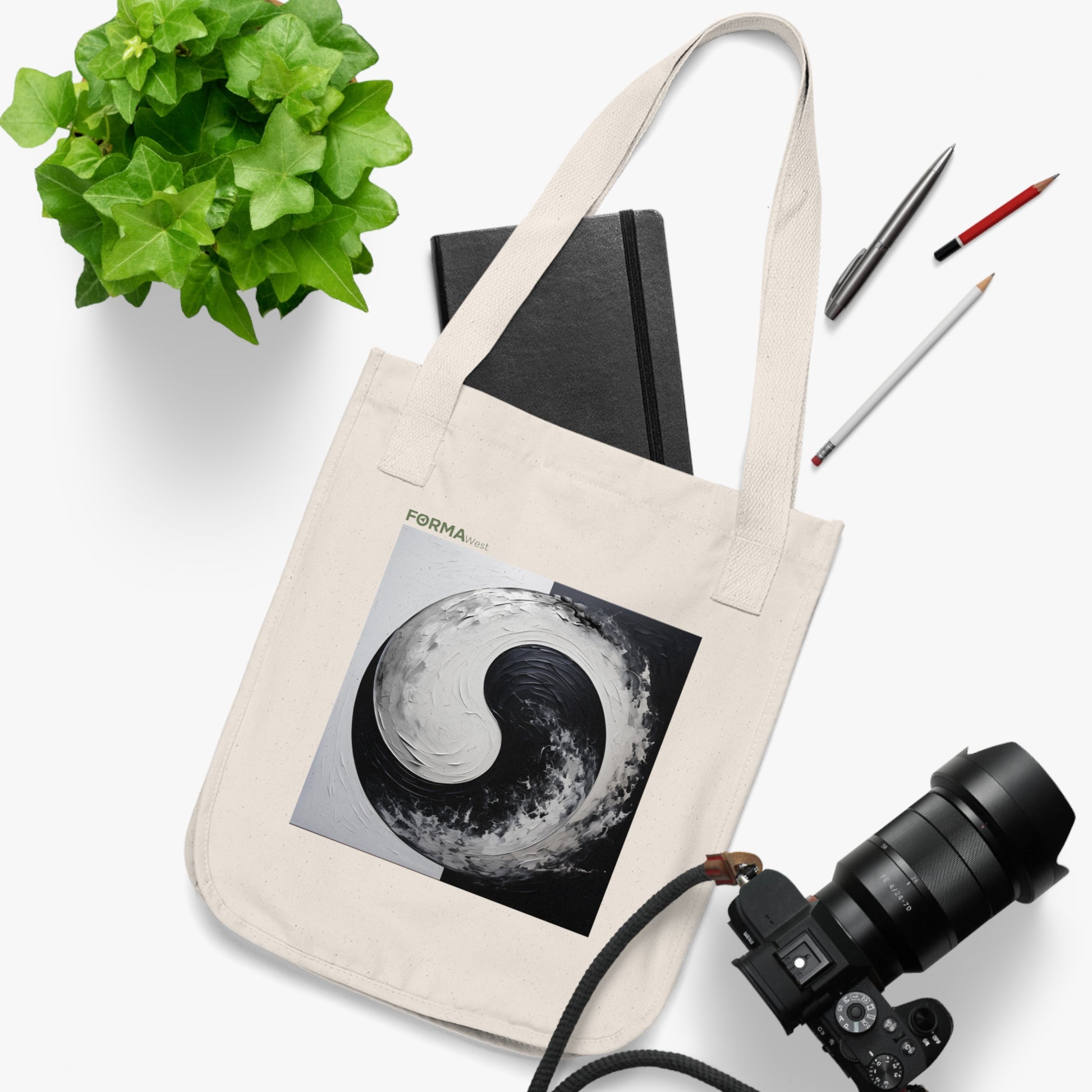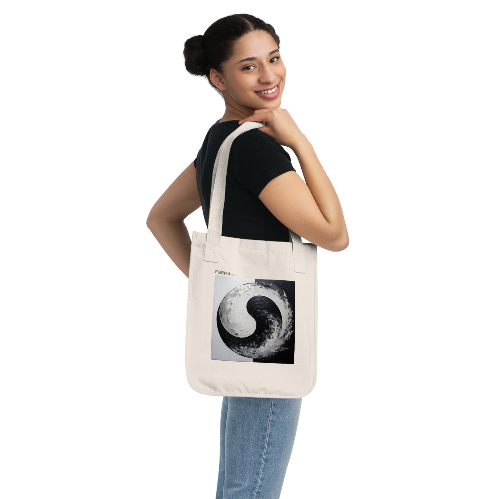 This organic canvas tote carries more than groceries — it carries a quiet, modern calm. The monochrome swirl print sits like a small study in contrast, a yin-yang of motion and stillness that reads as both art object and everyday utility. Roomy enough for notebooks, a sweater, or a farmer’s-market haul, the natural cotton shows subtle flecks that give each bag an honest, handcrafted look. The reinforced web handles stay comfortable whether you’re walking across campus or threading through a busy market. Wear it with your favorite denim jacket or sling it over a shoulder on slow Sunday mornings; it feels like a thoughtful, built-for-life companion that ages with you.