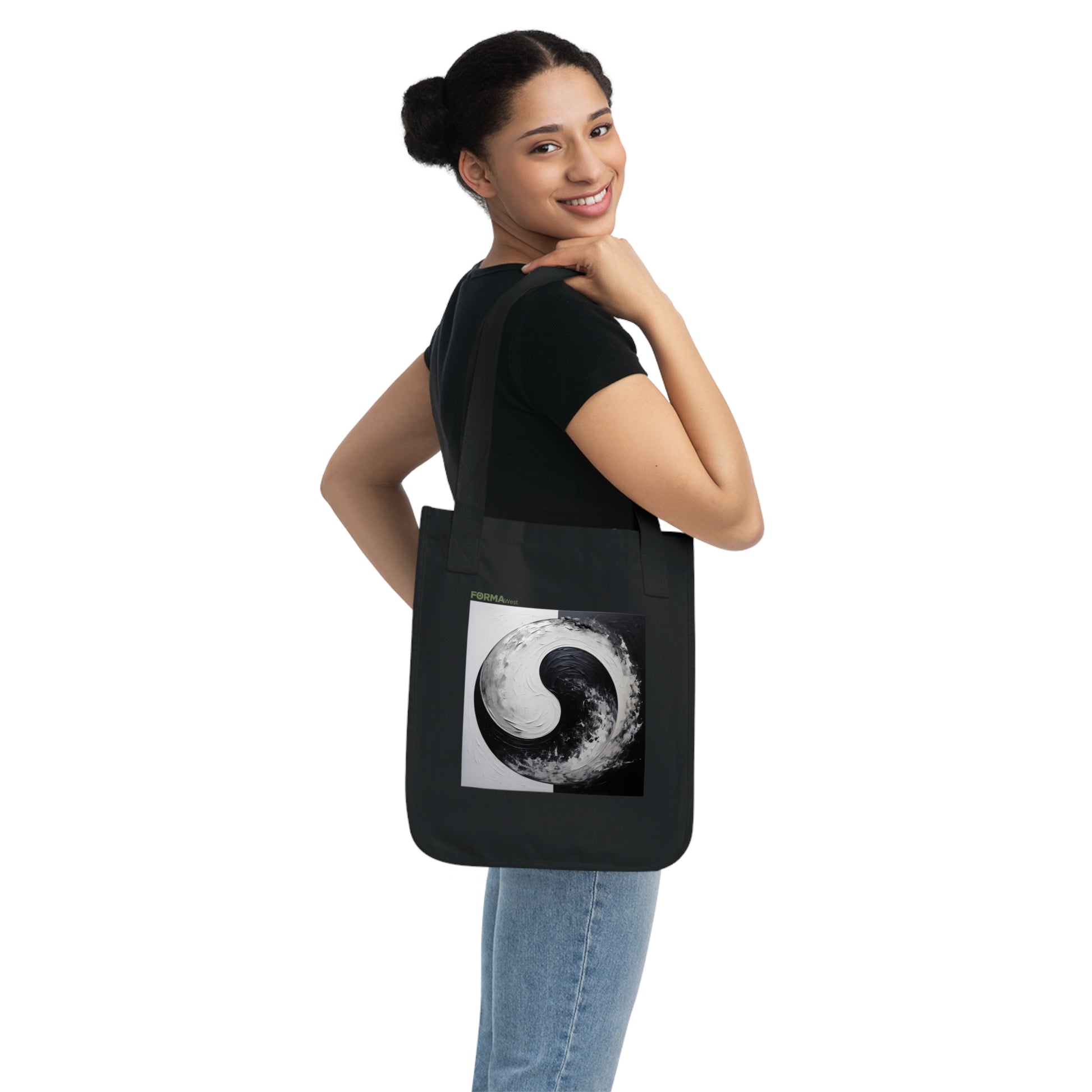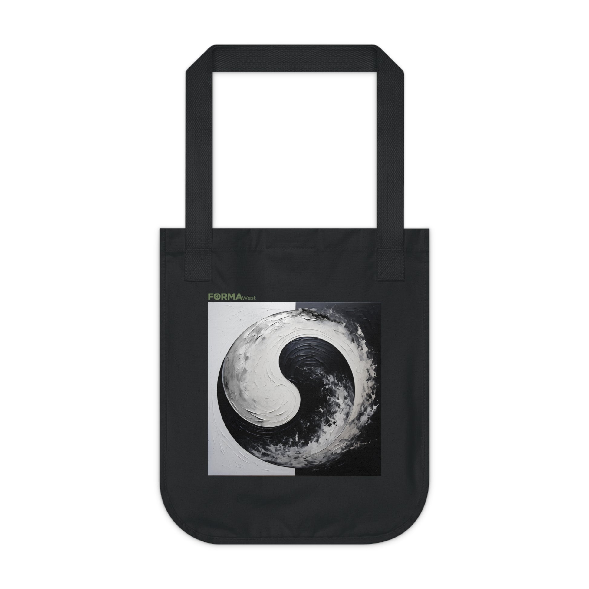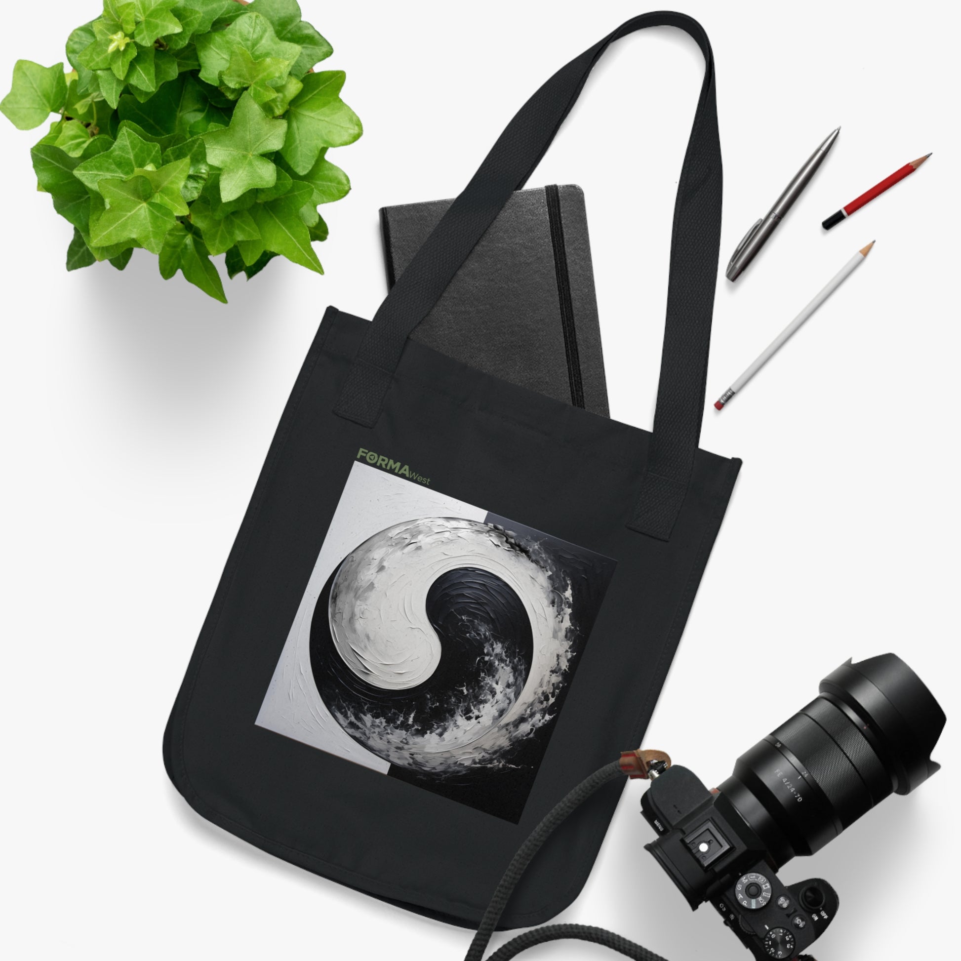 This organic canvas tote carries more than groceries — it carries a quiet, modern calm. The monochrome swirl print sits like a small study in contrast, a yin-yang of motion and stillness that reads as both art object and everyday utility. Roomy enough for notebooks, a sweater, or a farmer’s-market haul, the natural cotton shows subtle flecks that give each bag an honest, handcrafted look. The reinforced web handles stay comfortable whether you’re walking across campus or threading through a busy market. Wear it with your favorite denim jacket or sling it over a shoulder on slow Sunday mornings; it feels like a thoughtful, built-for-life companion that ages with you.