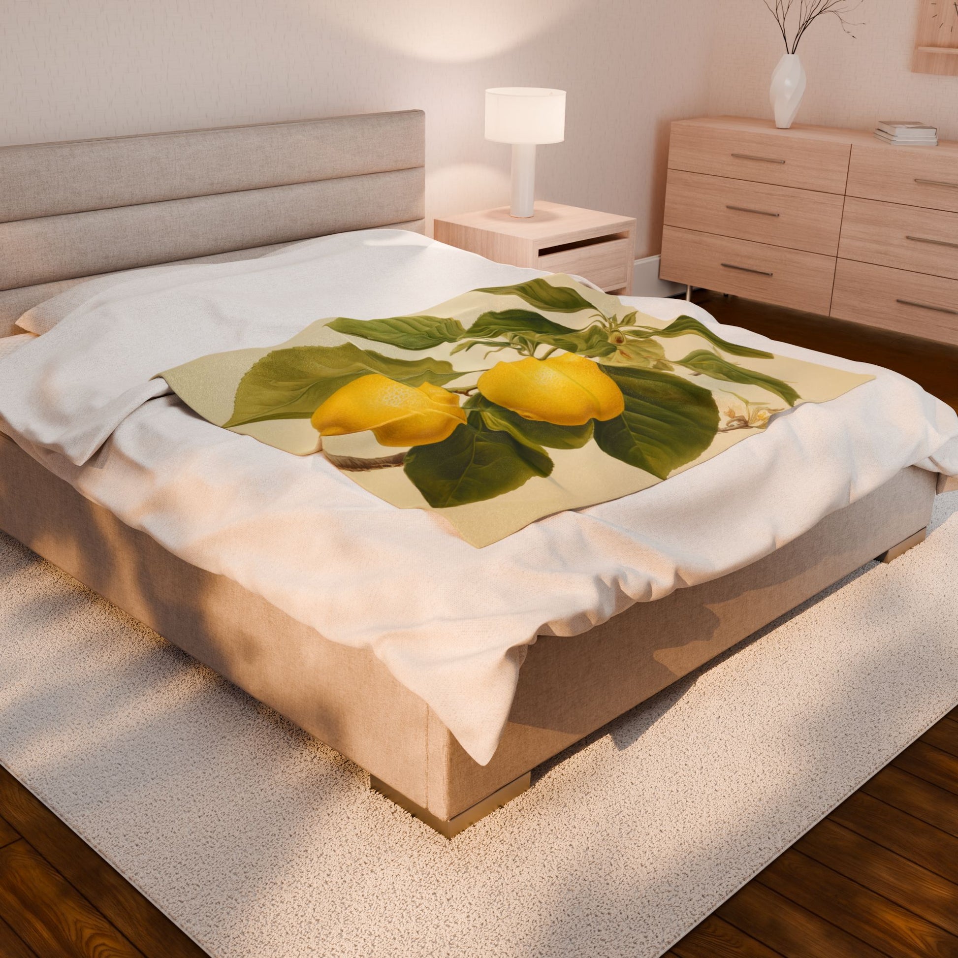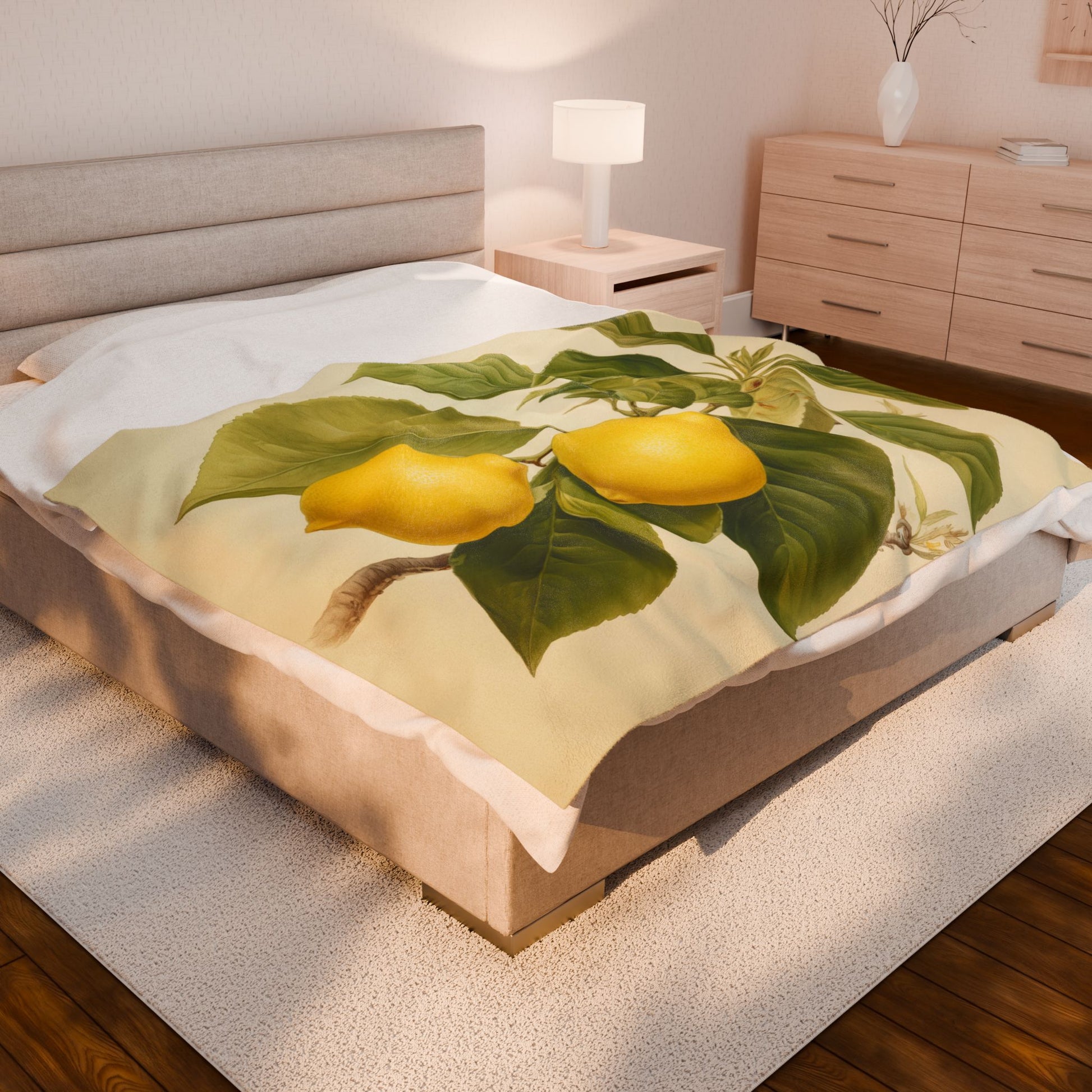 Wrap yourself in the soft hush of a summer orchard. This plush blanket features a botanical lemon illustration printed in vivid detail on a velveteen surface — bright, sunlit fruit and deep green leaves against a warm, creamy background. It’s the kind of throw you reach for to curl up with a book on the sofa, to add a fresh, artisanal touch to a reading nook, or to lay across a window seat where morning light collects. Lightweight yet cozy, it keeps you comfortably warm without feeling heavy. The durable double-stitched edges hold up to everyday use while the high-definition print keeps the colors lively wash after wash. For anyone who loves botanical art, cottage-style décor, or simply a splash of citrus brightness in their home, this blanket feels like a small, thoughtful luxury.