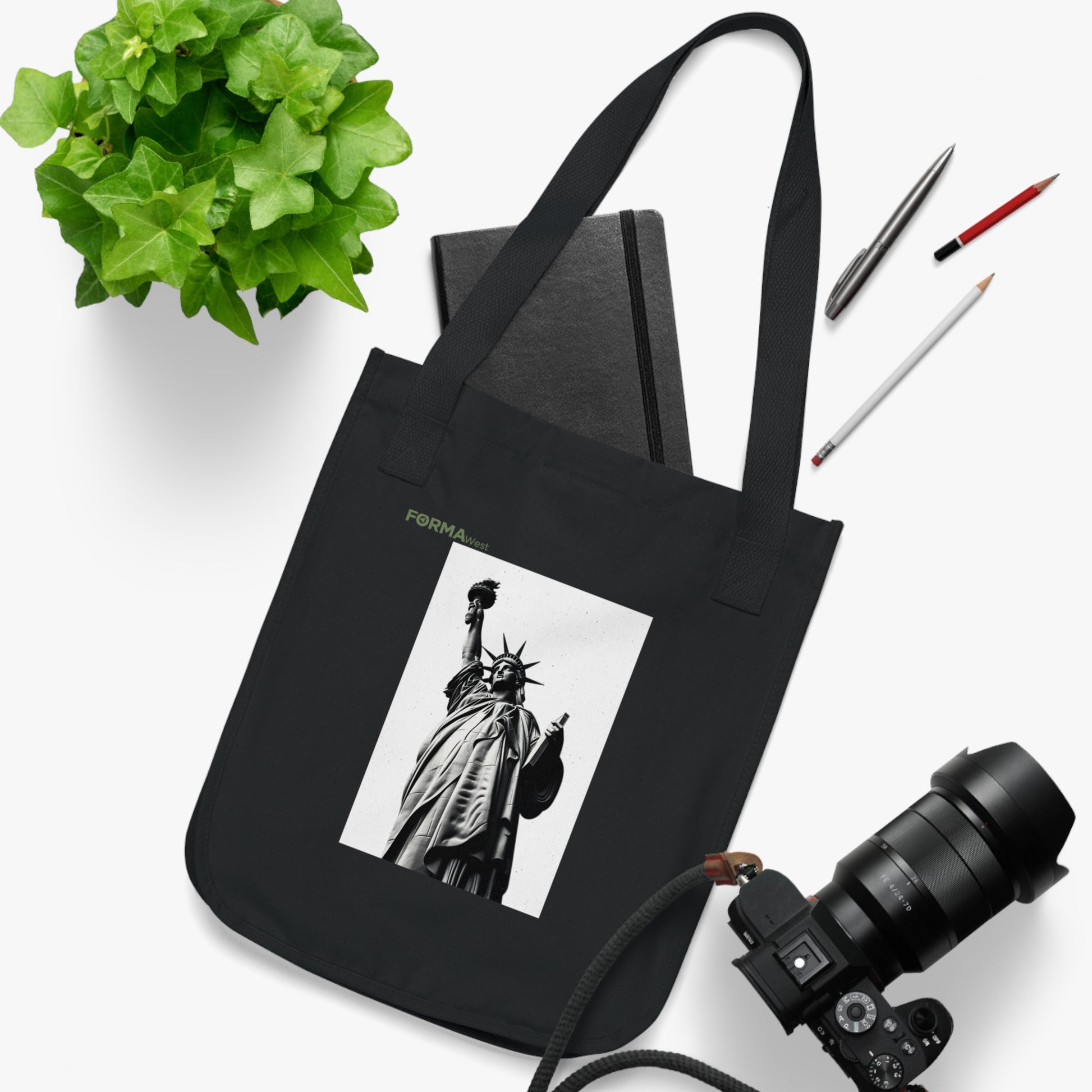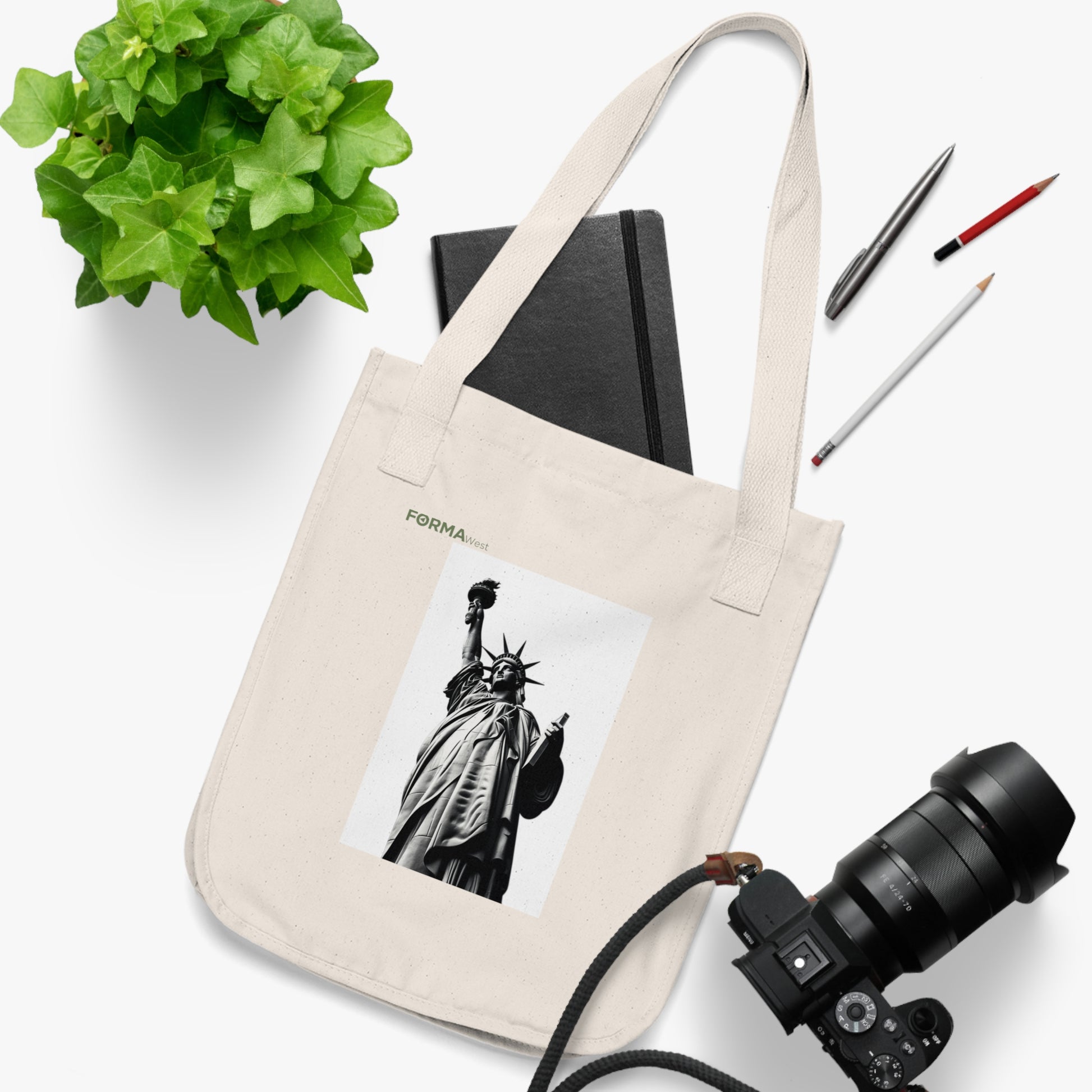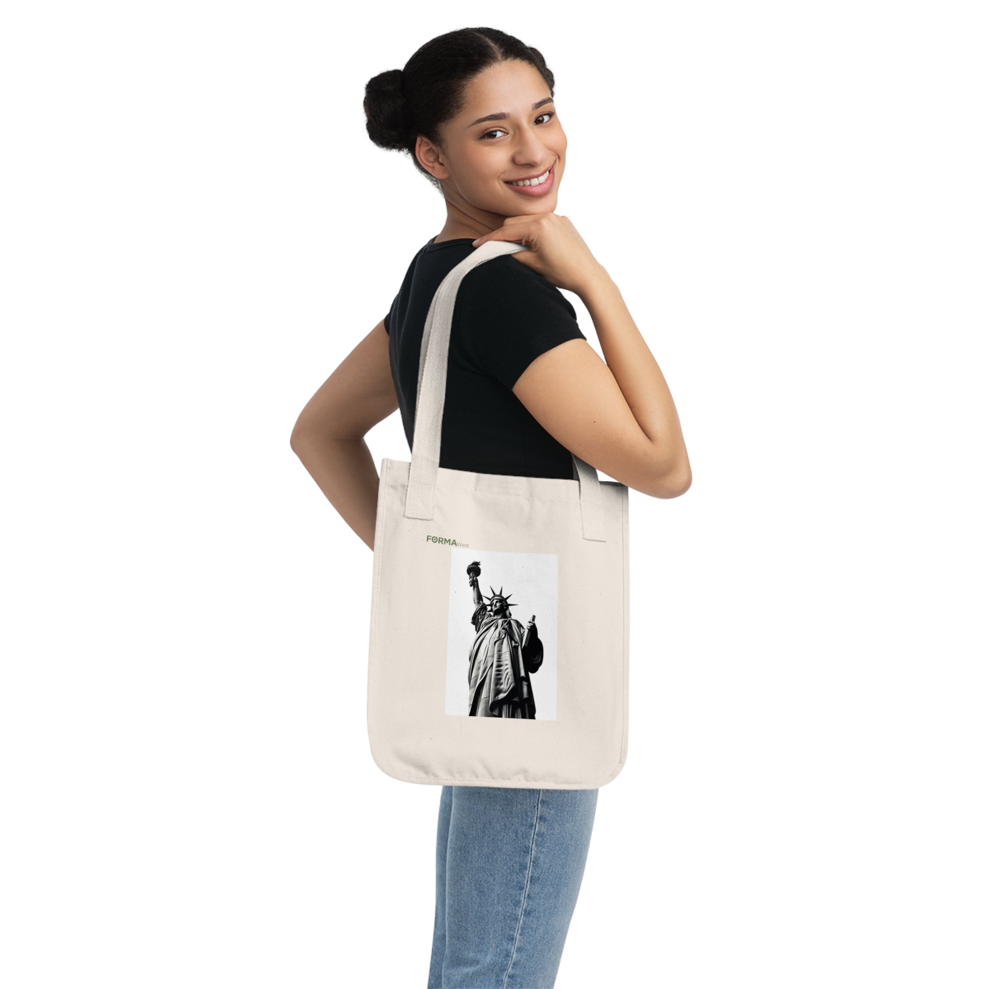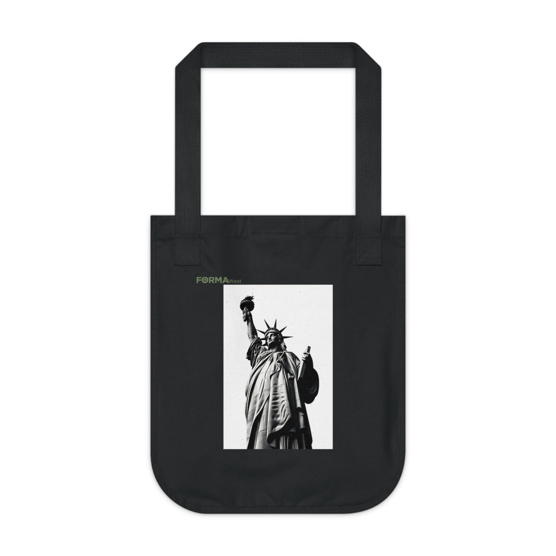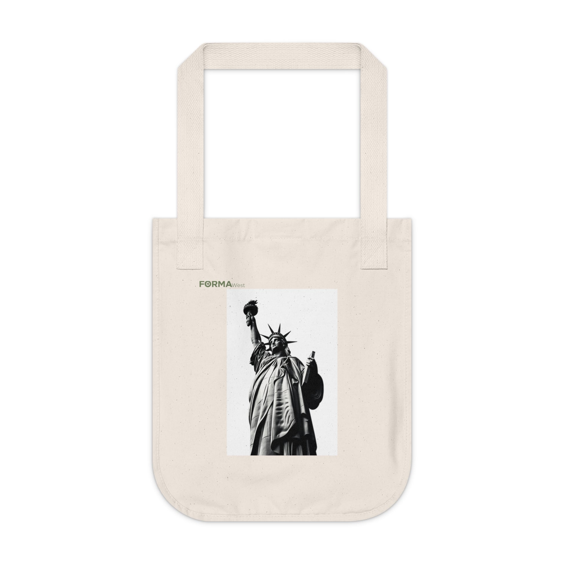 A sturdy organic canvas tote that carries city grit with a clean, minimalist edge. The natural, slightly flecked cotton shows a bold black-and-white Statue of Liberty print—an urban silhouette that speaks to commuters, students, and activists who move through the city with purpose. The medium-heavy fabric and reinforced cotton-web handles stand up to daily use, while the spacious single compartment holds books, groceries, and essentials without fuss. Tear-away label and an Econscious tag on the handle base keep the interior smooth and the message sustainable.