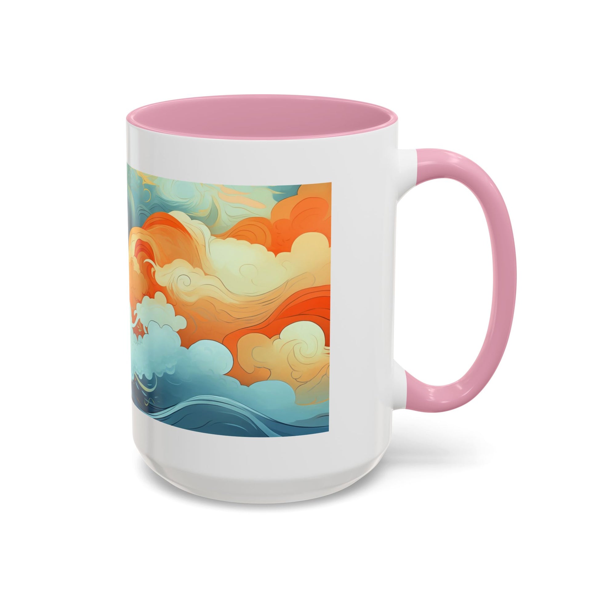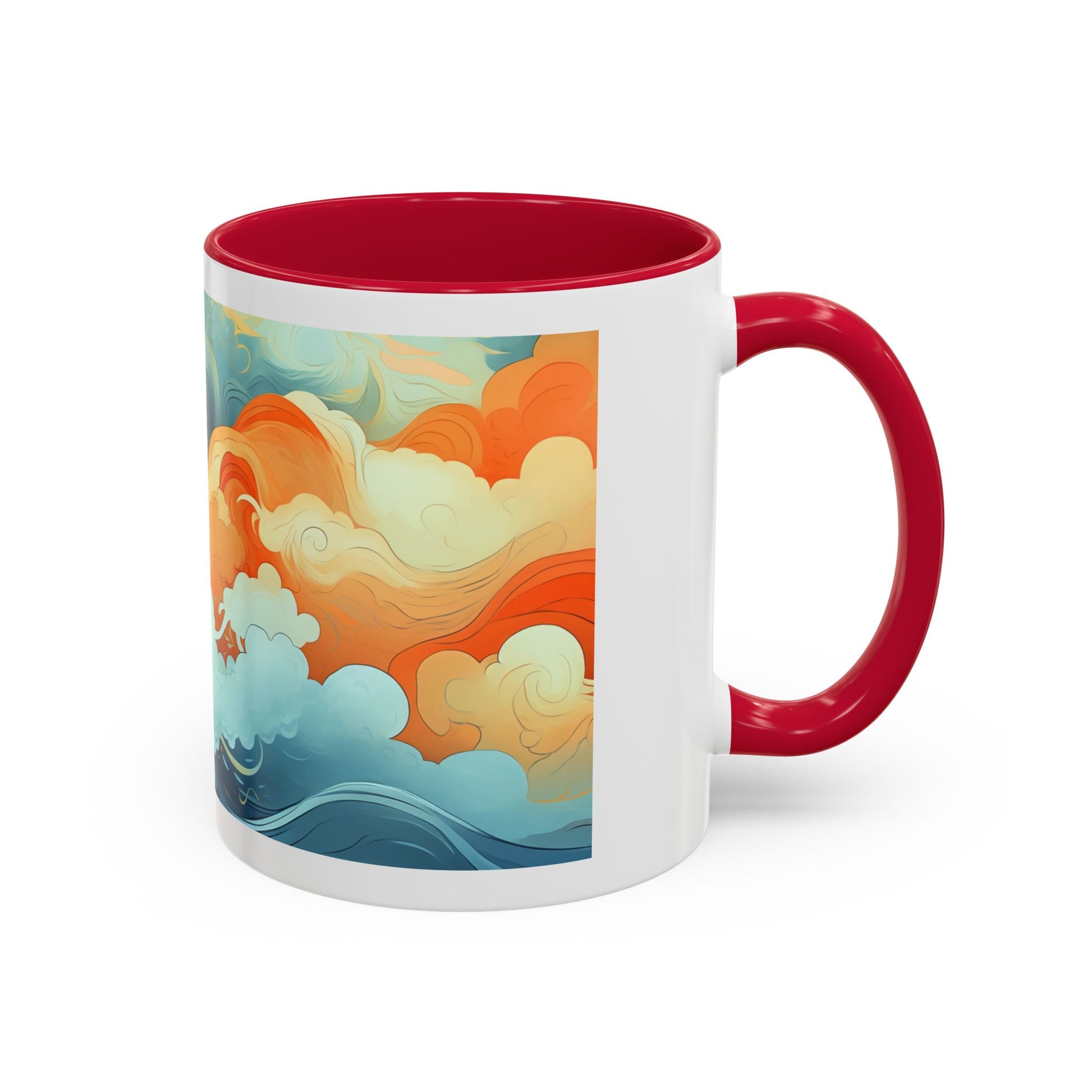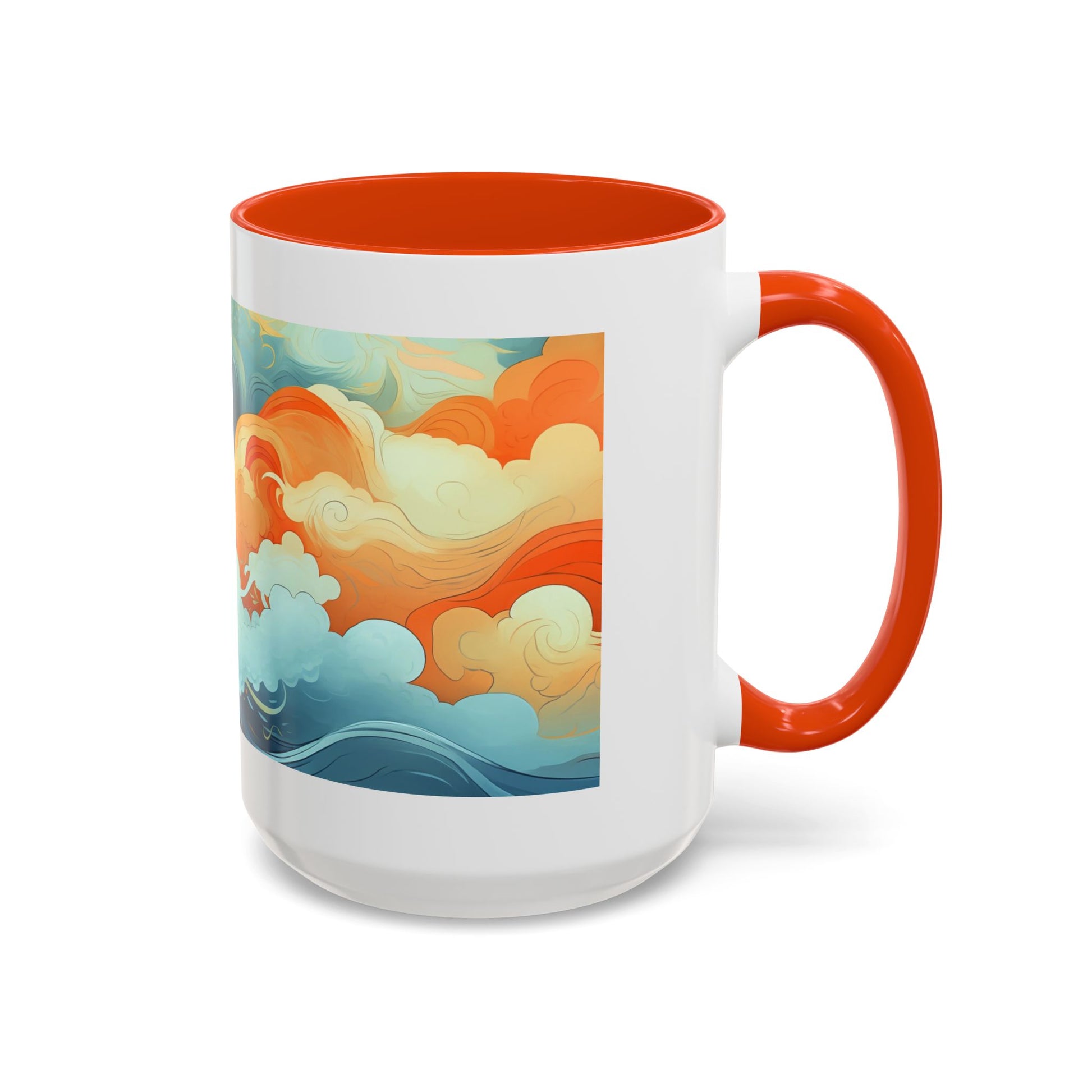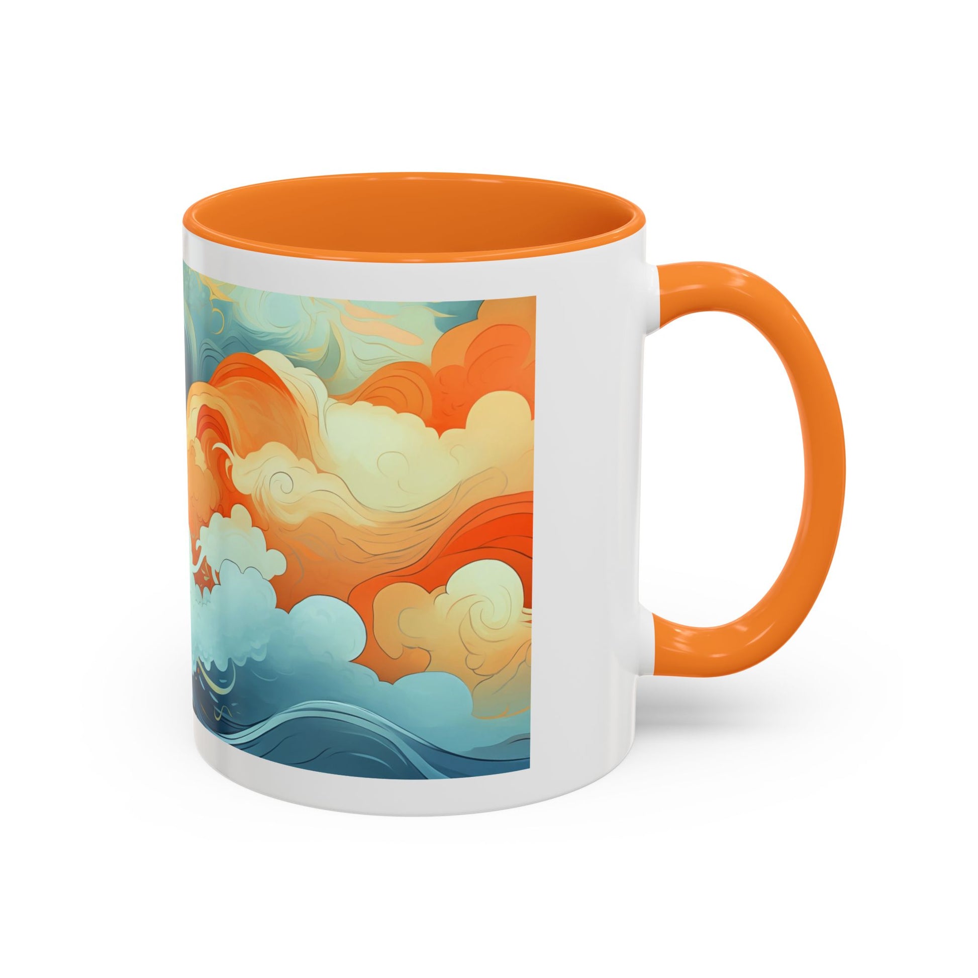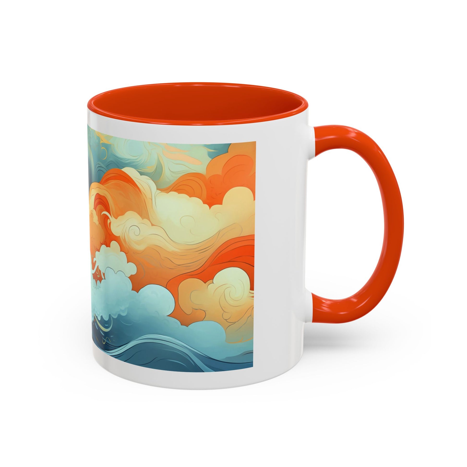 Sip color and calm in equal measure. This glossy ceramic mug wraps a sweeping, painterly seascape around its curve — warm coral clouds rolling into teal waves with layered brush-like strokes. The interior and C-handle come in a contrasting accent color, so each morning feels curated and a little brighter. It’s sturdy enough for daily use, safe in the microwave and dishwasher, and the ORCA coating keeps the artwork vivid through many washes. Use it at your desk, on the porch, or as a cozy companion during slow afternoons with a book.
