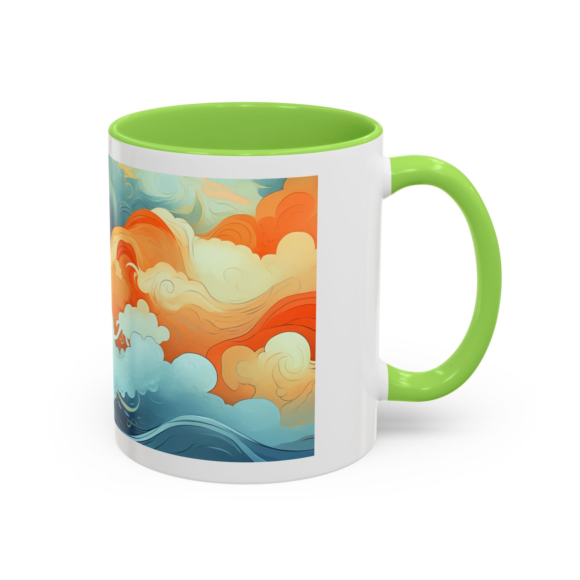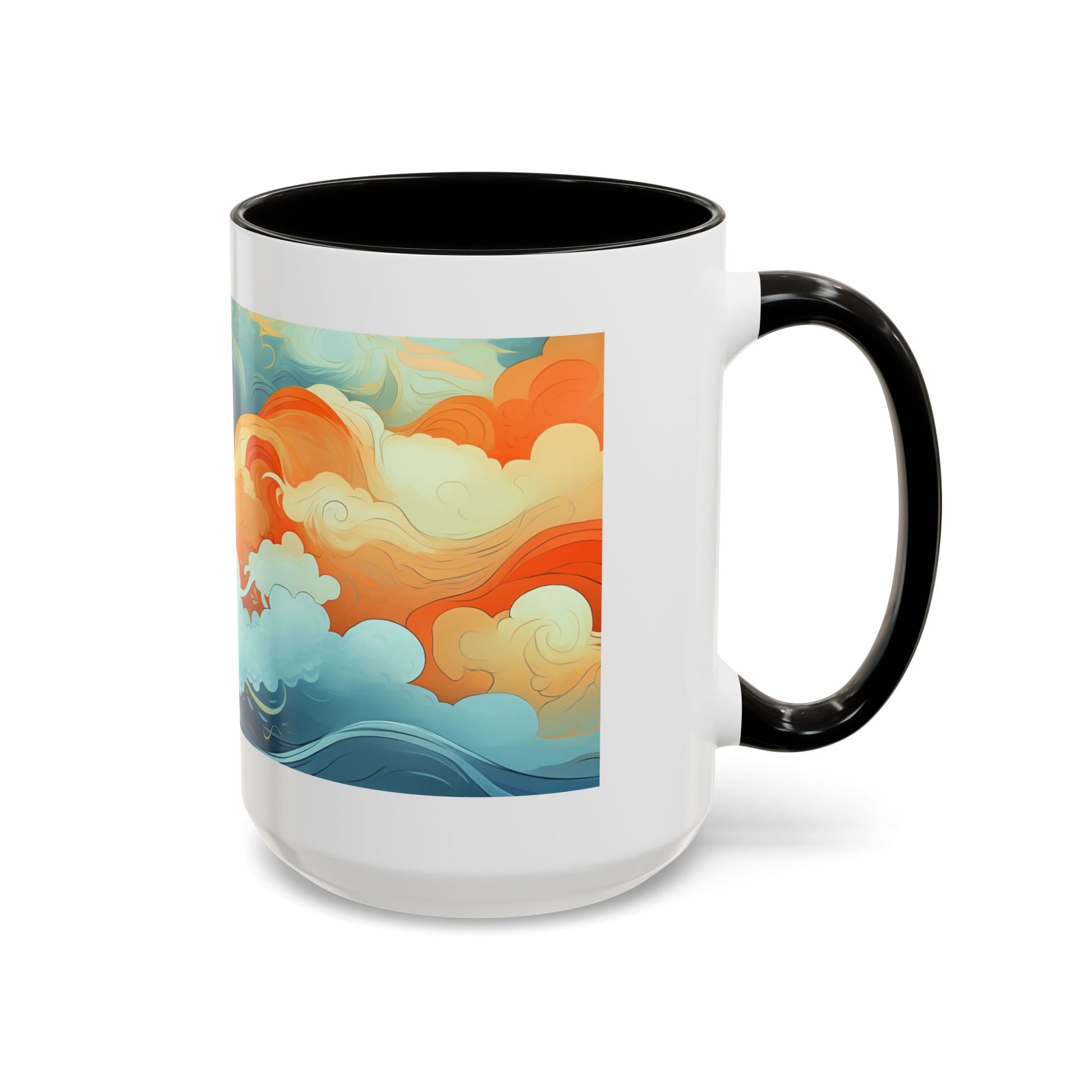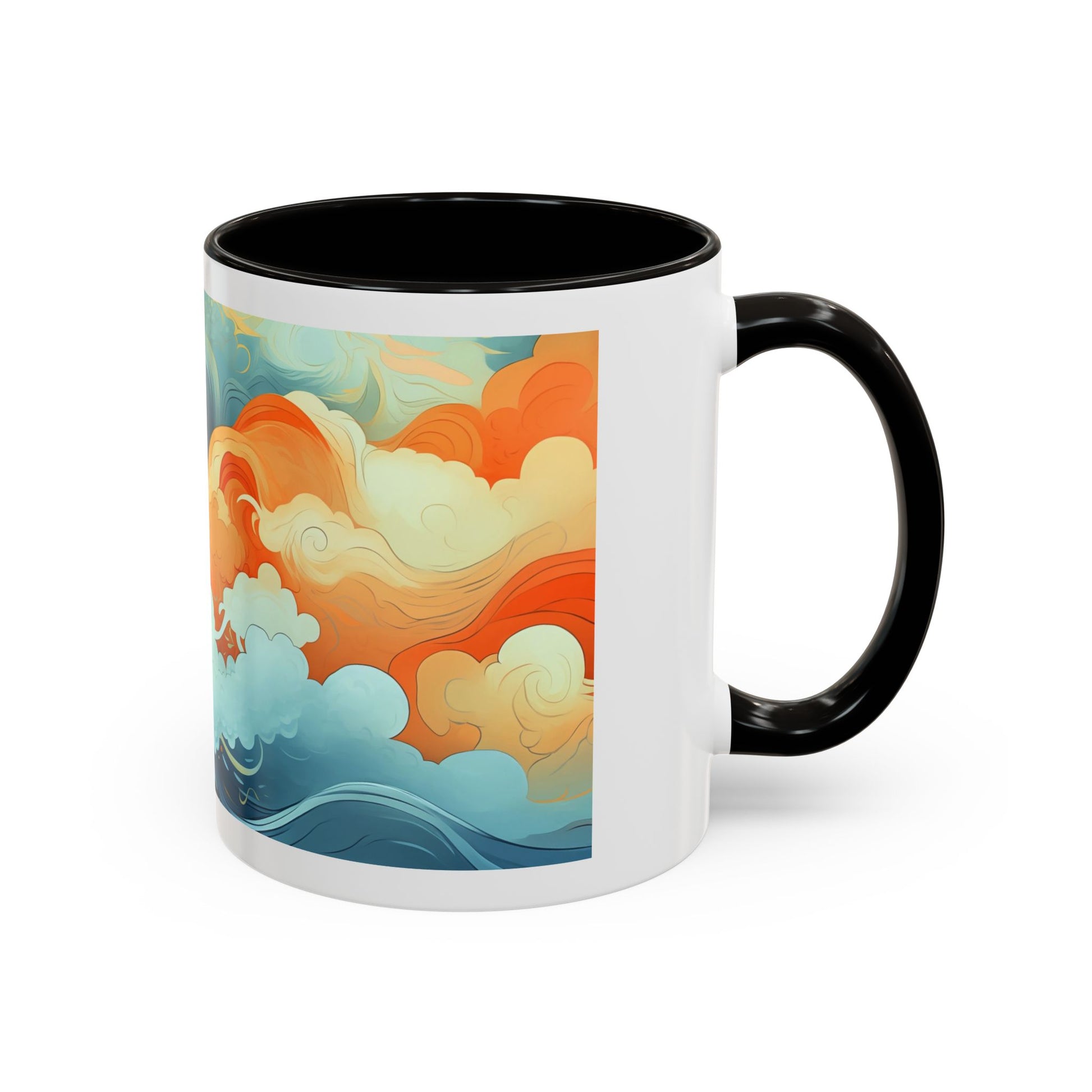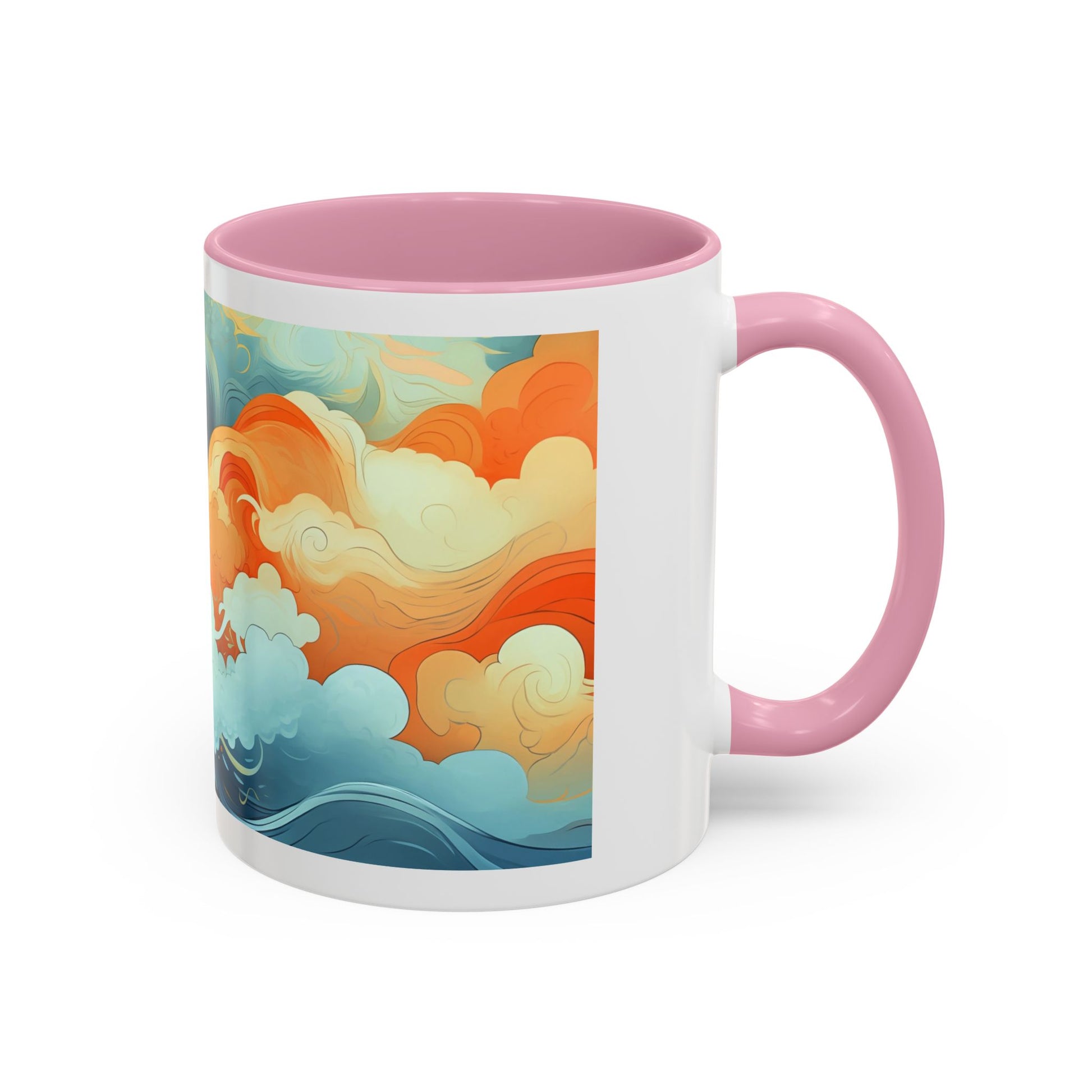Sip color and calm in equal measure. This glossy ceramic mug wraps a sweeping, painterly seascape around its curve — warm coral clouds rolling into teal waves with layered brush-like strokes. The interior and C-handle come in a contrasting accent color, so each morning feels curated and a little brighter. It’s sturdy enough for daily use, safe in the microwave and dishwasher, and the ORCA coating keeps the artwork vivid through many washes. Use it at your desk, on the porch, or as a cozy companion during slow afternoons with a book.