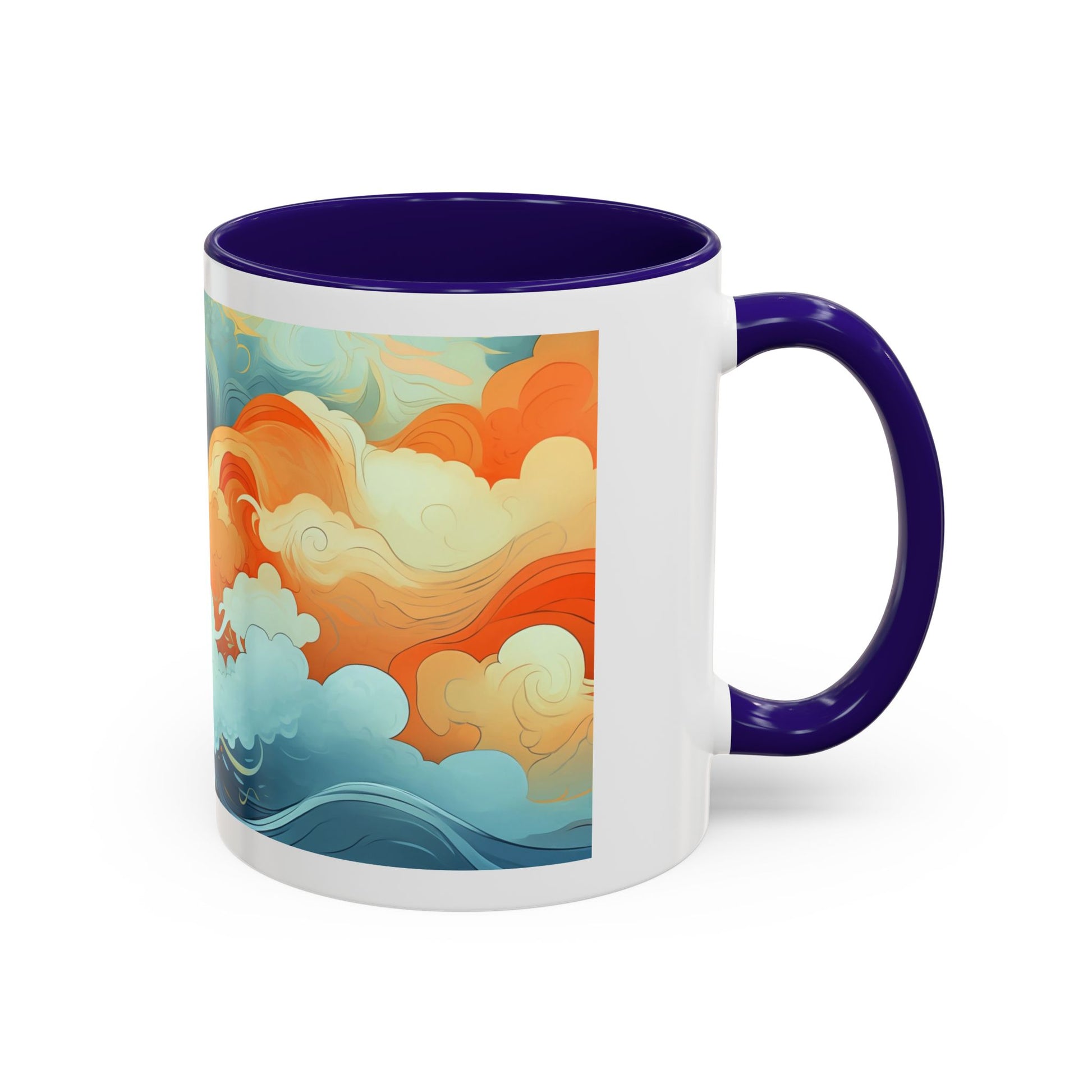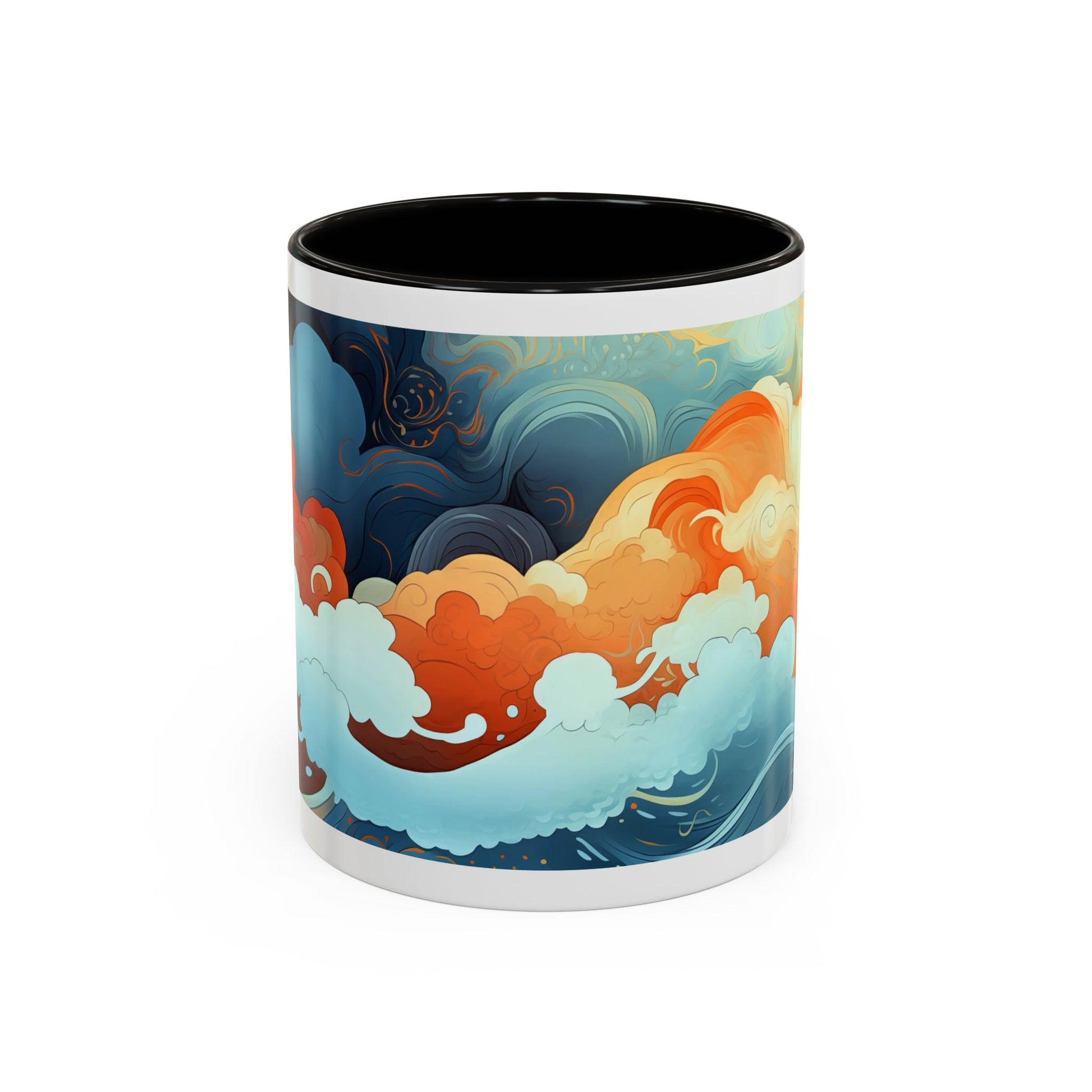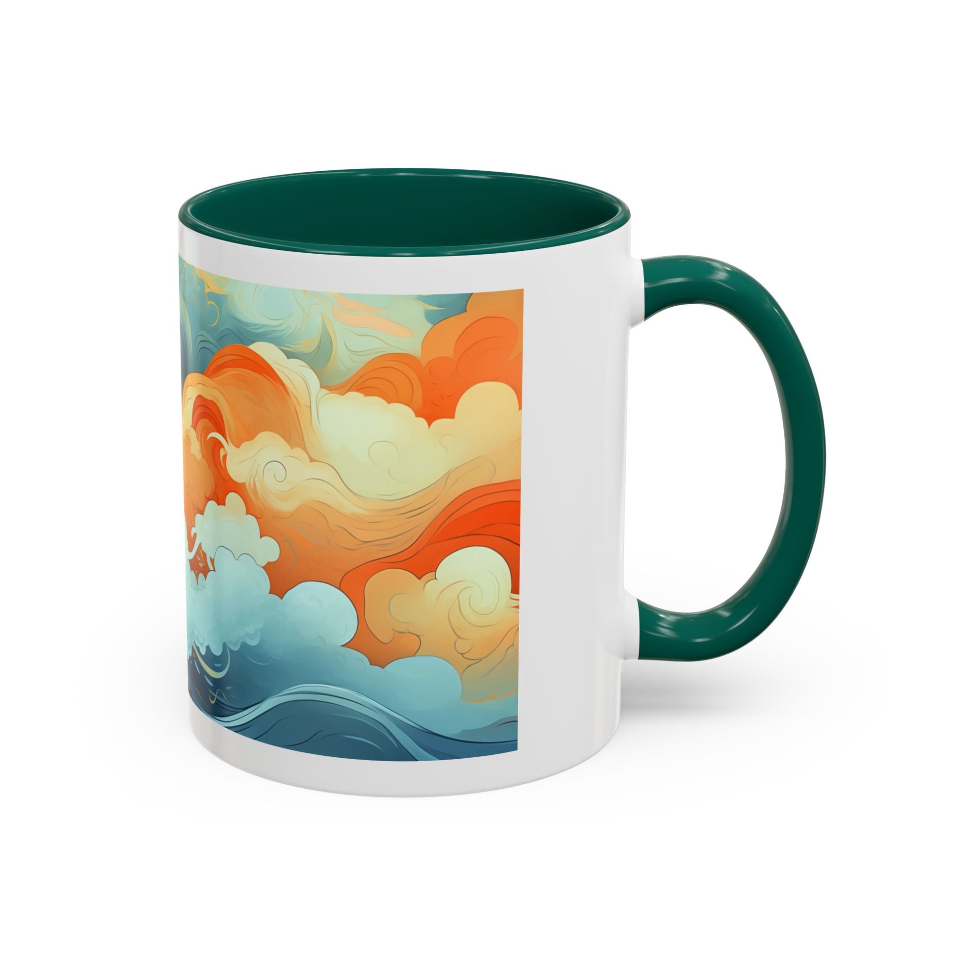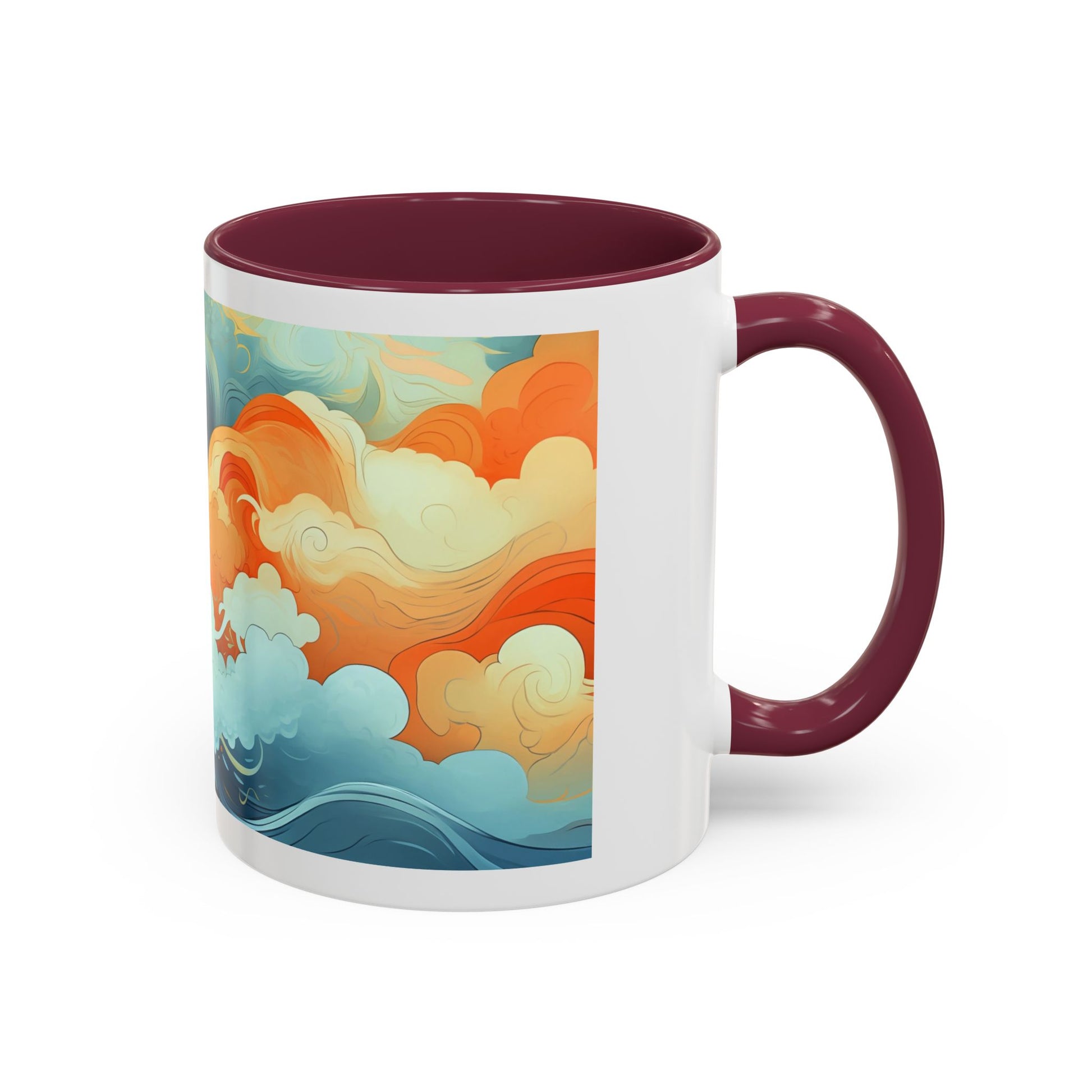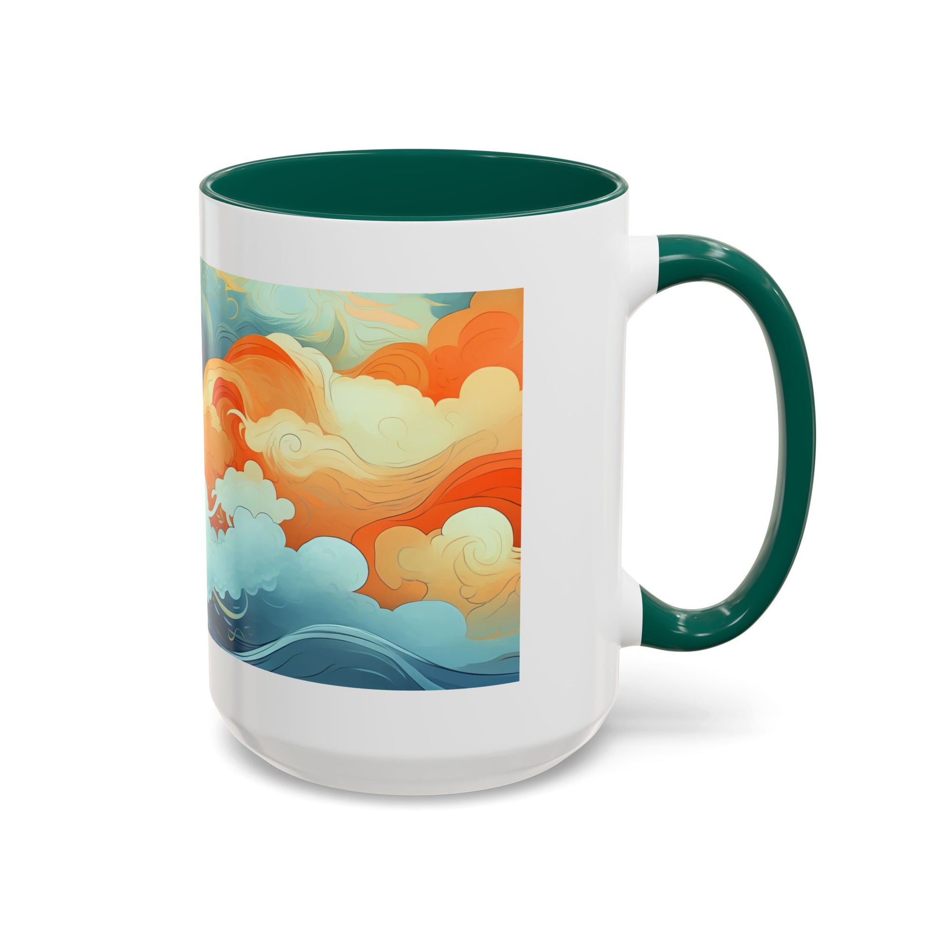 Sip color and calm in equal measure. This glossy ceramic mug wraps a sweeping, painterly seascape around its curve — warm coral clouds rolling into teal waves with layered brush-like strokes. The interior and C-handle come in a contrasting accent color, so each morning feels curated and a little brighter. It’s sturdy enough for daily use, safe in the microwave and dishwasher, and the ORCA coating keeps the artwork vivid through many washes. Use it at your desk, on the porch, or as a cozy companion during slow afternoons with a book.