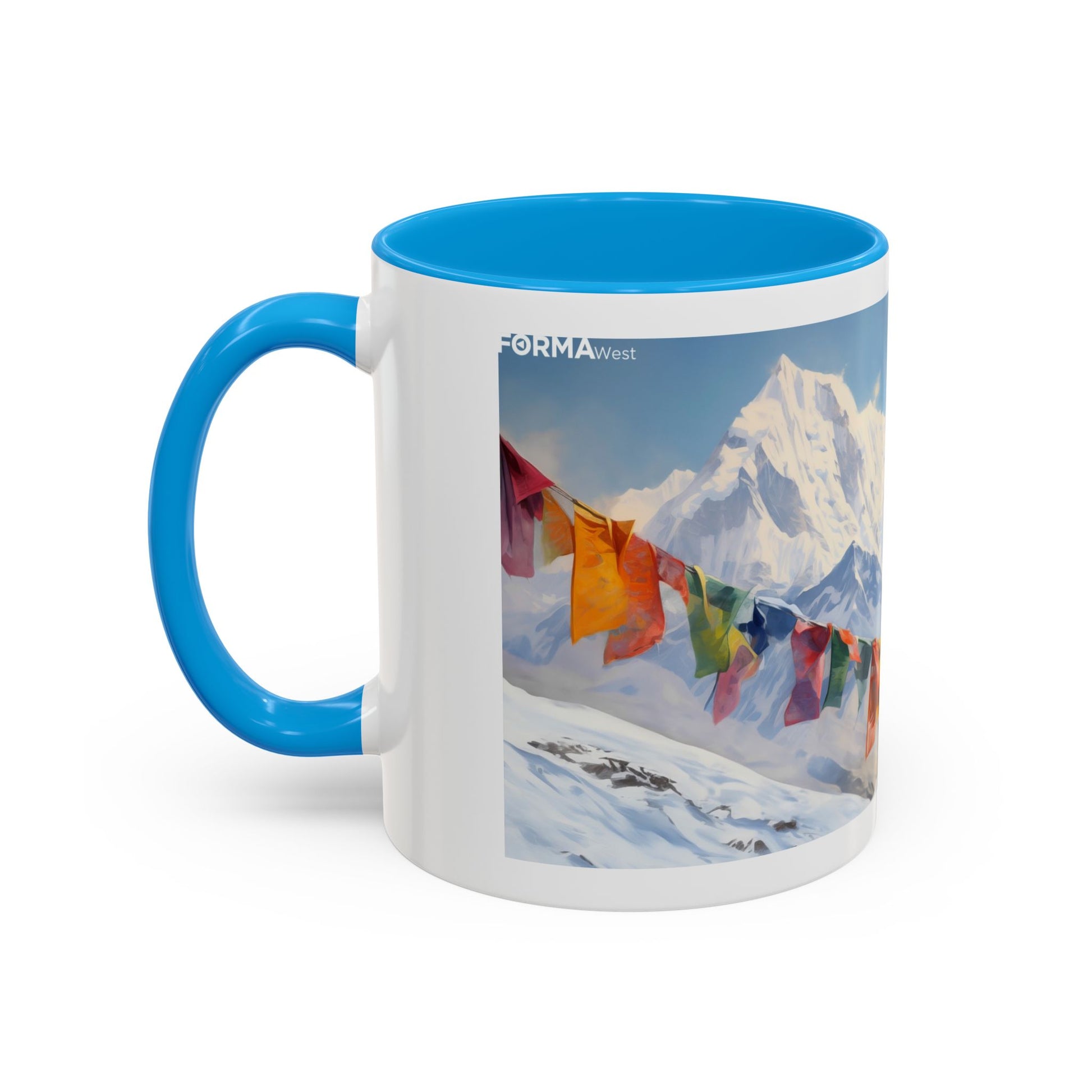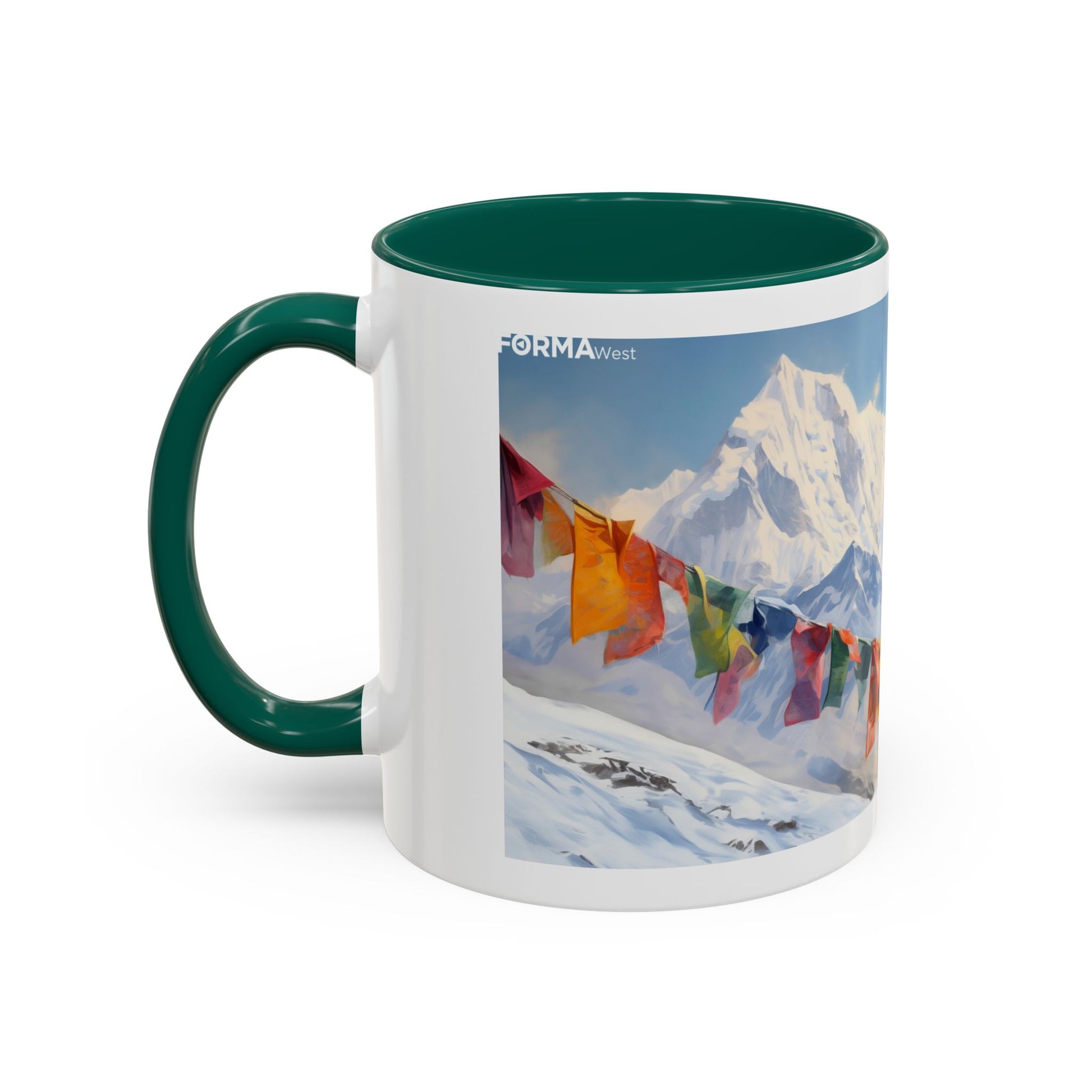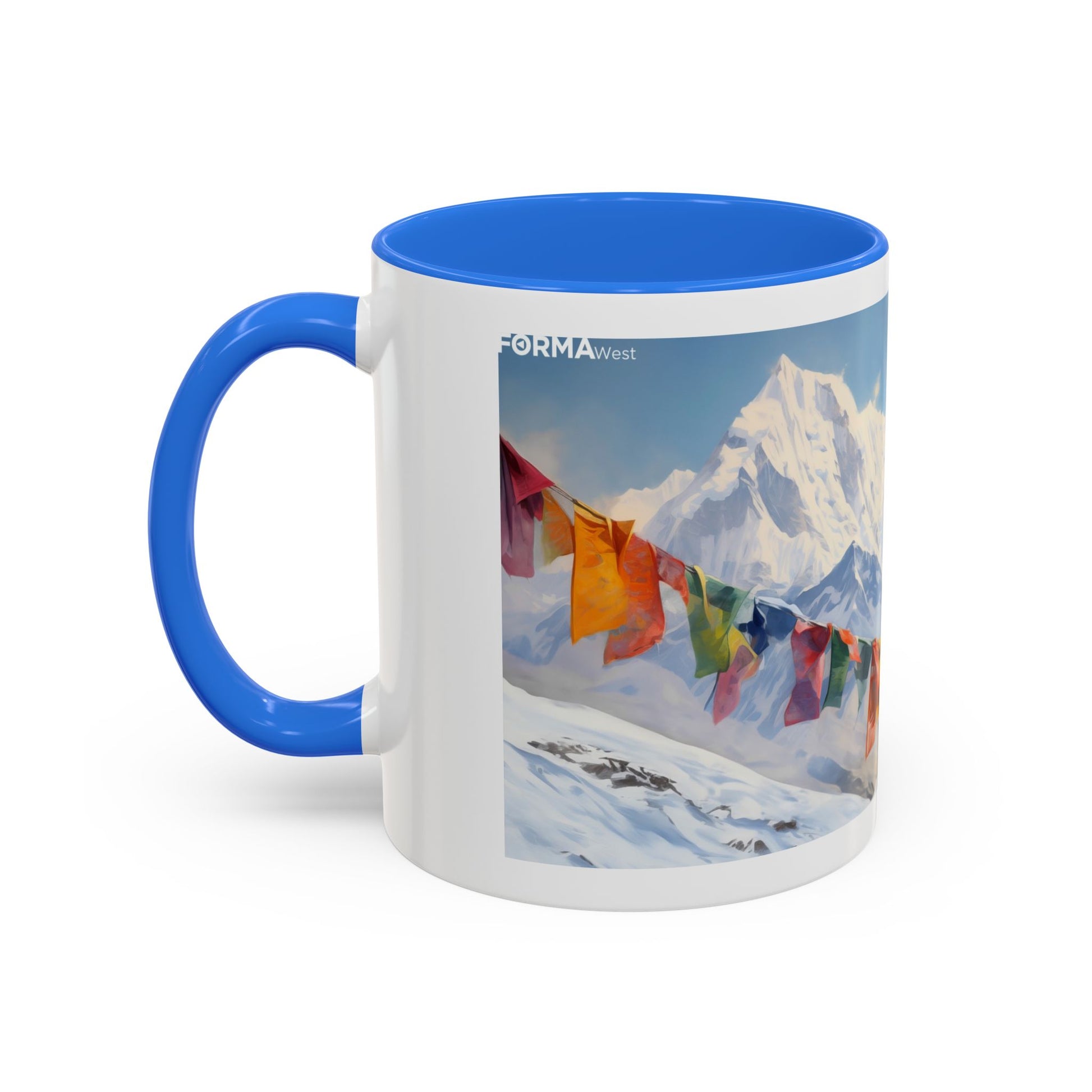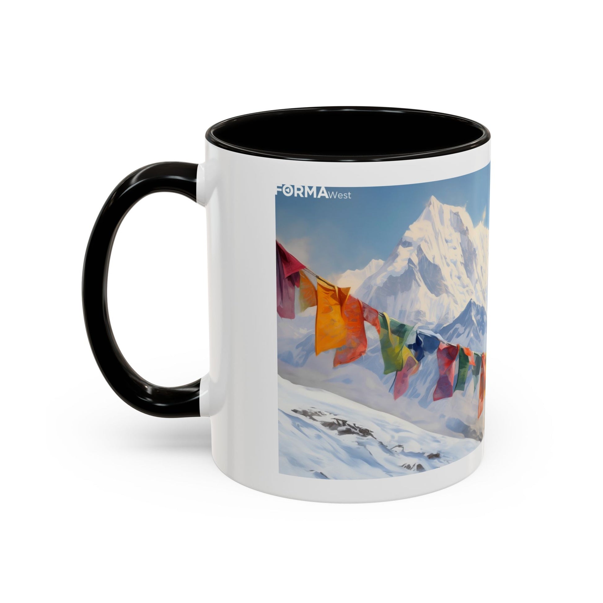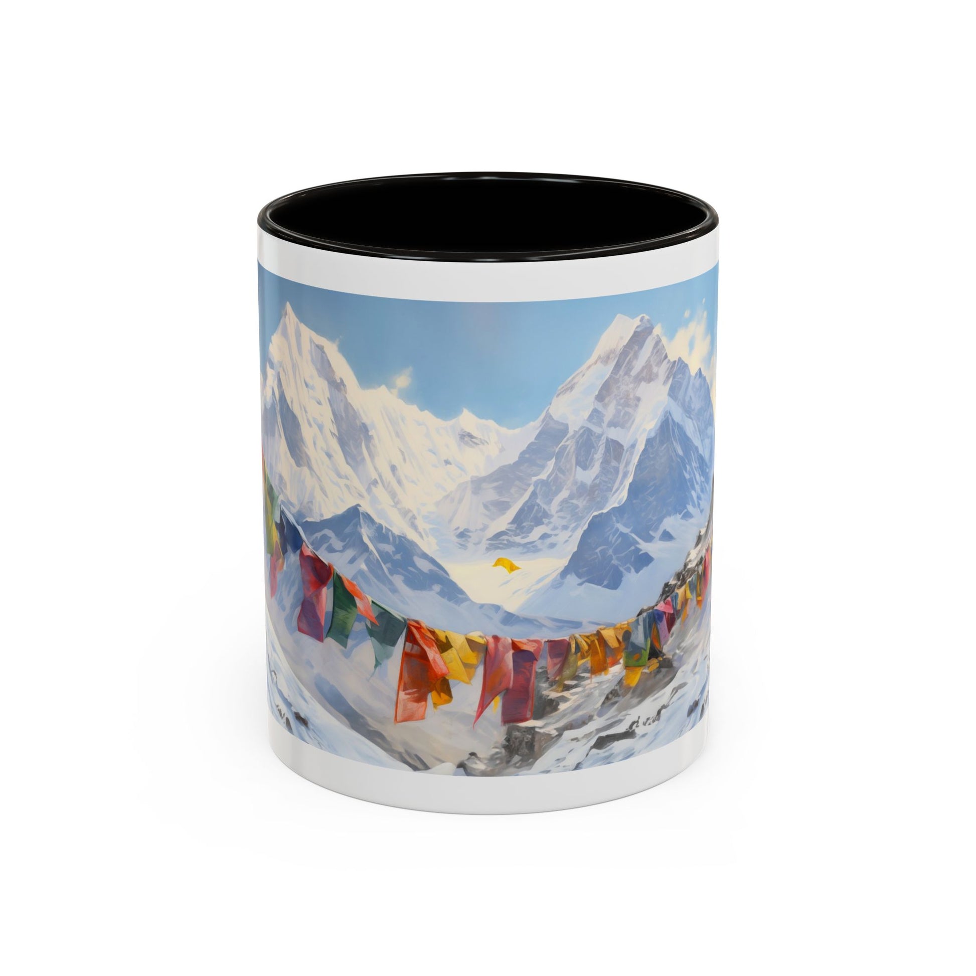 Sip into a quiet morning on a high ridge. This glossy ceramic mug wraps a soft, painterly mountain scene—snowy peaks, pale blue sky, and a string of colorful prayer flags that flutter across the panorama. The contrasting colored handle and interior add a cheerful pop that echoes the flags. It feels like a steady breath at dawn: clear, cool, and quietly hopeful. Use it for coffee between early starts, tea after a long trek, or as a small reminder of wide open places when you’re at your desk.