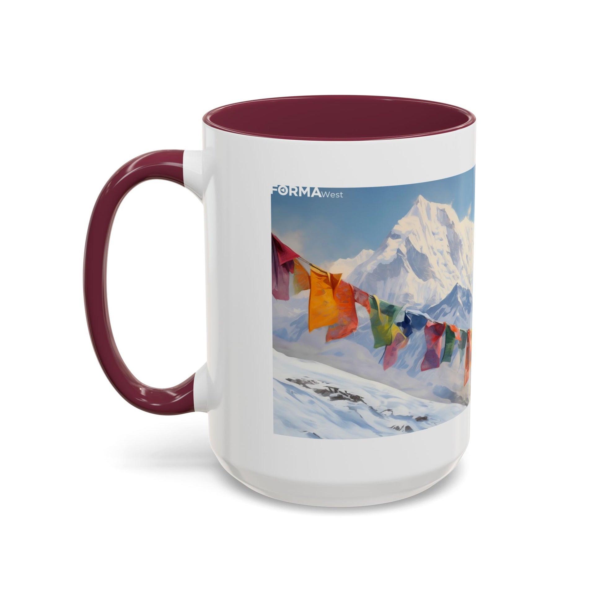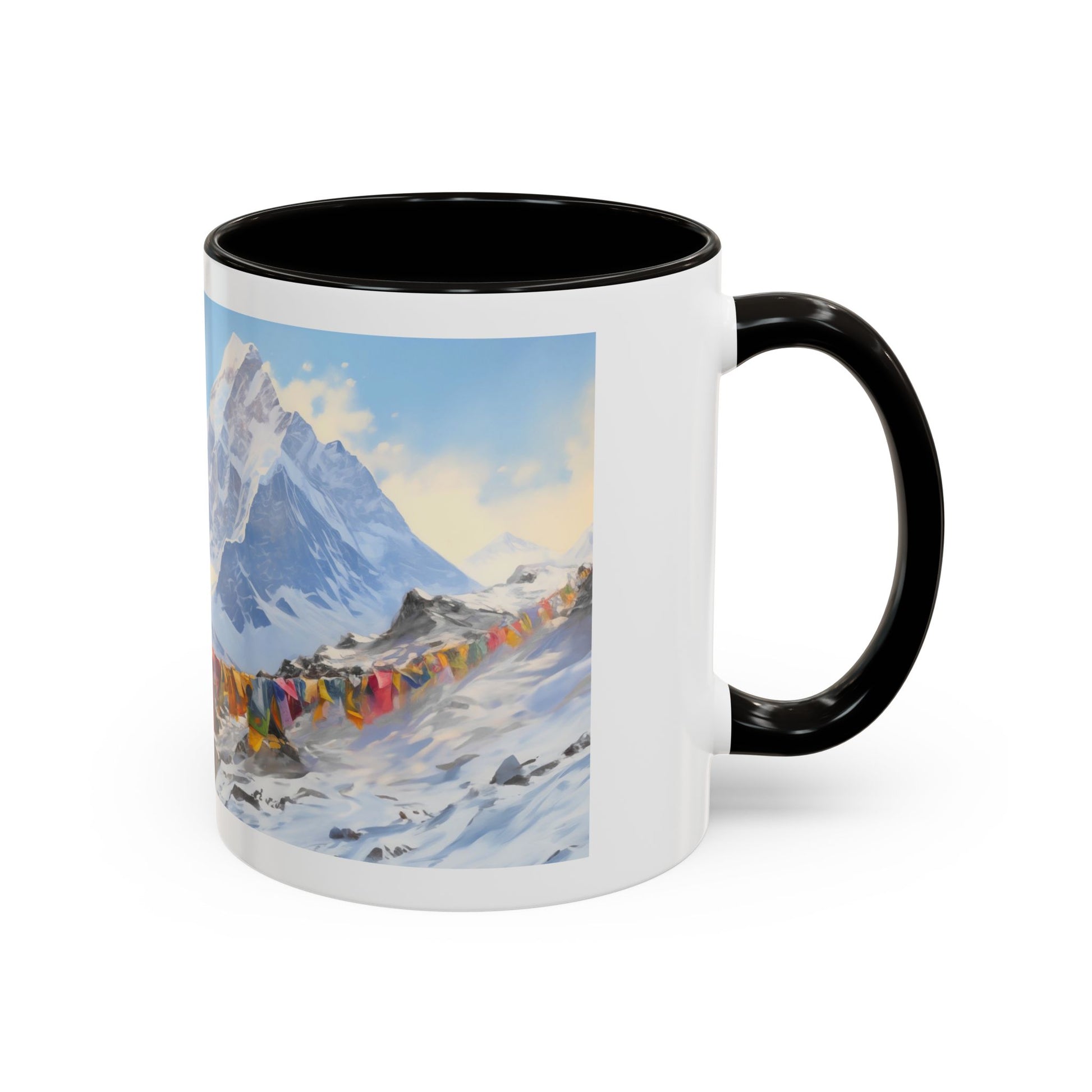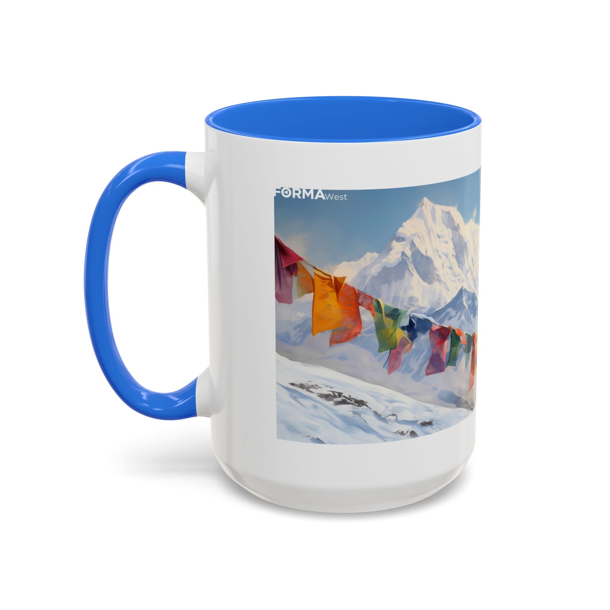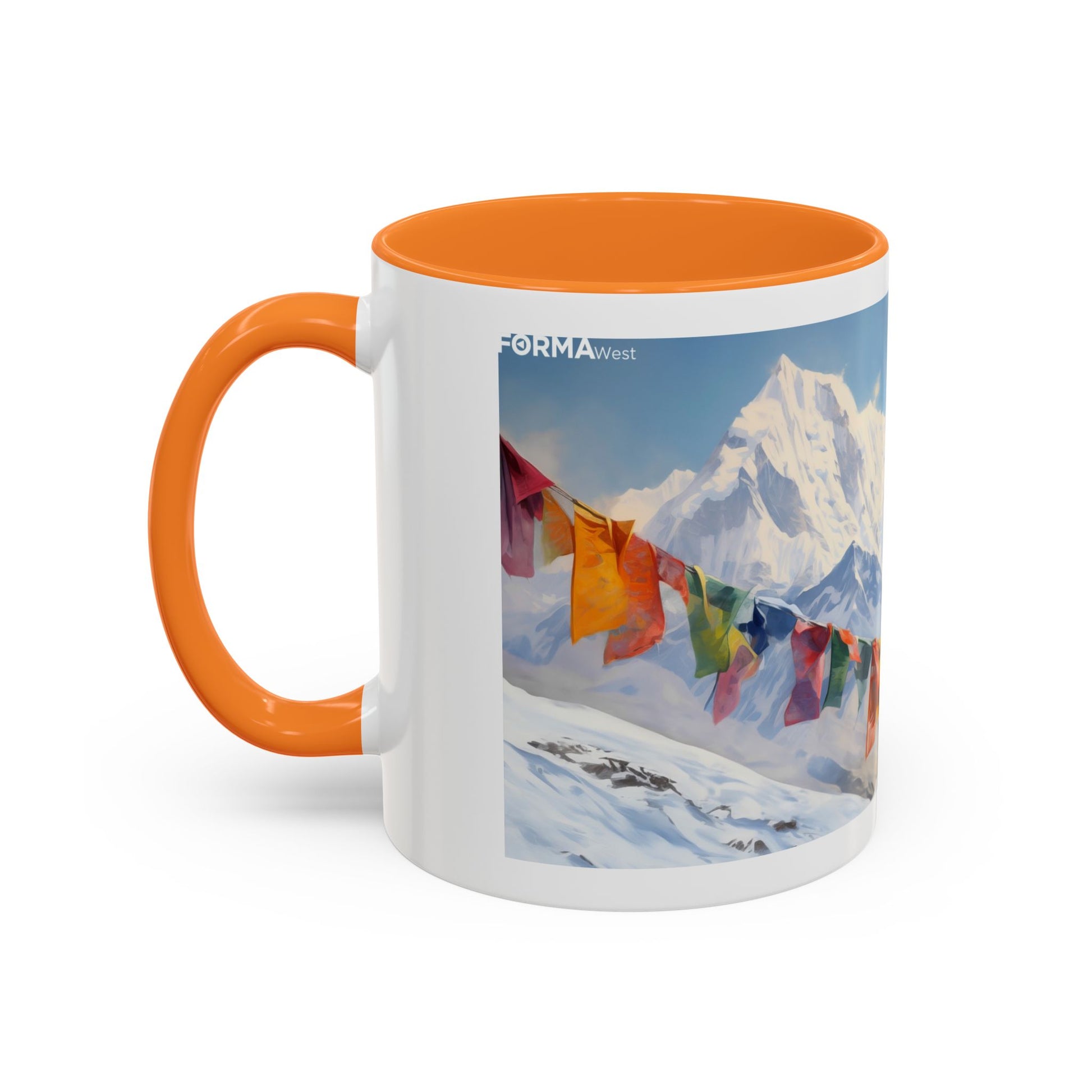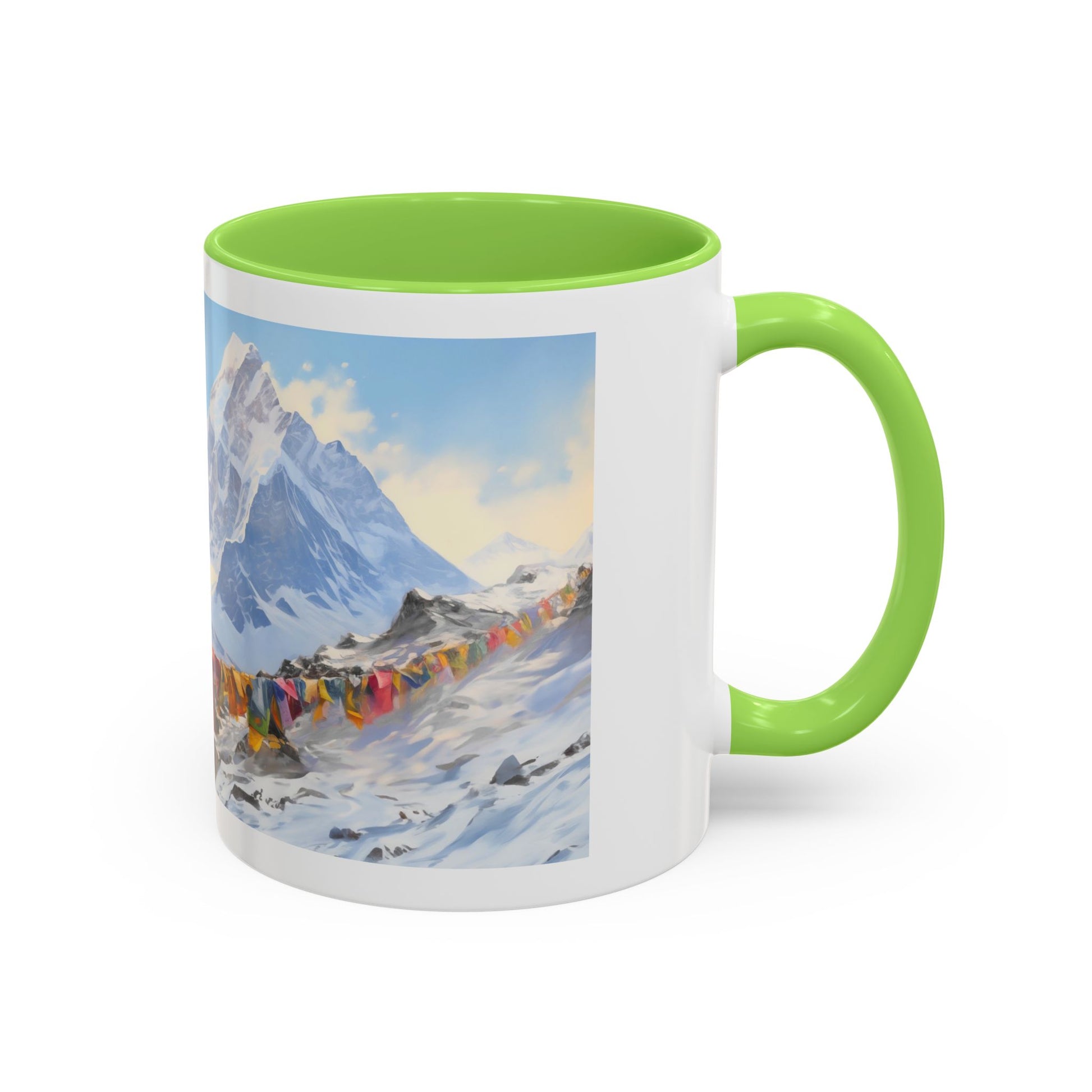 Sip into a quiet morning on a high ridge. This glossy ceramic mug wraps a soft, painterly mountain scene—snowy peaks, pale blue sky, and a string of colorful prayer flags that flutter across the panorama. The contrasting colored handle and interior add a cheerful pop that echoes the flags. It feels like a steady breath at dawn: clear, cool, and quietly hopeful. Use it for coffee between early starts, tea after a long trek, or as a small reminder of wide open places when you’re at your desk.
