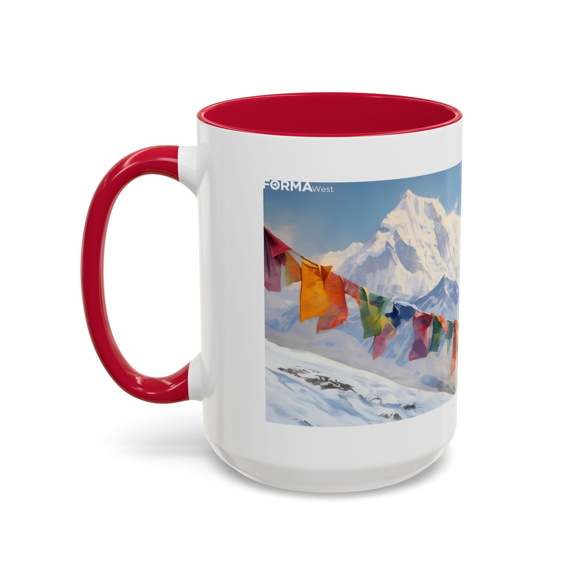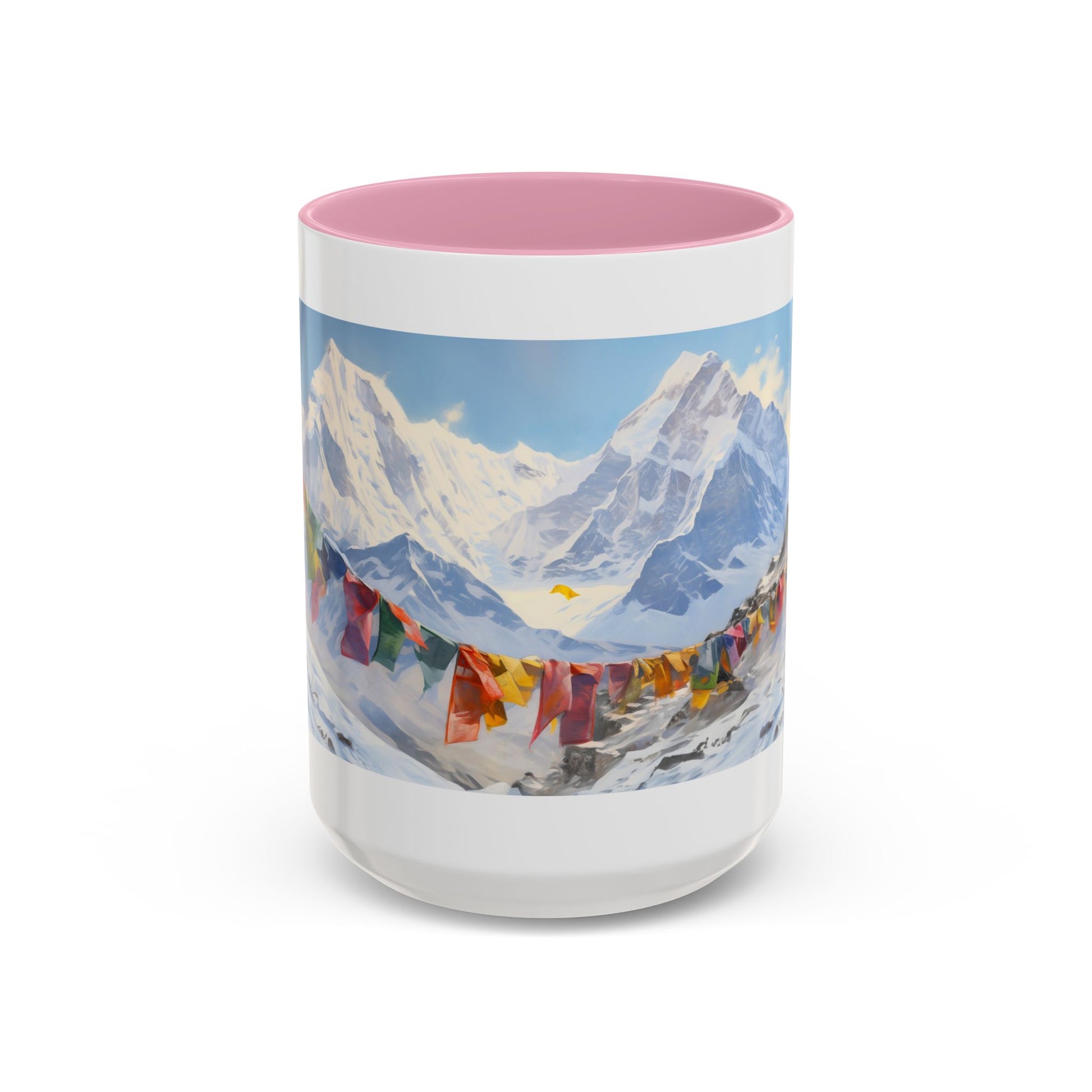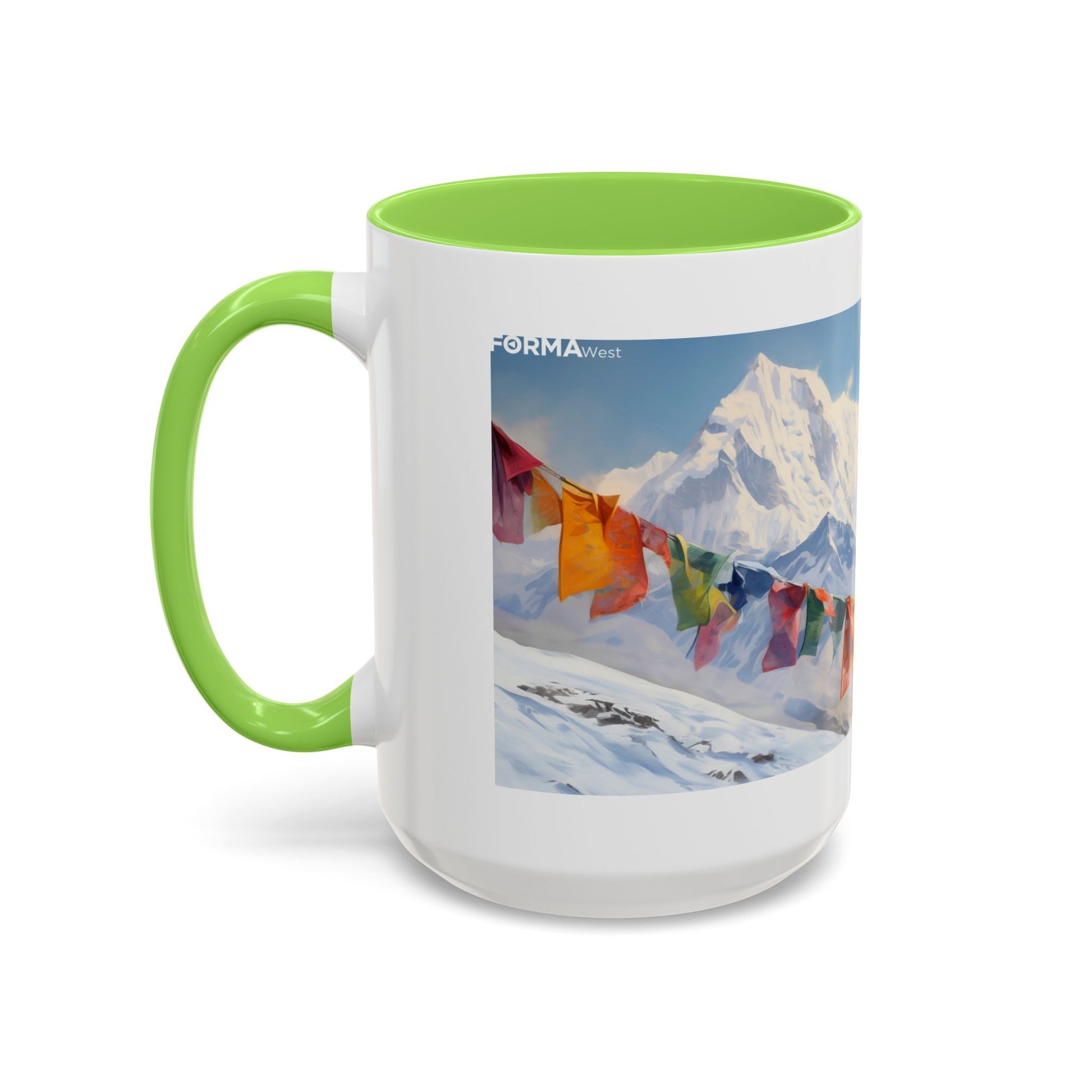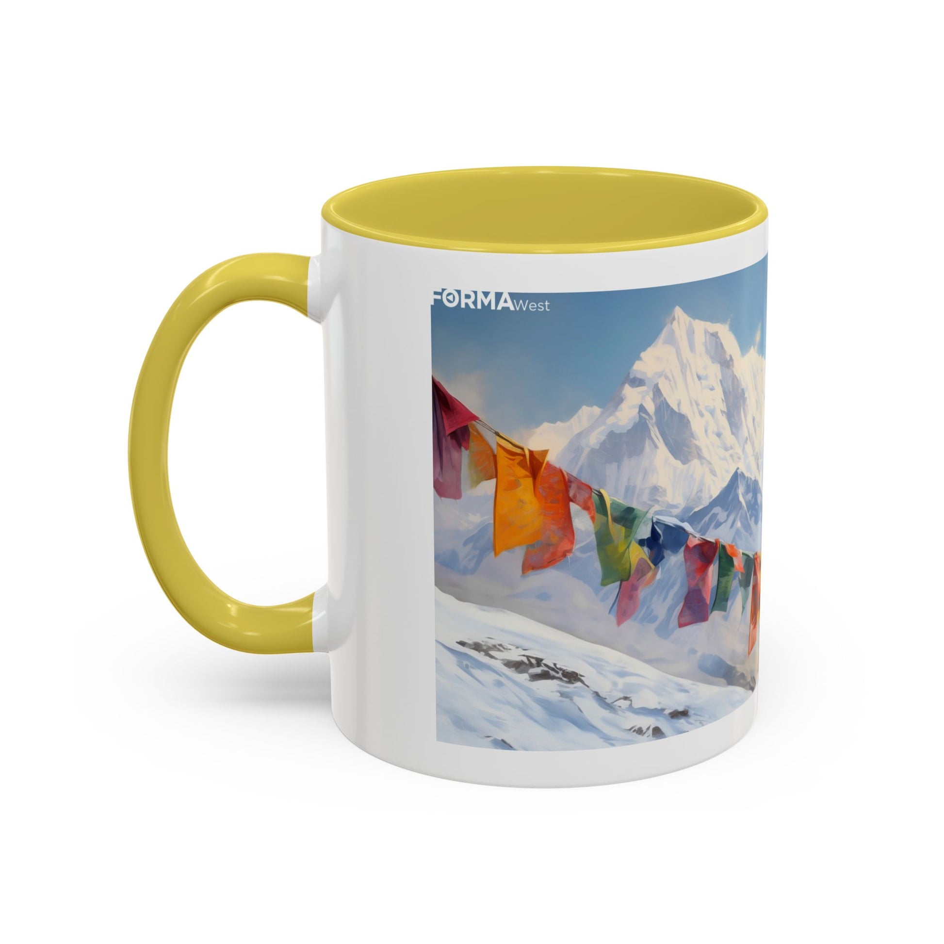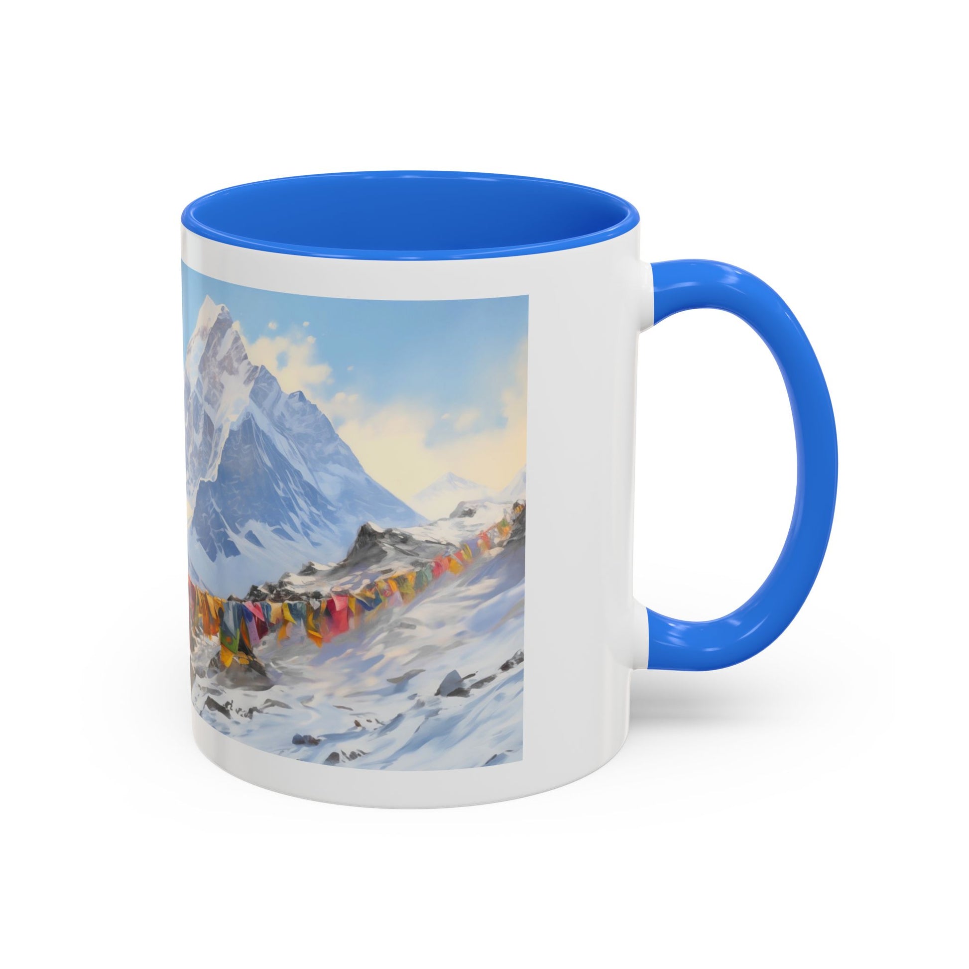 Sip into a quiet morning on a high ridge. This glossy ceramic mug wraps a soft, painterly mountain scene—snowy peaks, pale blue sky, and a string of colorful prayer flags that flutter across the panorama. The contrasting colored handle and interior add a cheerful pop that echoes the flags. It feels like a steady breath at dawn: clear, cool, and quietly hopeful. Use it for coffee between early starts, tea after a long trek, or as a small reminder of wide open places when you’re at your desk.