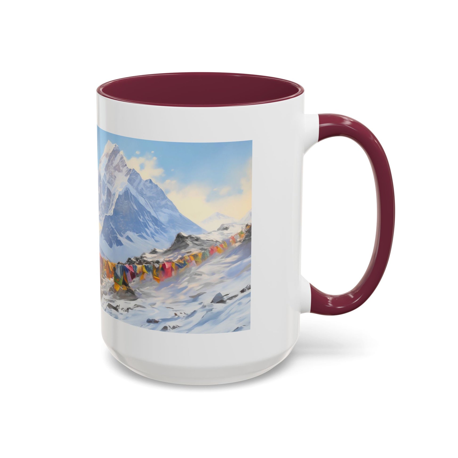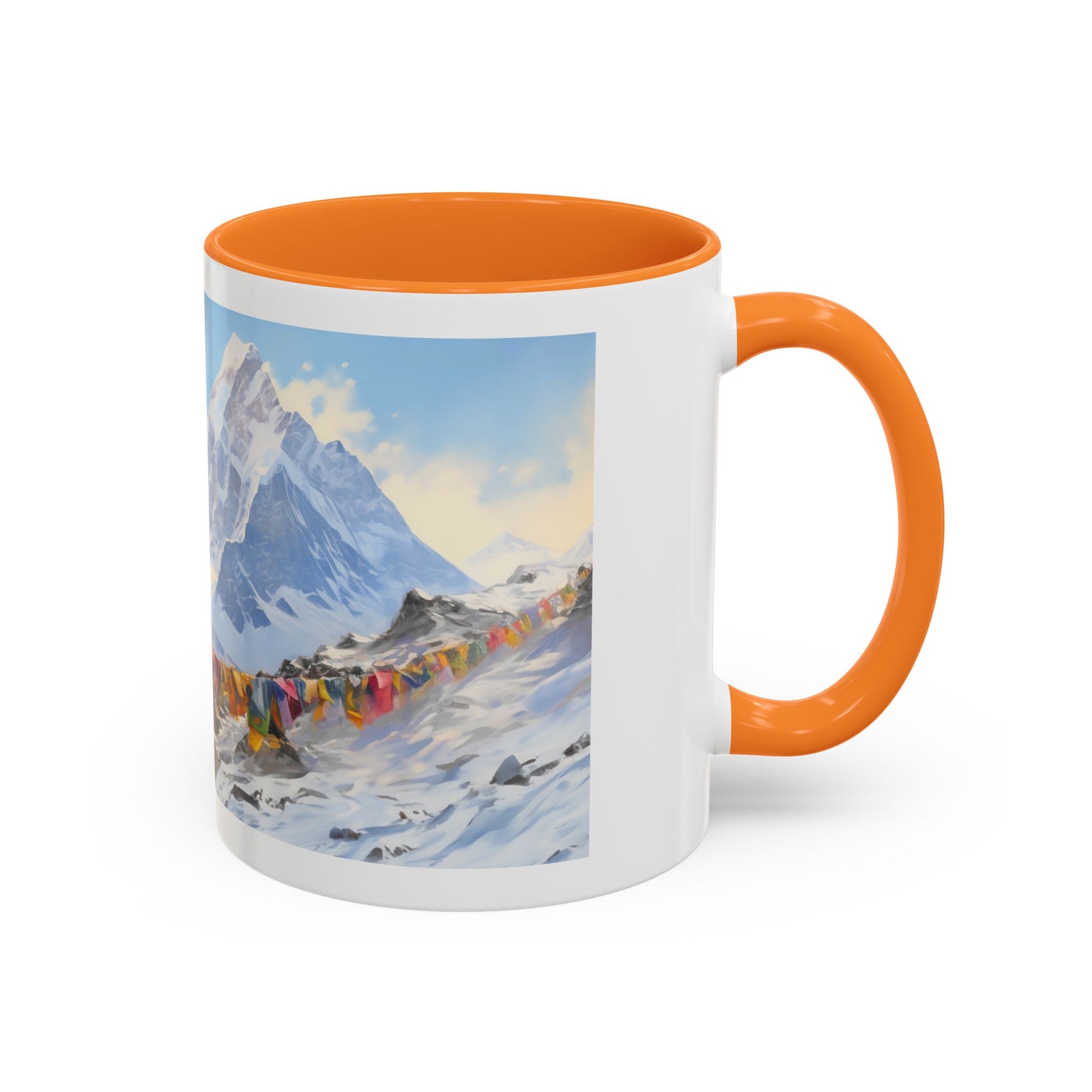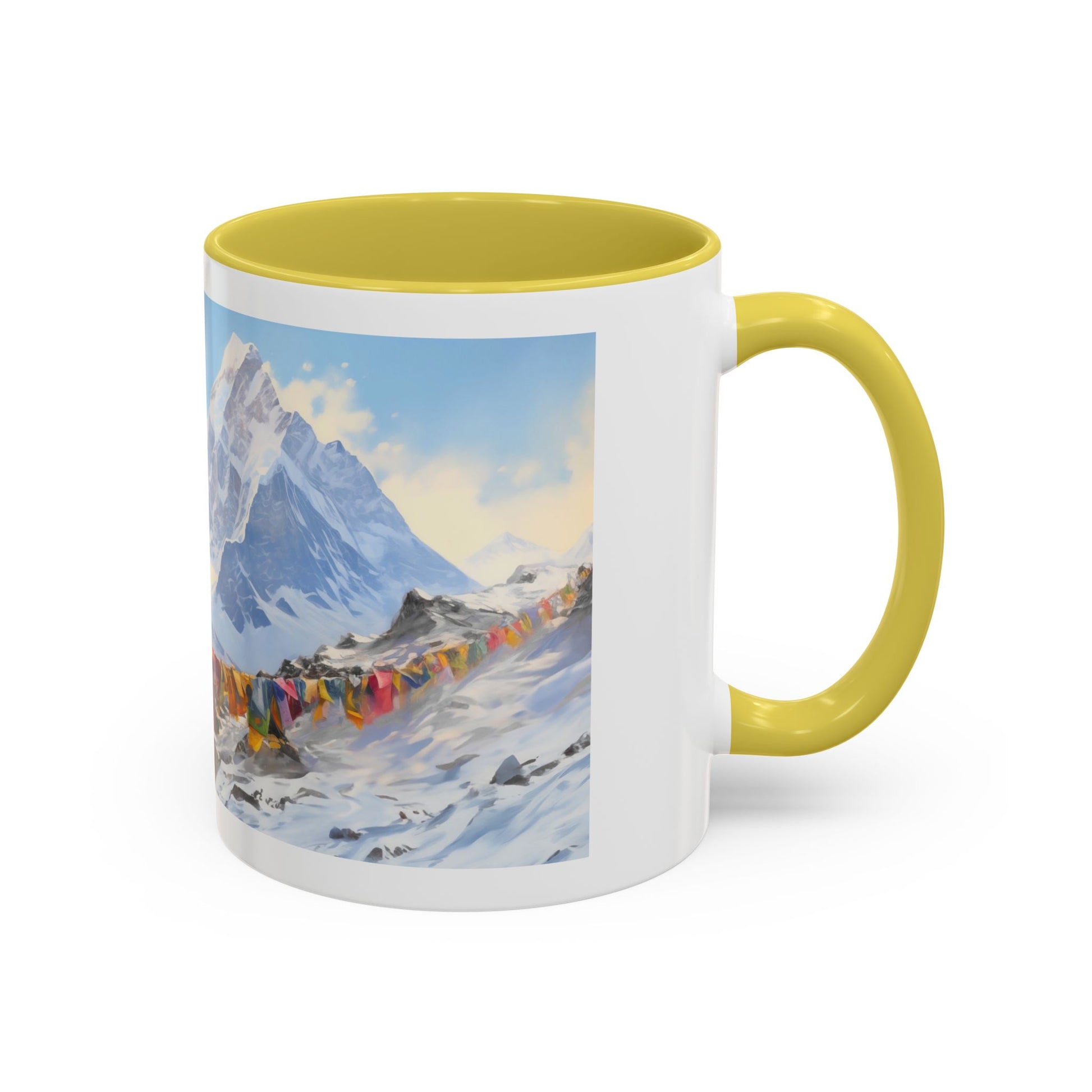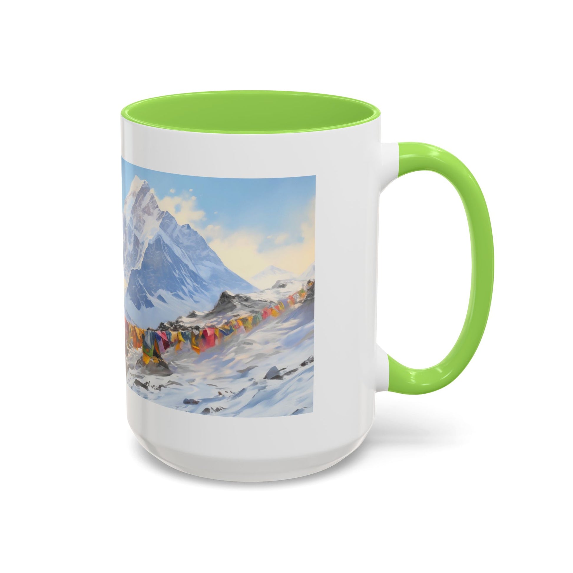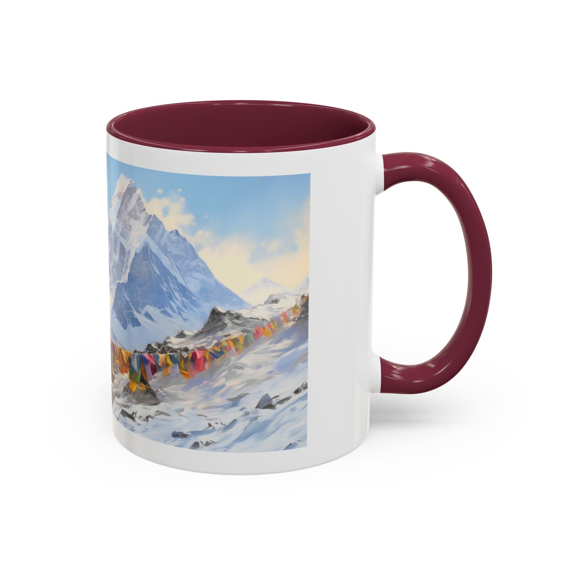 Sip into a quiet morning on a high ridge. This glossy ceramic mug wraps a soft, painterly mountain scene—snowy peaks, pale blue sky, and a string of colorful prayer flags that flutter across the panorama. The contrasting colored handle and interior add a cheerful pop that echoes the flags. It feels like a steady breath at dawn: clear, cool, and quietly hopeful. Use it for coffee between early starts, tea after a long trek, or as a small reminder of wide open places when you’re at your desk.