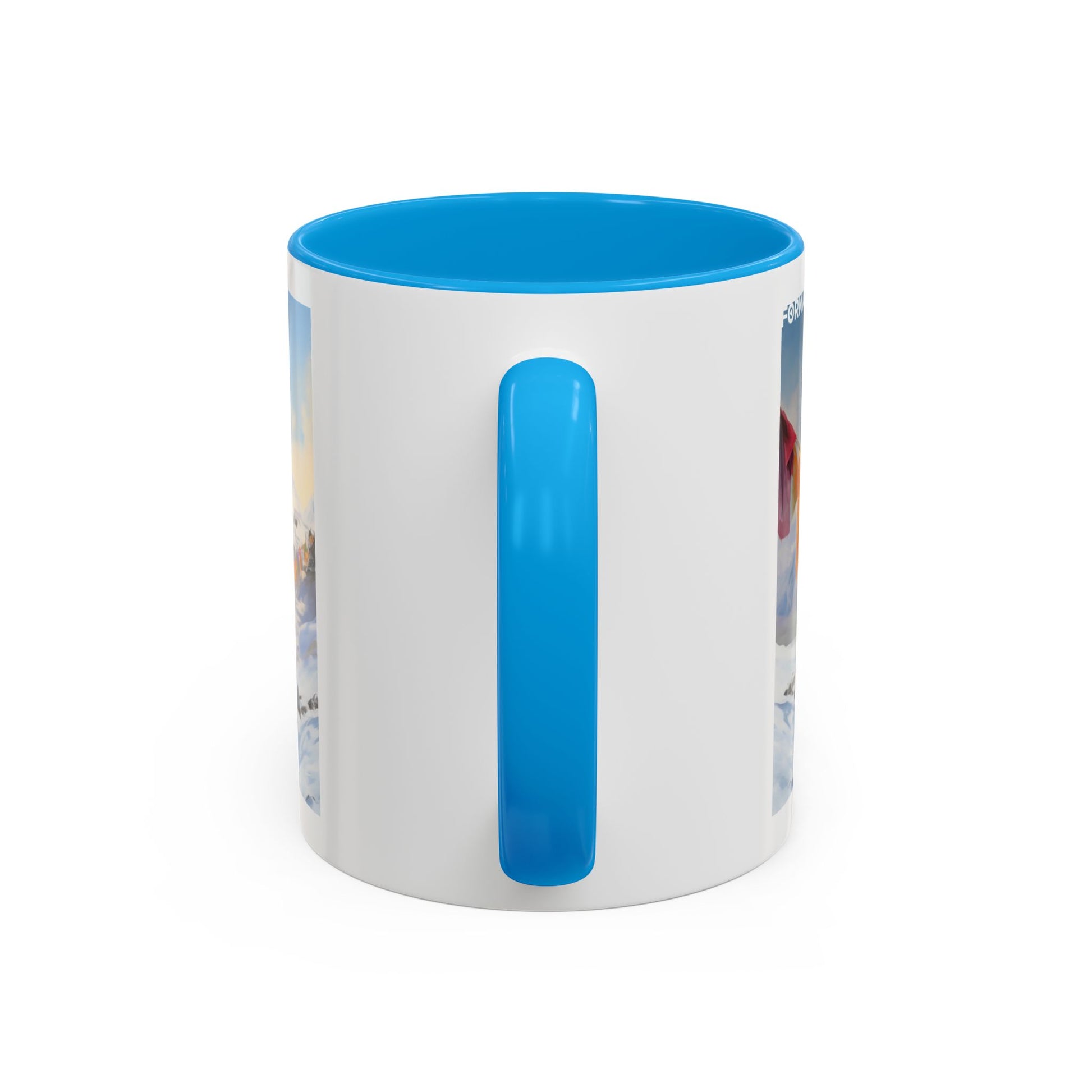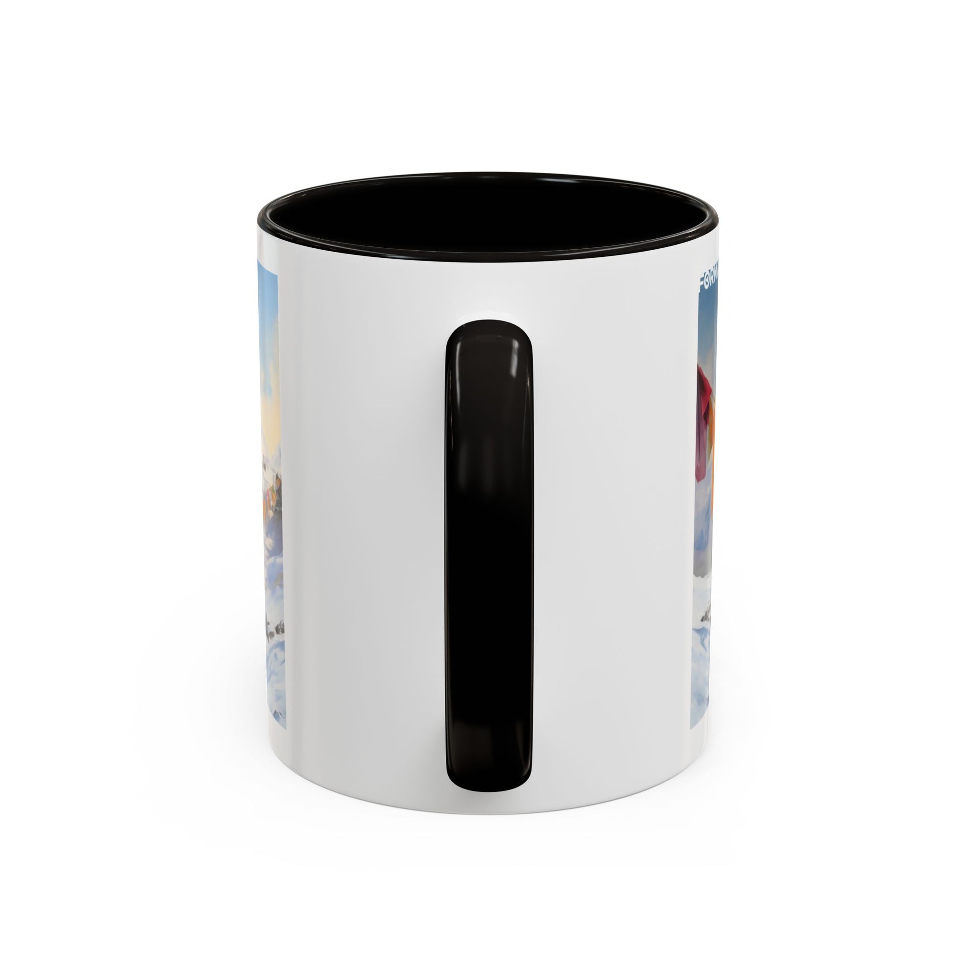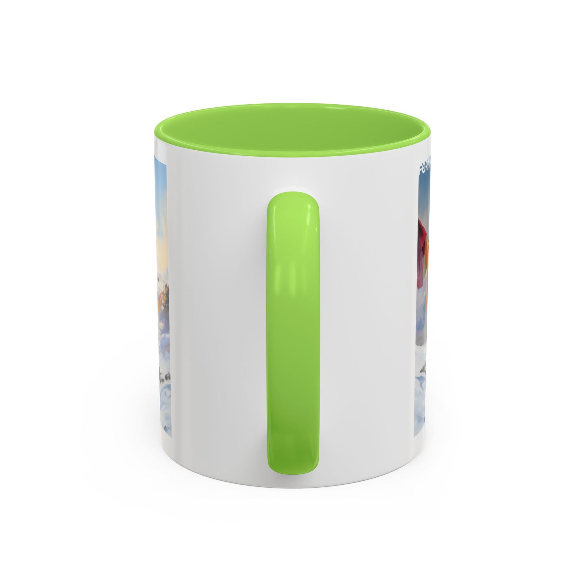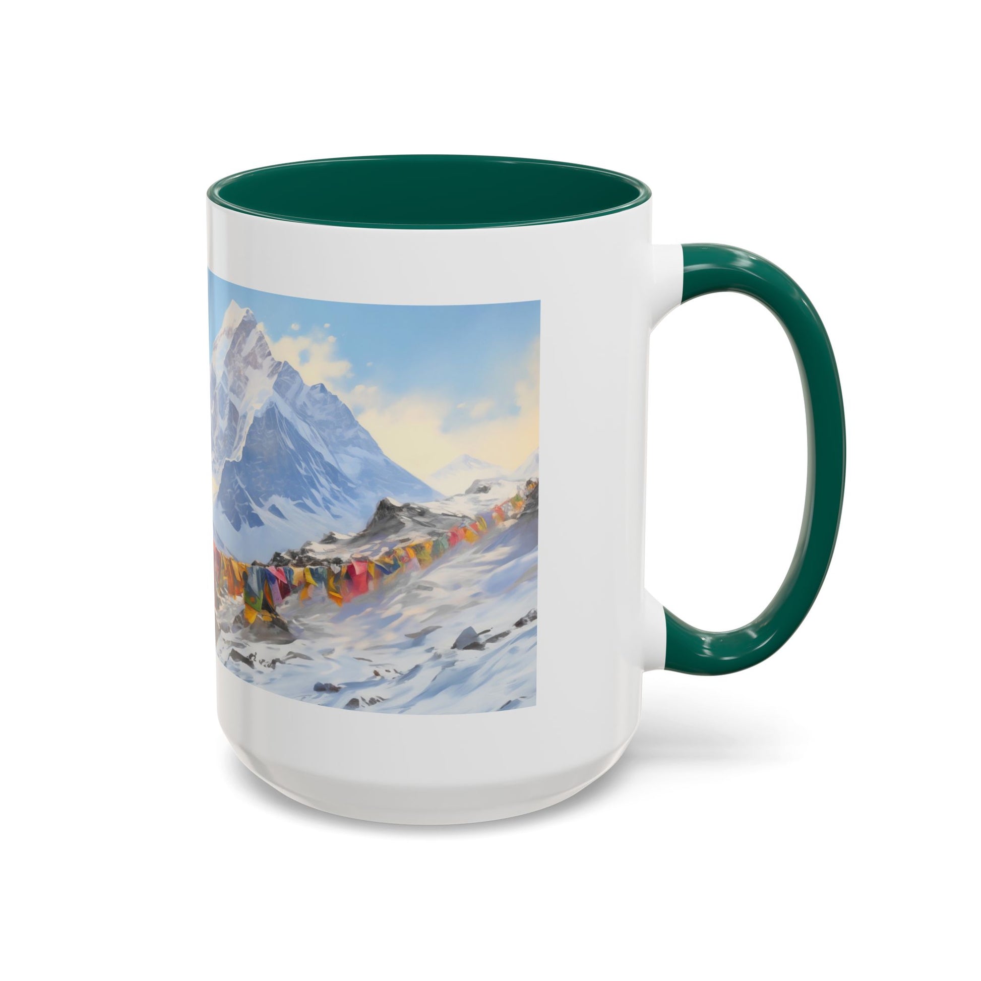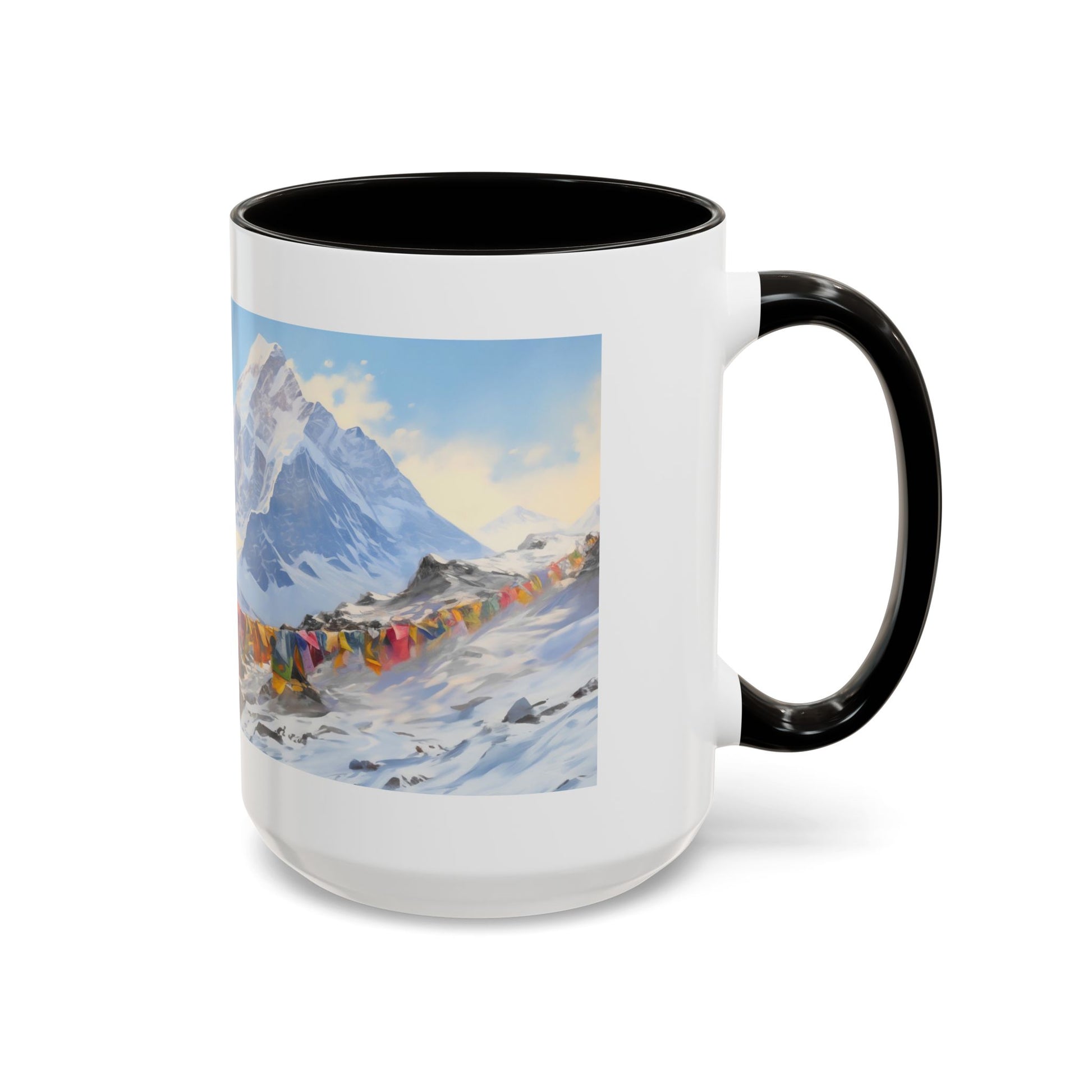 Sip into a quiet morning on a high ridge. This glossy ceramic mug wraps a soft, painterly mountain scene—snowy peaks, pale blue sky, and a string of colorful prayer flags that flutter across the panorama. The contrasting colored handle and interior add a cheerful pop that echoes the flags. It feels like a steady breath at dawn: clear, cool, and quietly hopeful. Use it for coffee between early starts, tea after a long trek, or as a small reminder of wide open places when you’re at your desk.