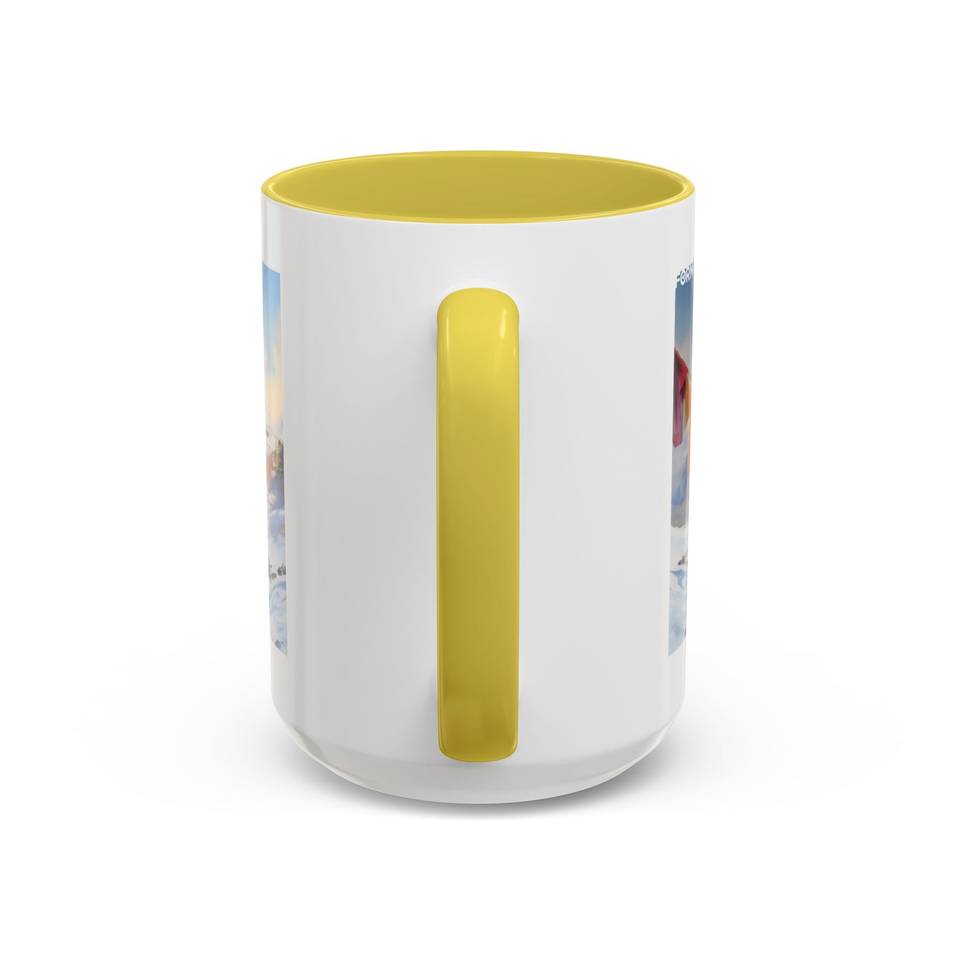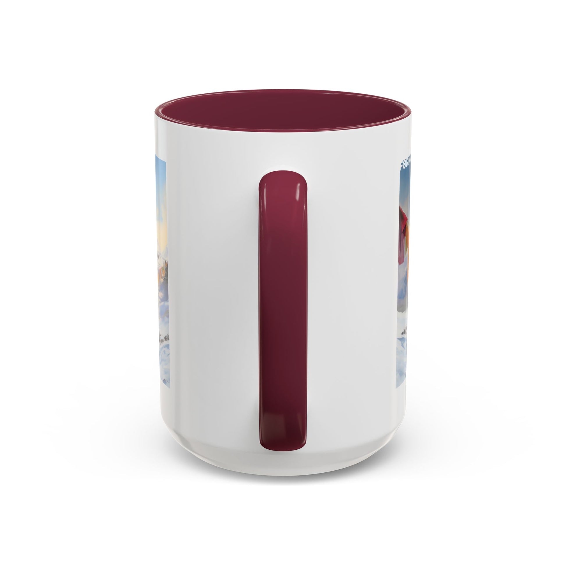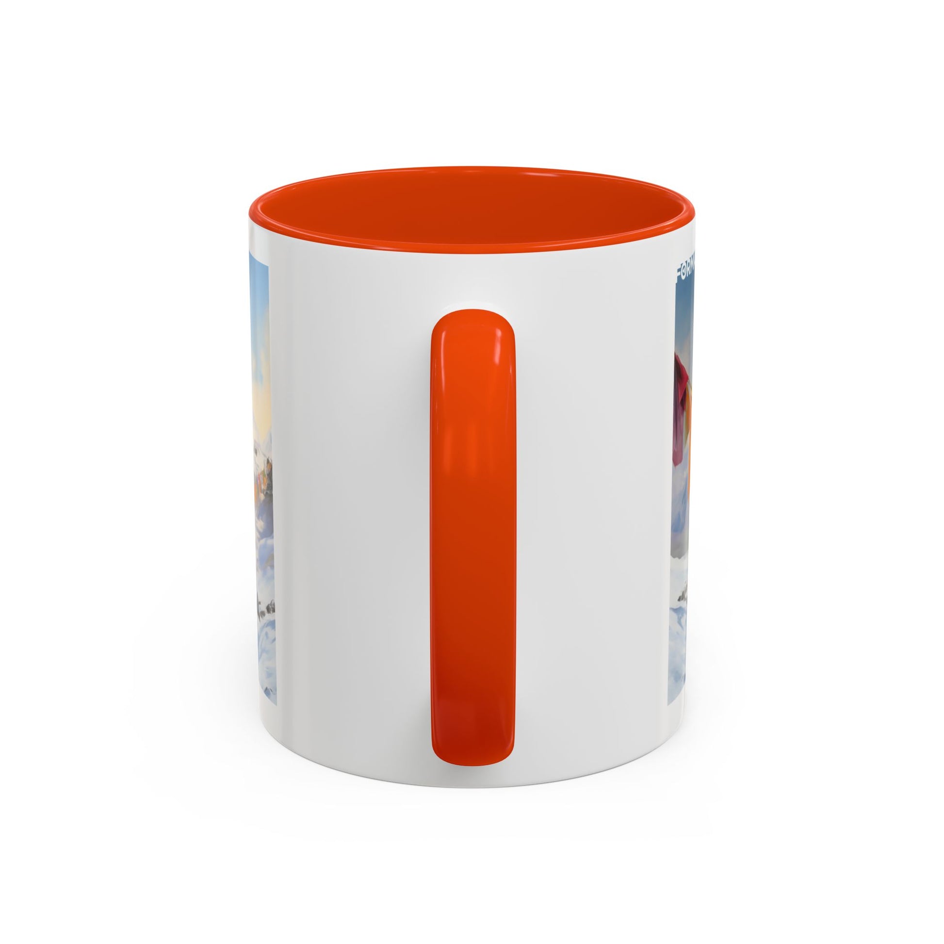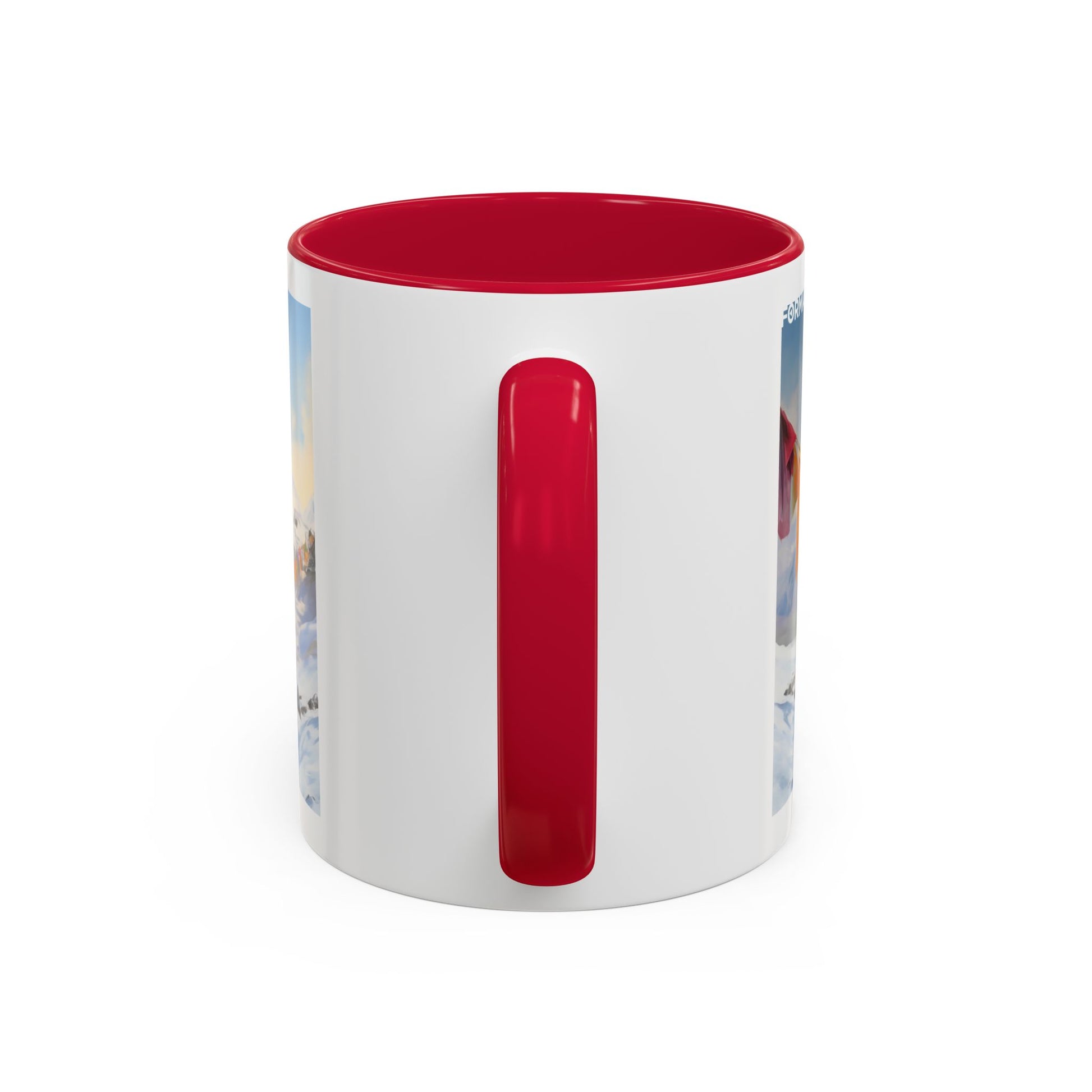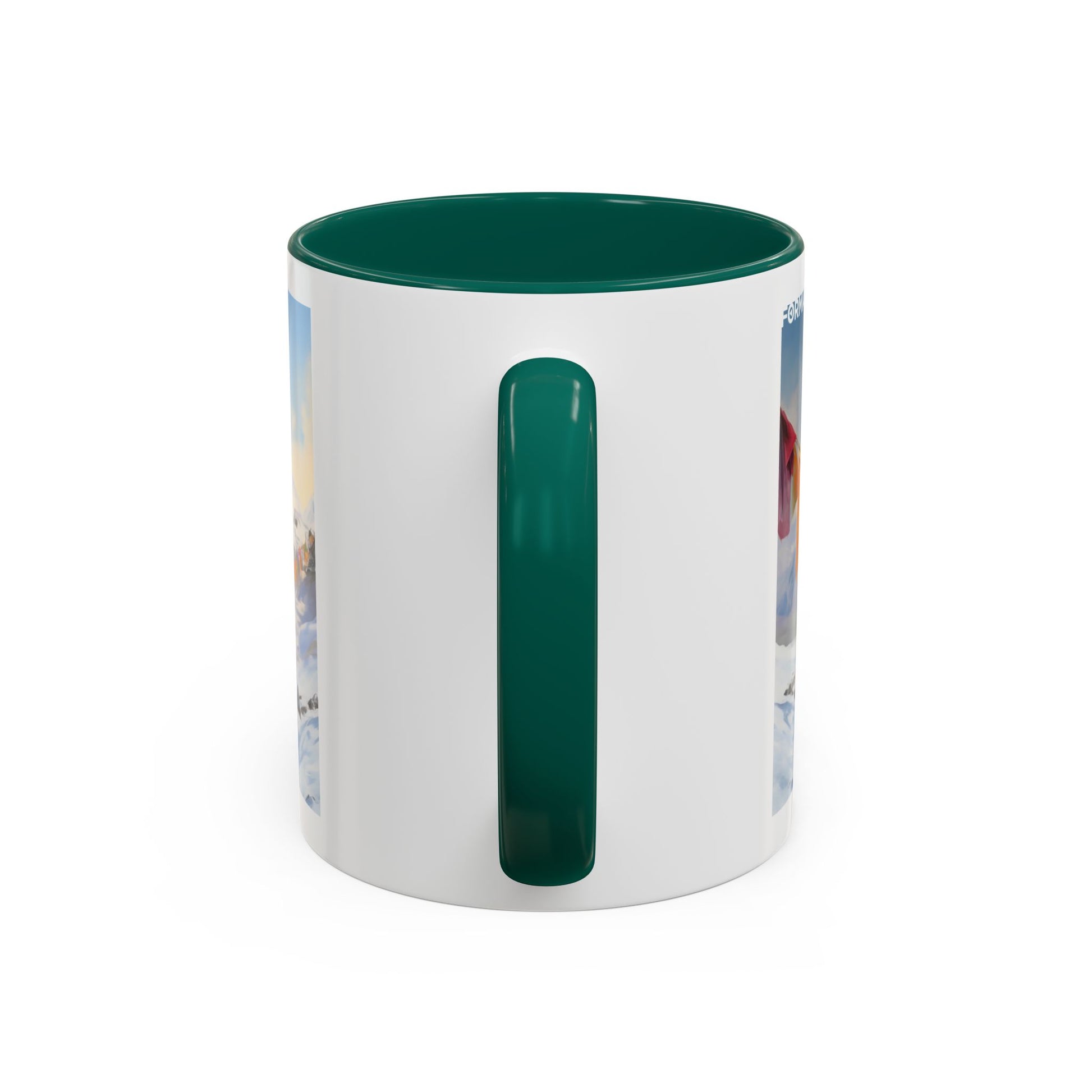 Sip into a quiet morning on a high ridge. This glossy ceramic mug wraps a soft, painterly mountain scene—snowy peaks, pale blue sky, and a string of colorful prayer flags that flutter across the panorama. The contrasting colored handle and interior add a cheerful pop that echoes the flags. It feels like a steady breath at dawn: clear, cool, and quietly hopeful. Use it for coffee between early starts, tea after a long trek, or as a small reminder of wide open places when you’re at your desk.