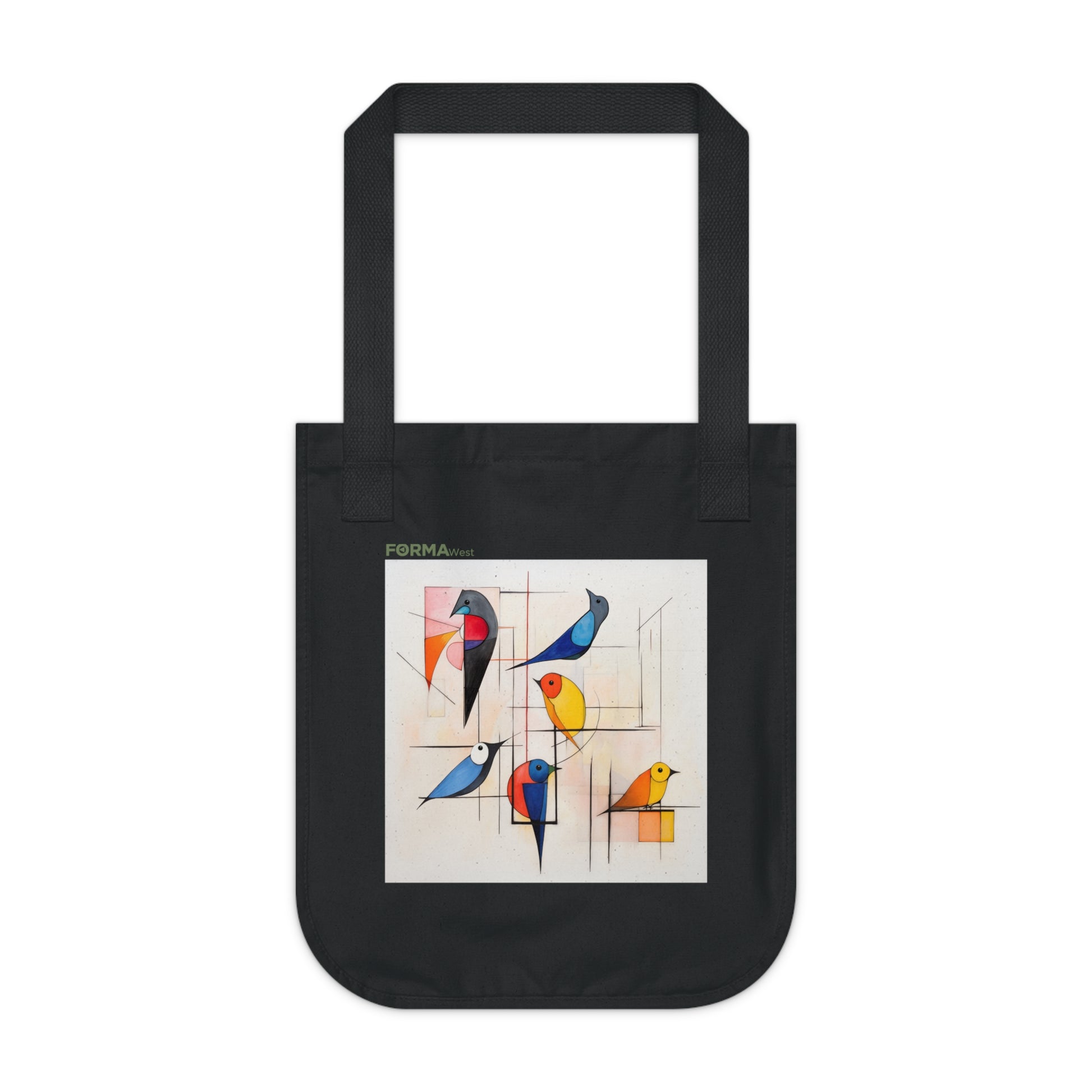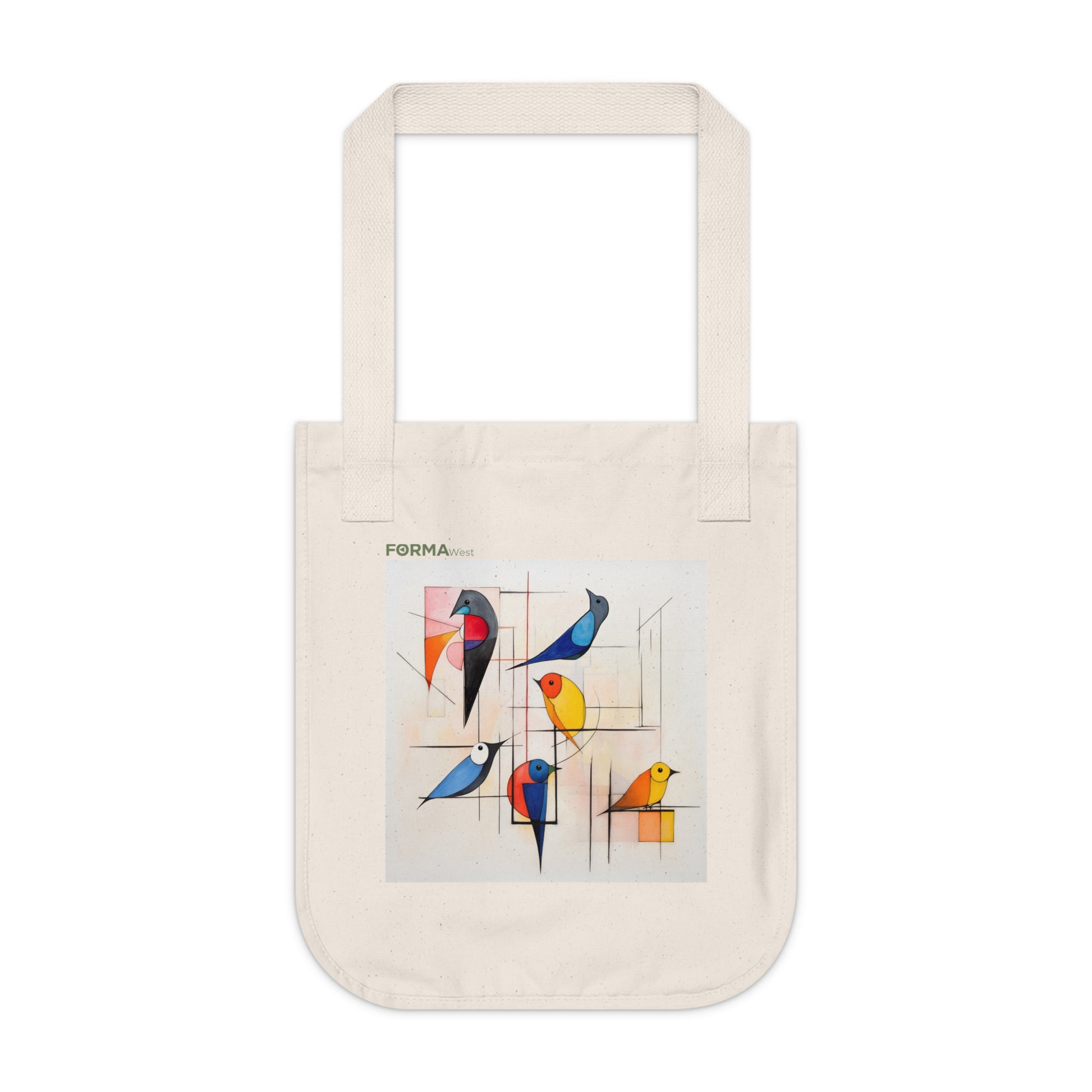 A soft, substantial organic cotton tote printed with a modern bird illustration — quiet, sunny, and built to be used every day. The medium-heavy canvas holds its shape while still folding for errands, markets, or studio runs. The graphic’s geometric birds add a touch of mid-century playfulness that brightens a shoulder or kitchen hook. Carried by artists, slow-living shoppers, and city walkers who prefer thoughtful materials, this tote turns daily tasks into a little ritual: load it, sling it on, and move through your day with color and calm.