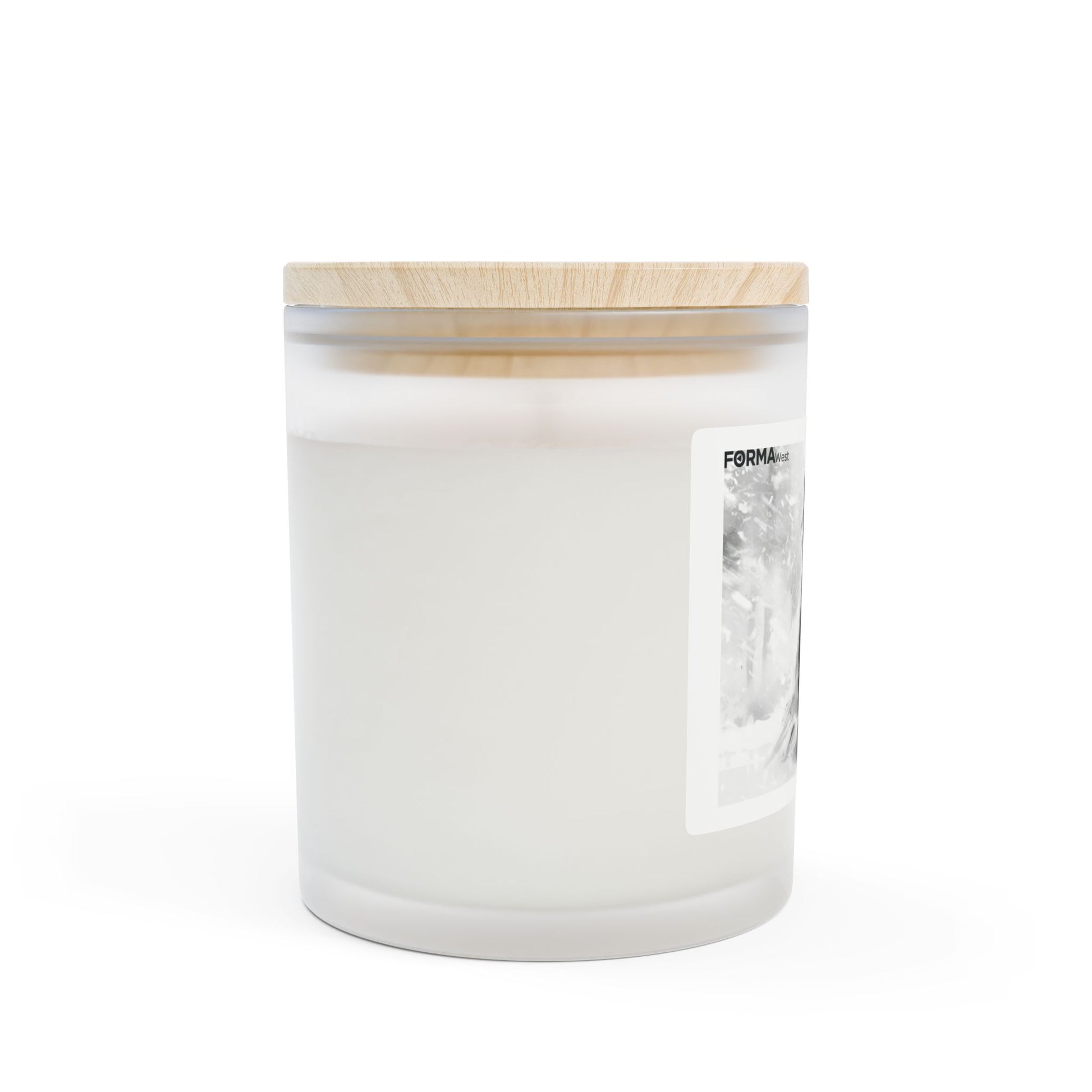- 11oz frosted glass vessel with raw maple lid, 9oz natural off-white wax