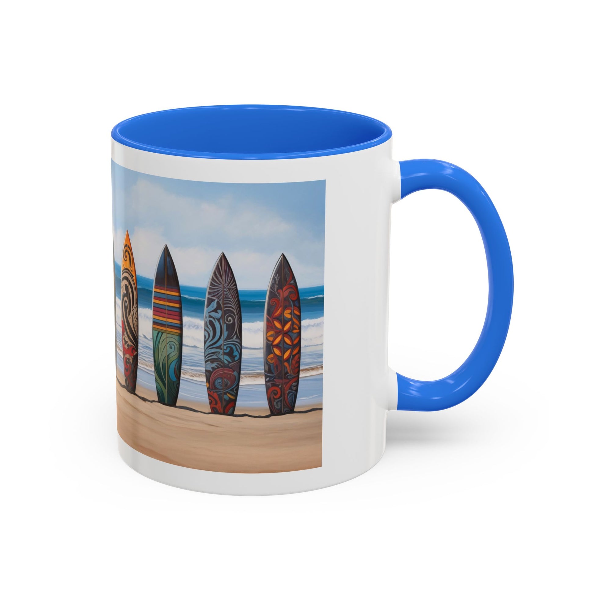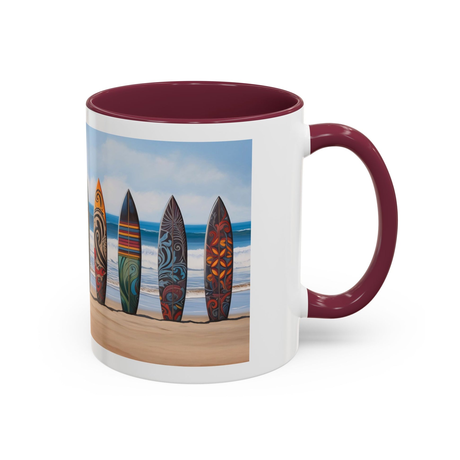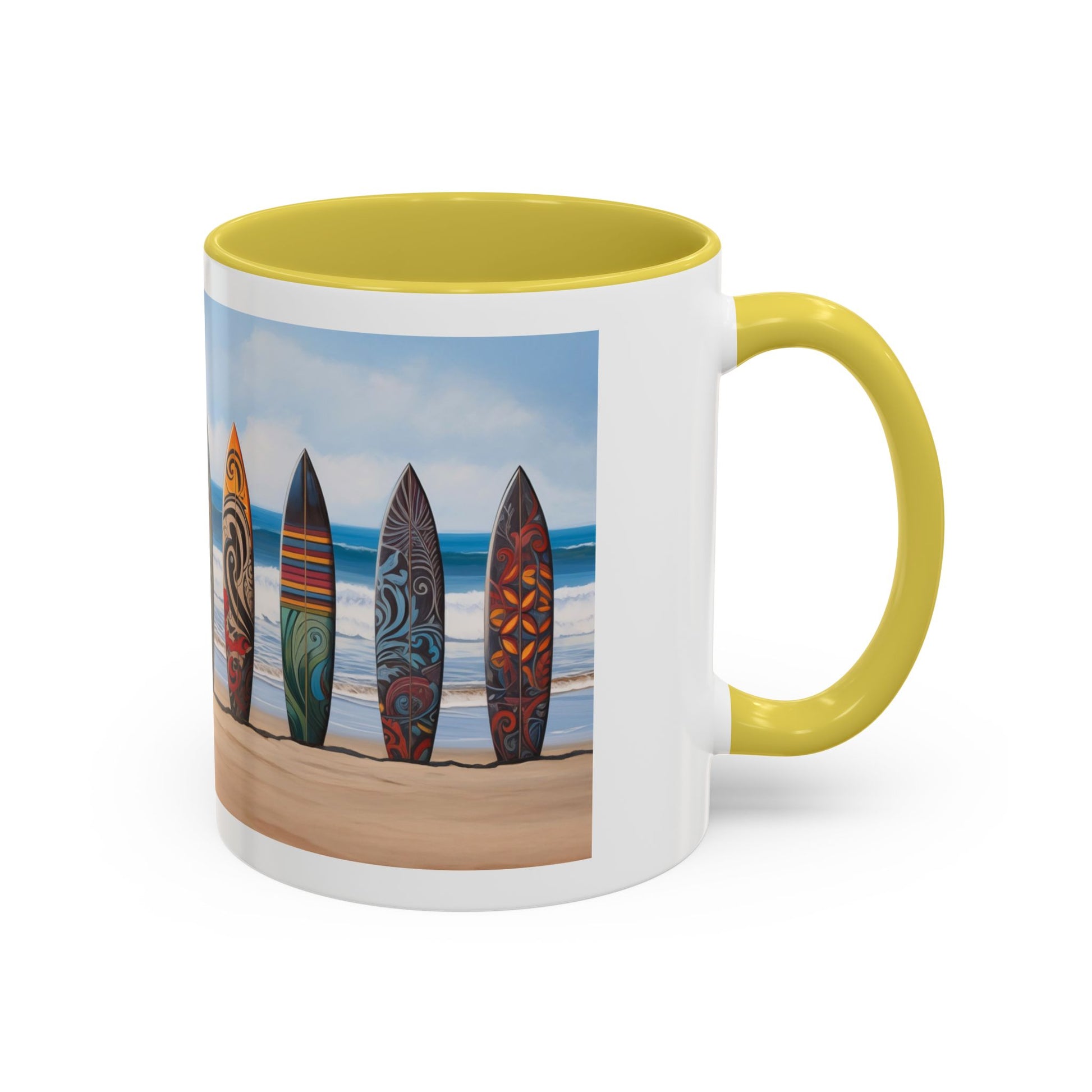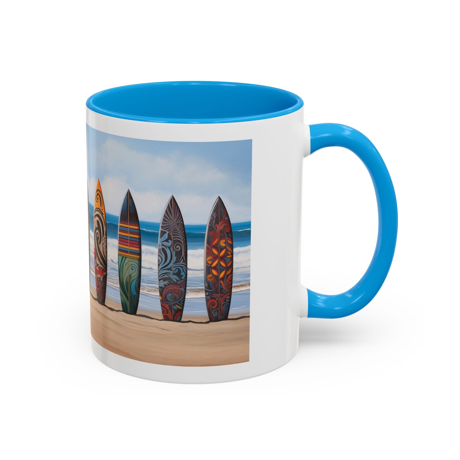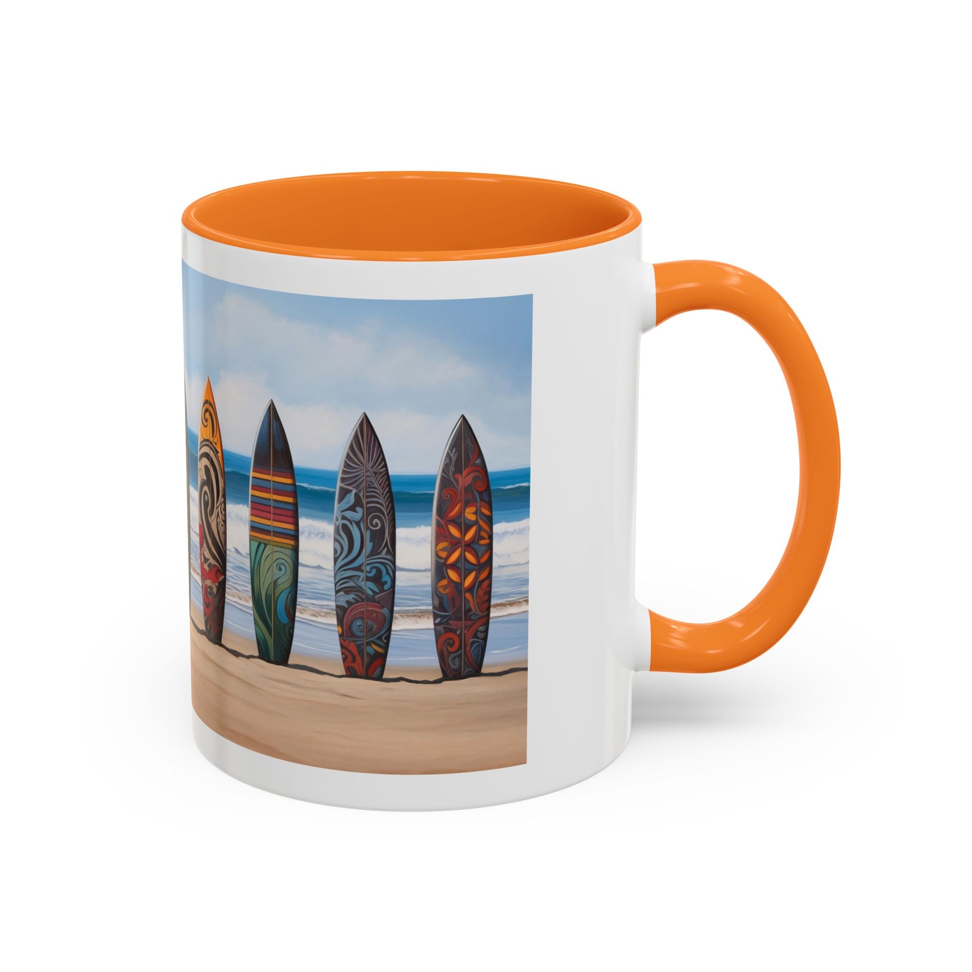 Bright surfboard art wraps this glossy ceramic mug in a sunlit, beachside mood. Each colorful board stands upright on warm sand with the ocean and sky behind — a small scene that brings coastal calm to morning coffee, late-night tea, or a quiet work break. The colored handle and interior add a playful accent that echoes the board tones. Lightweight to lift, sturdy to hold, and vivid enough to spark memories of shoreline mornings, this mug sits comfortably in a surf fan’s kitchen or on a desk as a cheerful reminder of salt air and summer lineups.