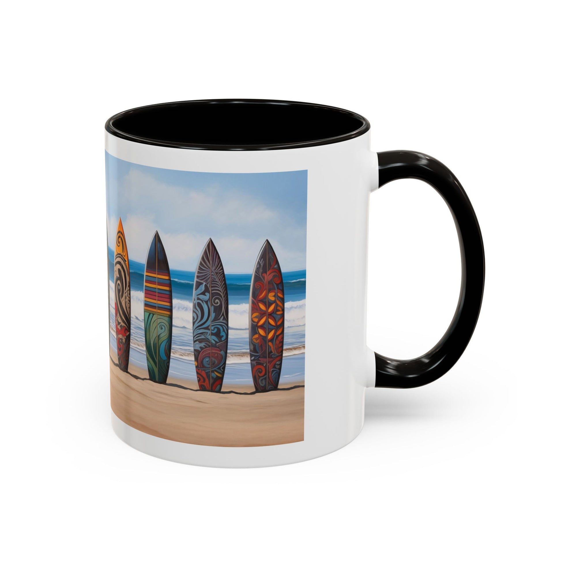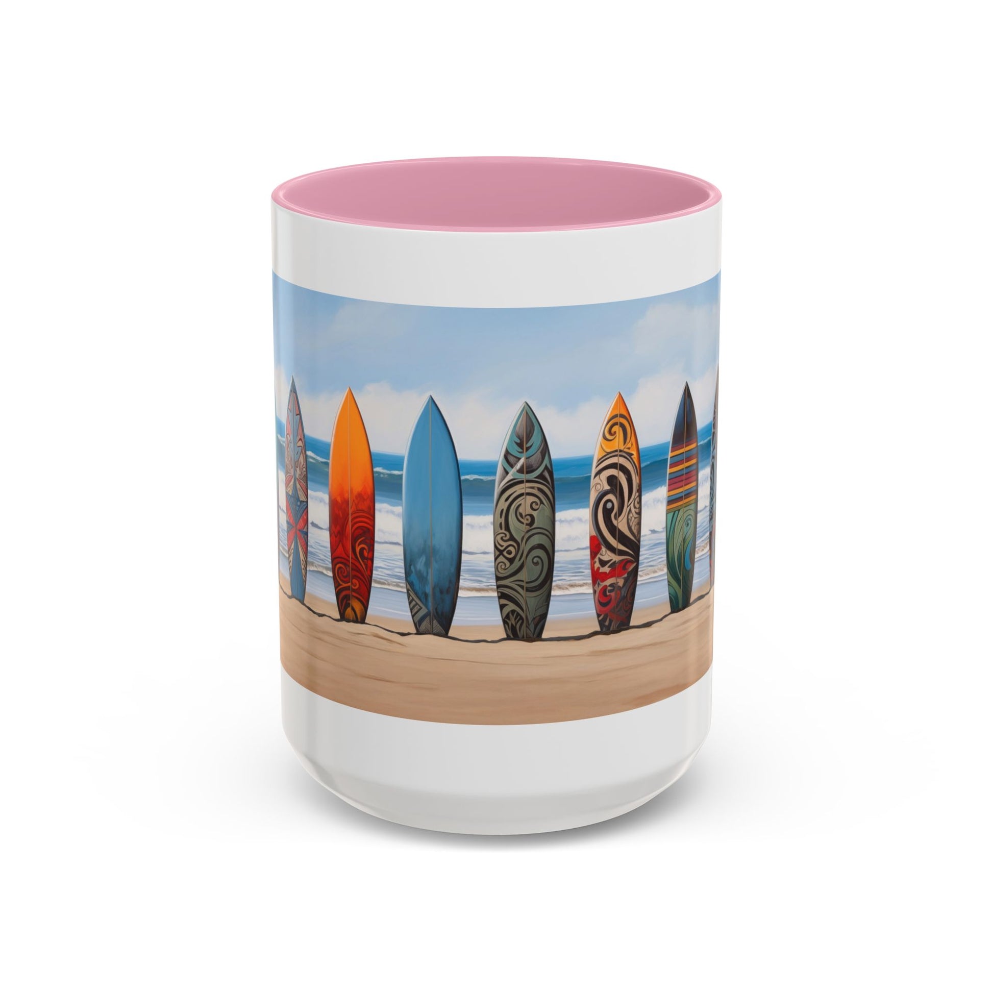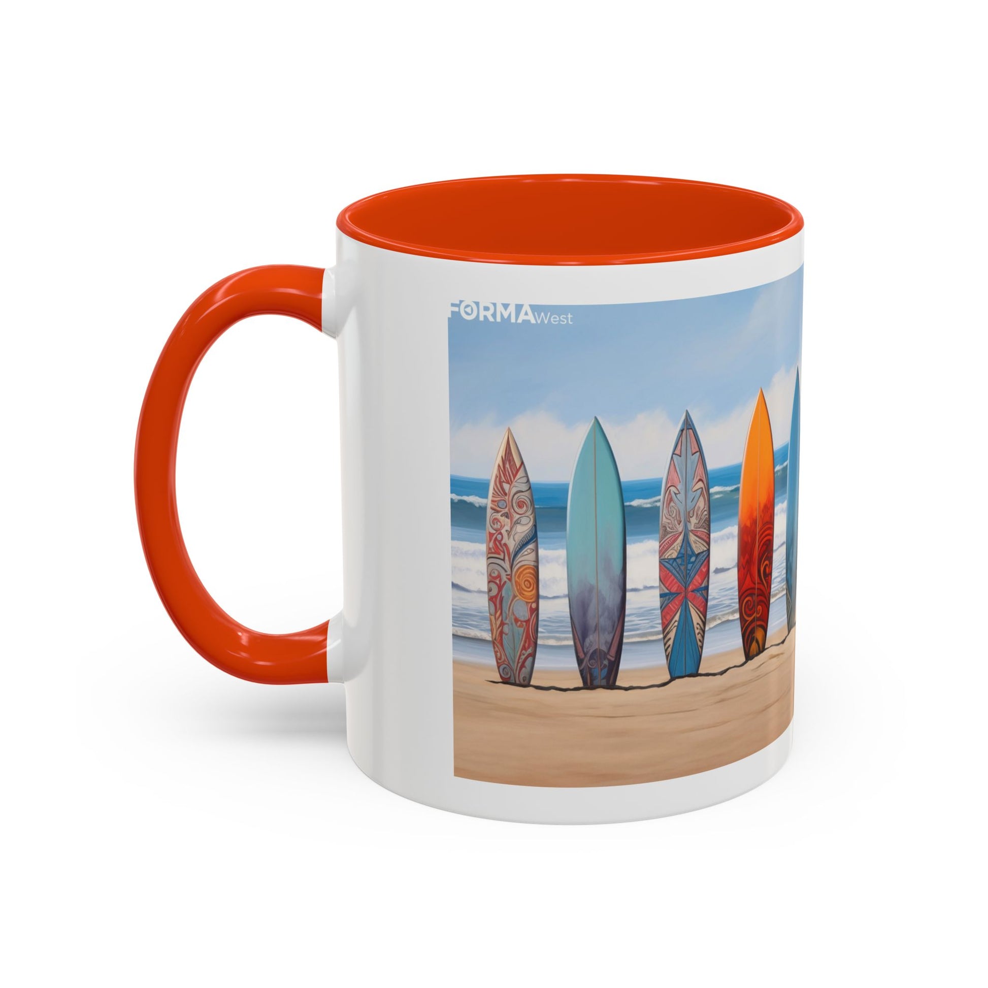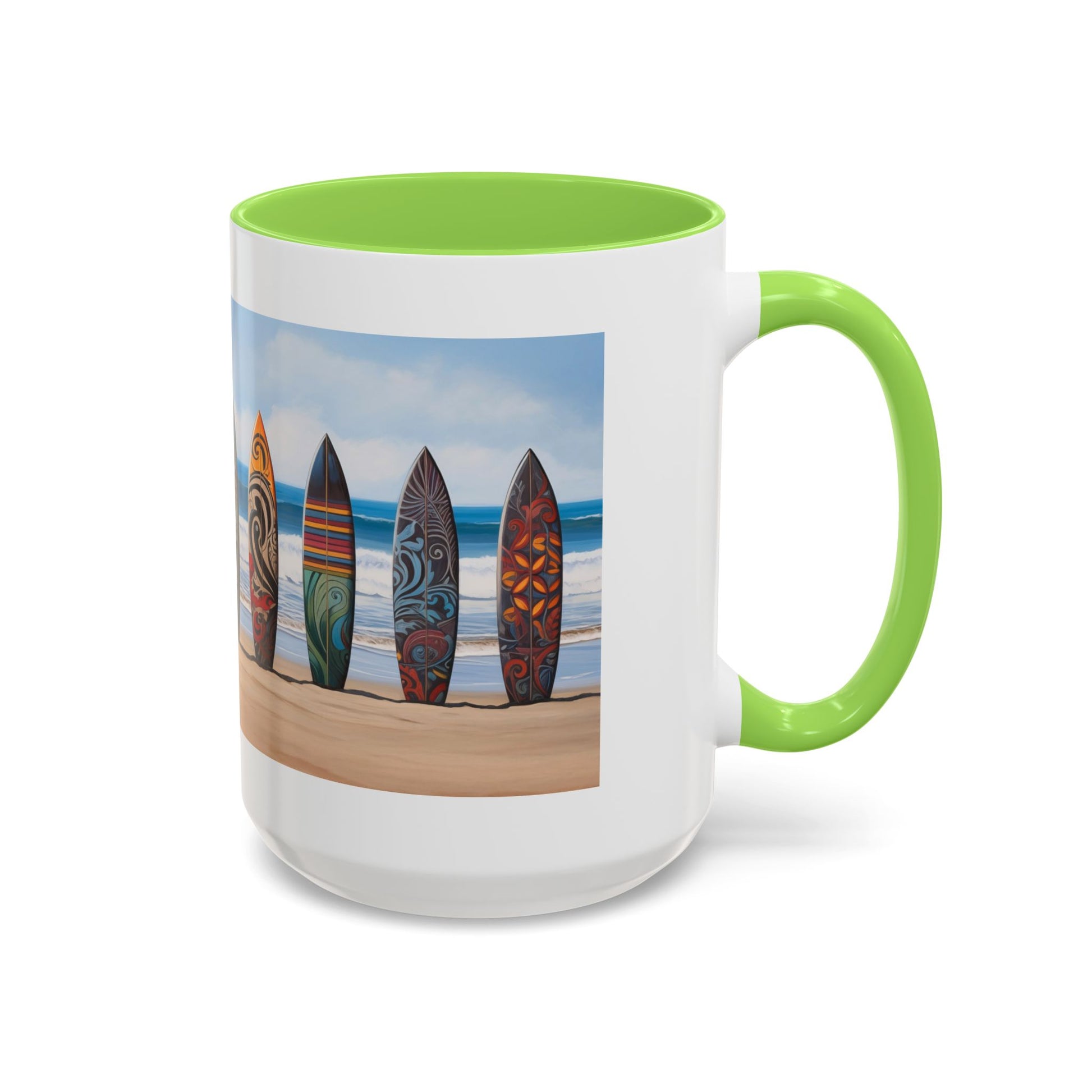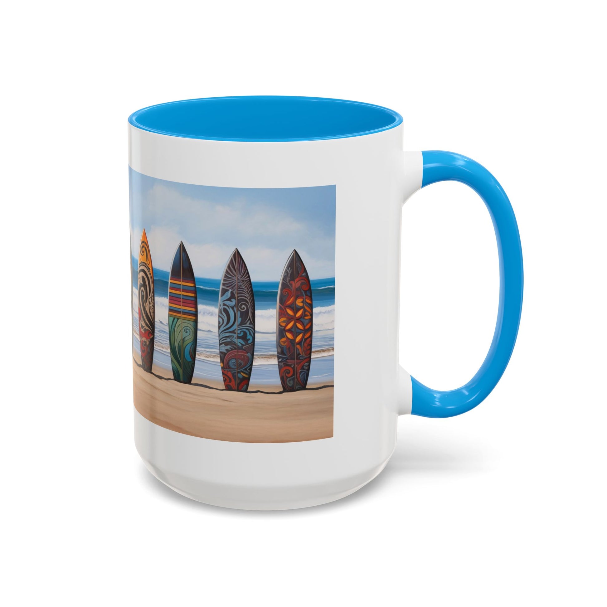 Bright surfboard art wraps this glossy ceramic mug in a sunlit, beachside mood. Each colorful board stands upright on warm sand with the ocean and sky behind — a small scene that brings coastal calm to morning coffee, late-night tea, or a quiet work break. The colored handle and interior add a playful accent that echoes the board tones. Lightweight to lift, sturdy to hold, and vivid enough to spark memories of shoreline mornings, this mug sits comfortably in a surf fan’s kitchen or on a desk as a cheerful reminder of salt air and summer lineups.