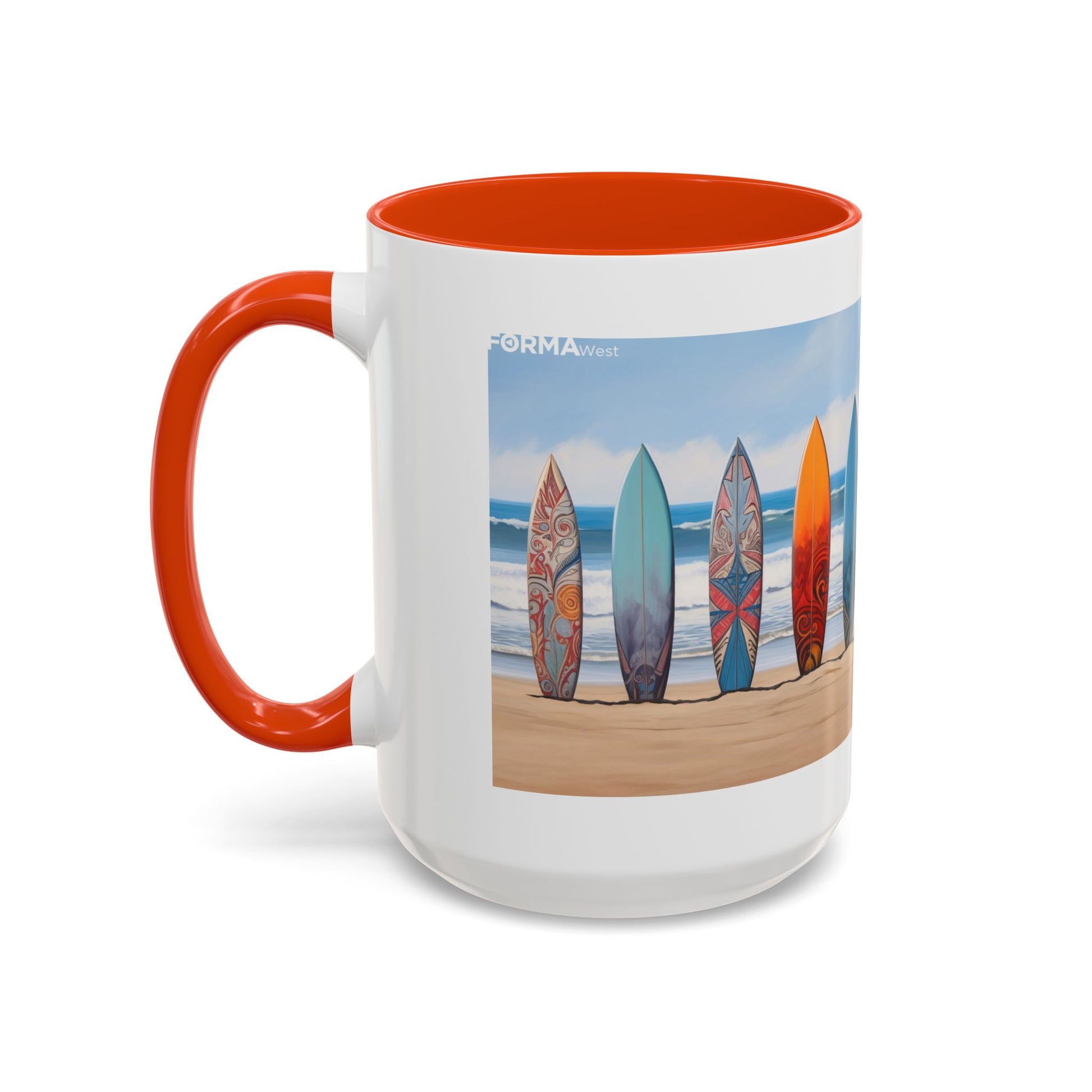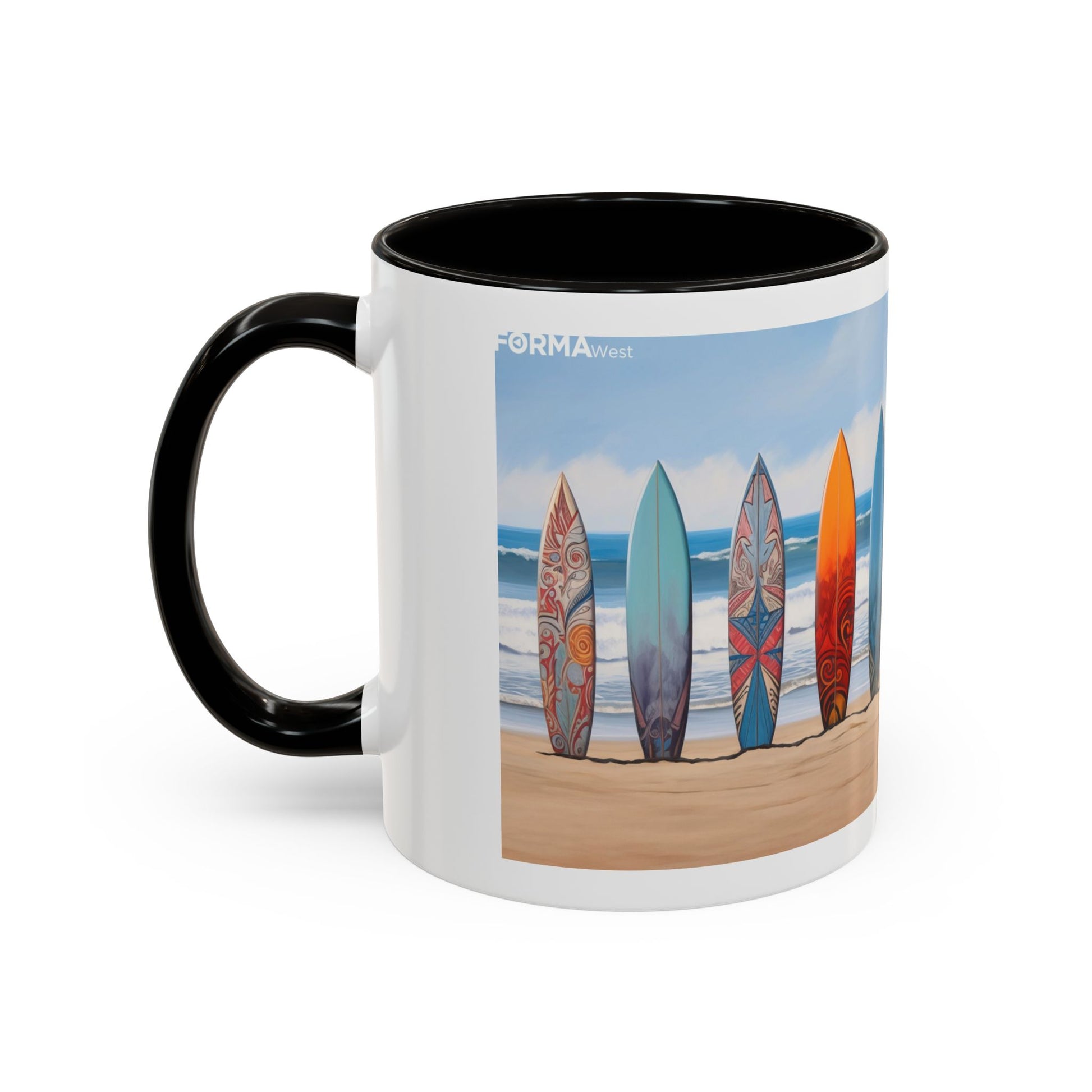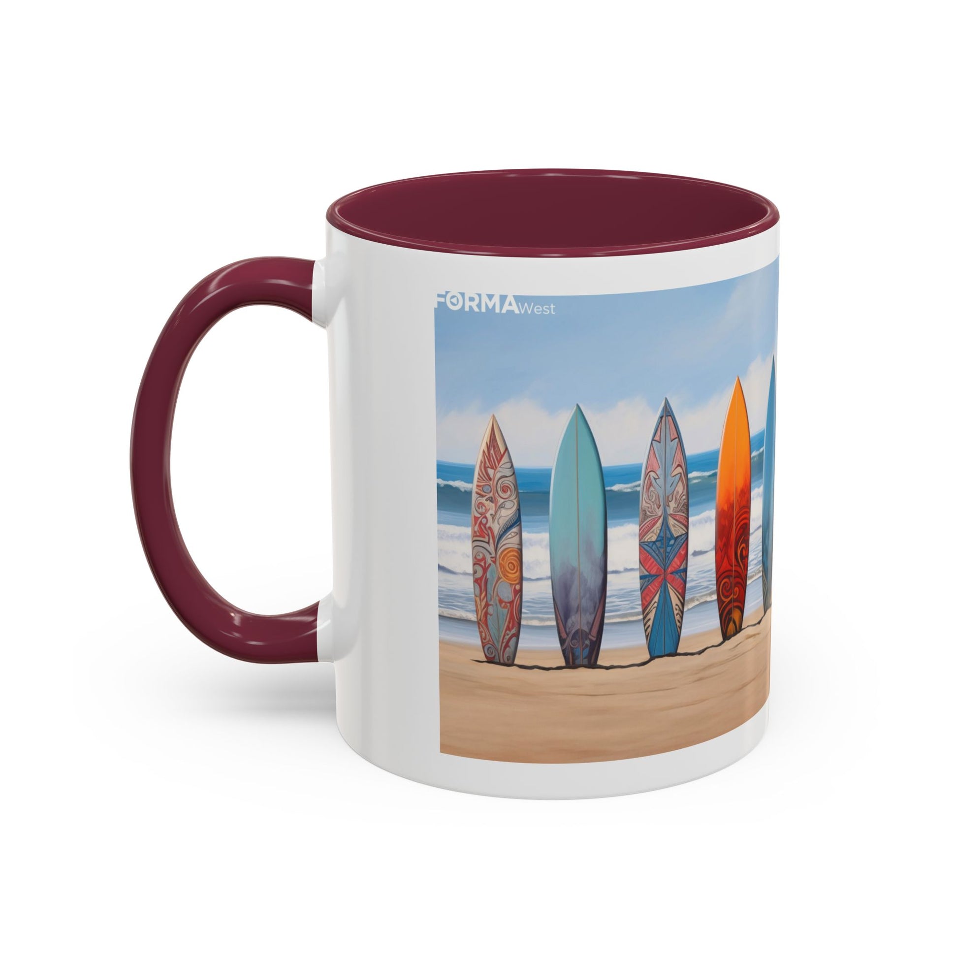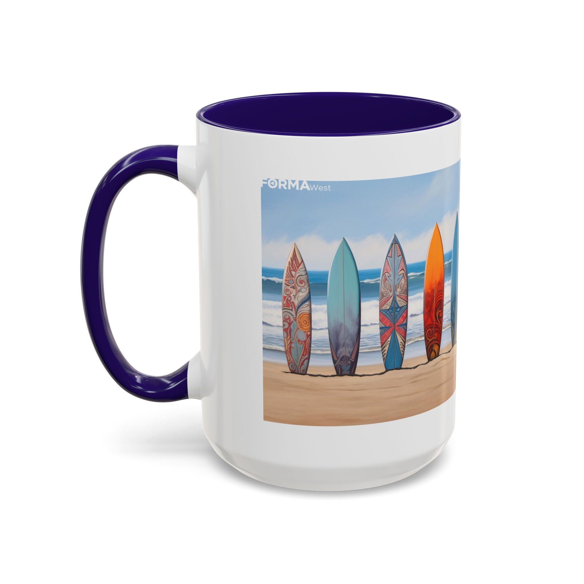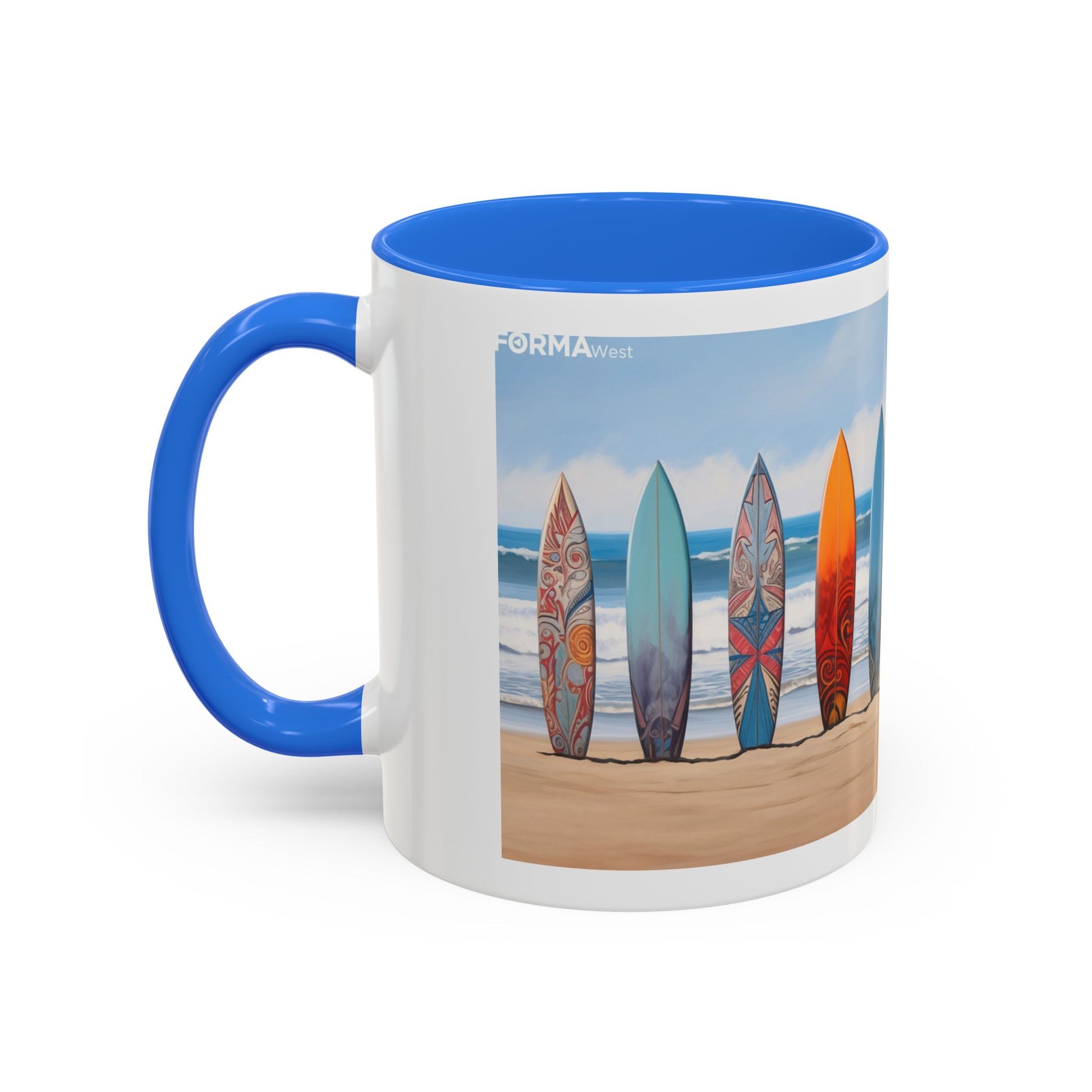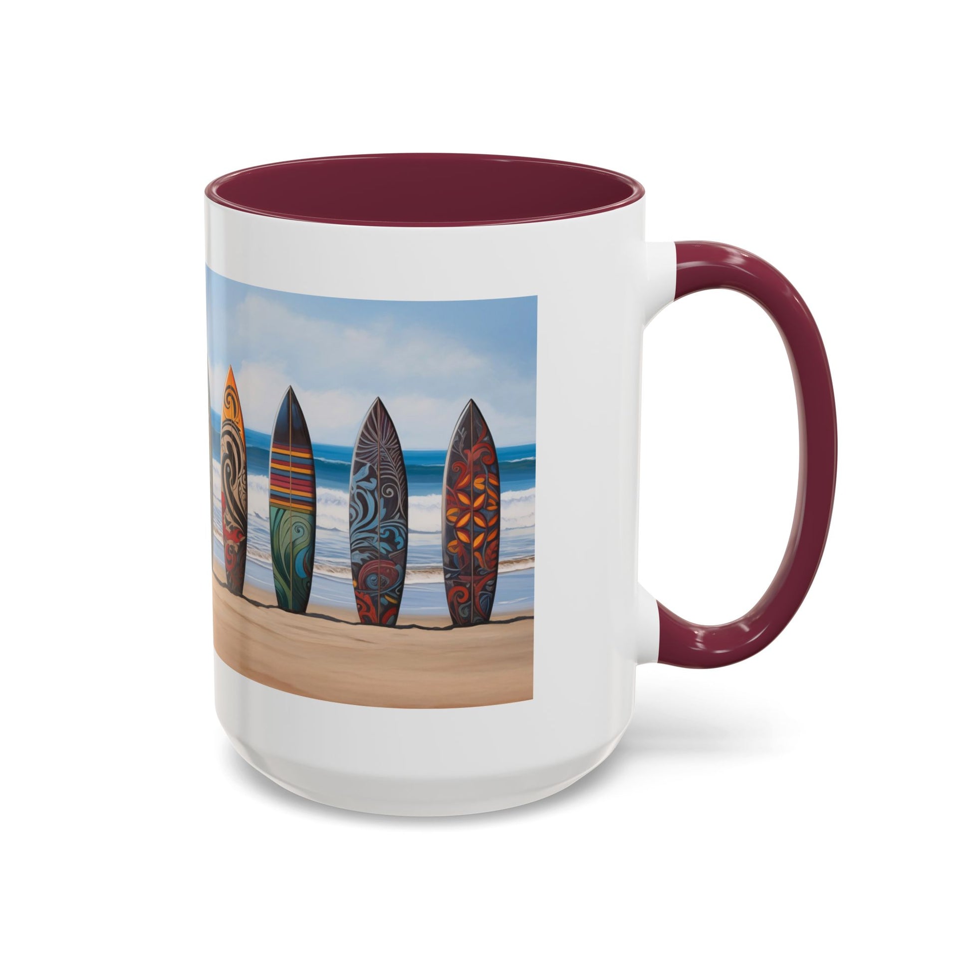 Bright surfboard art wraps this glossy ceramic mug in a sunlit, beachside mood. Each colorful board stands upright on warm sand with the ocean and sky behind — a small scene that brings coastal calm to morning coffee, late-night tea, or a quiet work break. The colored handle and interior add a playful accent that echoes the board tones. Lightweight to lift, sturdy to hold, and vivid enough to spark memories of shoreline mornings, this mug sits comfortably in a surf fan’s kitchen or on a desk as a cheerful reminder of salt air and summer lineups.
