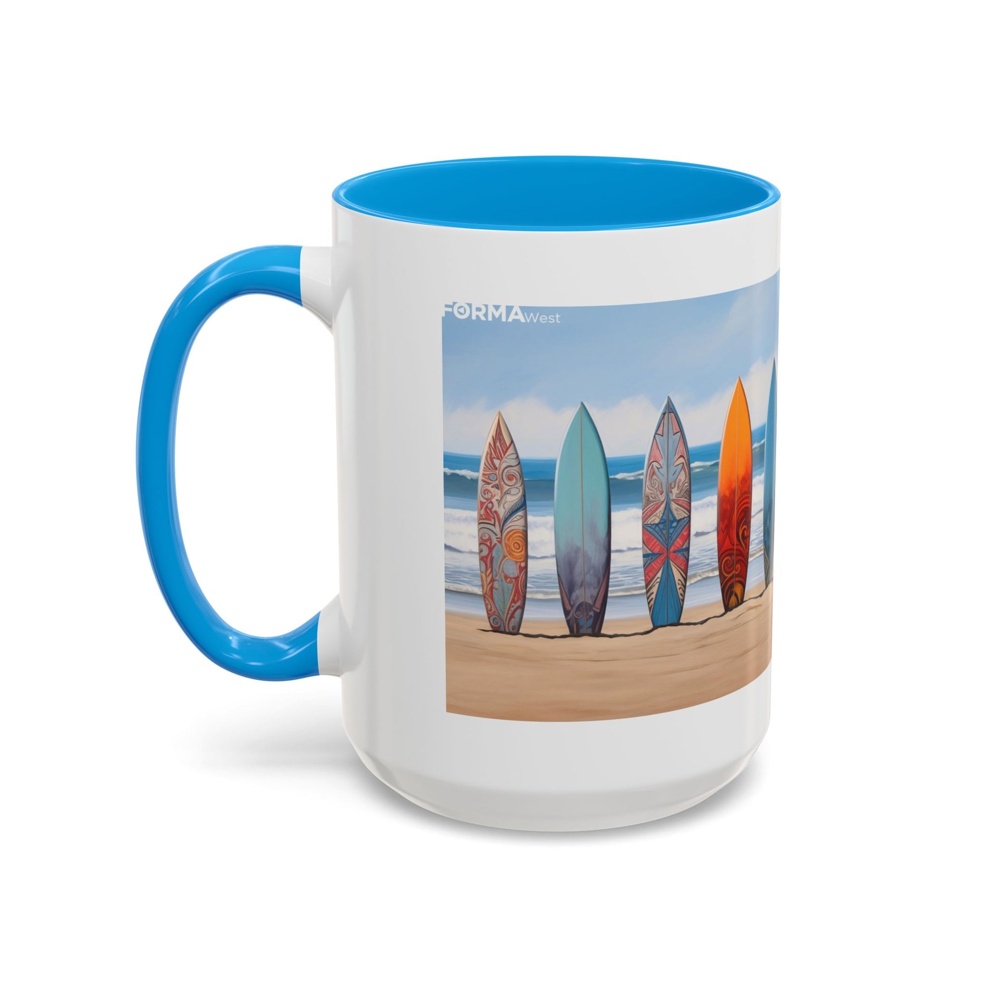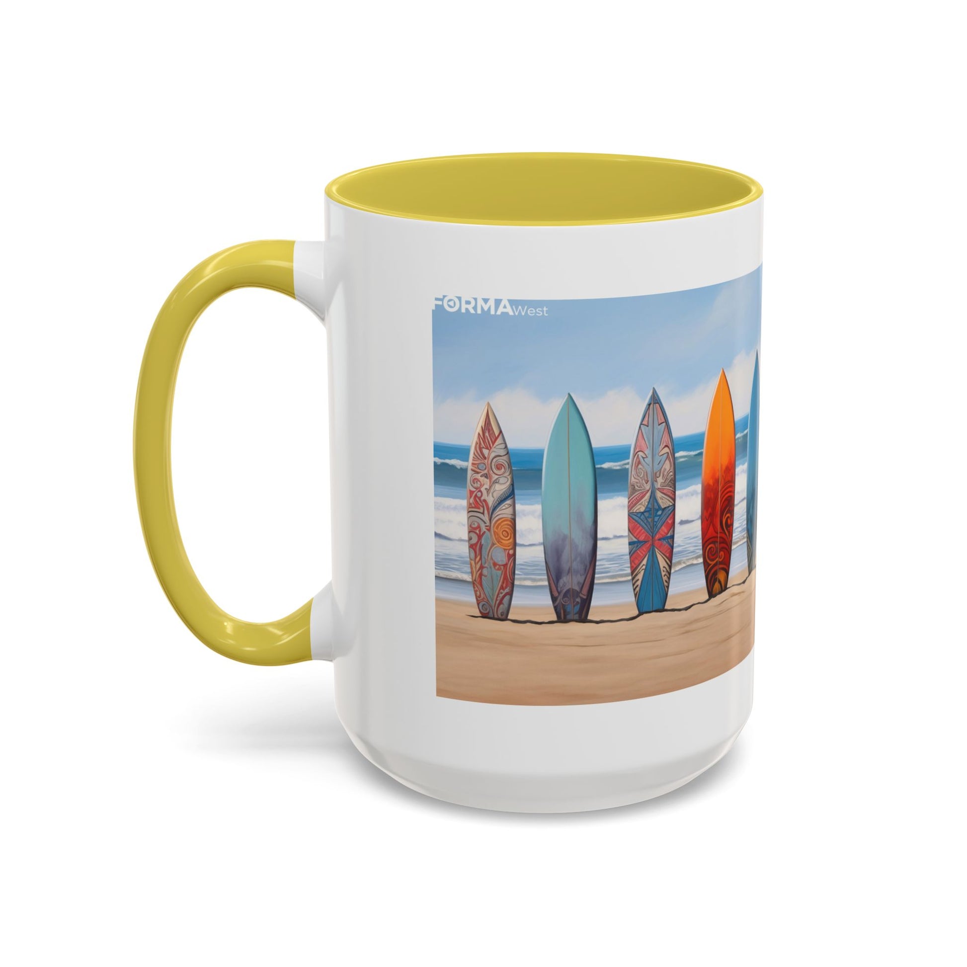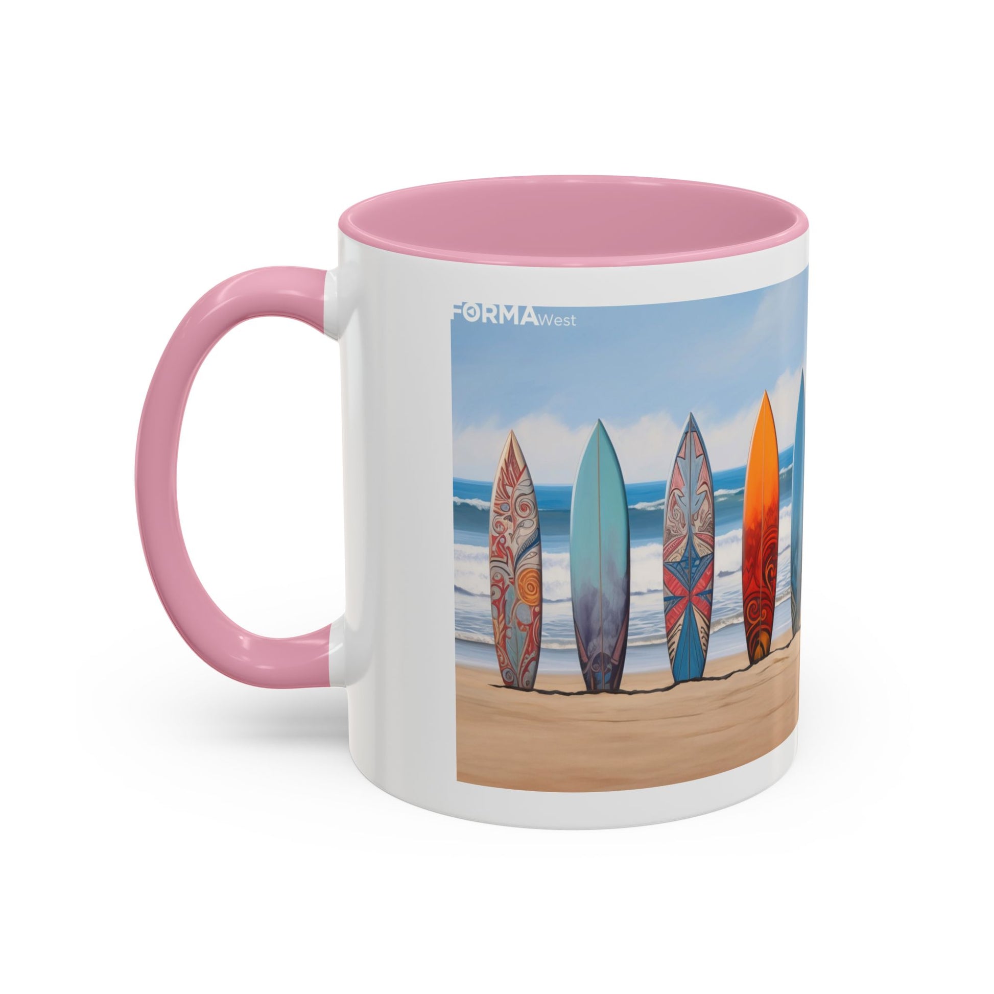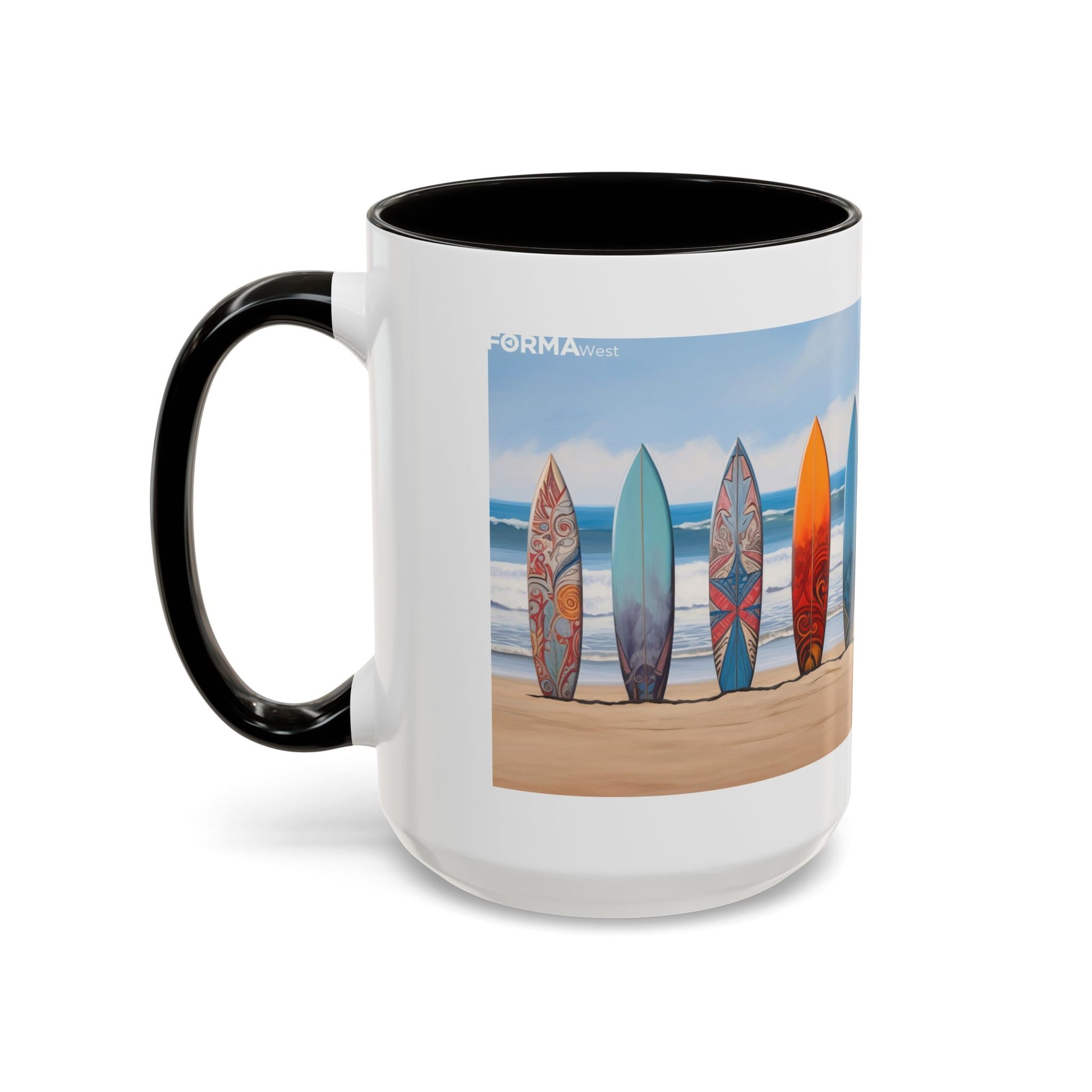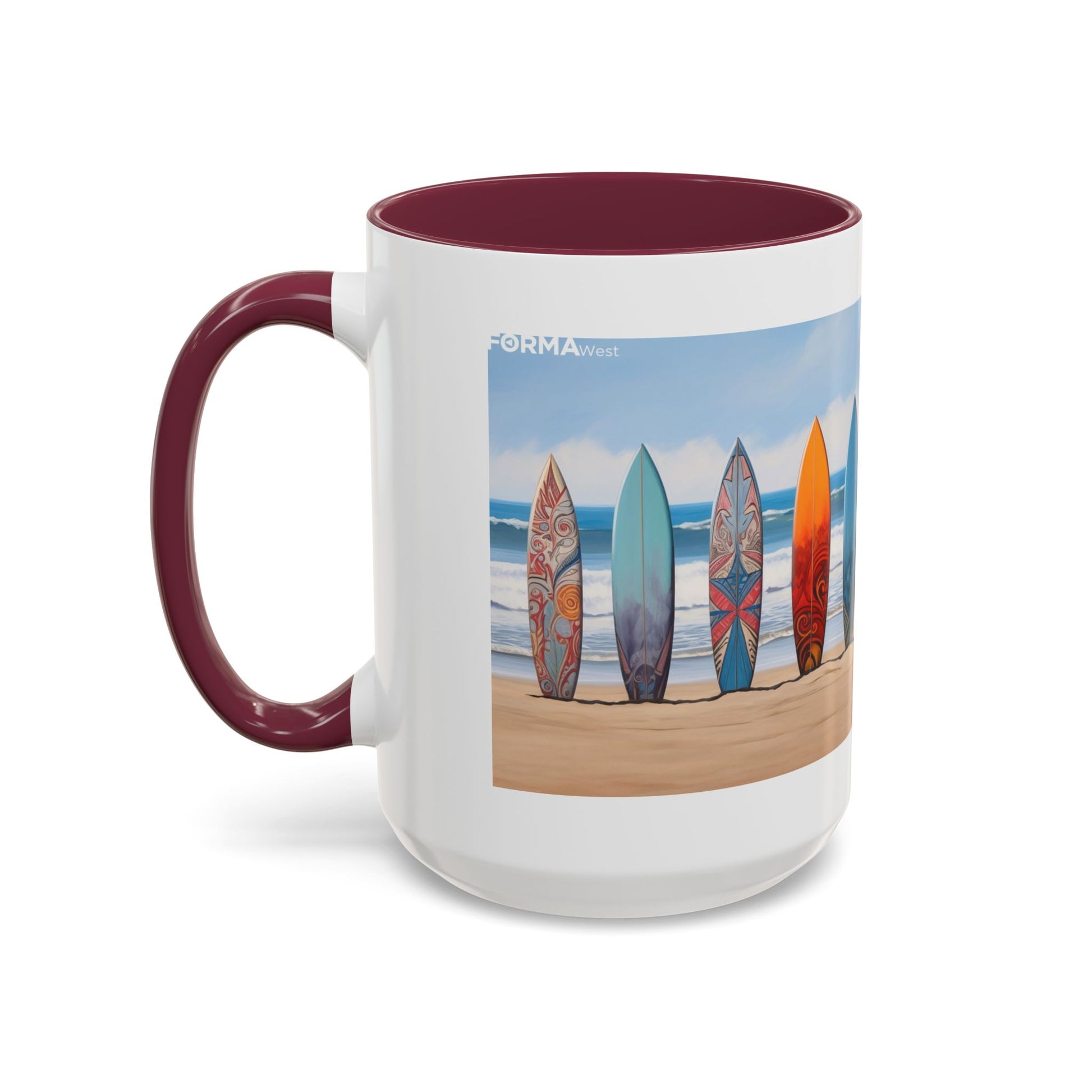 Bright surfboard art wraps this glossy ceramic mug in a sunlit, beachside mood. Each colorful board stands upright on warm sand with the ocean and sky behind — a small scene that brings coastal calm to morning coffee, late-night tea, or a quiet work break. The colored handle and interior add a playful accent that echoes the board tones. Lightweight to lift, sturdy to hold, and vivid enough to spark memories of shoreline mornings, this mug sits comfortably in a surf fan’s kitchen or on a desk as a cheerful reminder of salt air and summer lineups.