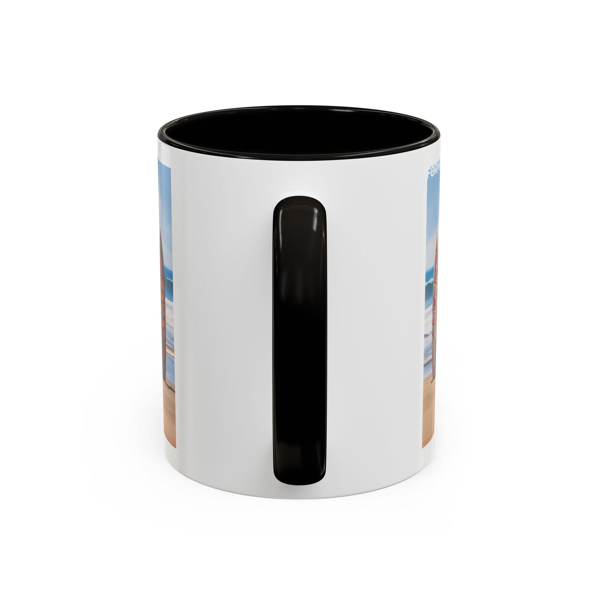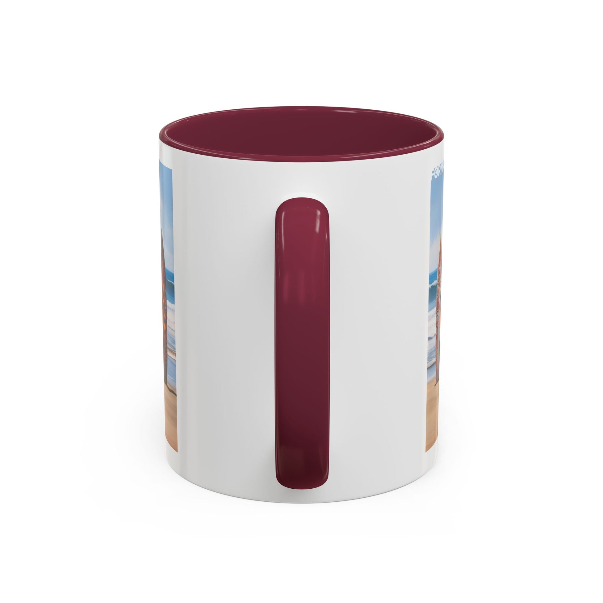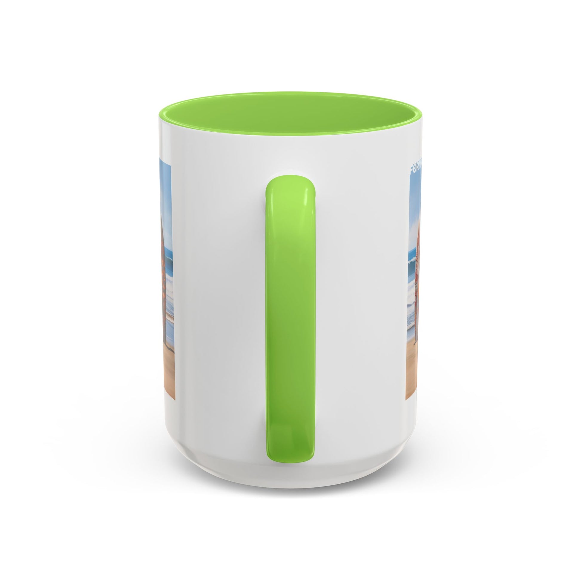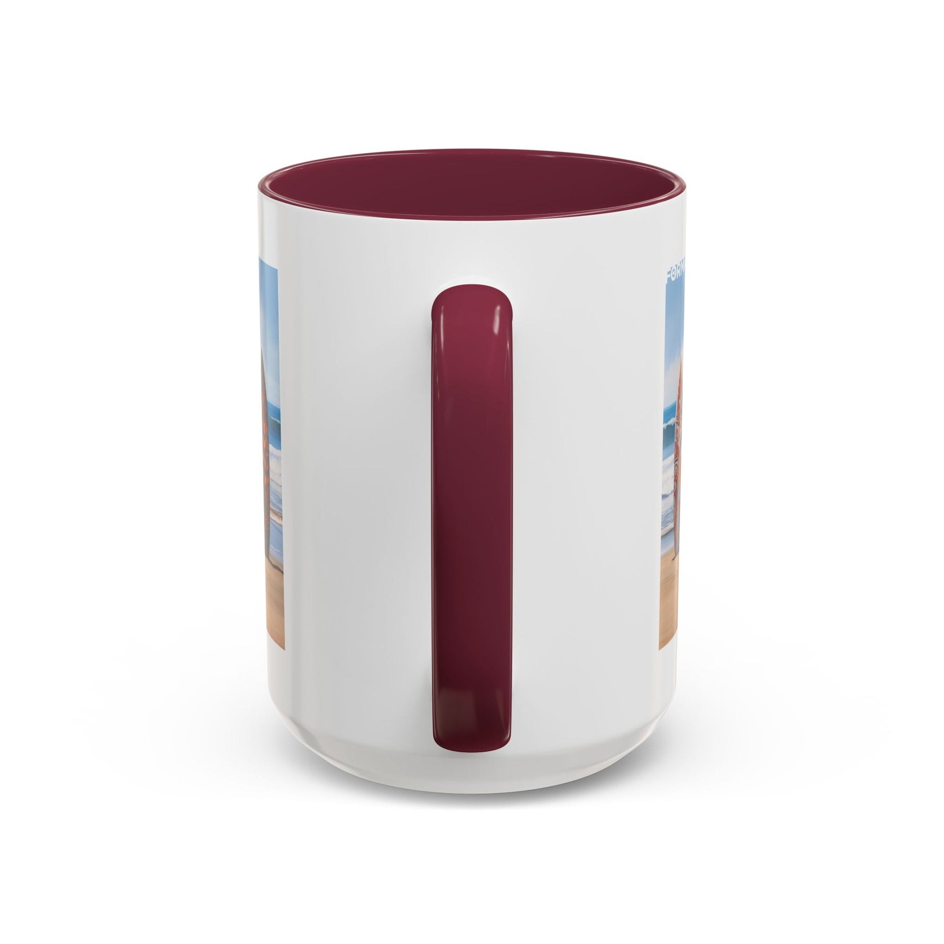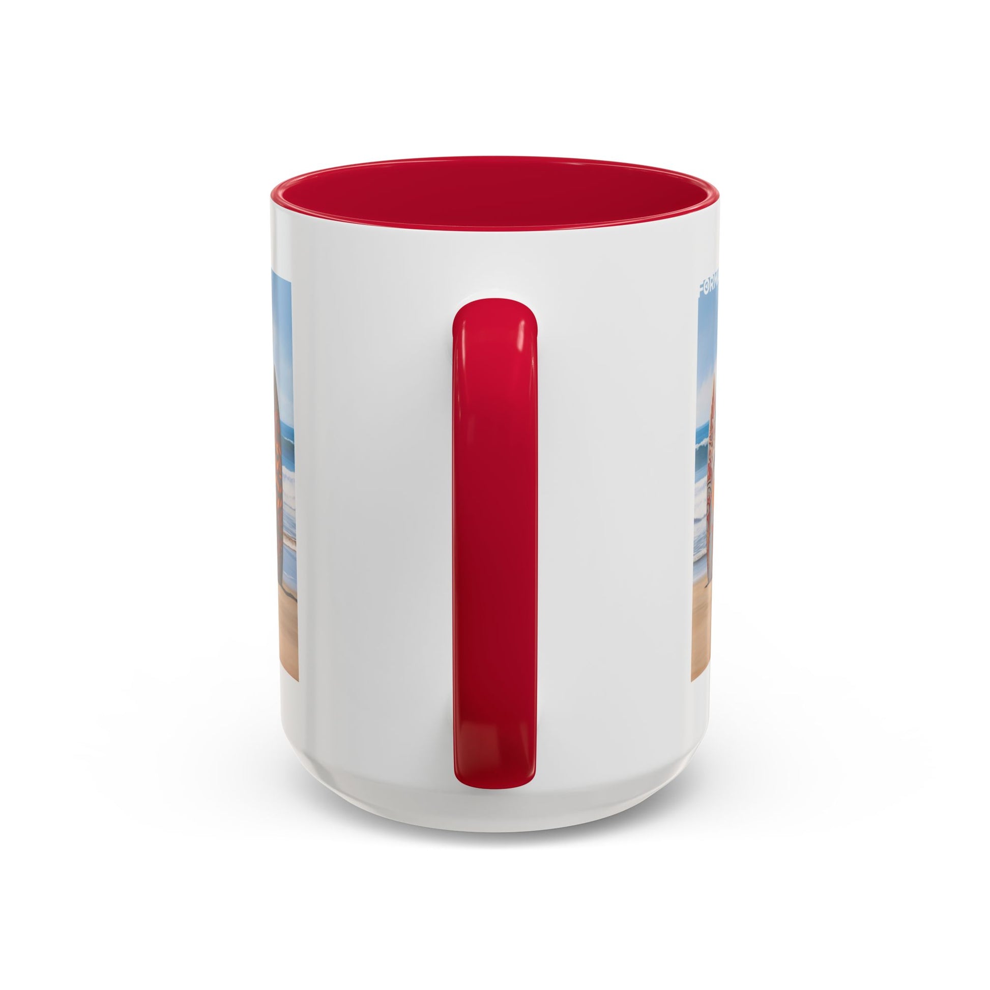 Bright surfboard art wraps this glossy ceramic mug in a sunlit, beachside mood. Each colorful board stands upright on warm sand with the ocean and sky behind — a small scene that brings coastal calm to morning coffee, late-night tea, or a quiet work break. The colored handle and interior add a playful accent that echoes the board tones. Lightweight to lift, sturdy to hold, and vivid enough to spark memories of shoreline mornings, this mug sits comfortably in a surf fan’s kitchen or on a desk as a cheerful reminder of salt air and summer lineups.