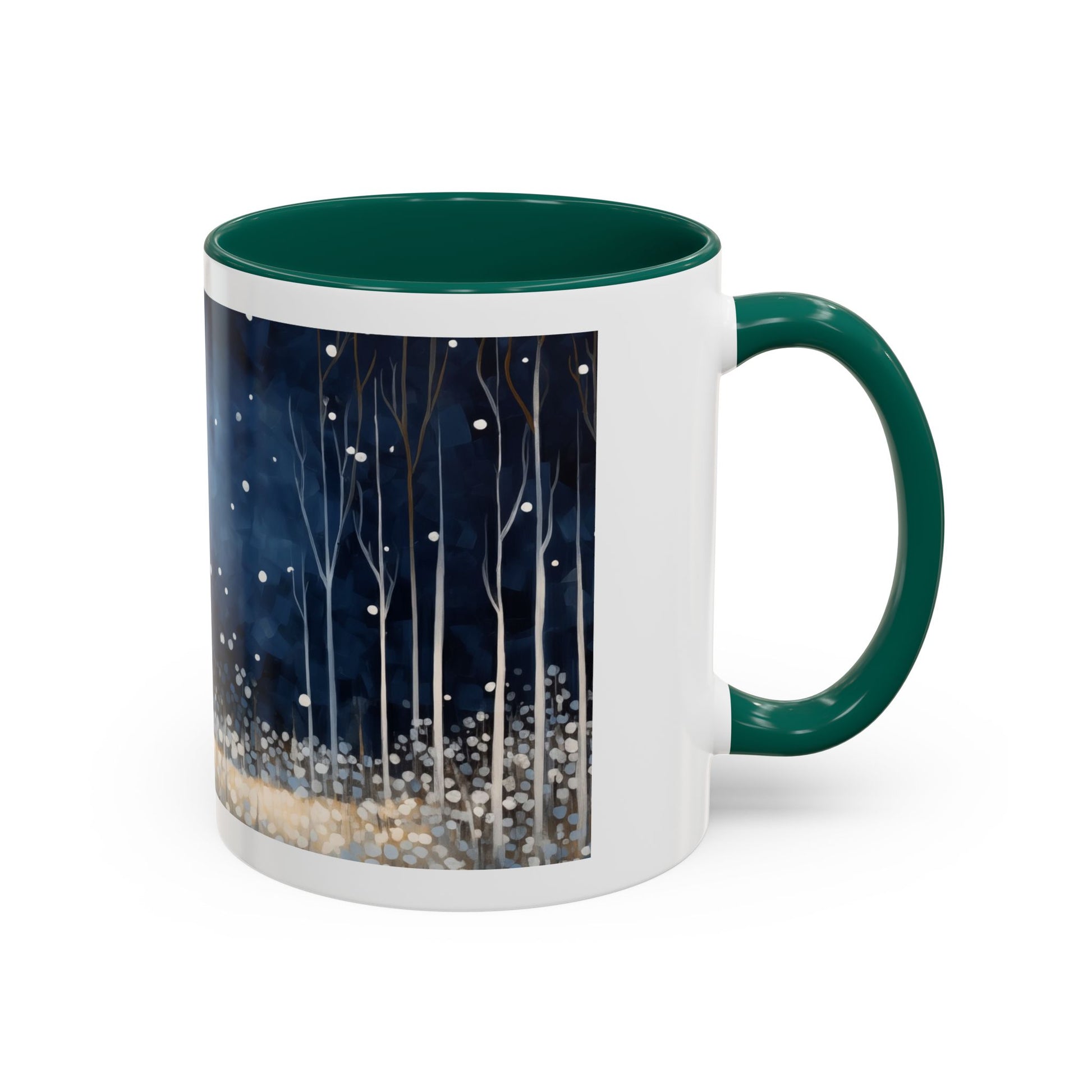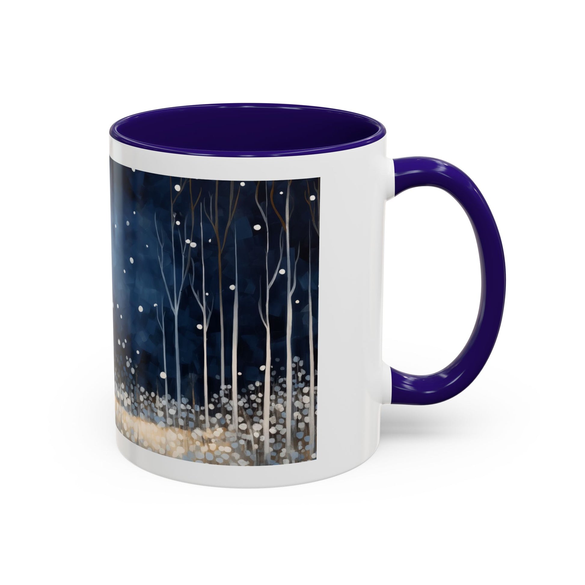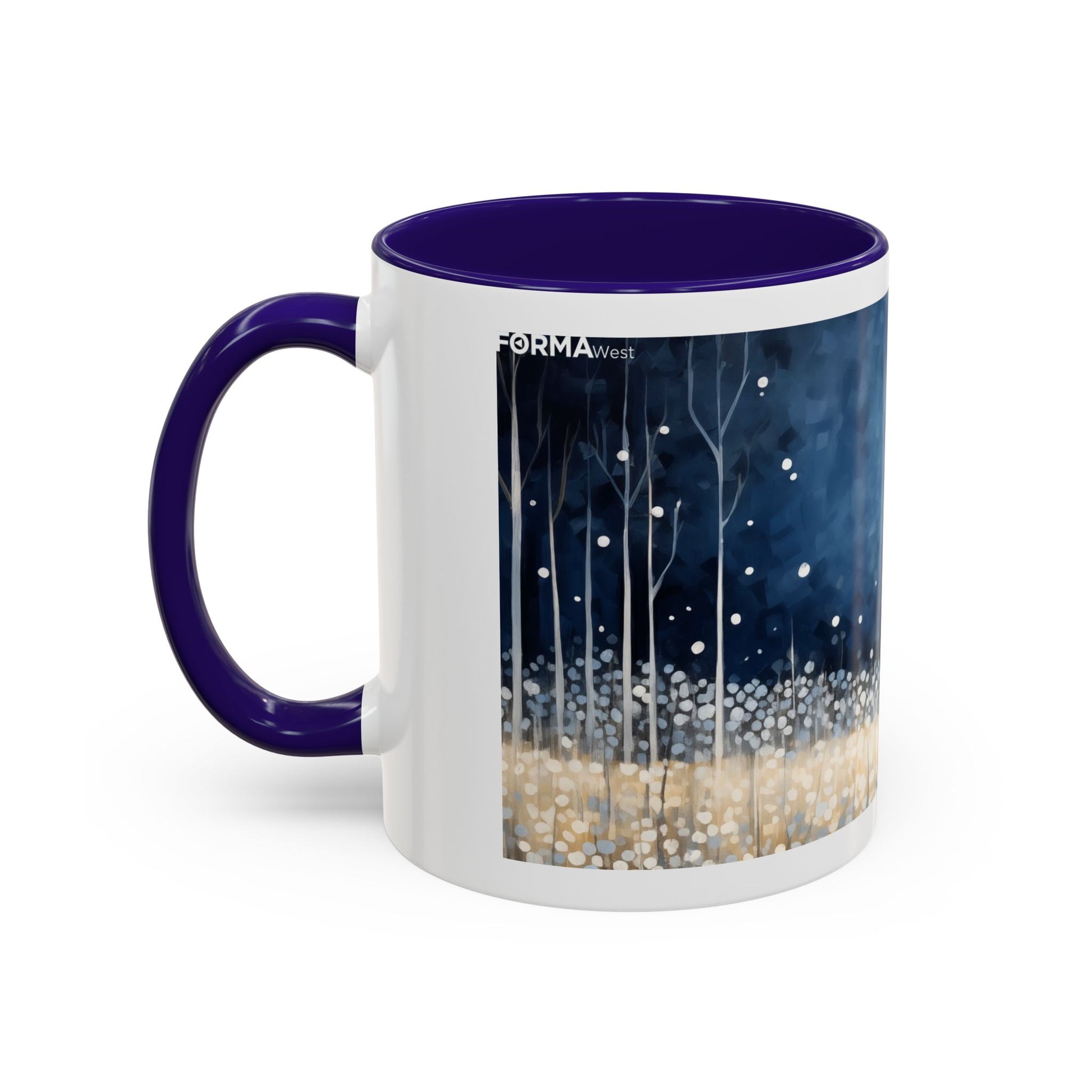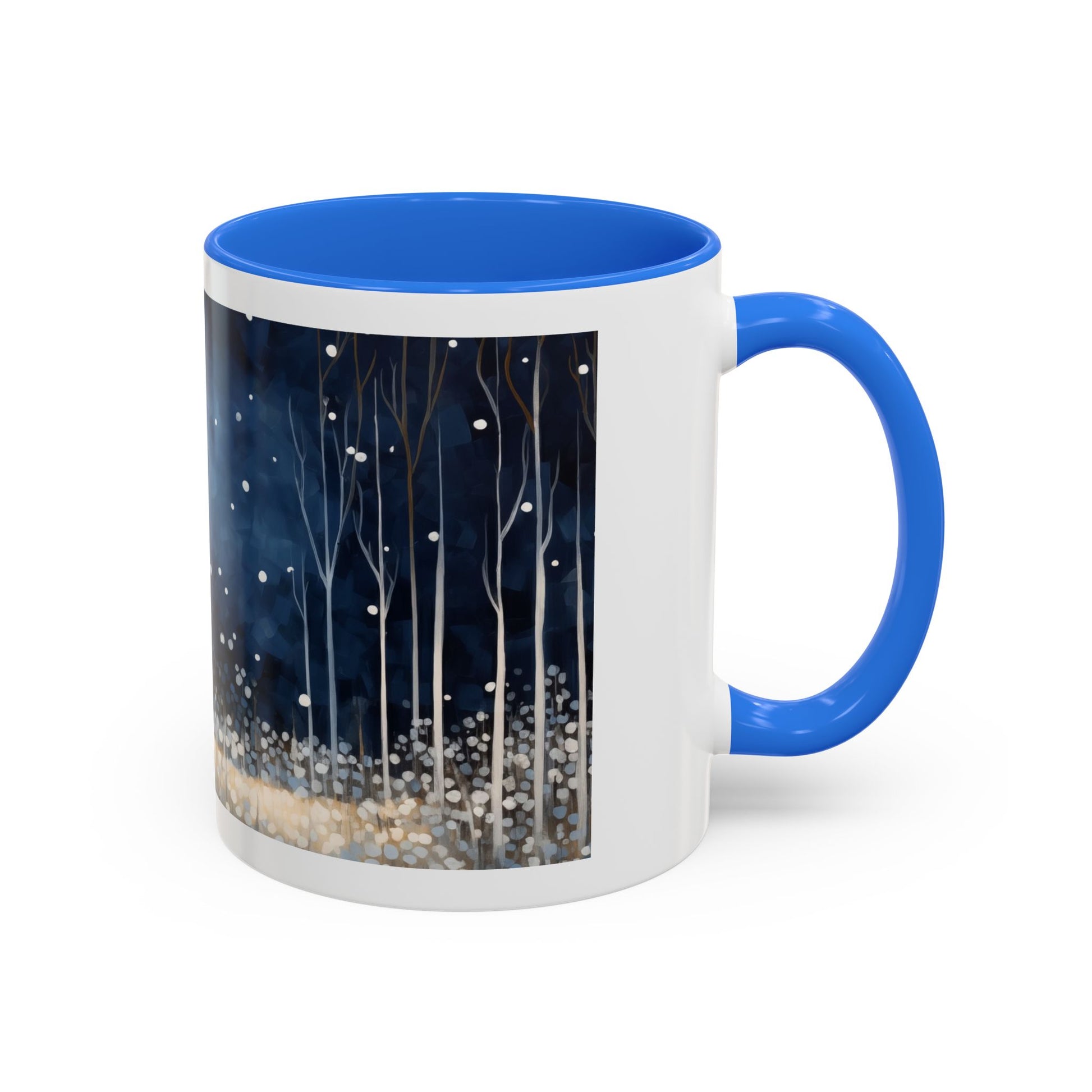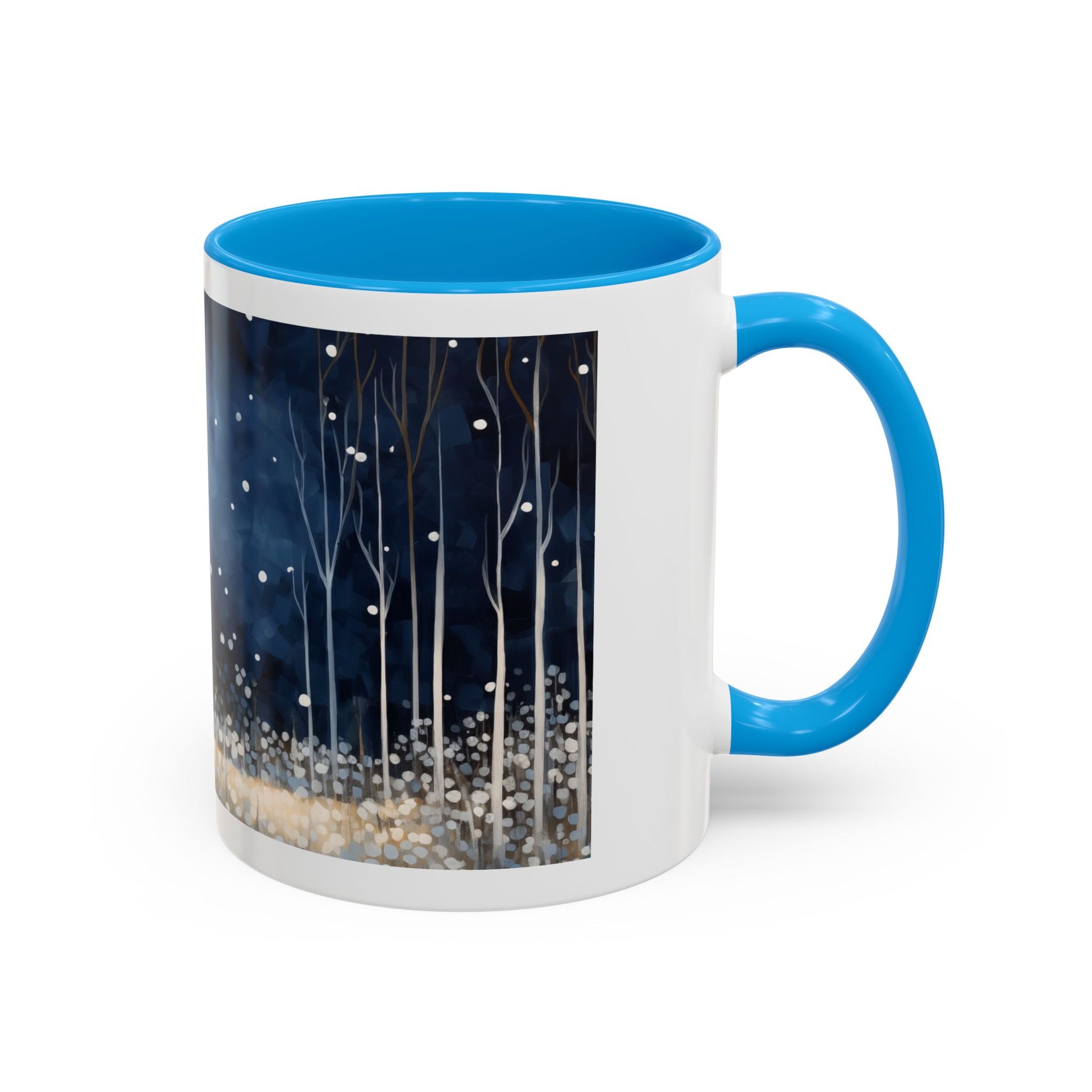 This glossy ceramic mug brings a quiet, starry forest to your mornings. Deep indigo blues melt into soft, misty light above a field of fine, shimmering flecks that read like falling snow or fireflies. Thin, pale trunks stand like sentinels across the scene, giving the design a calm, contemplative rhythm. The colored handle and interior add a subtle pop that ties into your kitchen or workspace. Reach for this mug when you want a slow, thoughtful moment with your coffee or tea — the kind of cup that feels like a pause in a busy day.