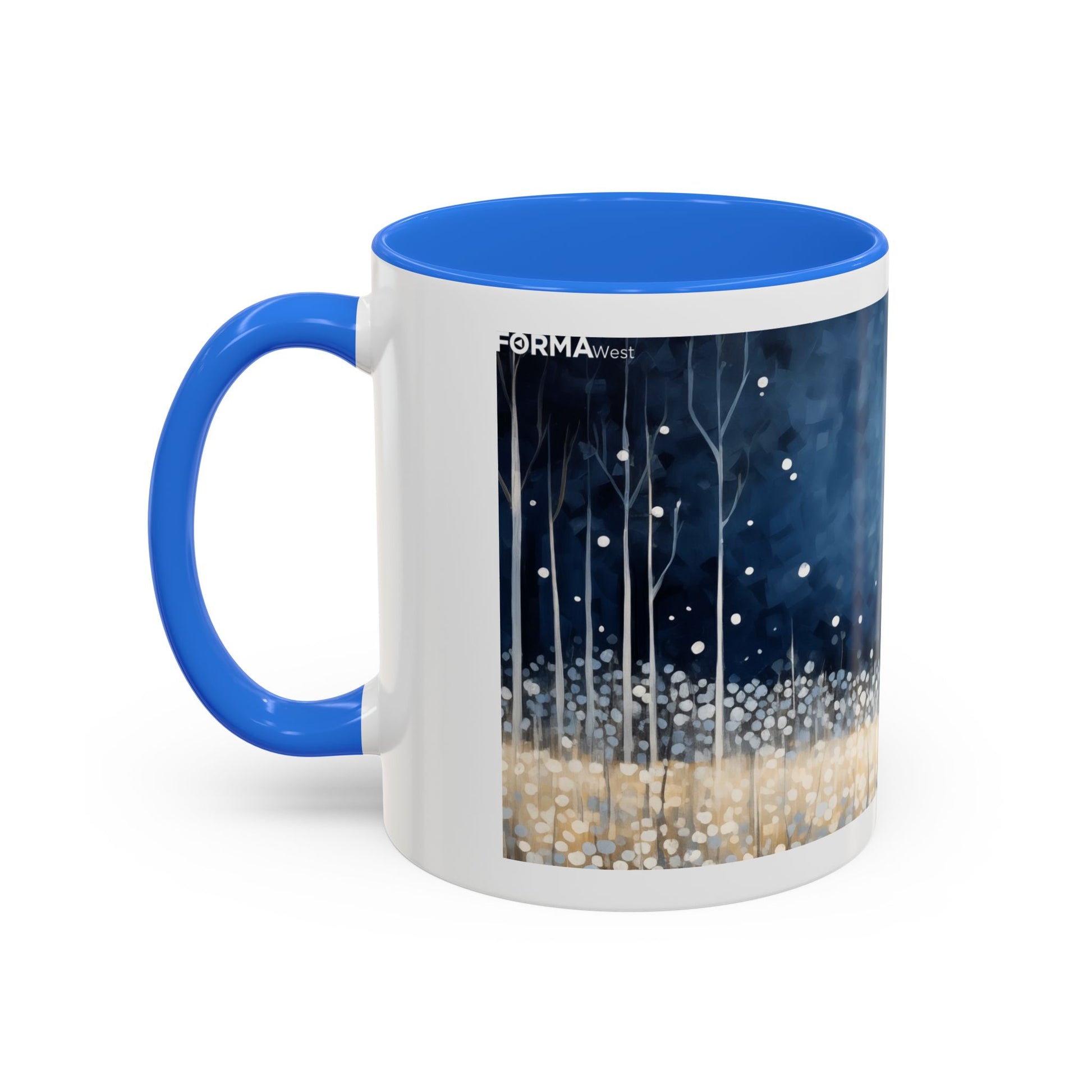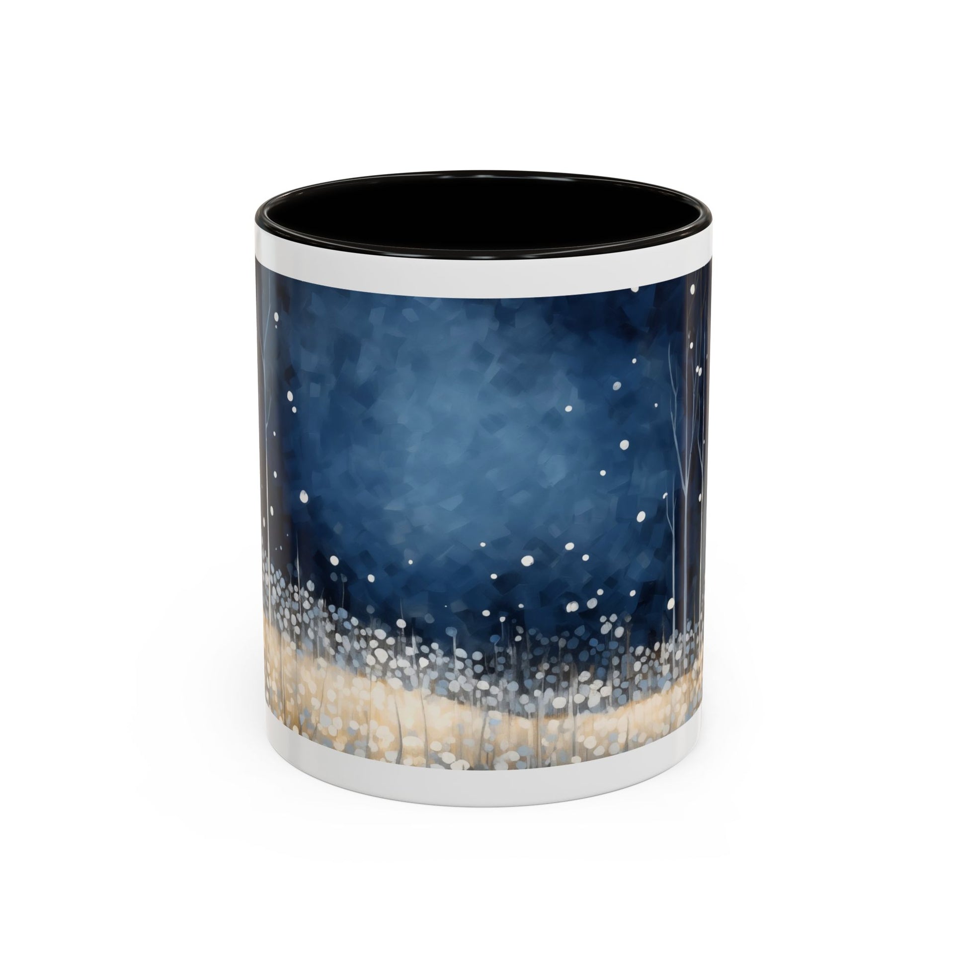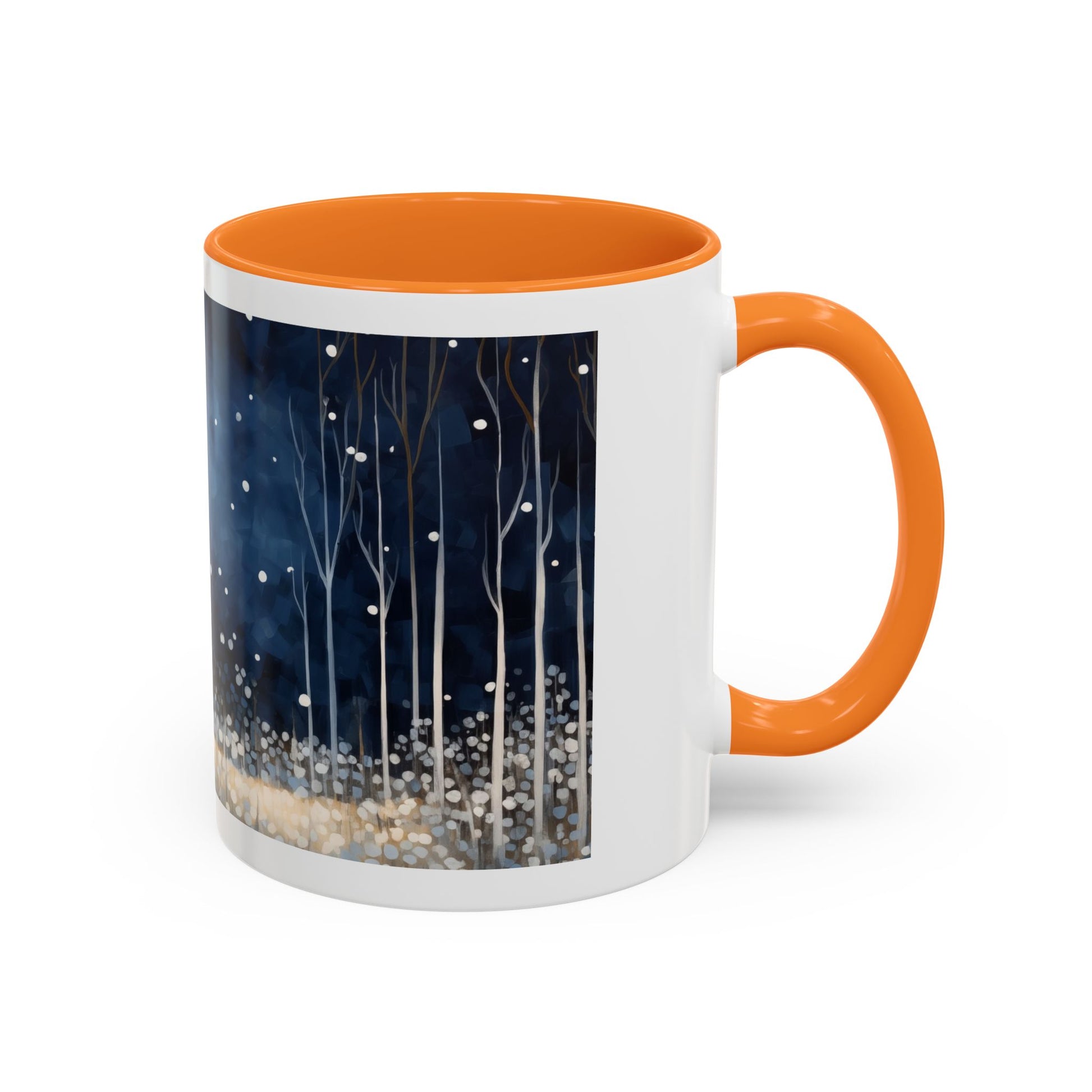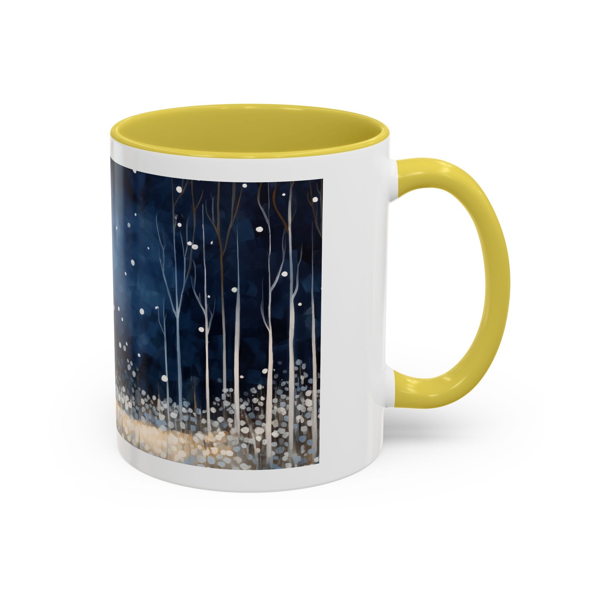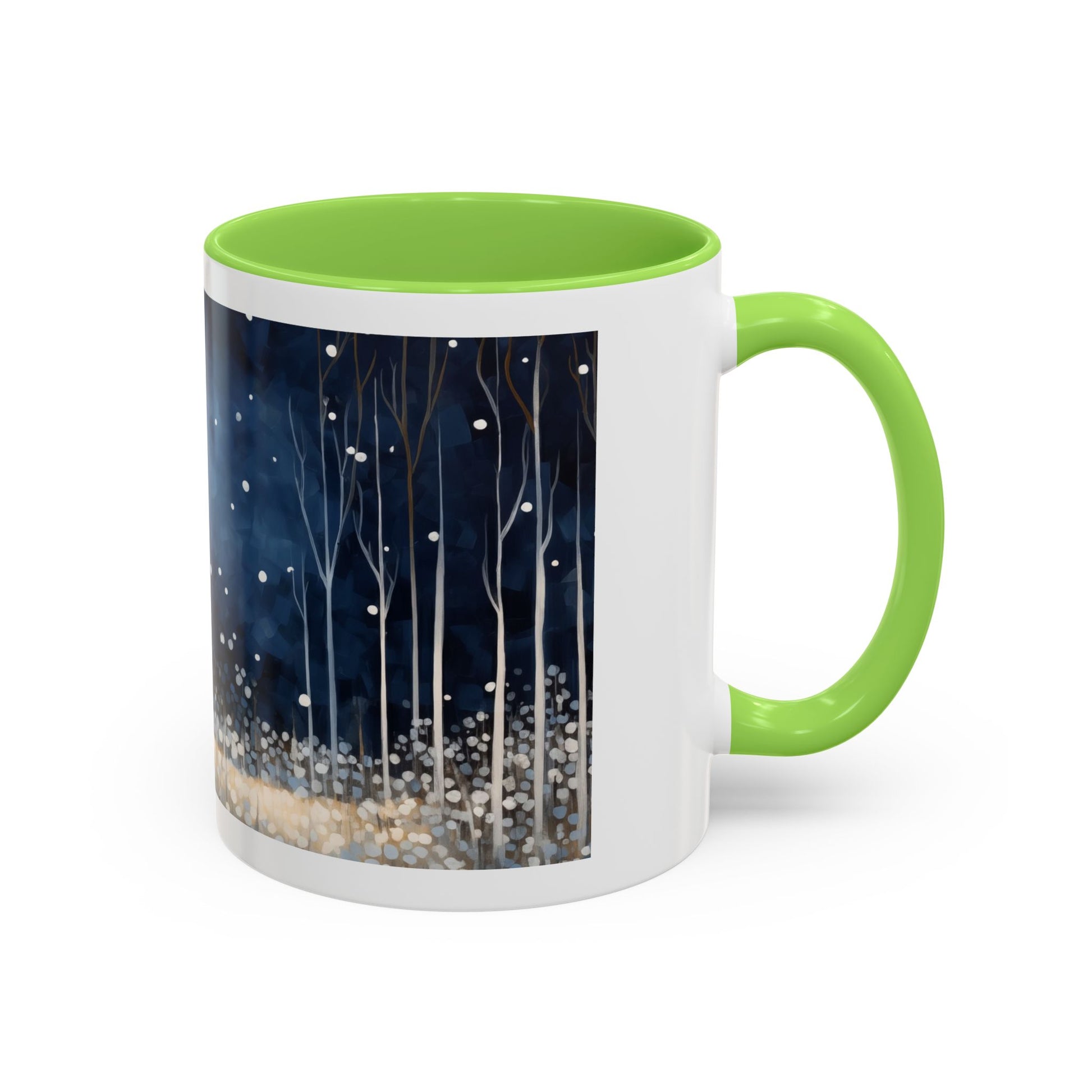This glossy ceramic mug brings a quiet, starry forest to your mornings. Deep indigo blues melt into soft, misty light above a field of fine, shimmering flecks that read like falling snow or fireflies. Thin, pale trunks stand like sentinels across the scene, giving the design a calm, contemplative rhythm. The colored handle and interior add a subtle pop that ties into your kitchen or workspace. Reach for this mug when you want a slow, thoughtful moment with your coffee or tea — the kind of cup that feels like a pause in a busy day.