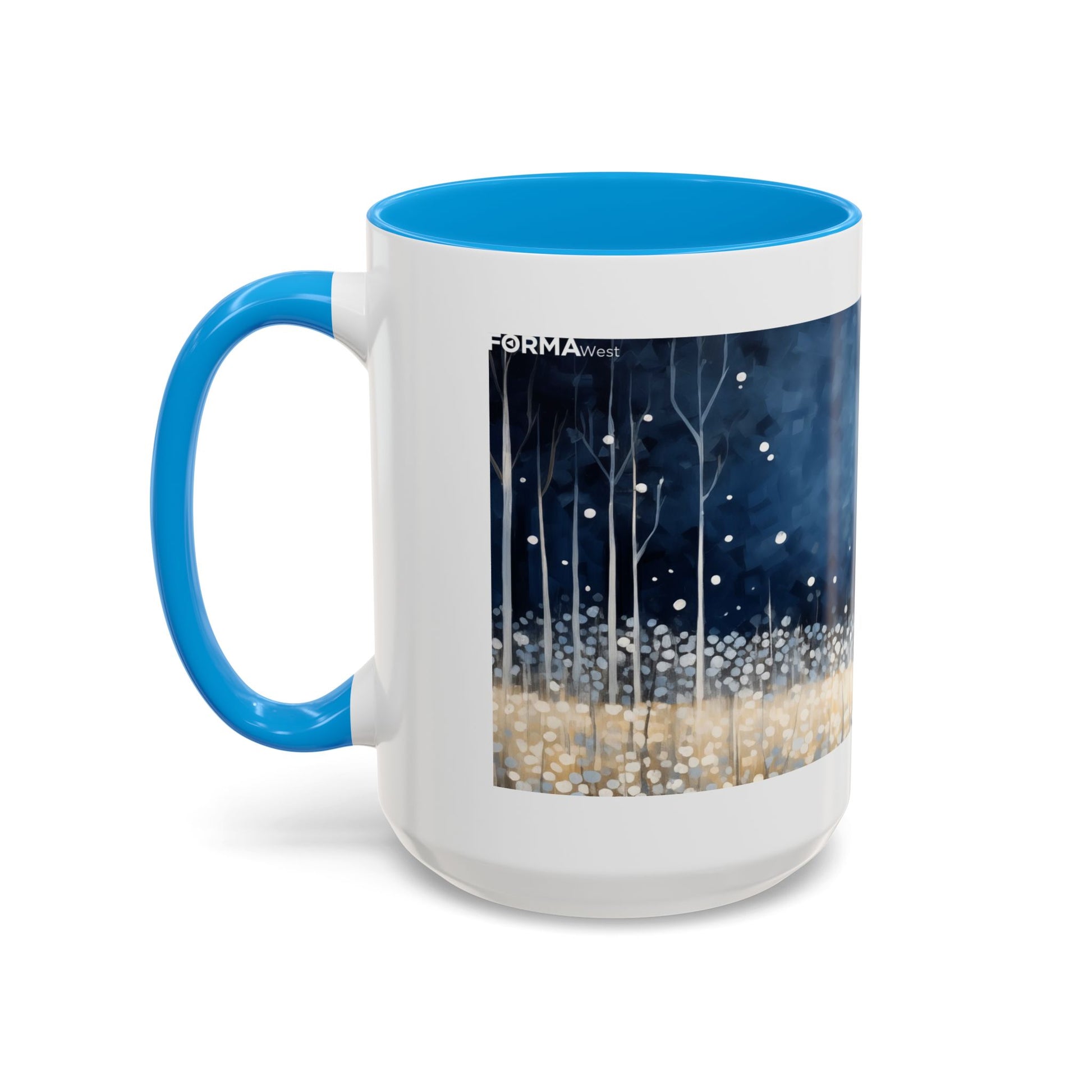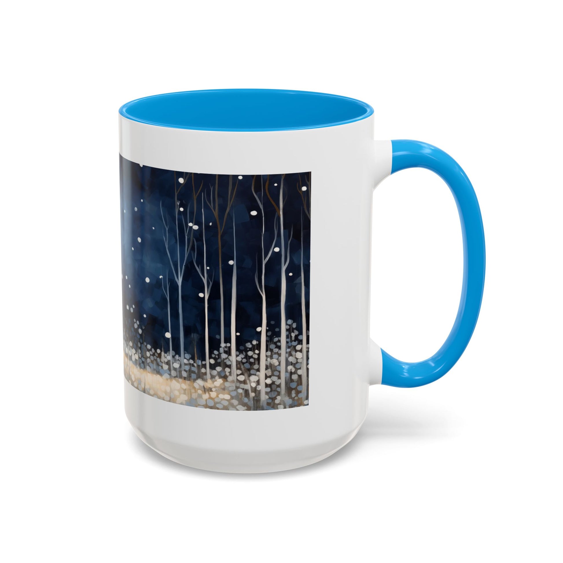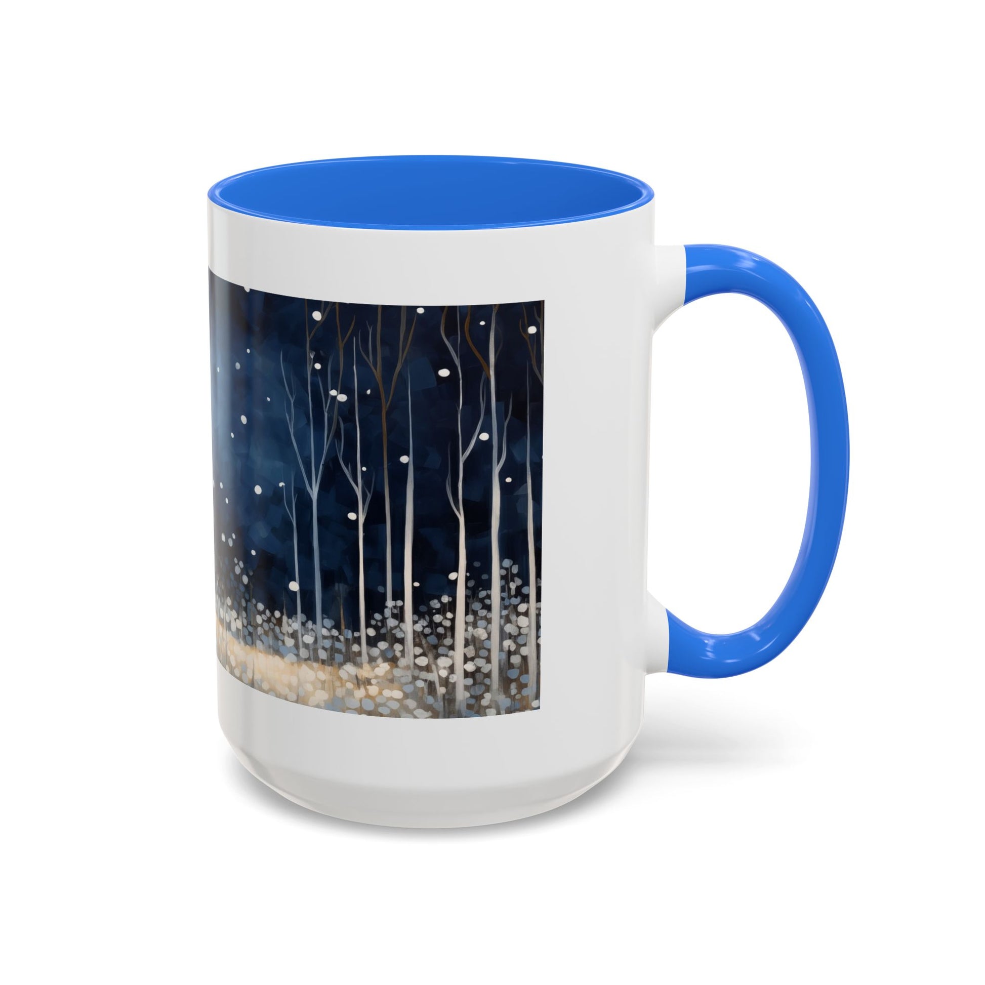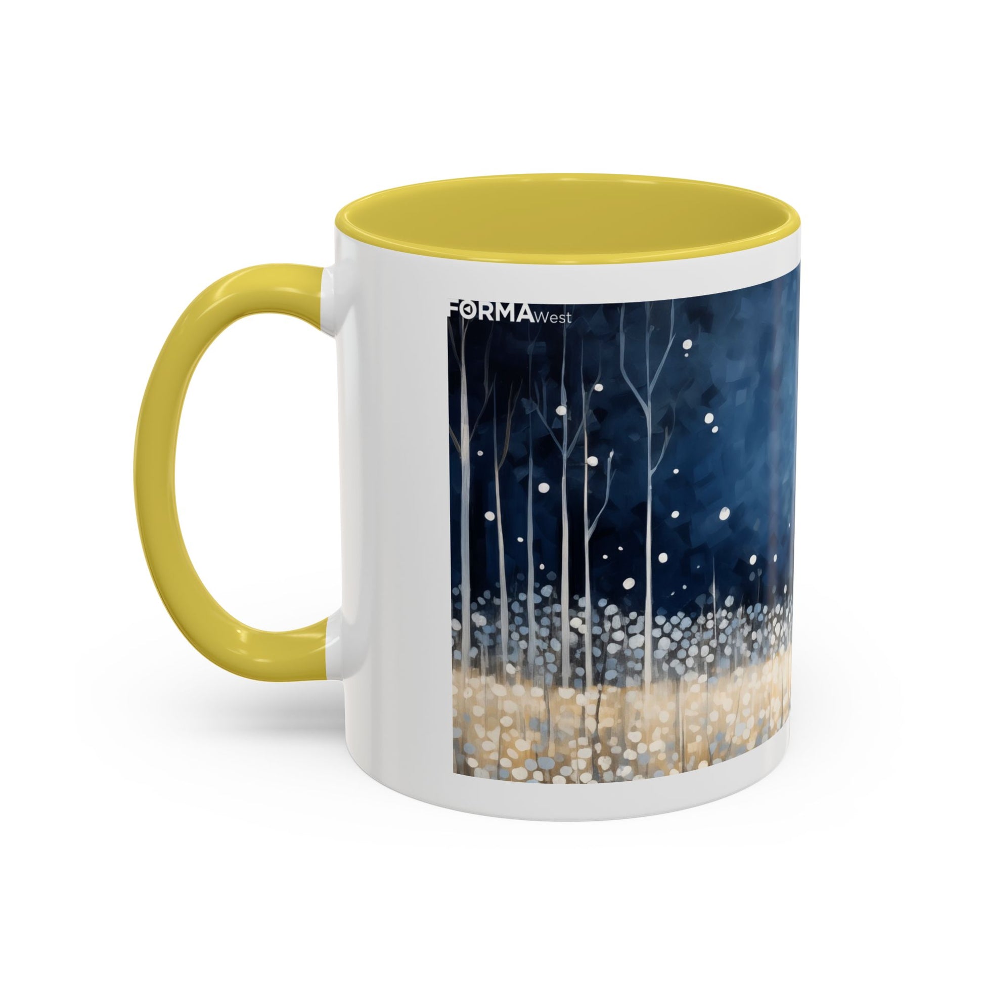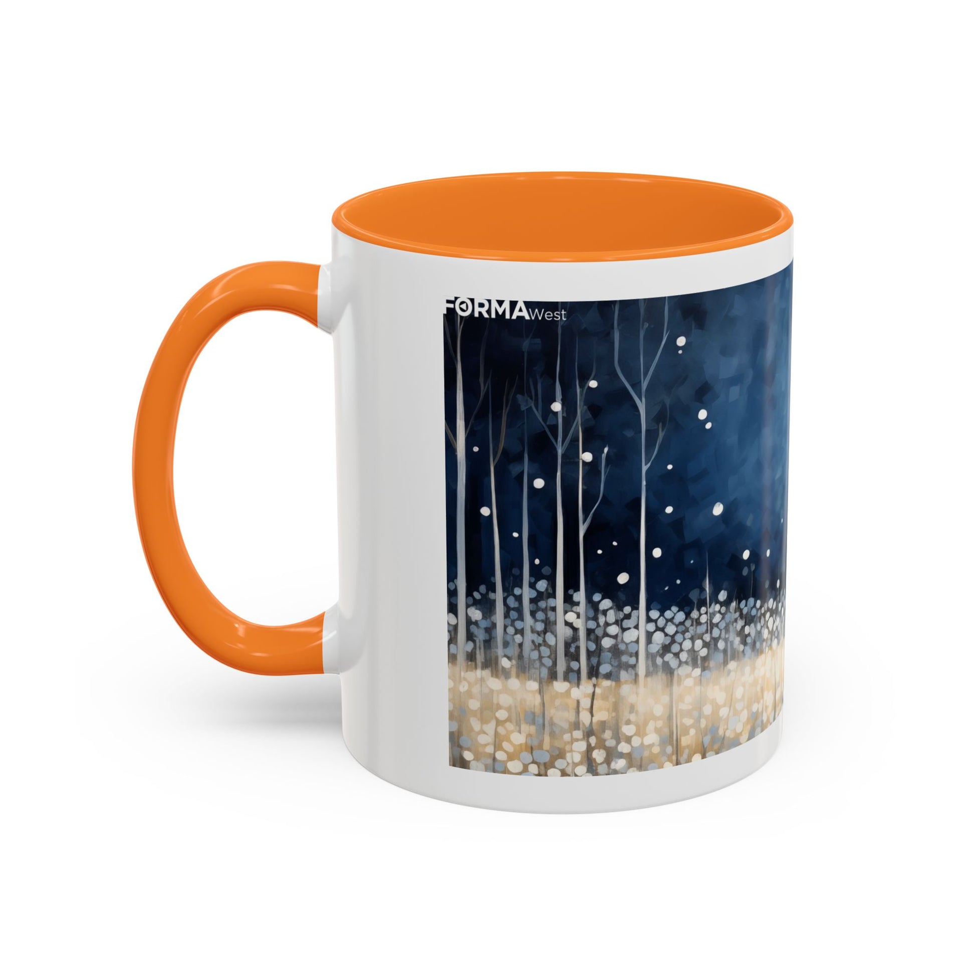 This glossy ceramic mug brings a quiet, starry forest to your mornings. Deep indigo blues melt into soft, misty light above a field of fine, shimmering flecks that read like falling snow or fireflies. Thin, pale trunks stand like sentinels across the scene, giving the design a calm, contemplative rhythm. The colored handle and interior add a subtle pop that ties into your kitchen or workspace. Reach for this mug when you want a slow, thoughtful moment with your coffee or tea — the kind of cup that feels like a pause in a busy day.