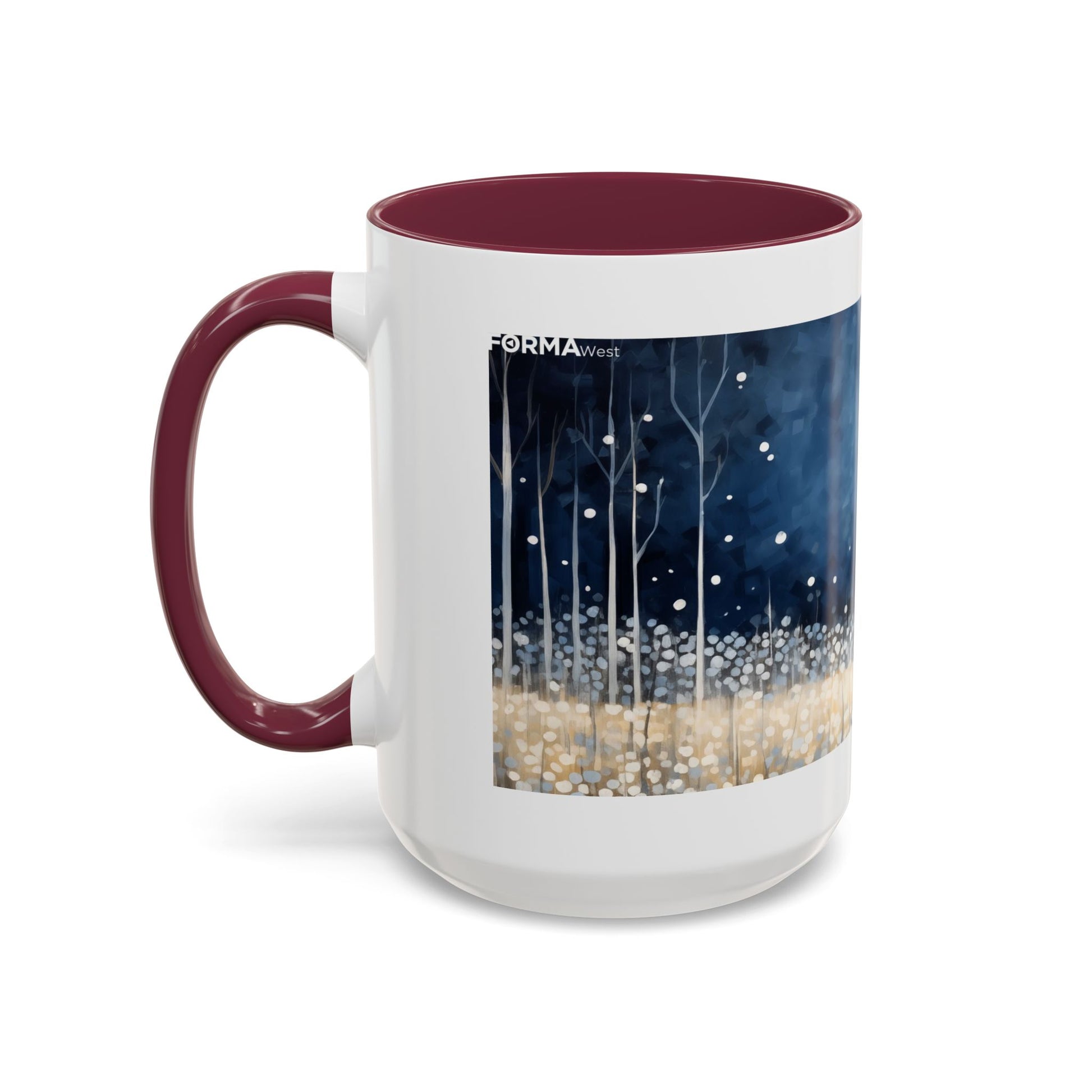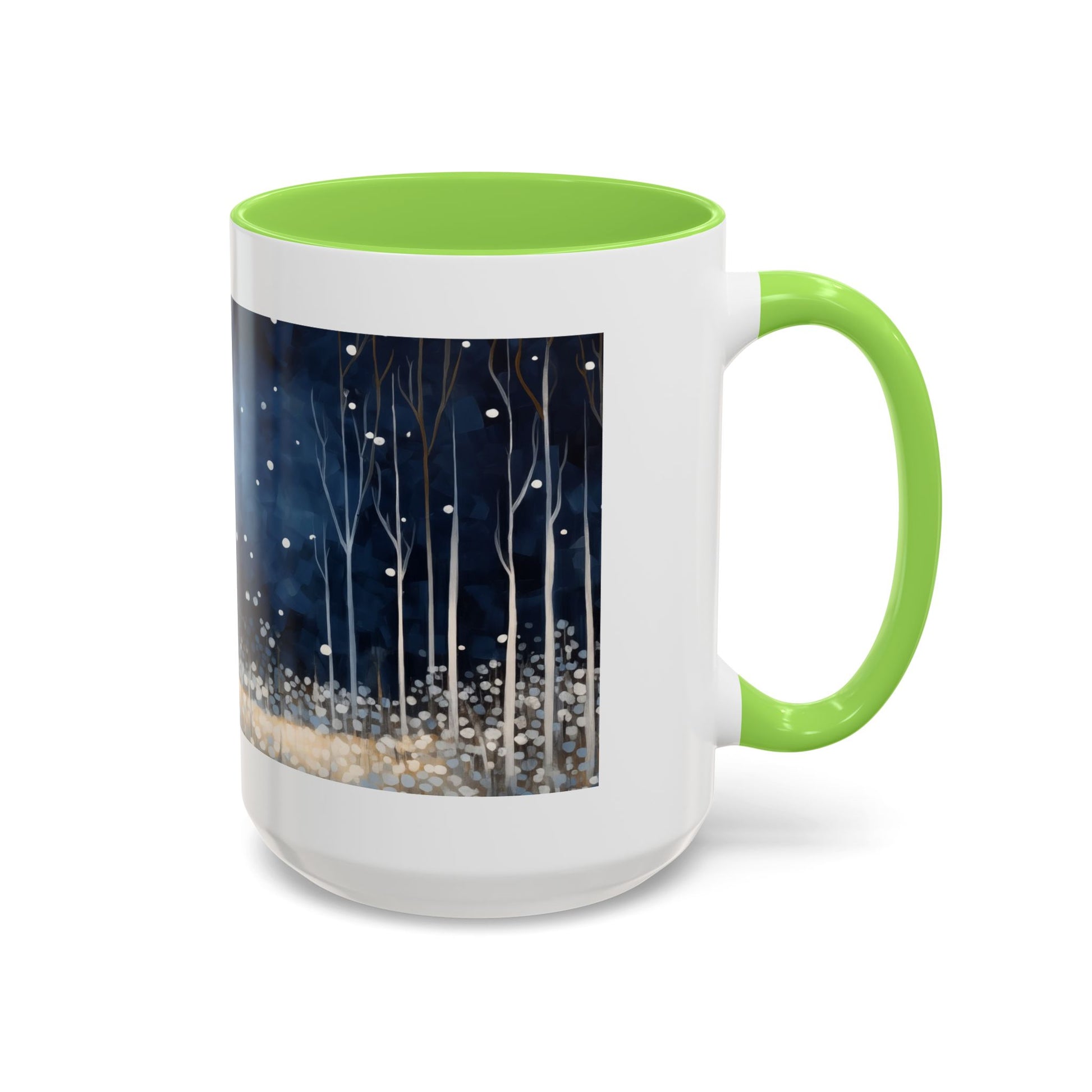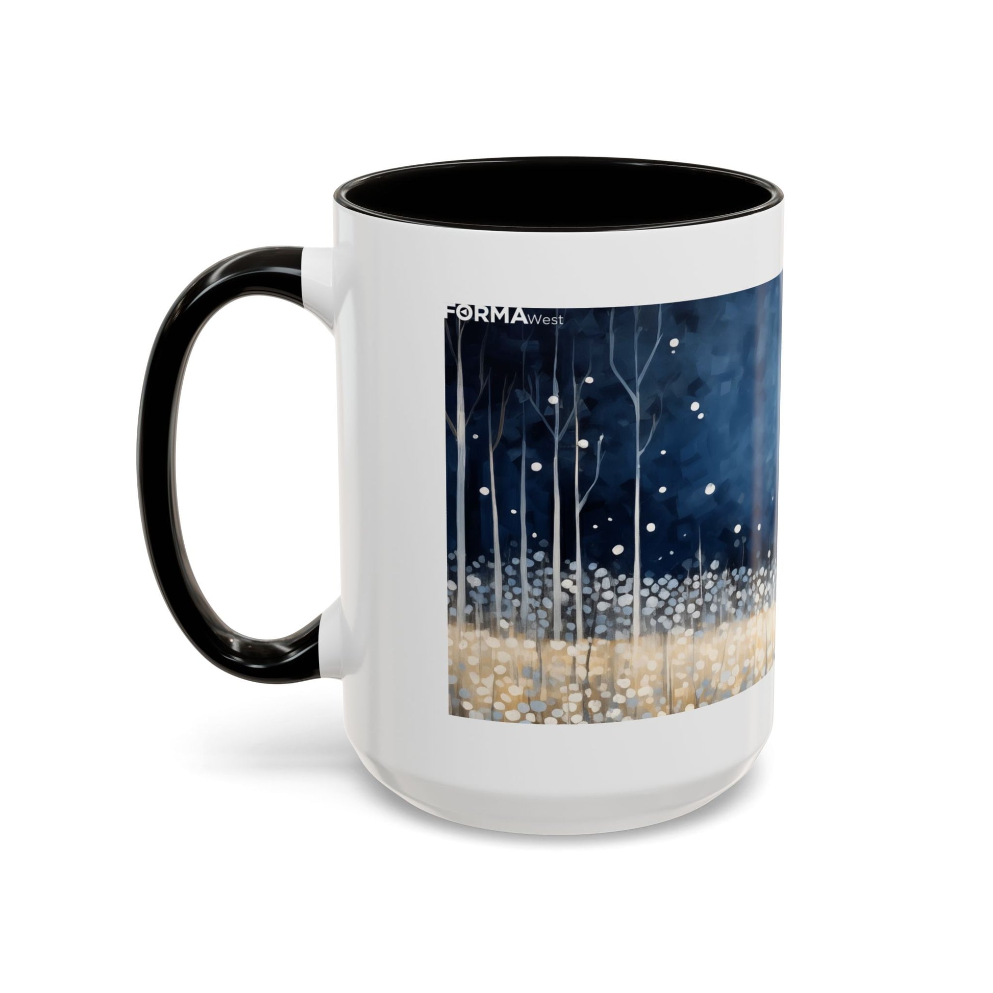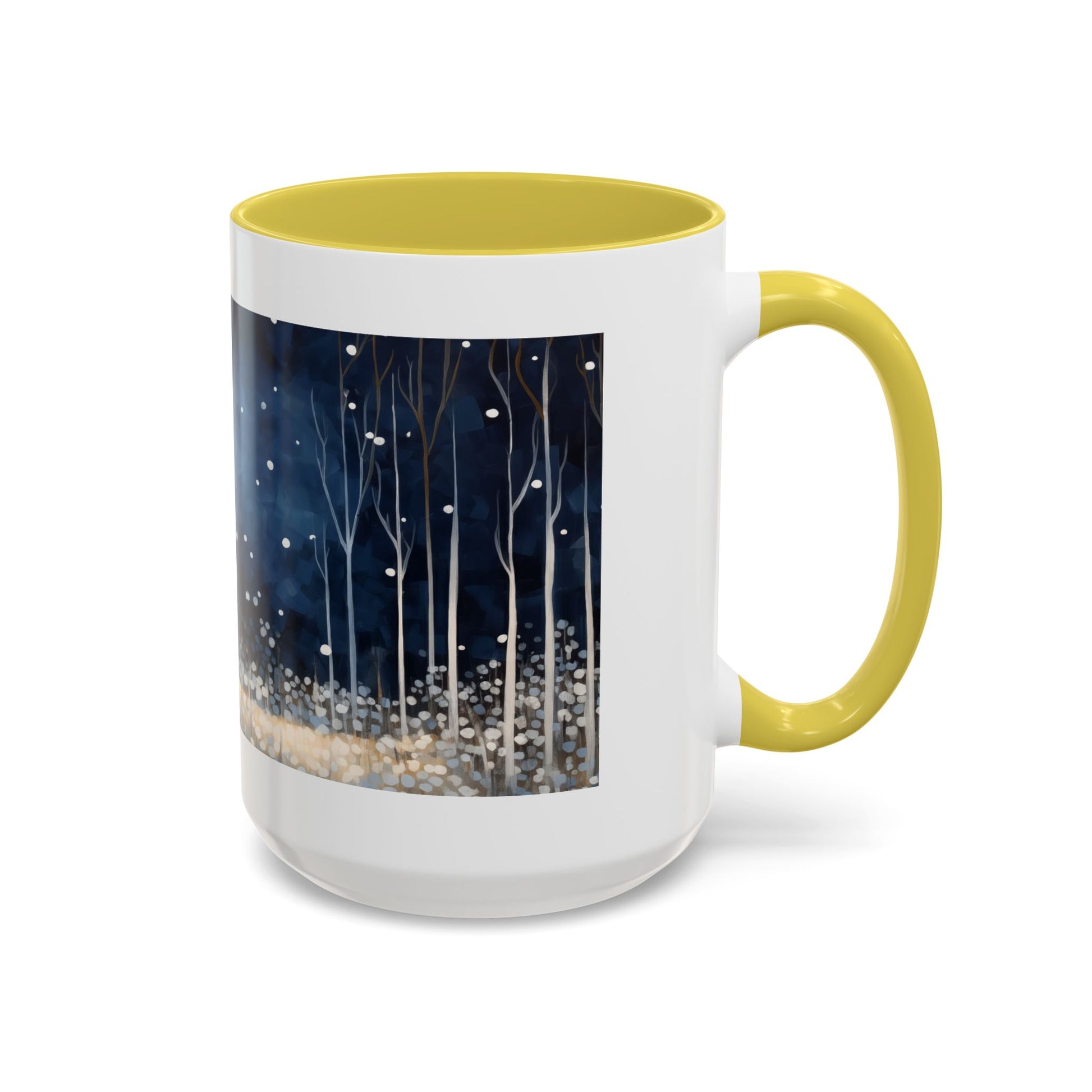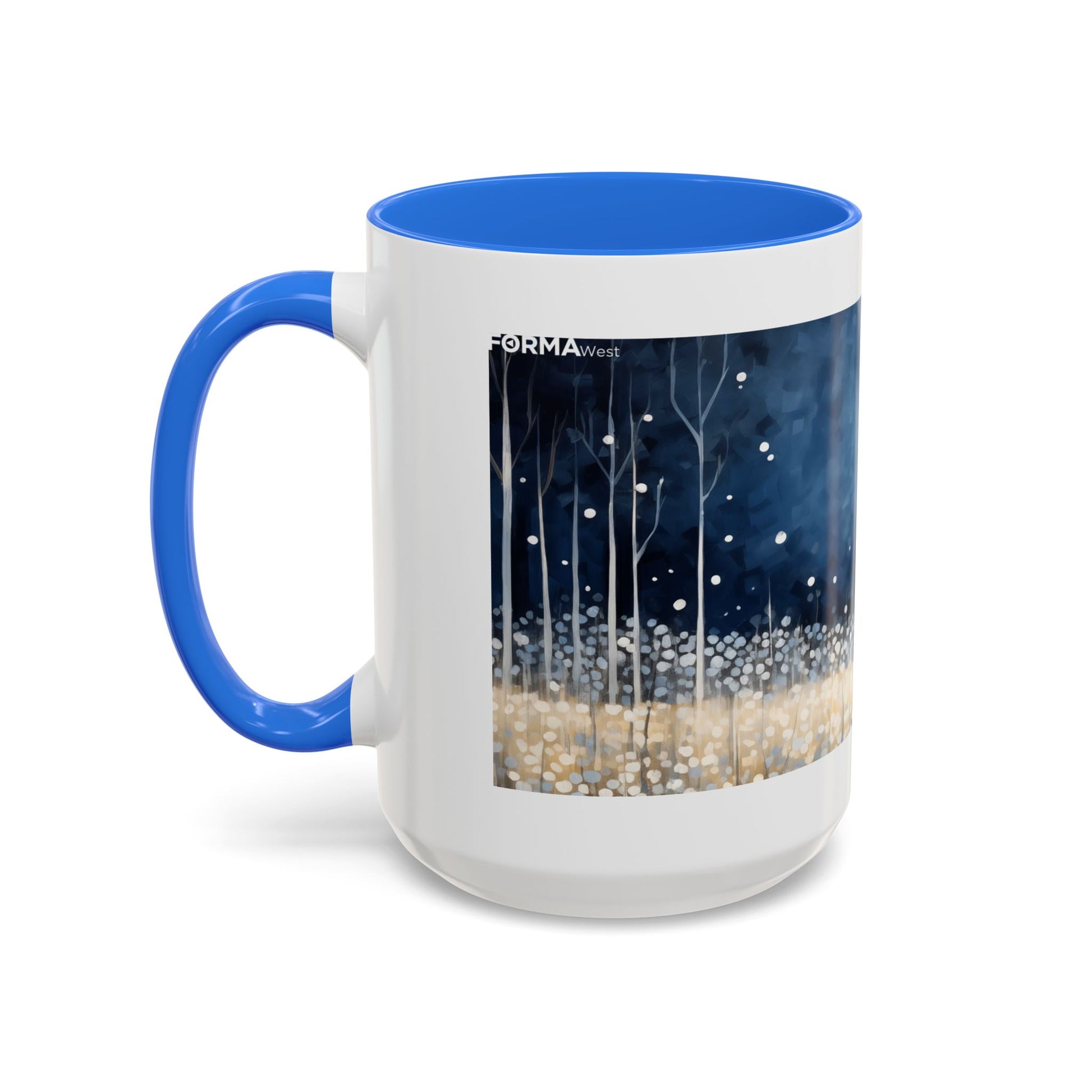 This glossy ceramic mug brings a quiet, starry forest to your mornings. Deep indigo blues melt into soft, misty light above a field of fine, shimmering flecks that read like falling snow or fireflies. Thin, pale trunks stand like sentinels across the scene, giving the design a calm, contemplative rhythm. The colored handle and interior add a subtle pop that ties into your kitchen or workspace. Reach for this mug when you want a slow, thoughtful moment with your coffee or tea — the kind of cup that feels like a pause in a busy day.