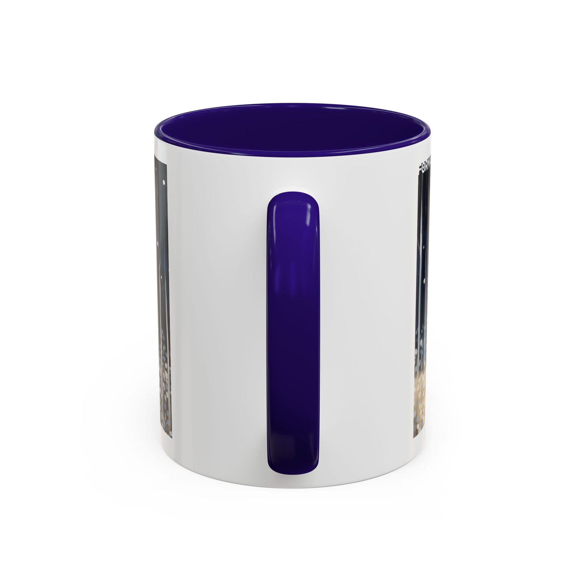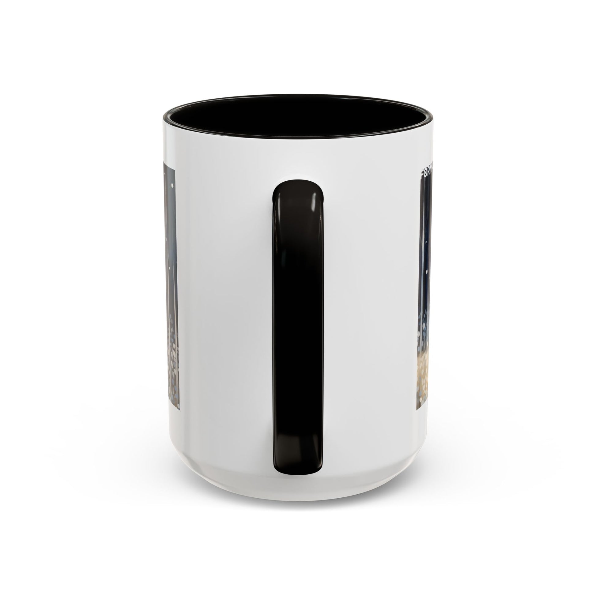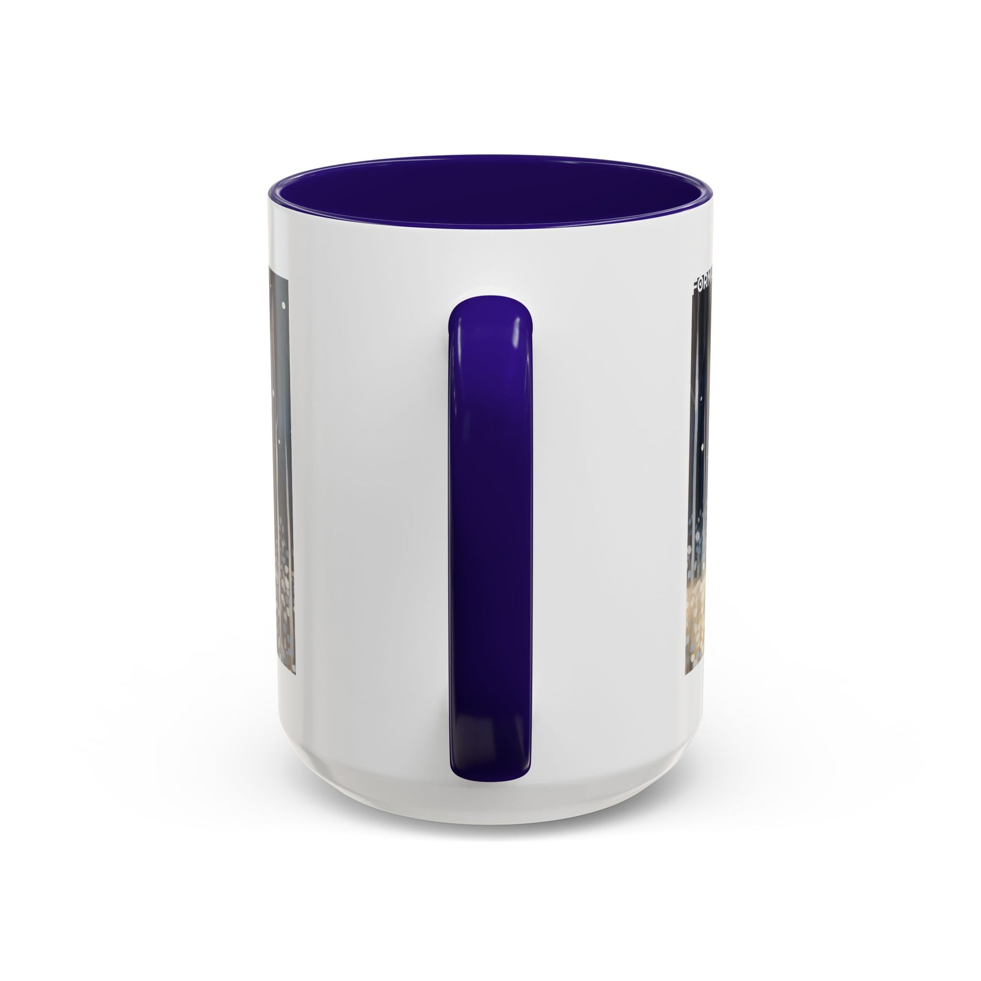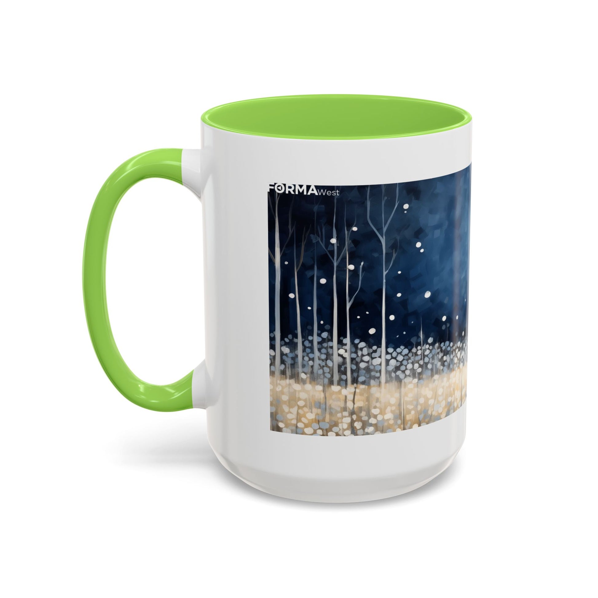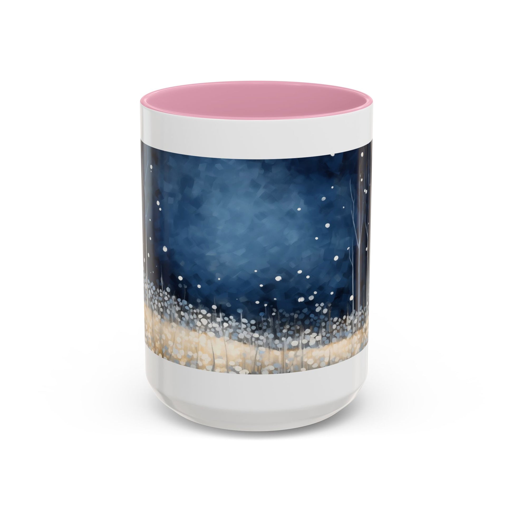 This glossy ceramic mug brings a quiet, starry forest to your mornings. Deep indigo blues melt into soft, misty light above a field of fine, shimmering flecks that read like falling snow or fireflies. Thin, pale trunks stand like sentinels across the scene, giving the design a calm, contemplative rhythm. The colored handle and interior add a subtle pop that ties into your kitchen or workspace. Reach for this mug when you want a slow, thoughtful moment with your coffee or tea — the kind of cup that feels like a pause in a busy day.